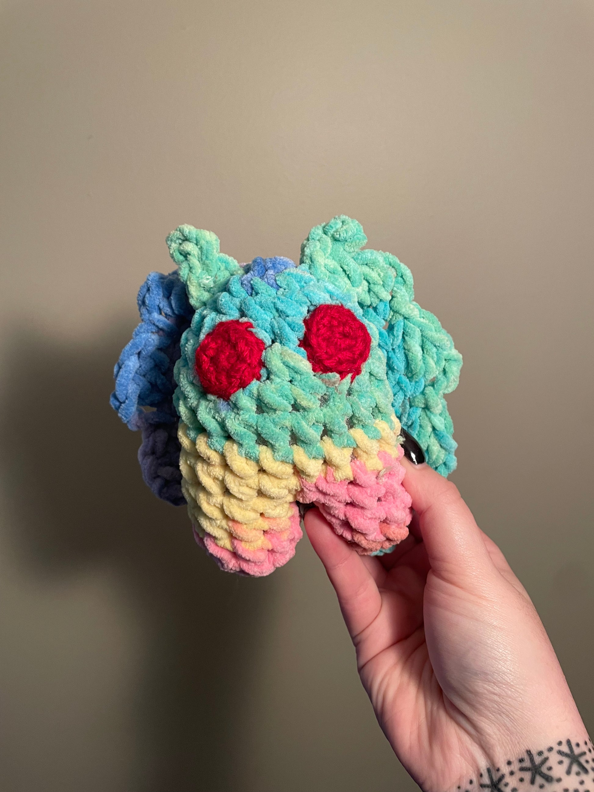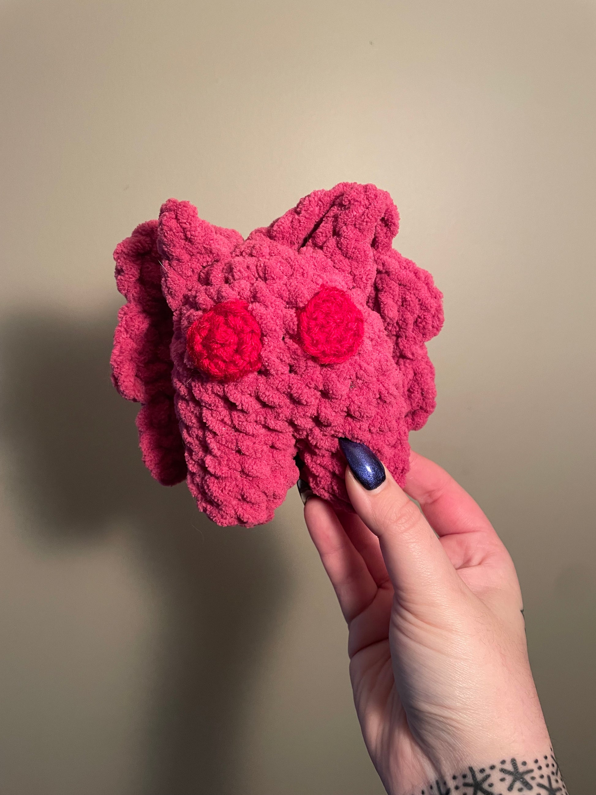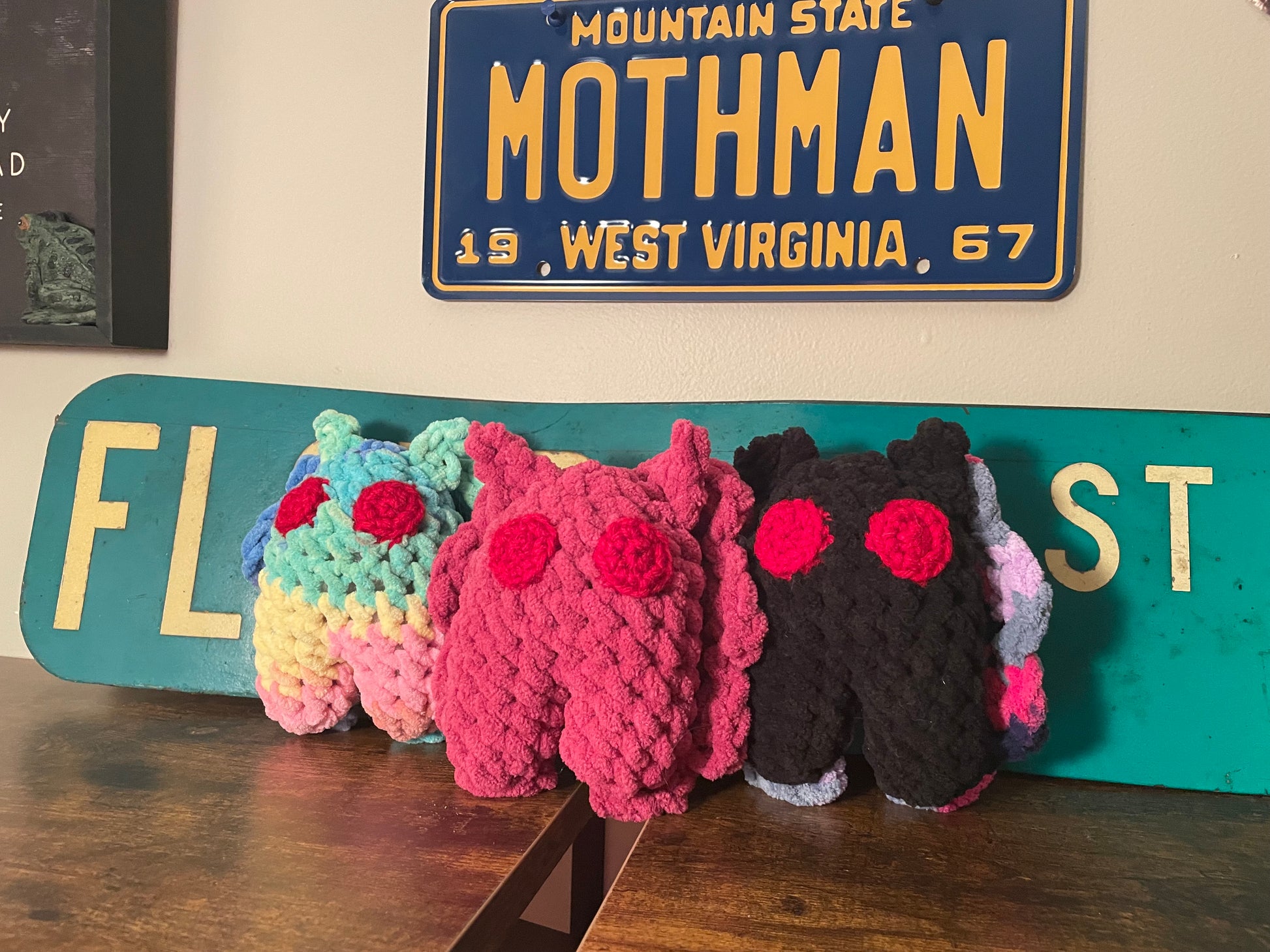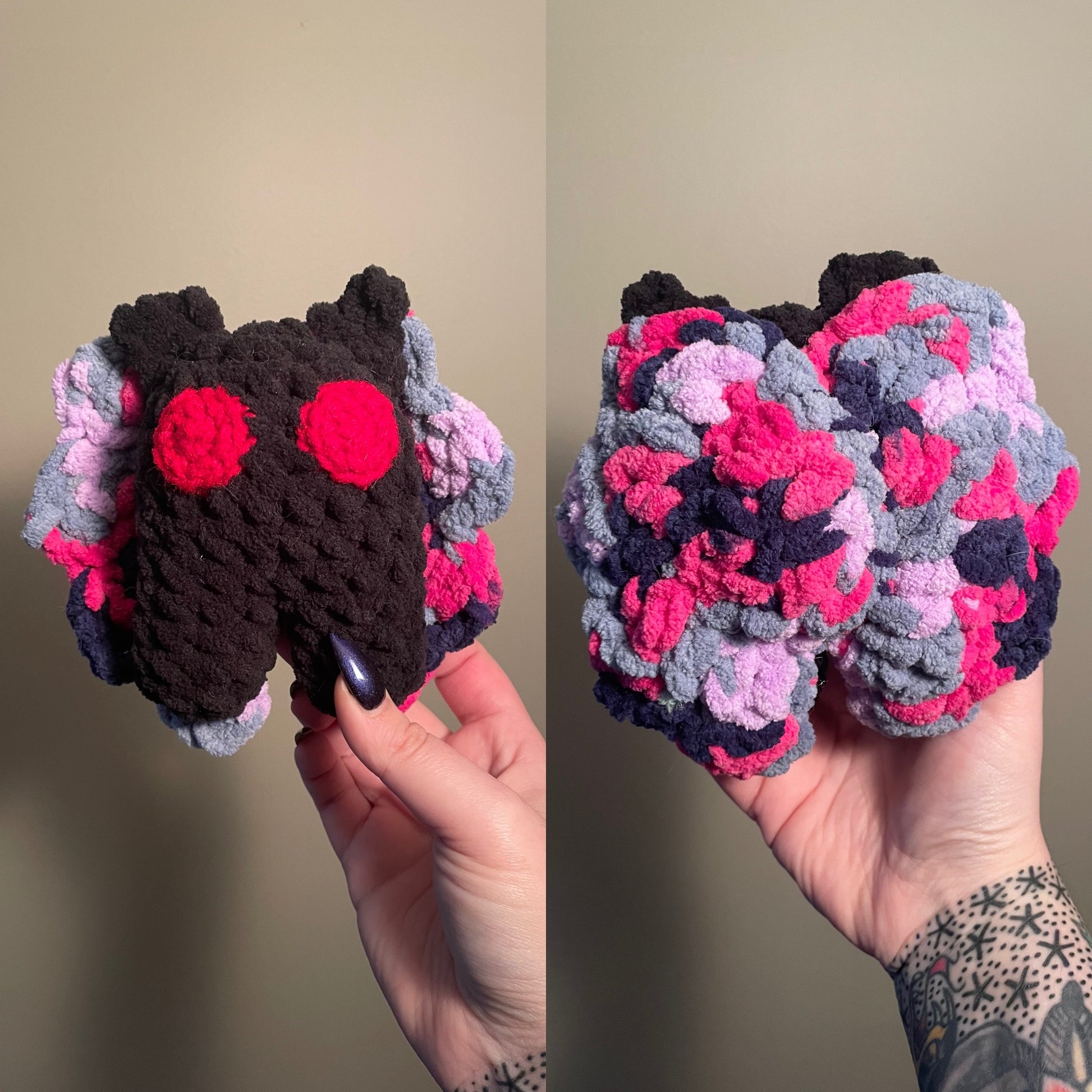 Handmade crochet Cuddly Mothman is made of soft blanket yarn for main body and red acrylic for the eyes. He measures 6" tall and 7" across (from widest part of wings).