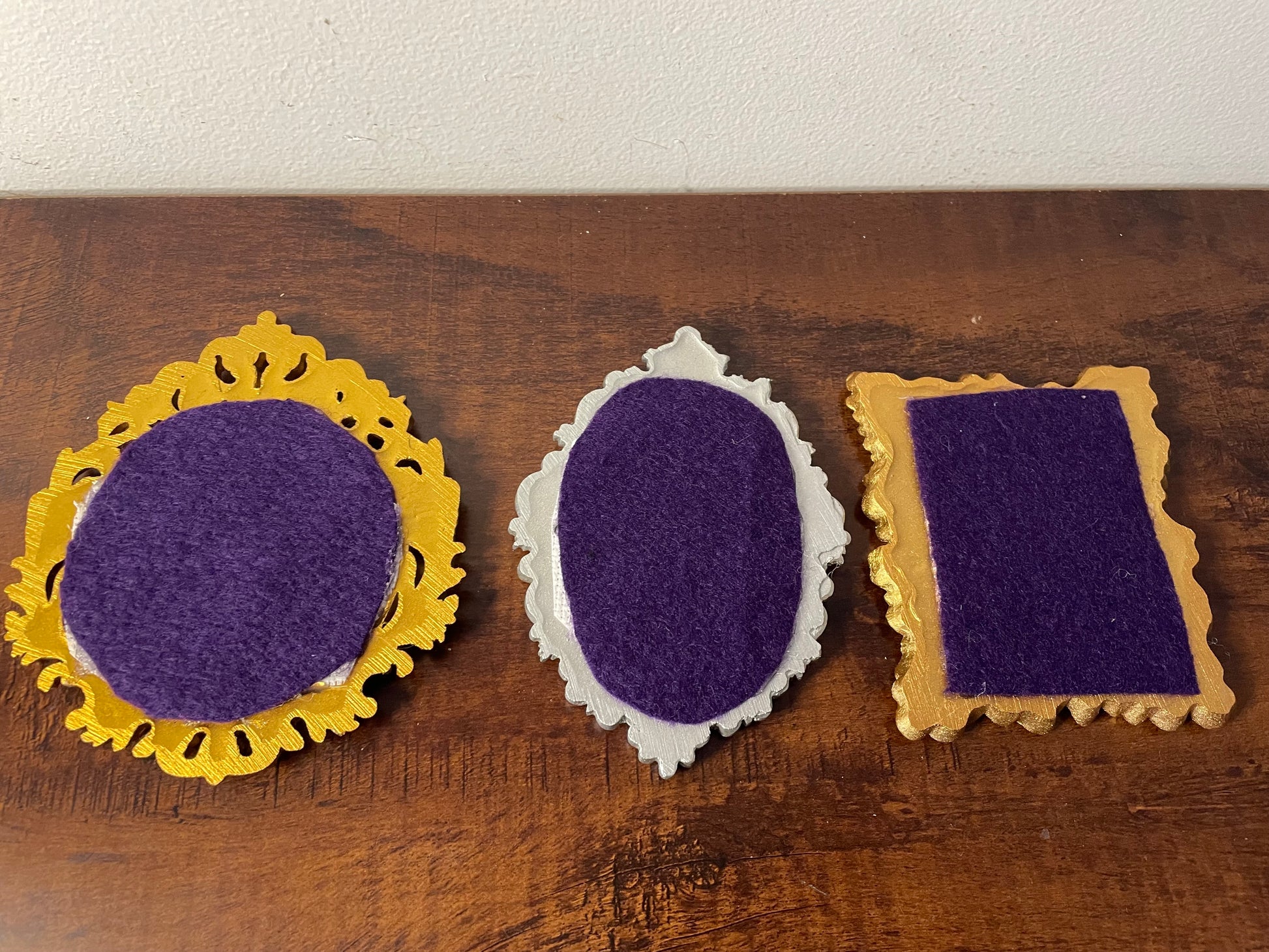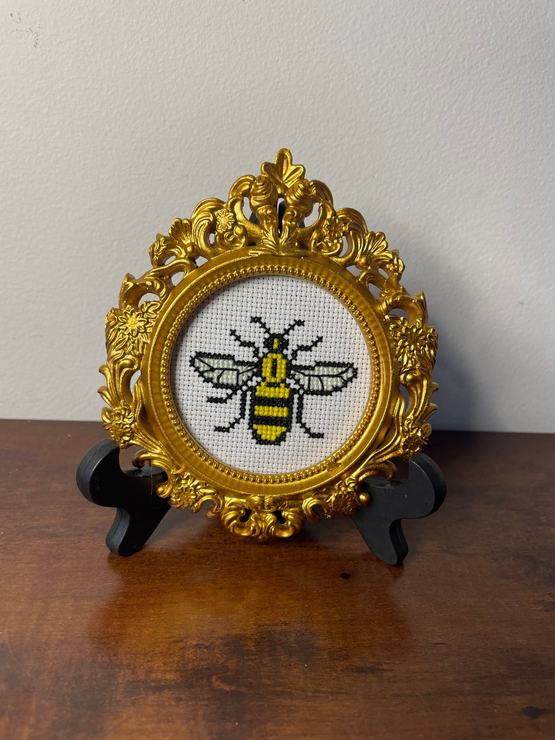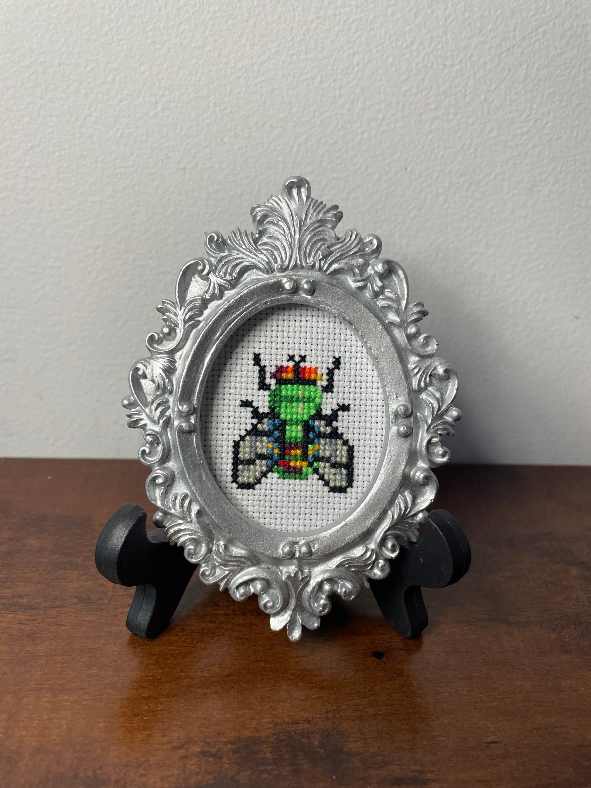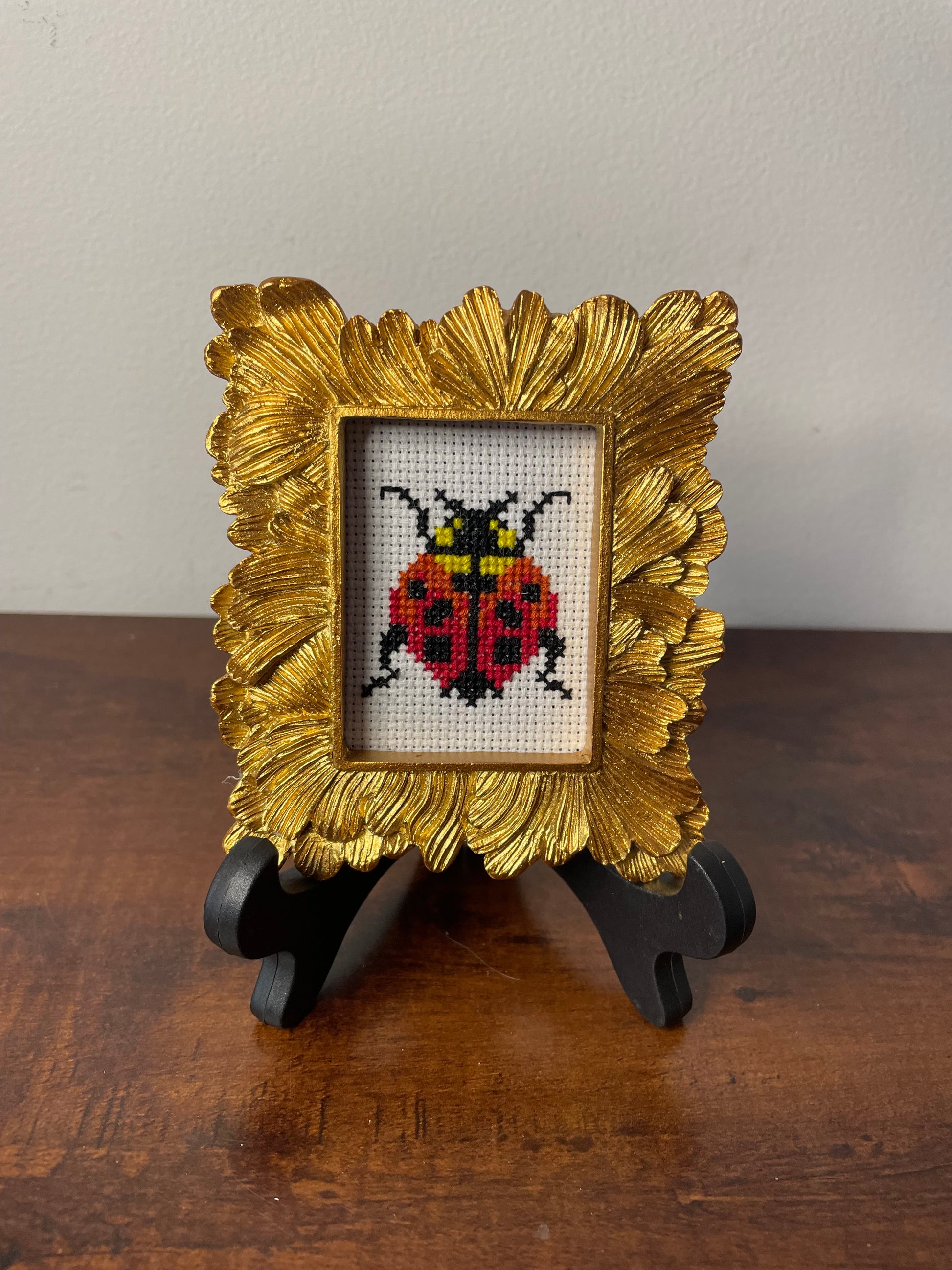 Handmade cross stitch vintage style bugs framed in ornate mini frames. Backs secured with felt. Easels are included, these are unable to be hung on a wall.