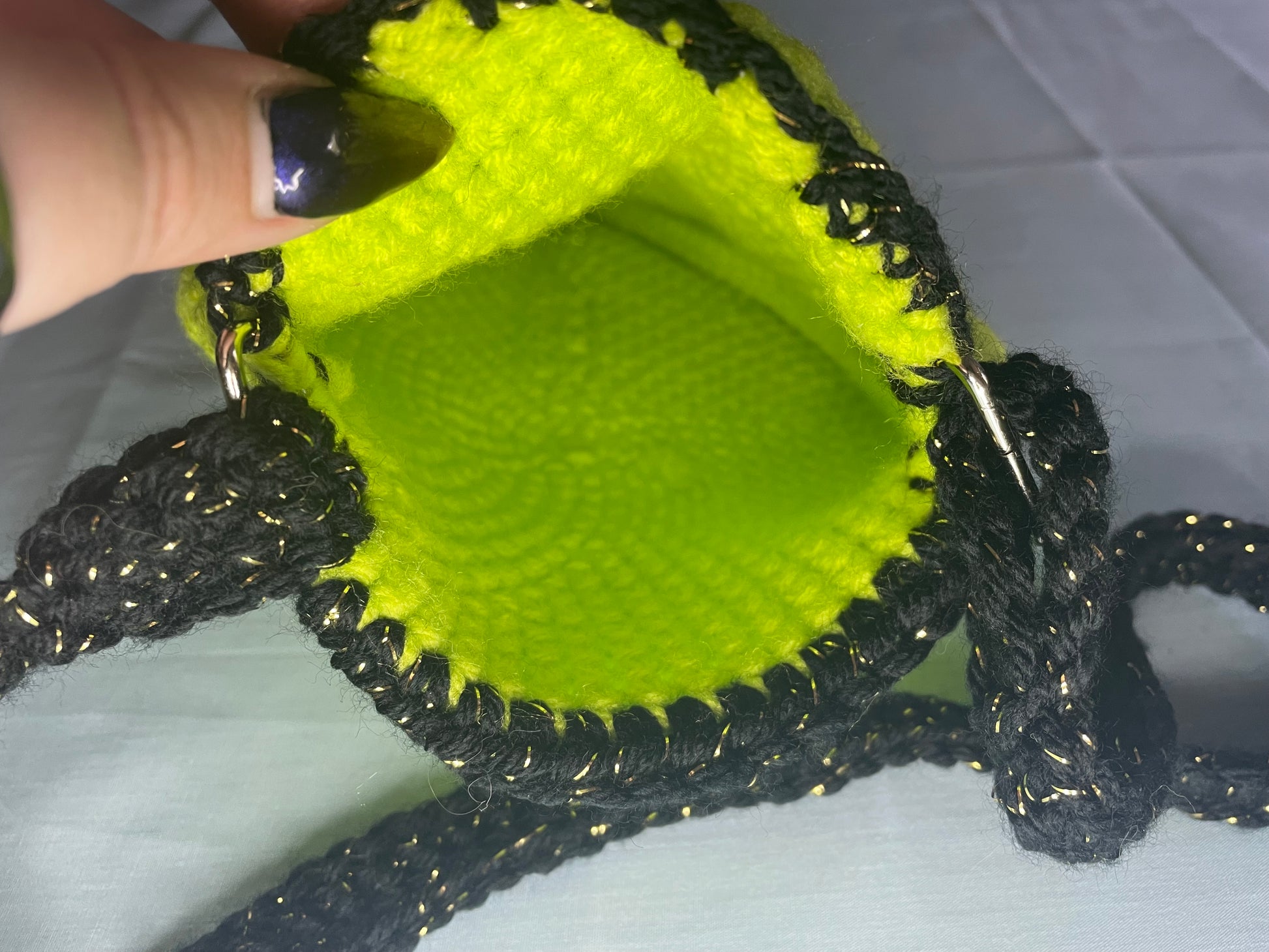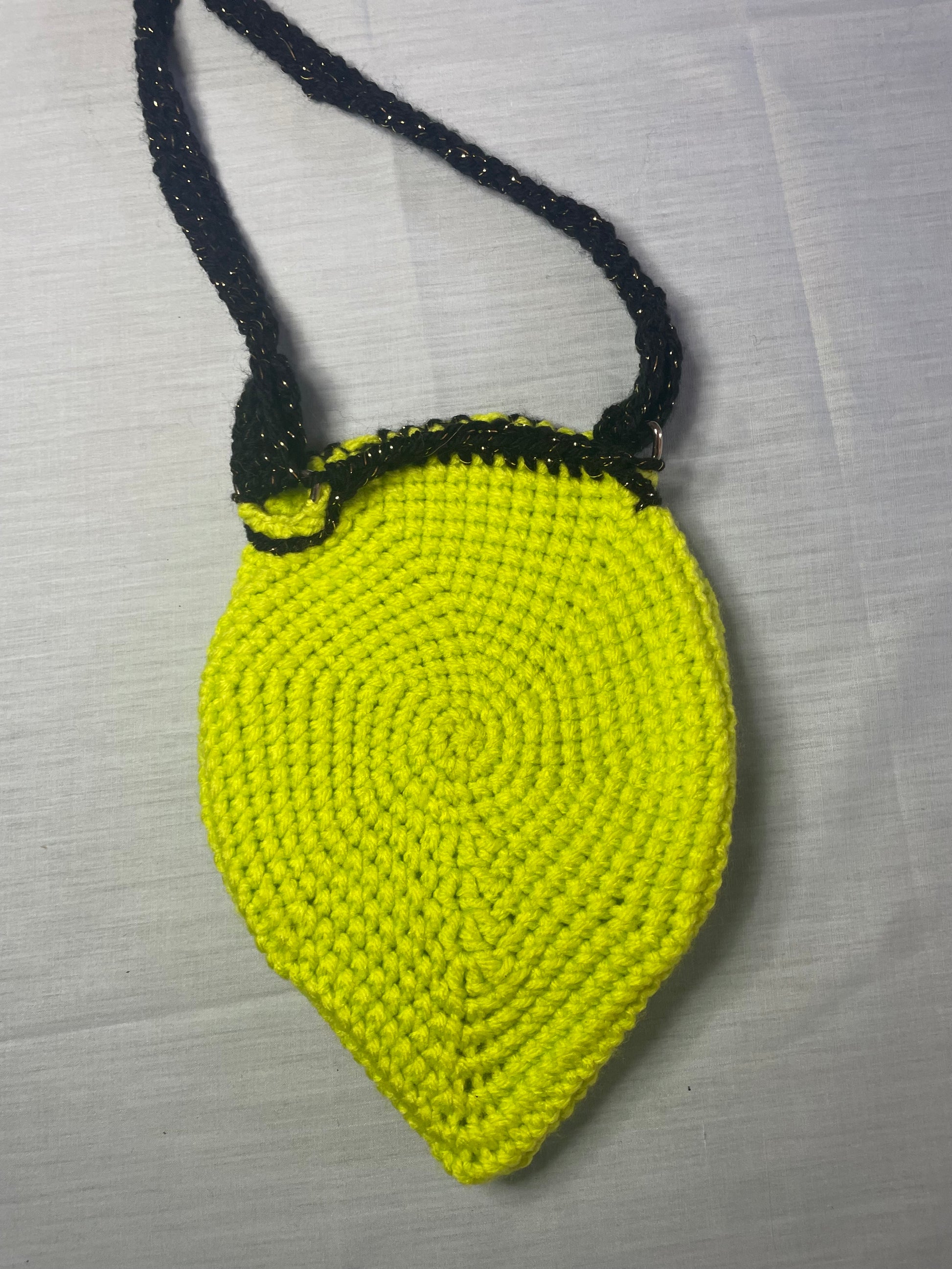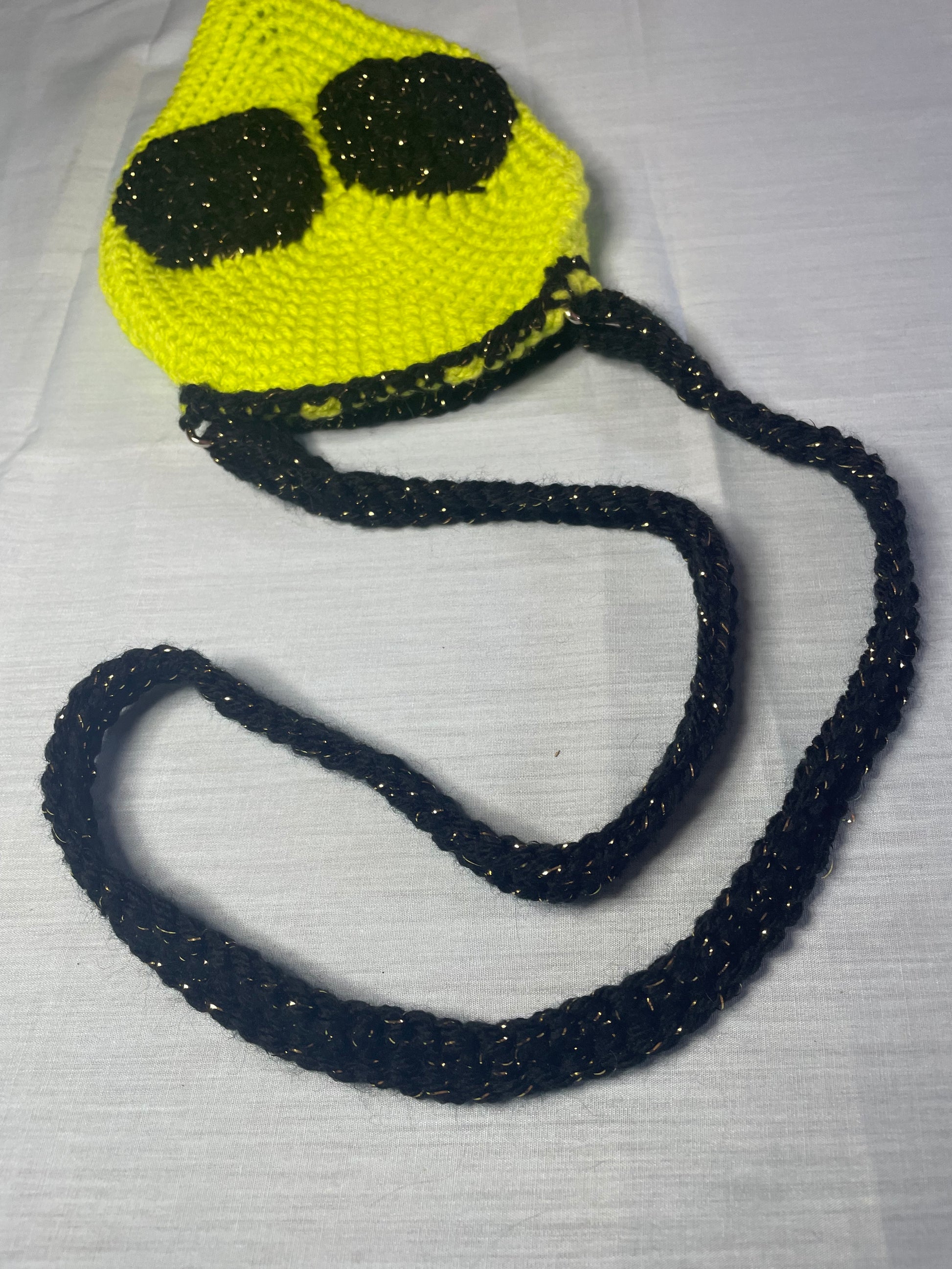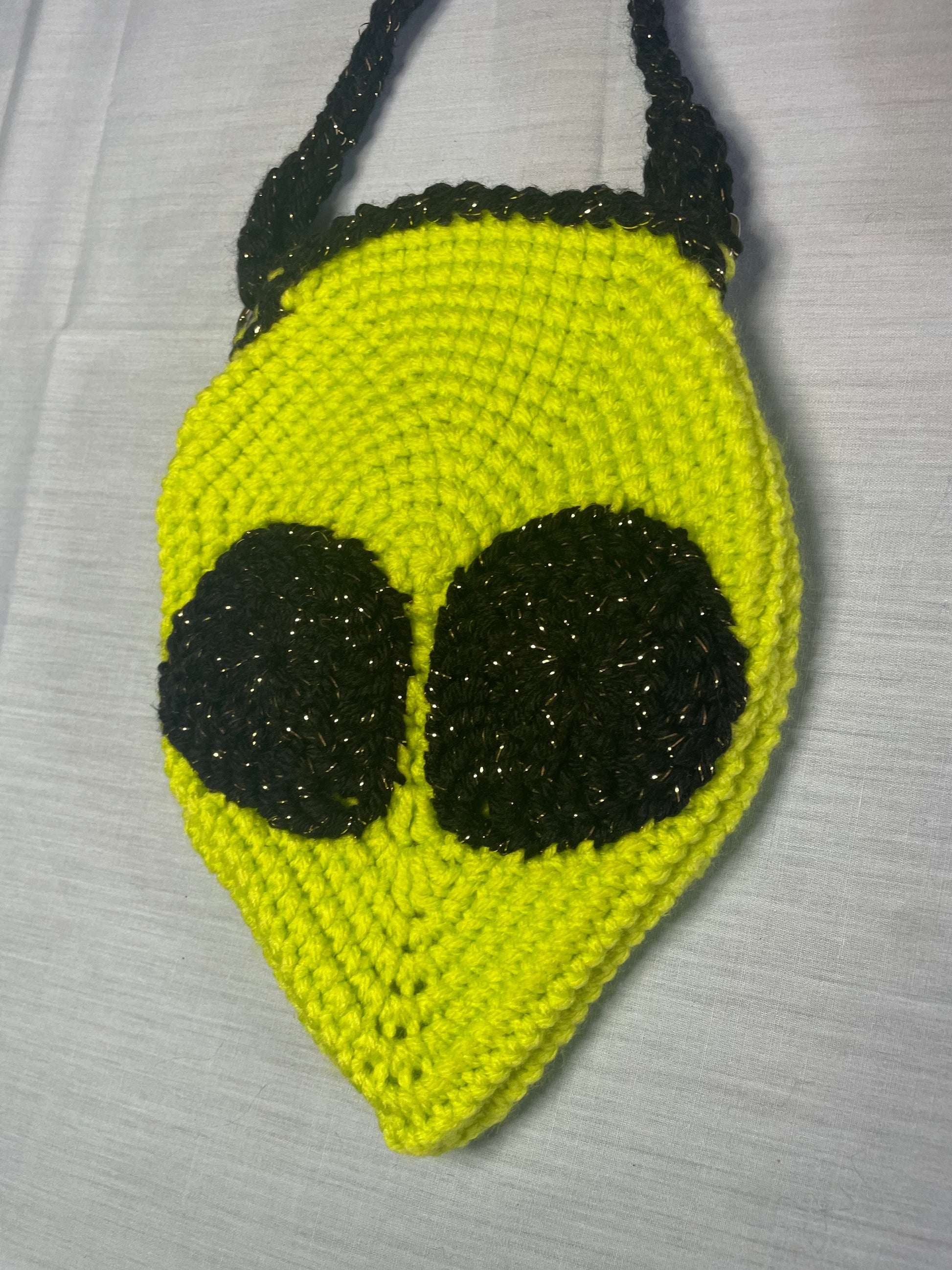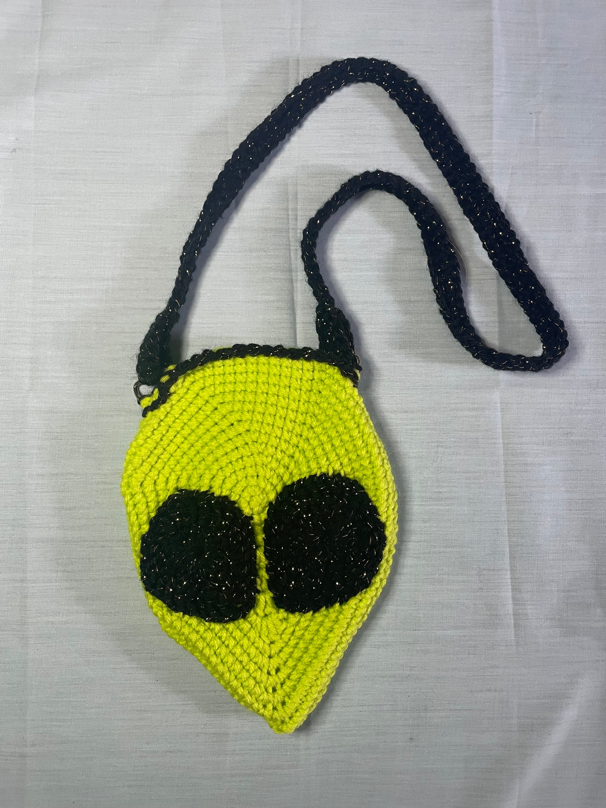 Alien head bag is made of 100% acrylic with sparkling metallic gold strands in the eyes and strap. Strap connects to metal rings. Measures 6” wide, 8.5” long, and has a 4.5” opening. Strap measures 15.5” from top of bag.