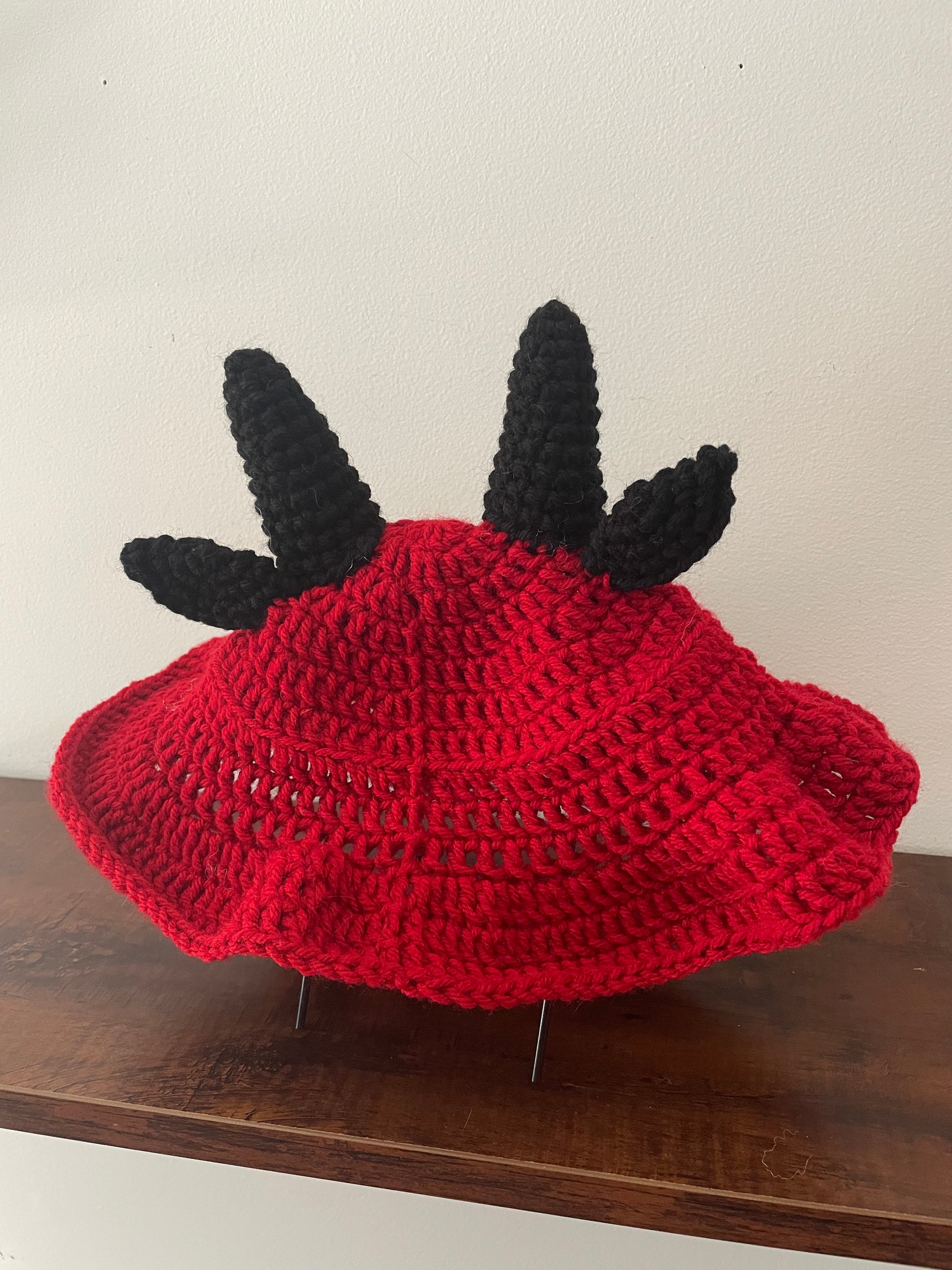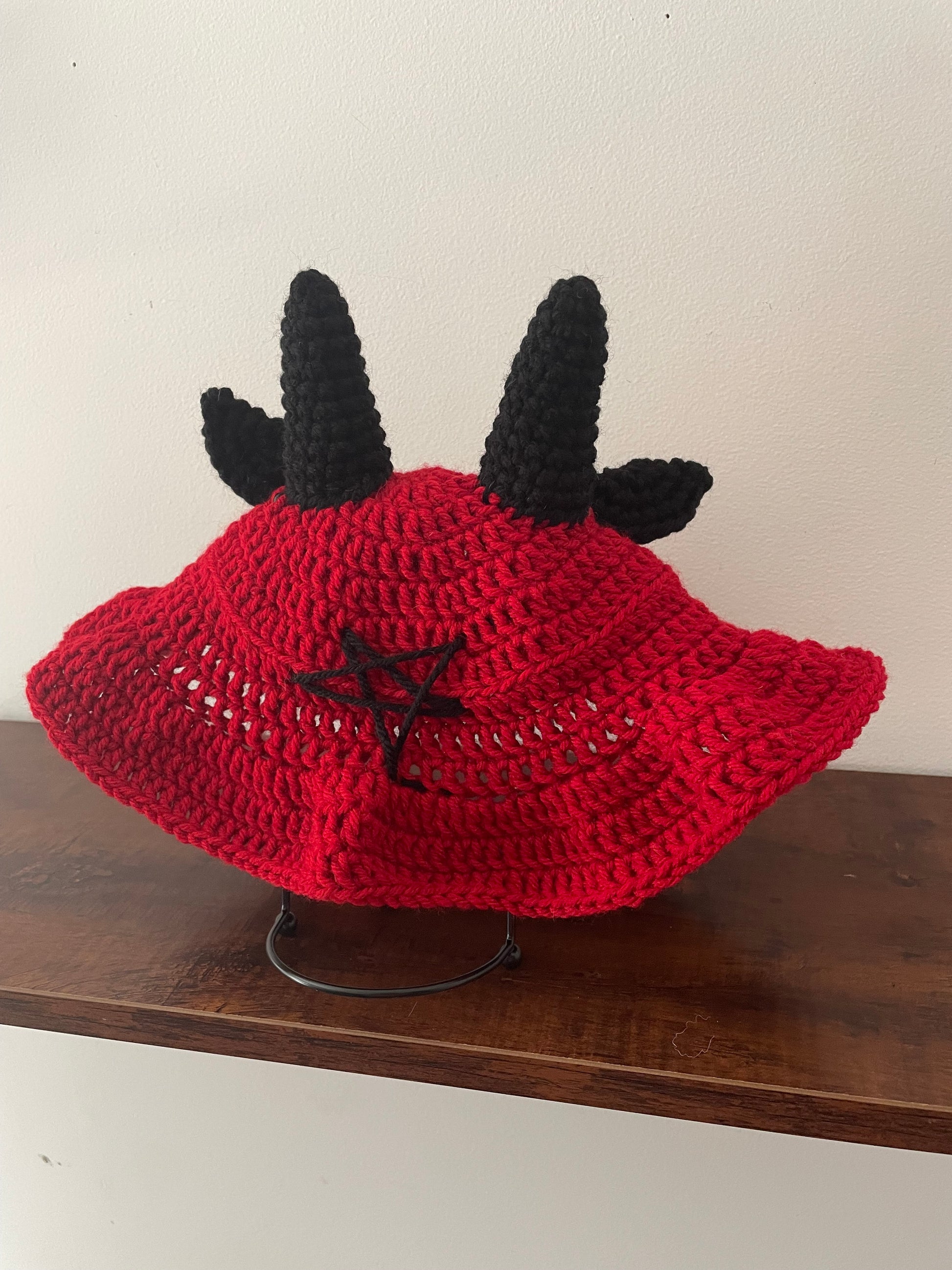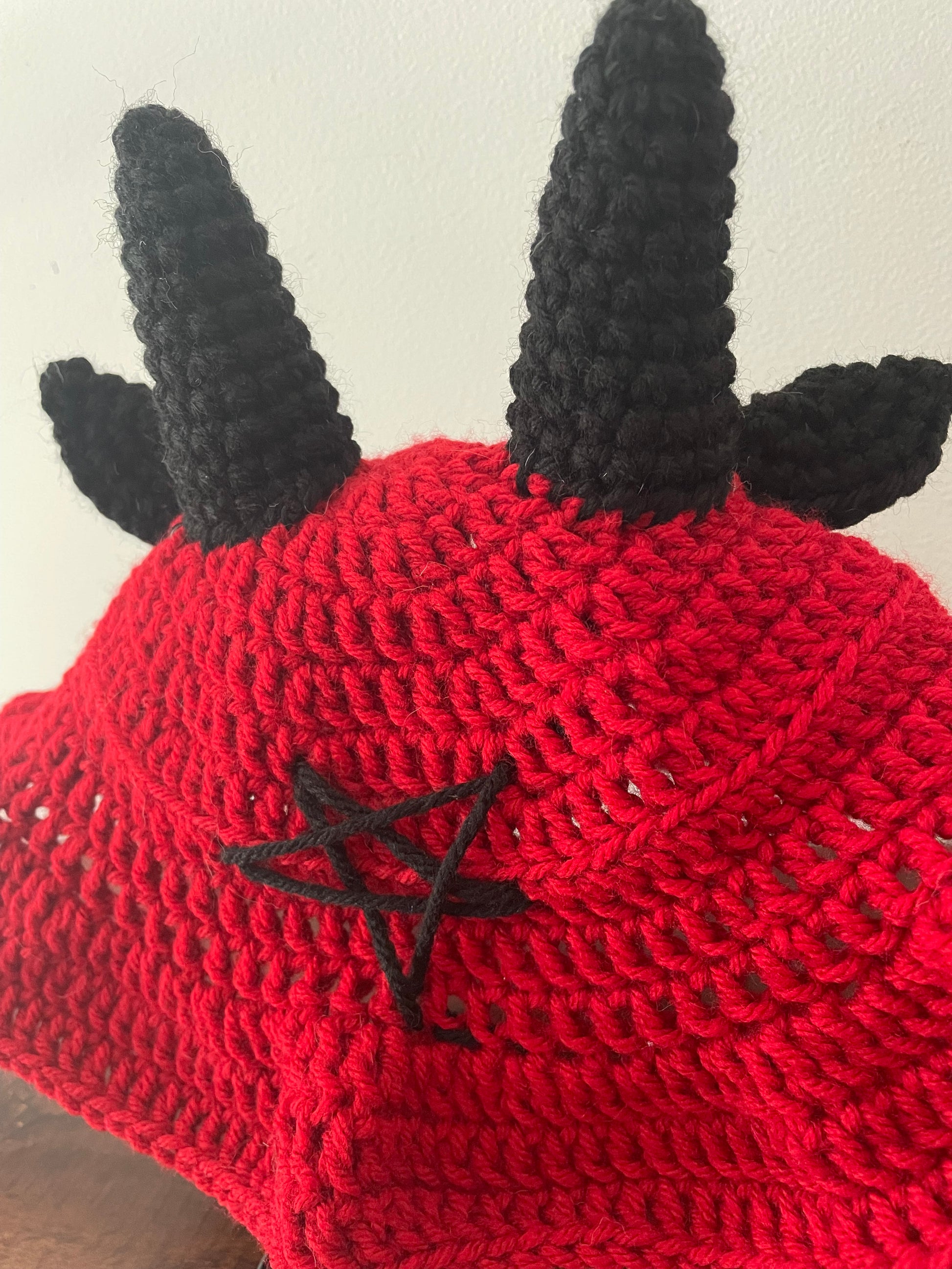 Red and black crochet baphomet bucket hat is made from 100% acrylic yarn. Fits standard adult sizes (and can fit some kid sizes). Hand wash and air dry with horns pointed up to keep the shape. *NOTE: be gentle when washing around pentagram embroidery.