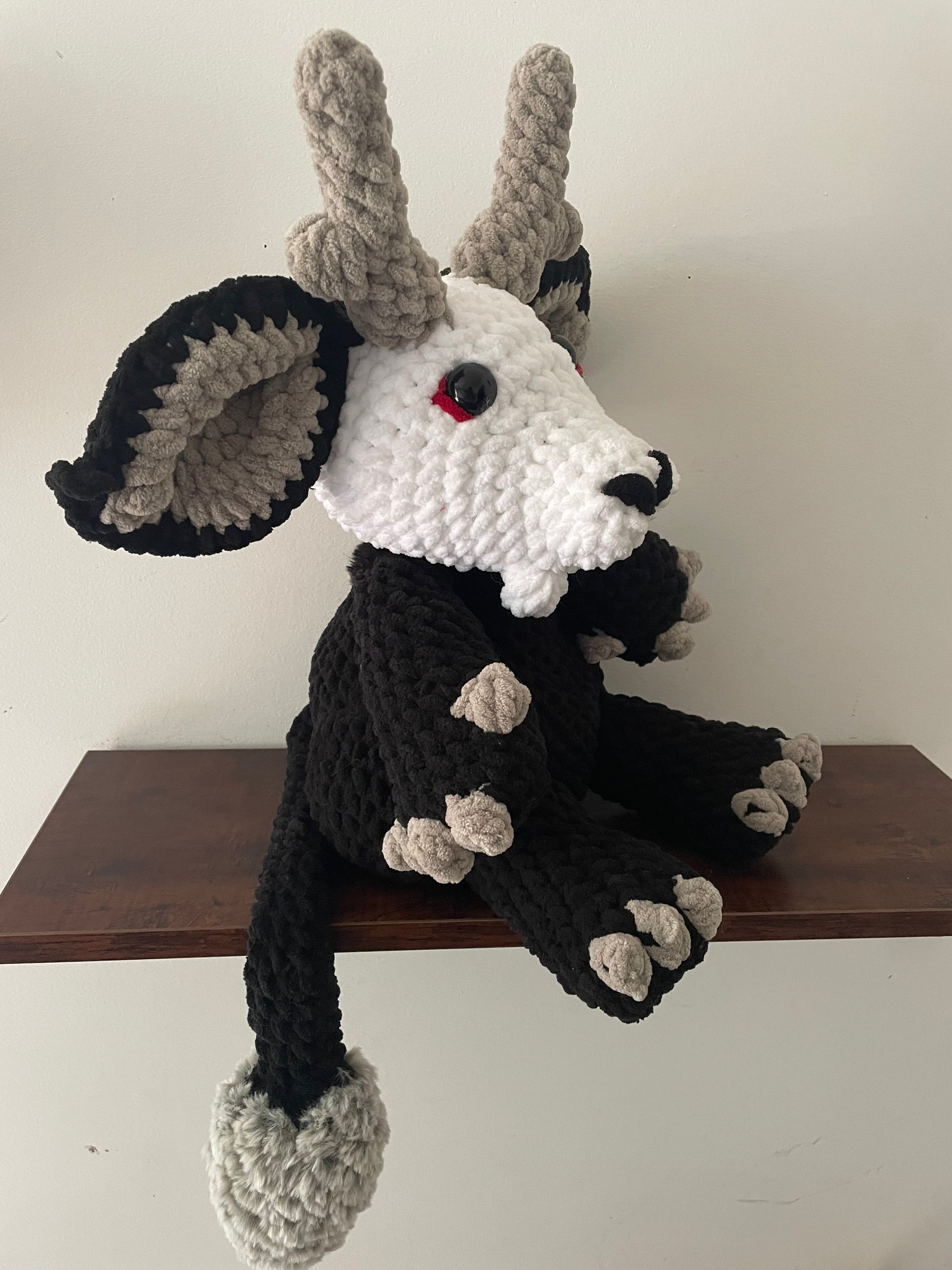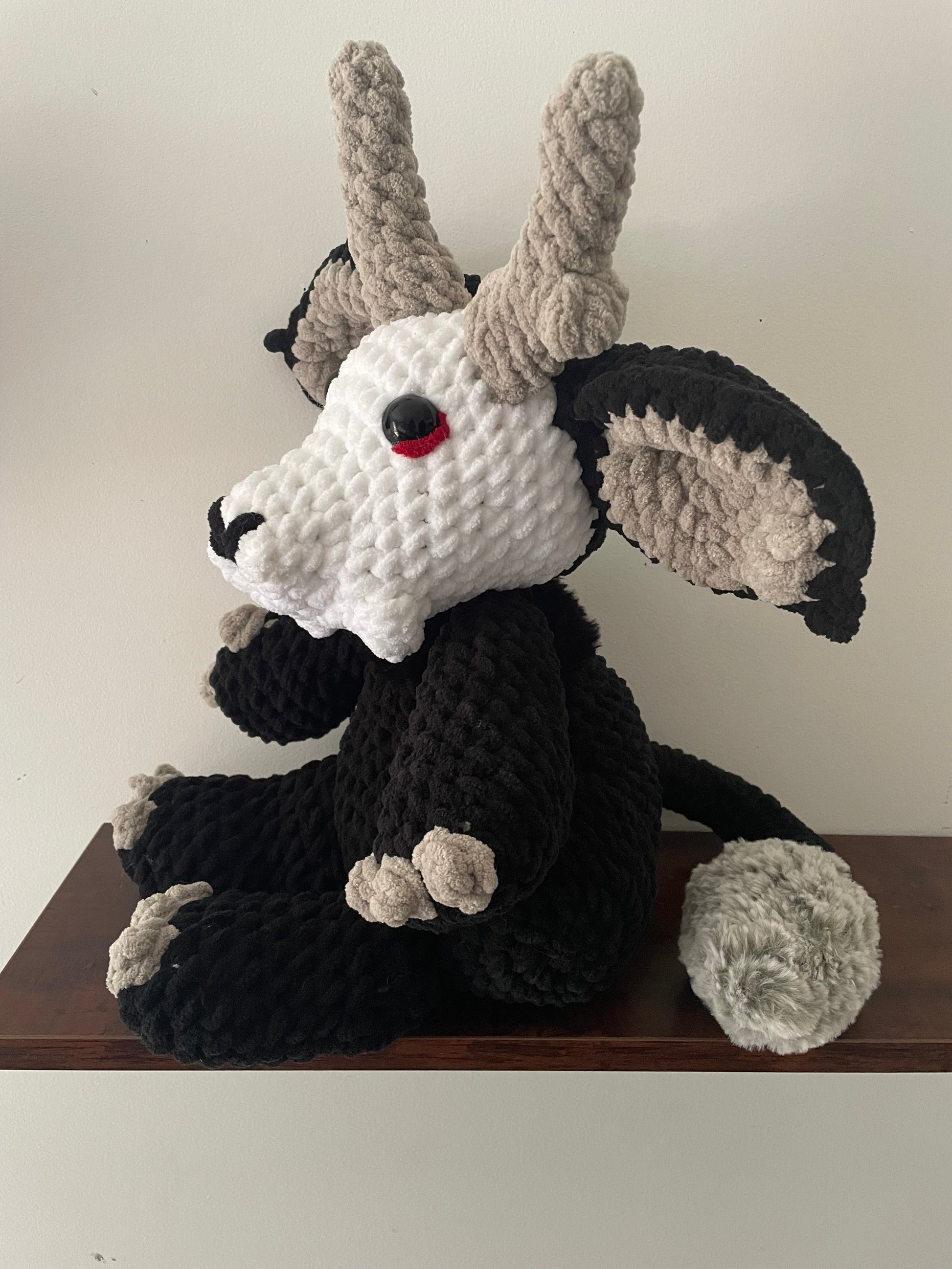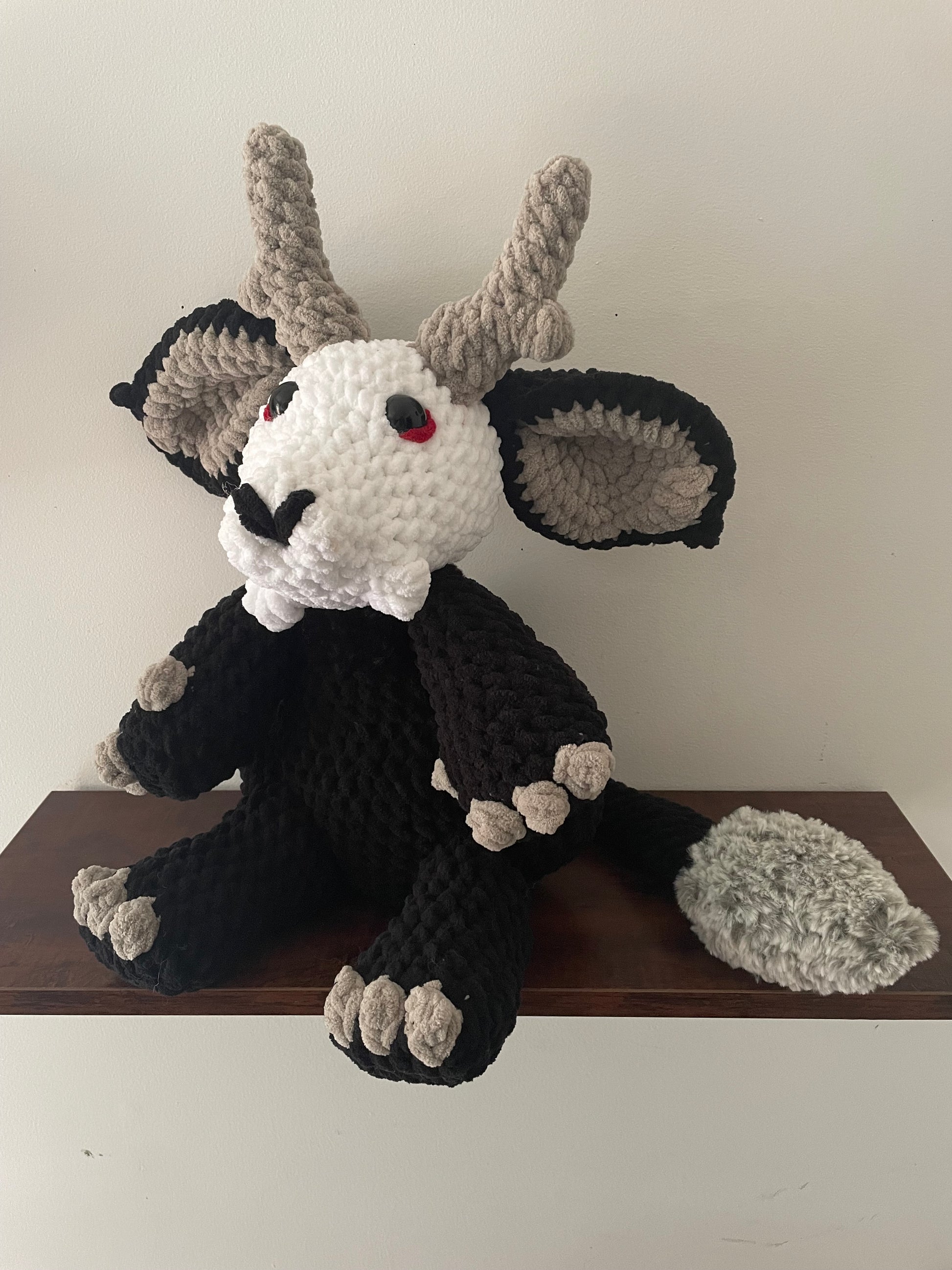 Plush Wendigo is made from soft blanket yarn and has faux fur accents around the neck and tip of the tail. It measures 16.5” tall, 10” across body, 16” across ears, 10” depth including feet, and tail measures 15”.