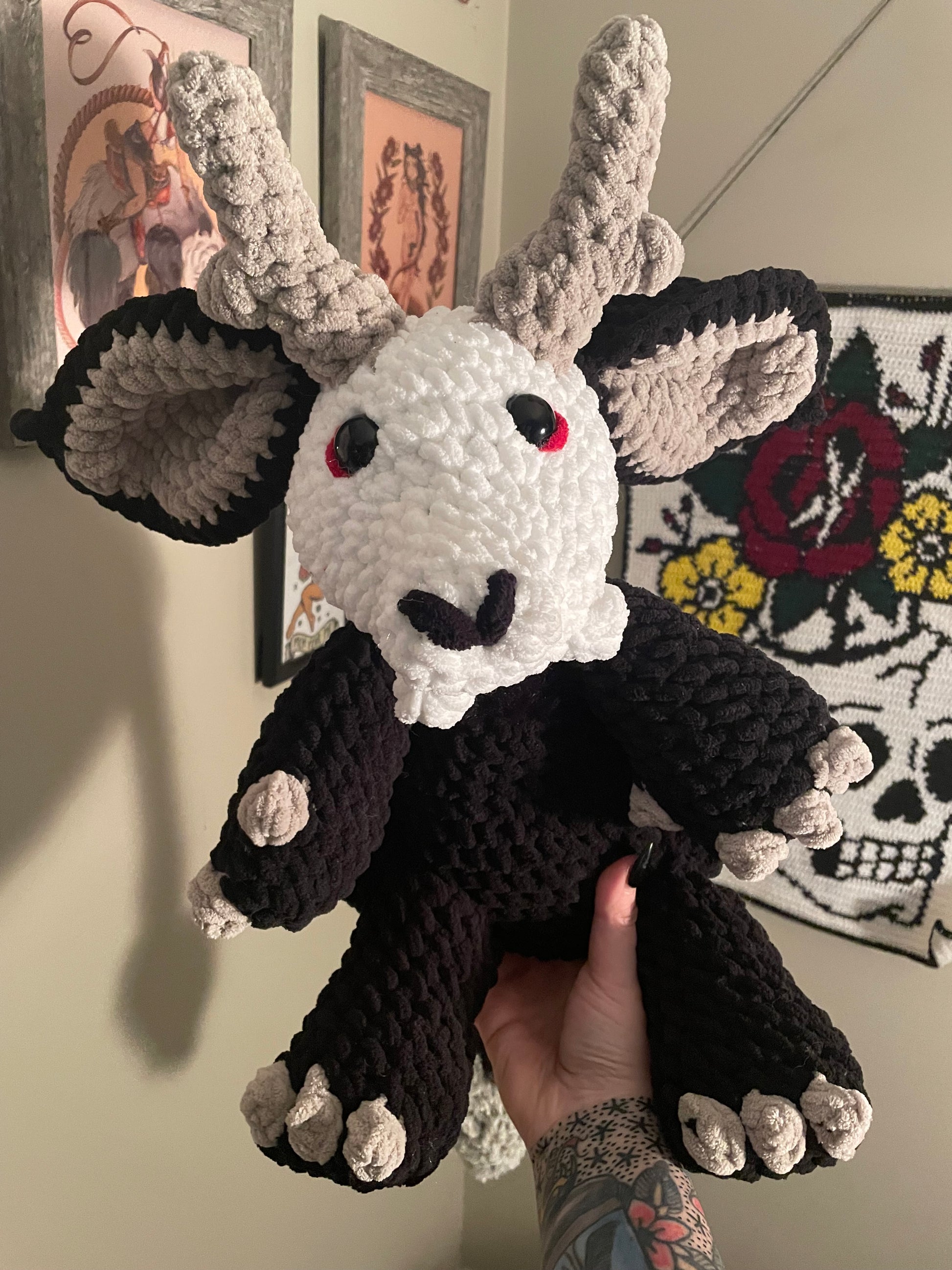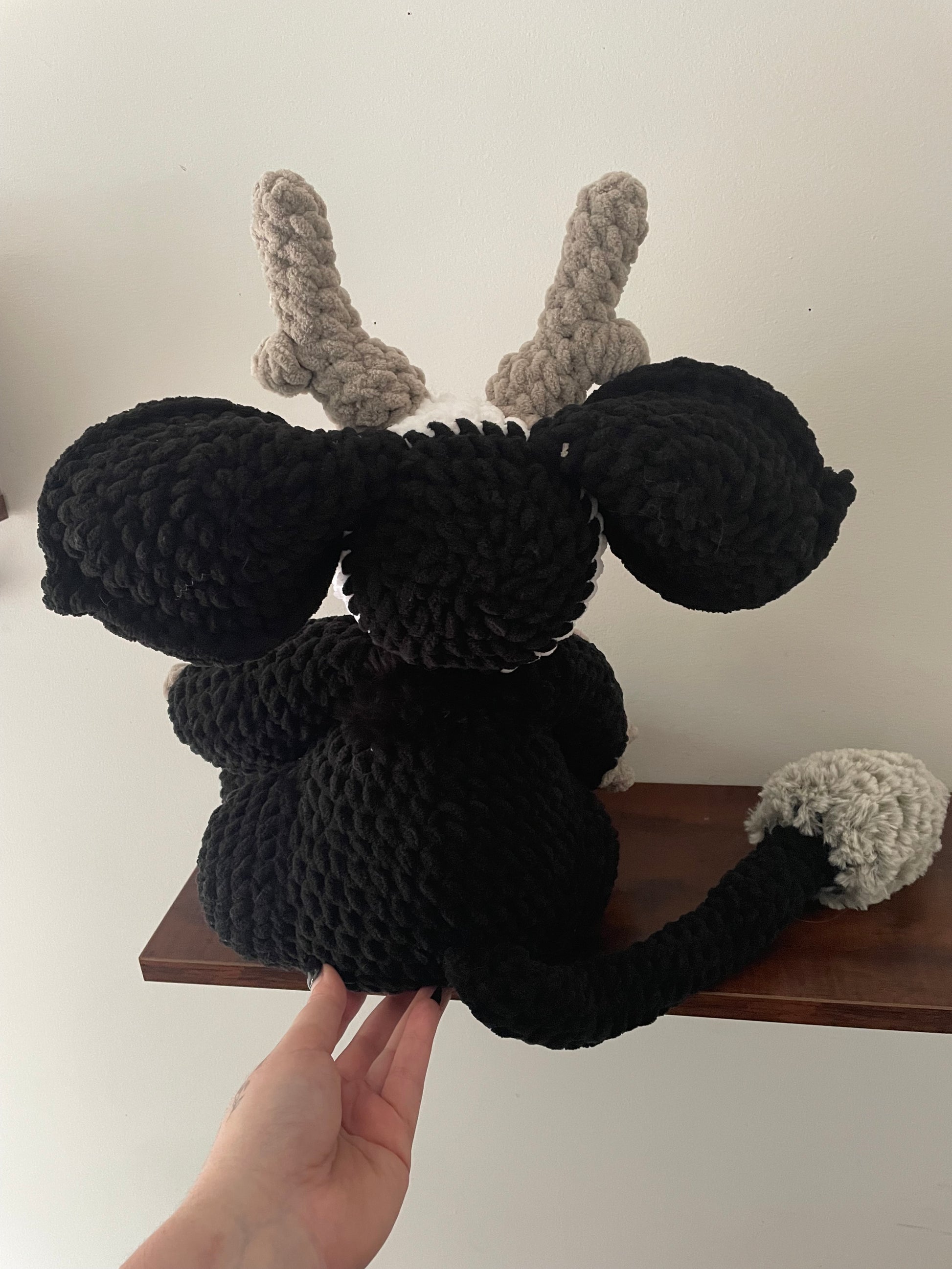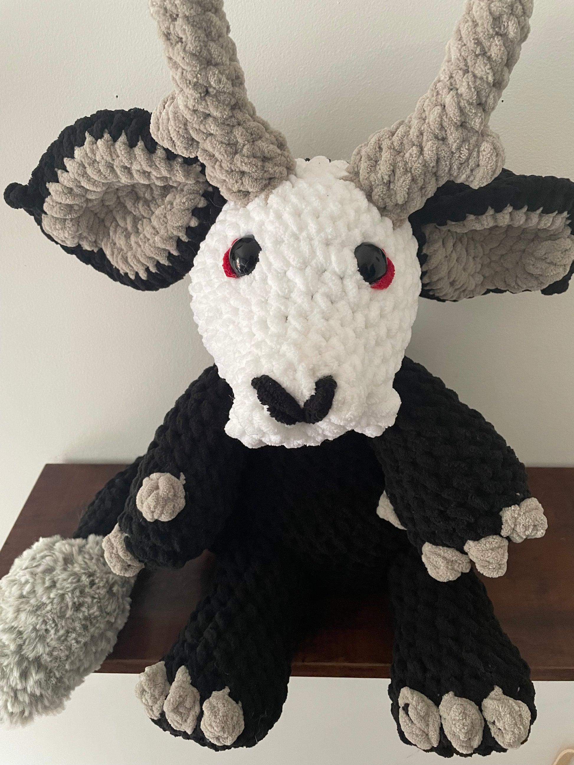Plush Wendigo is made from soft blanket yarn and has faux fur accents around the neck and tip of the tail. It measures 16.5” tall, 10” across body, 16” across ears, 10” depth including feet, and tail measures 15”.