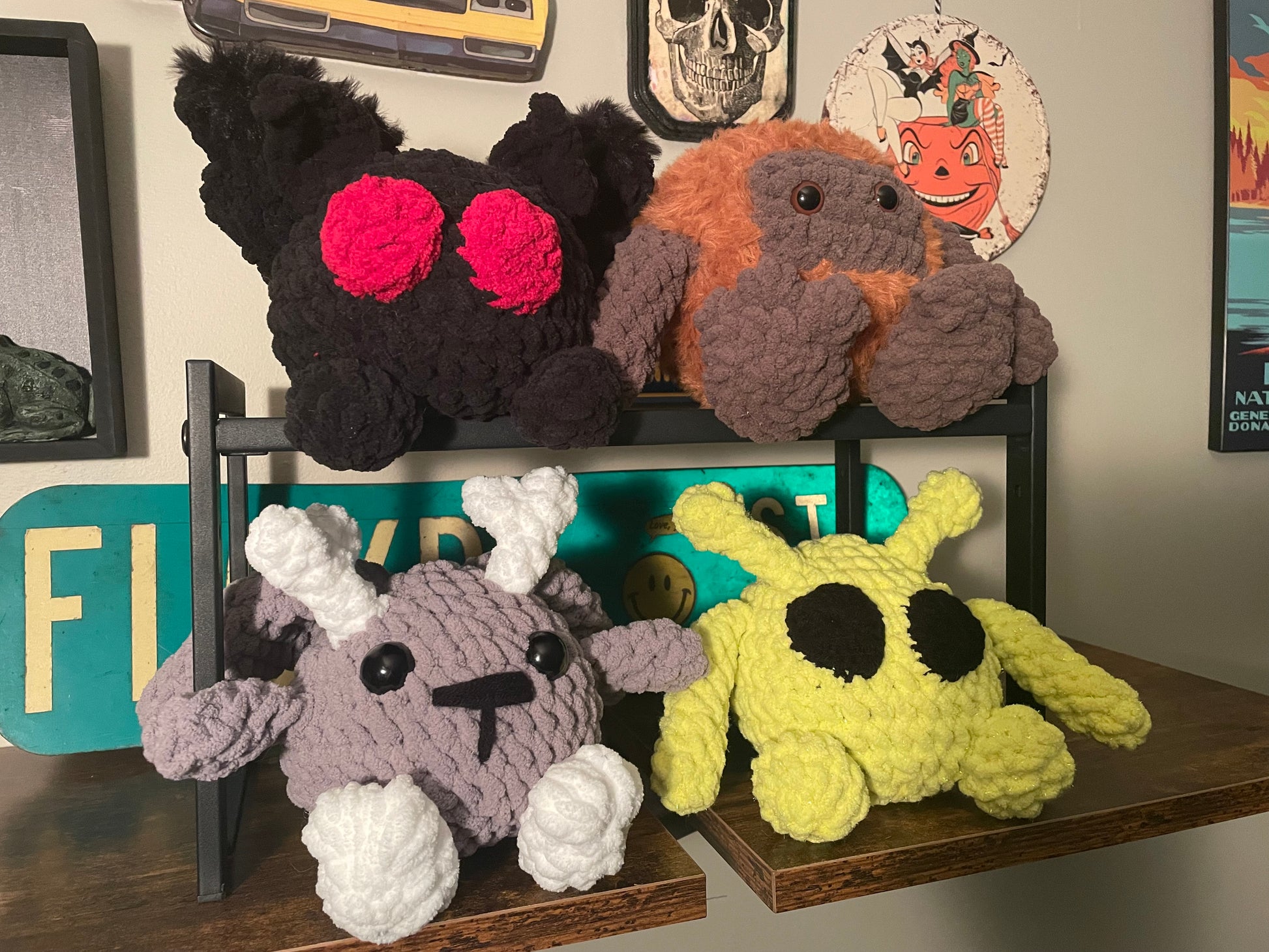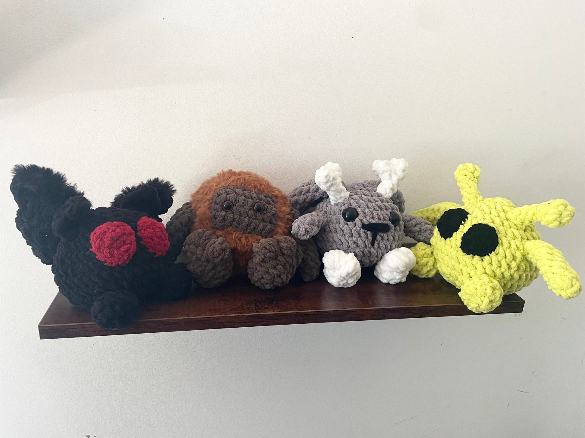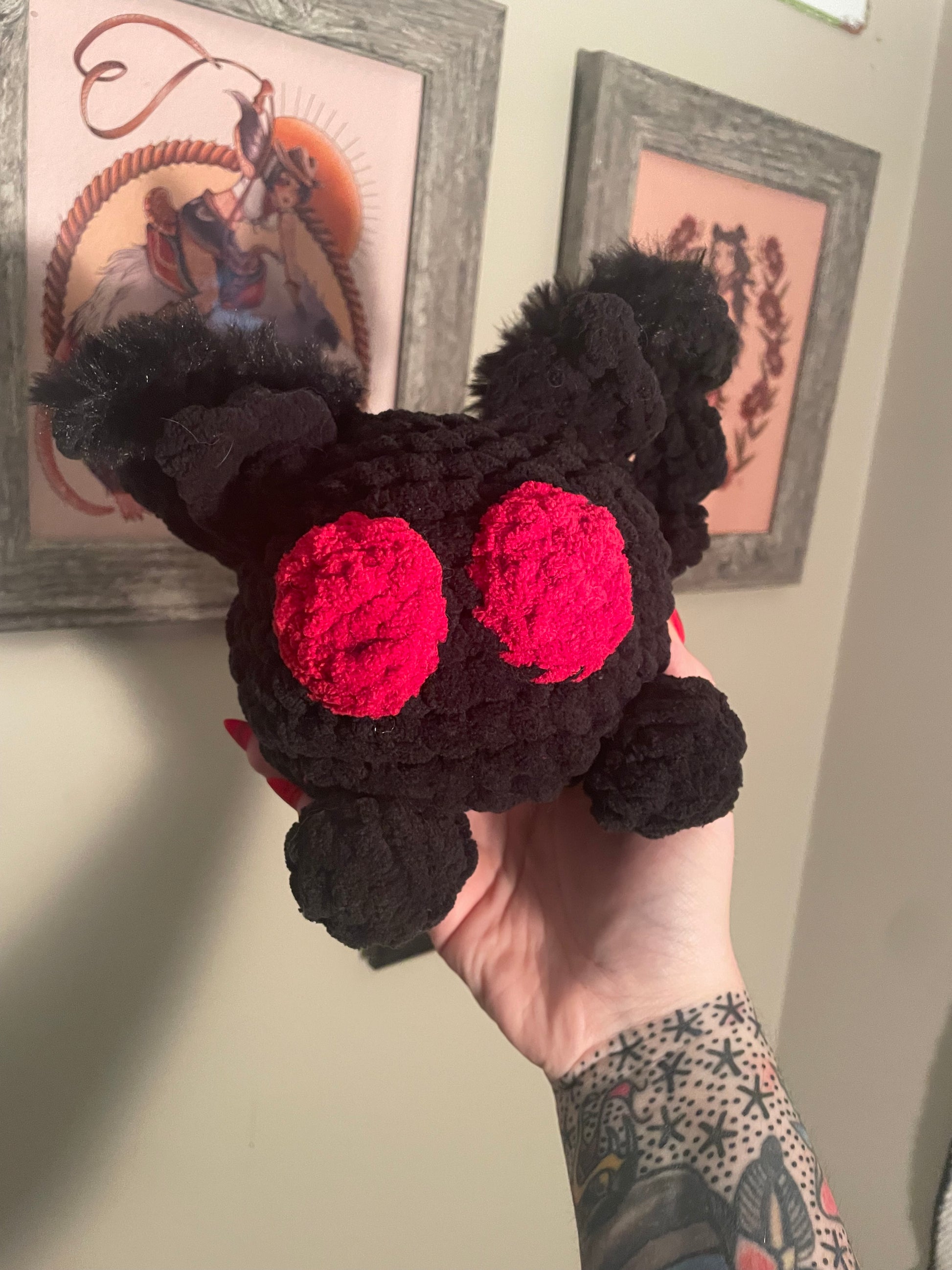Mothman plush measures 8” across wingspan, 6” tall, and 5.5” depth. Original pattern by TheYarningPortal on Etsy.