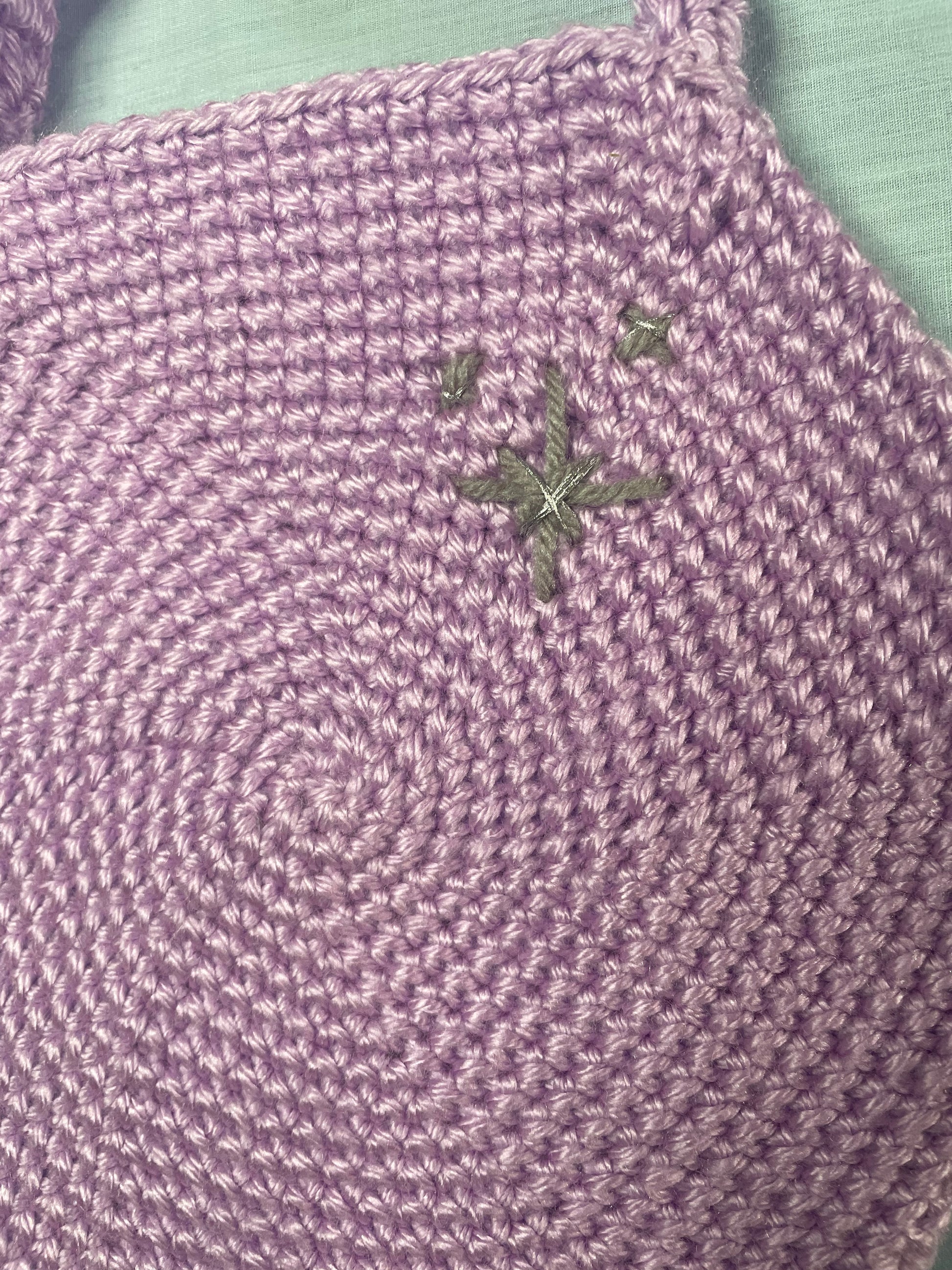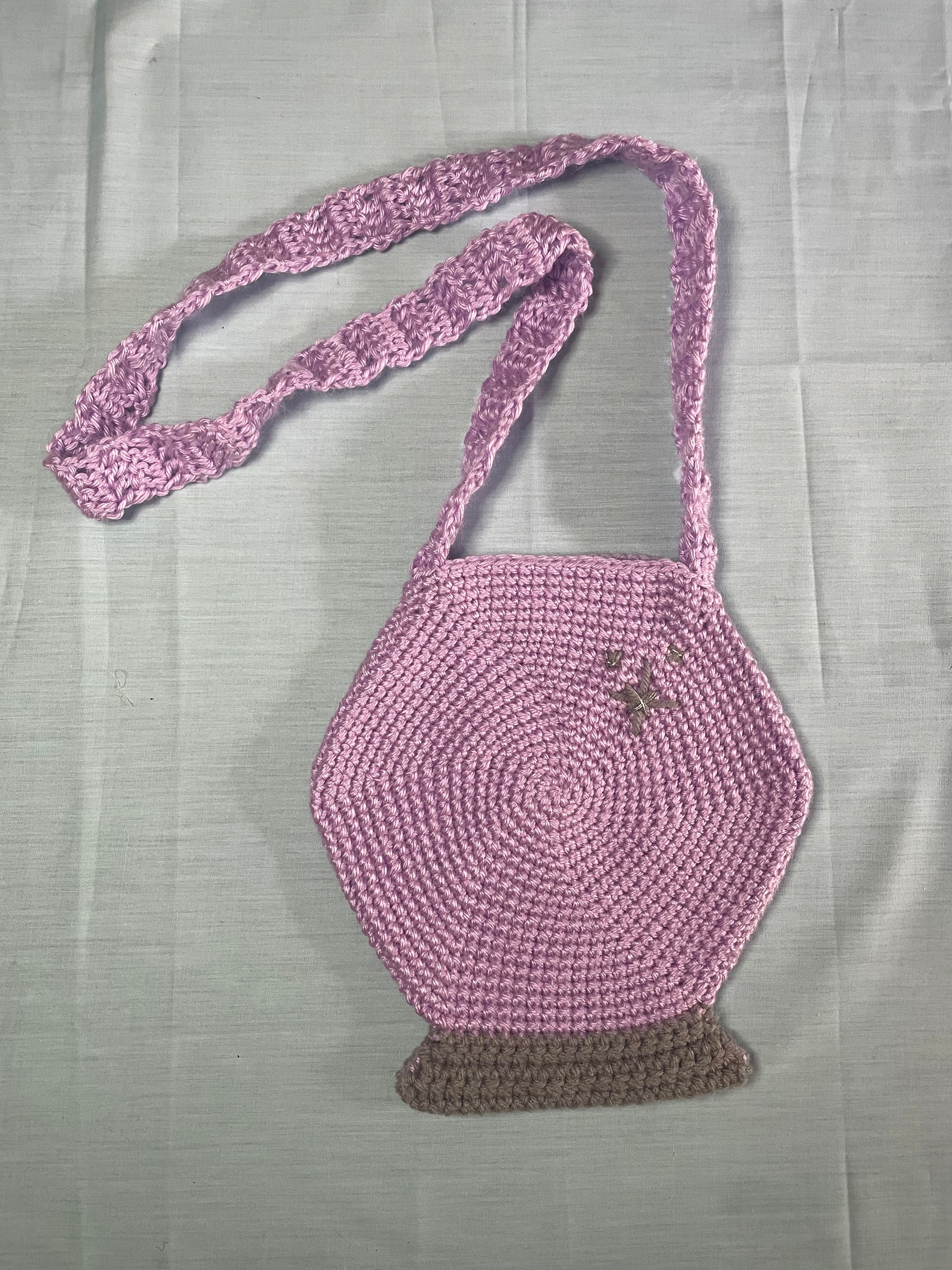 Crochet lavender crystal ball crossbody bag is 100% acrylic and has metallic sparkle accents. It measures 8.5” wide, 9” length, and has a 5” opening. Strap measures 19” from top of purse.