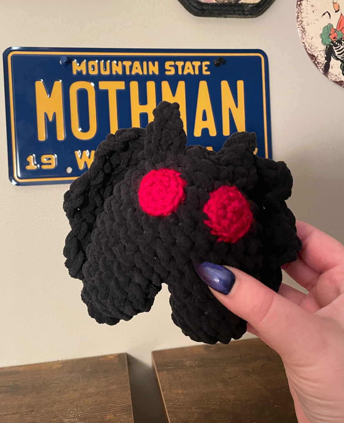 •crochet mothman is made of soft black blanket yarn for main body and red acrylic for the eyes. Measures approx. 6" tall and 7" across (from widest part of wings).
