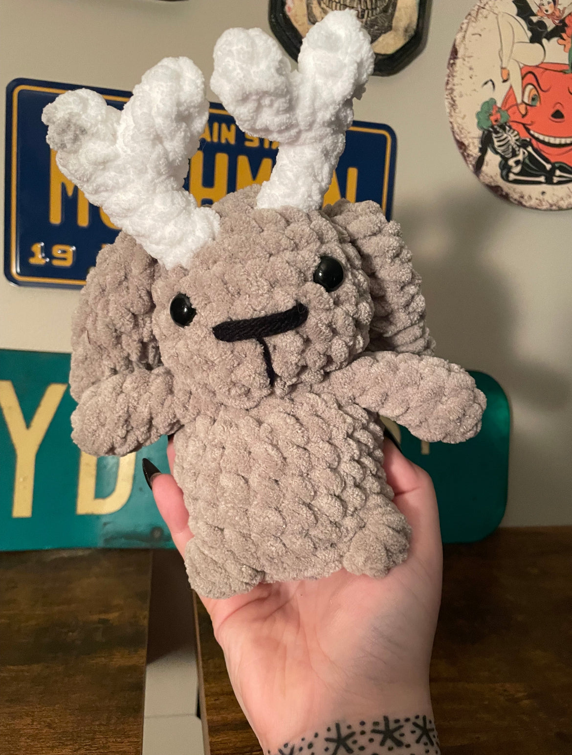 •crochet jackalope is made of soft blanket yarn and has a pom pom tail. Measures approx. 7" tall and 6.5" across.