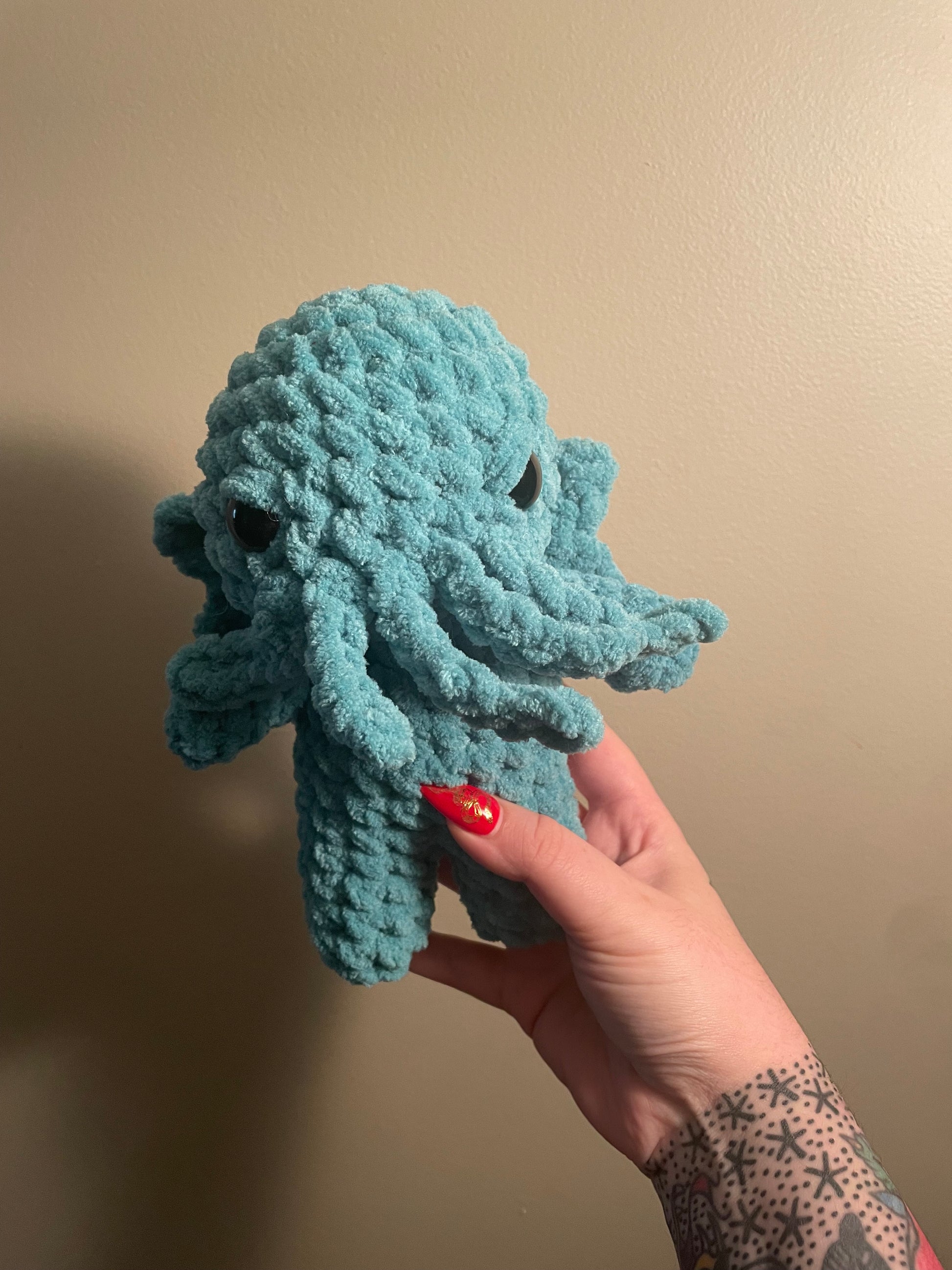 •crochet cthulu is made of soft blanket yarn. Measures approx. 8.5" tall and 7" across wingspan.