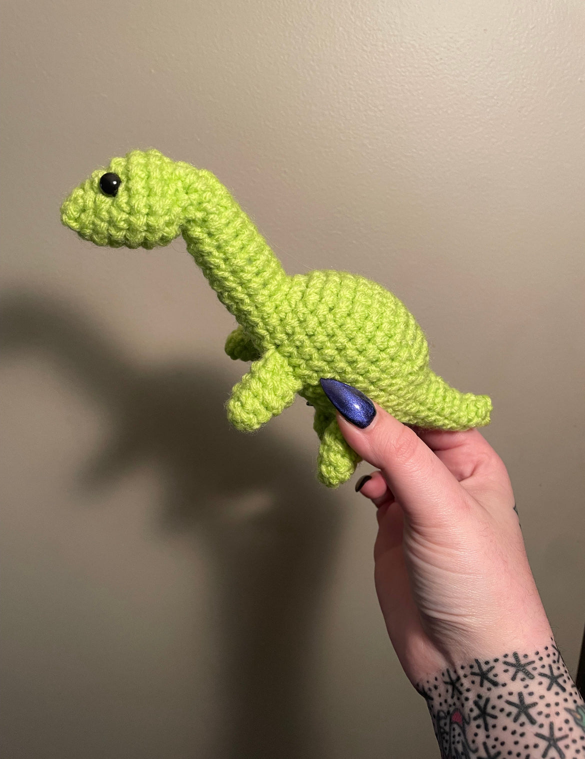 •crochet Nessie is made of 100% acrylic yarn. Measures approx. 3.5" tall and 8" long.