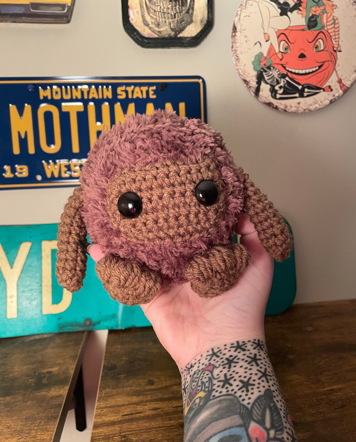 •crochet sasquatch is made of faux fur yarn for the body, and acrylic for arms and face. Measures approx. 6” across body and 5” tall.
