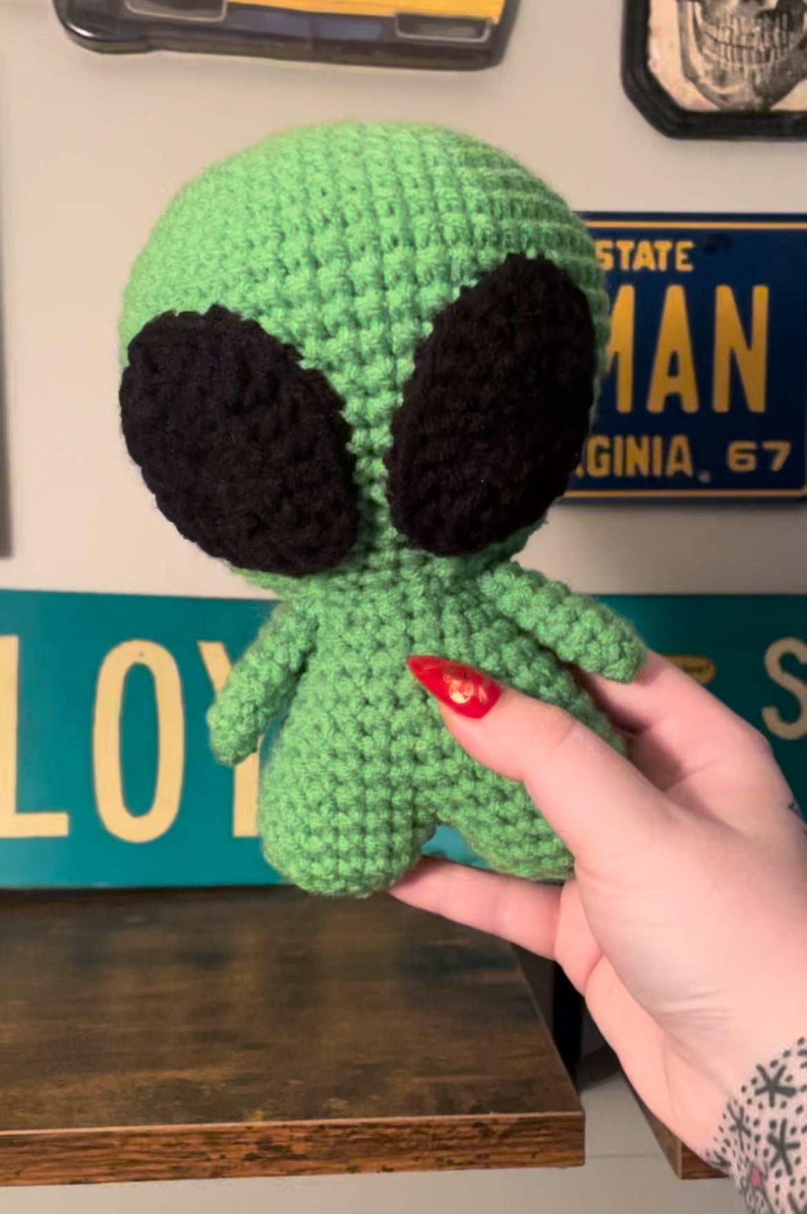 •crochet alien is made of 100% acrylic yarn. Measures approx. 7" tall and 5" wide (from arm to arm).