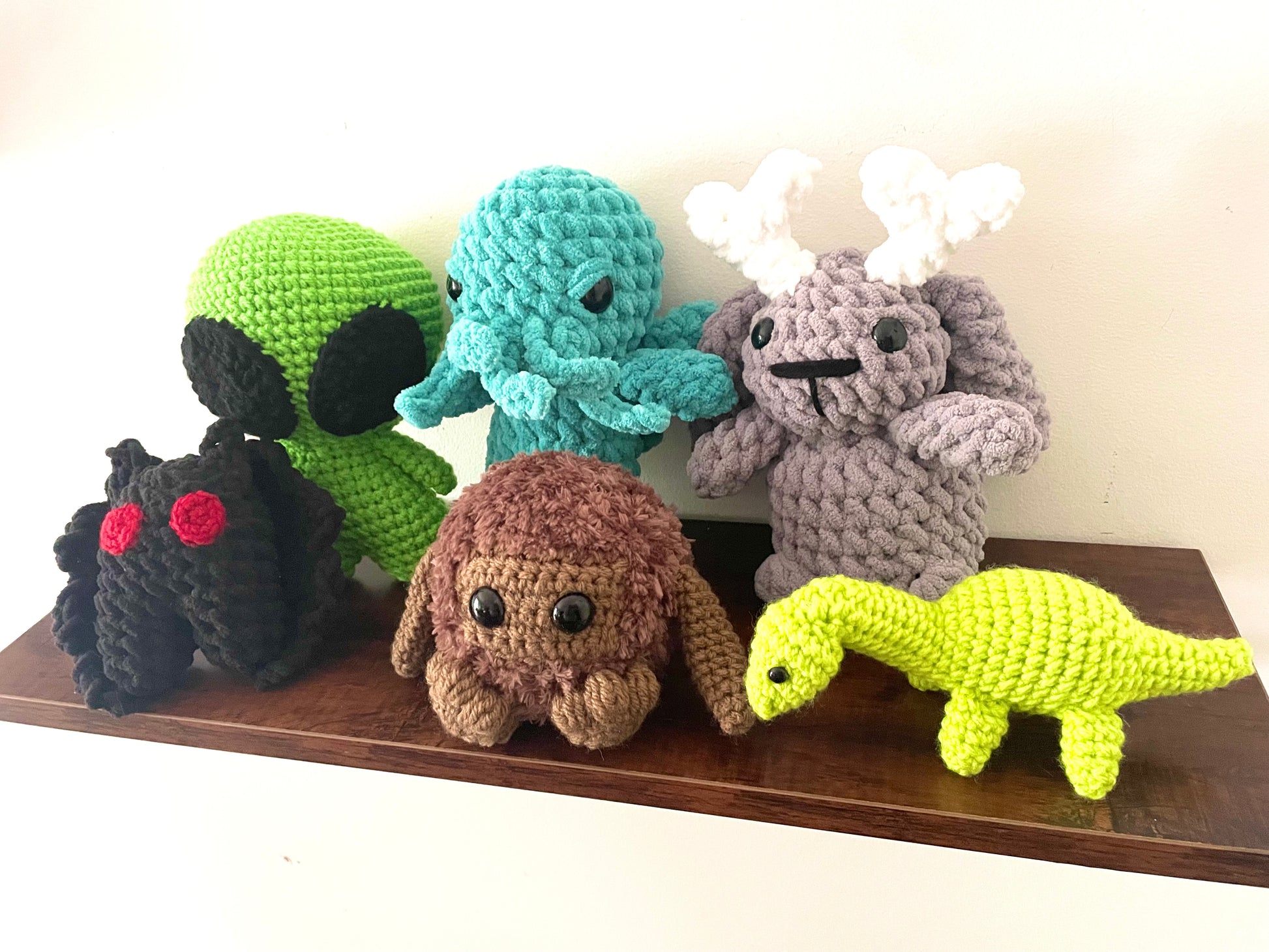 It’s hard to choose your favorite cryptid - why not get one of each? The crochet cryptid collection is here, featuring a plush mothman, alien, bigfoot, jackalope, Loch Ness monster, and cthulu. A $135 value when purchased individually!