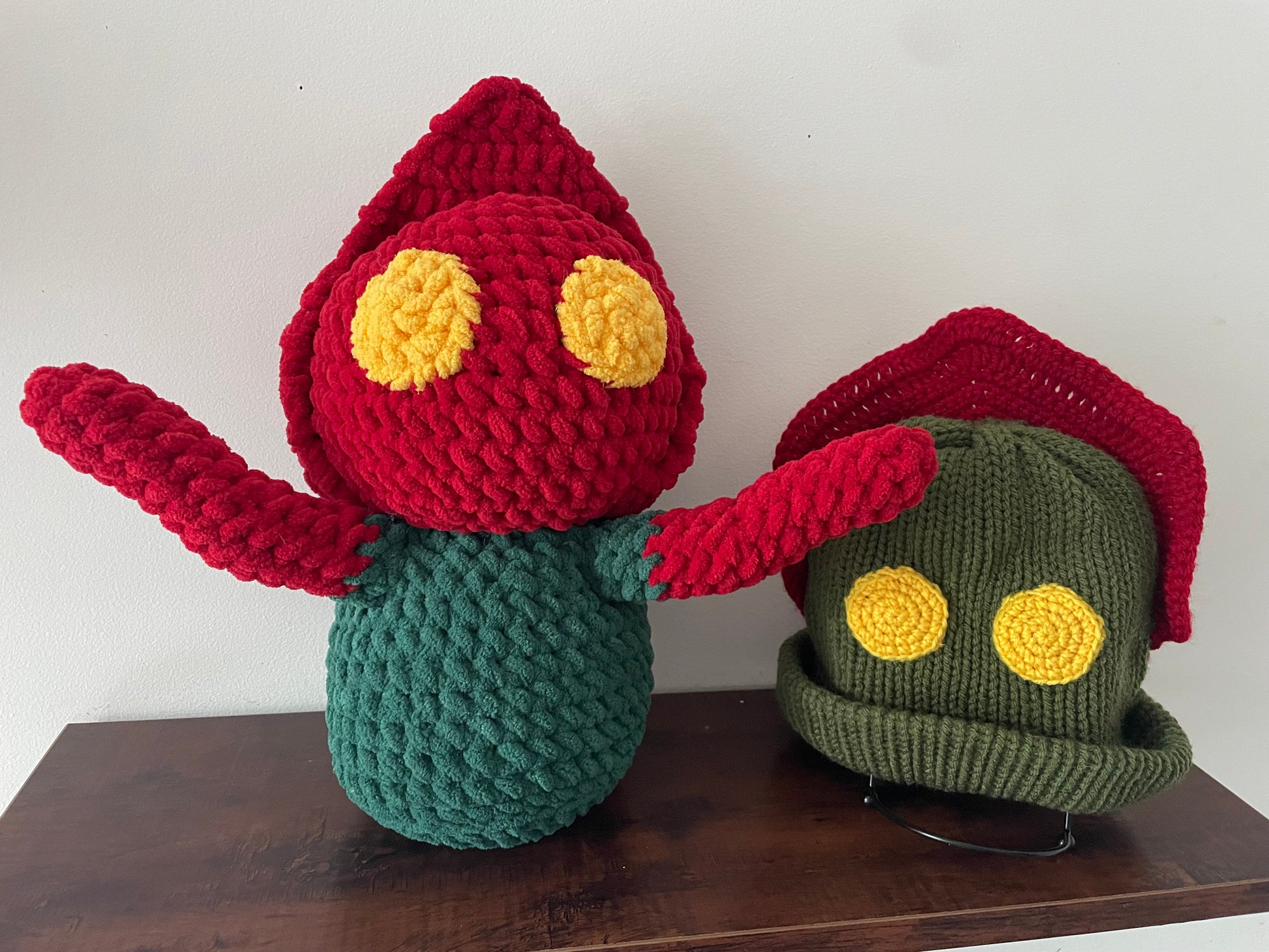 Crochet Flatwoods monster plush is made of soft blanket yarn. It measures 15” tall and 14” from arm to arm. Body and head alone measure 7” wide each. Individual price: $45