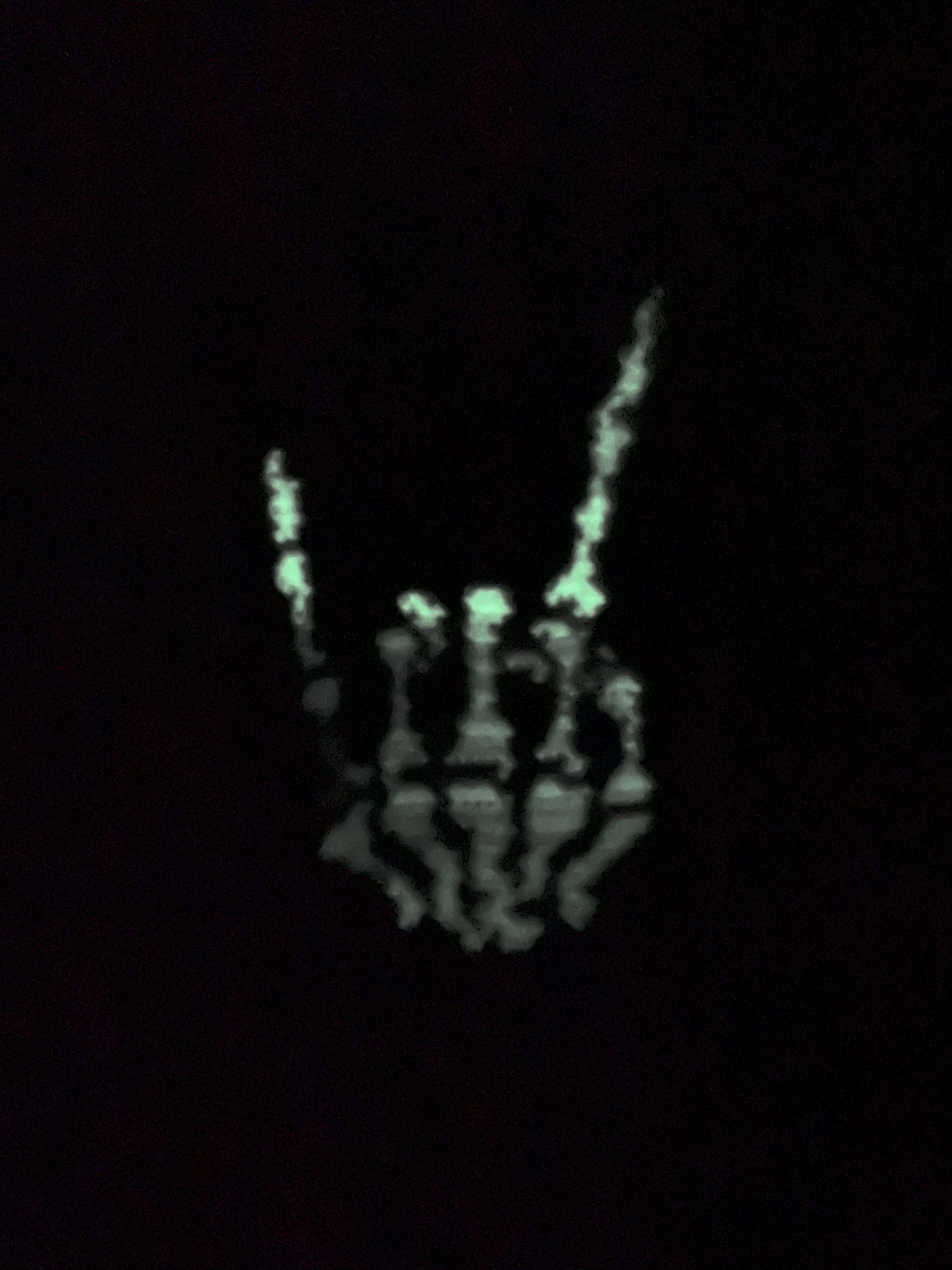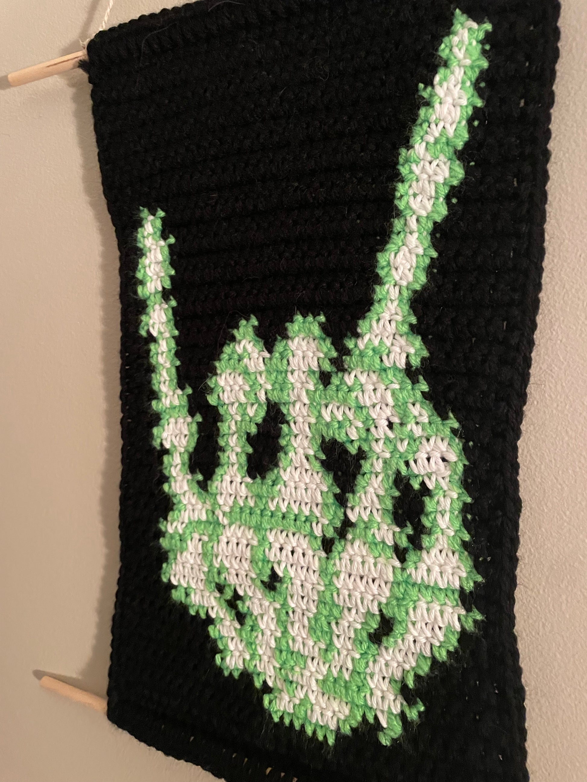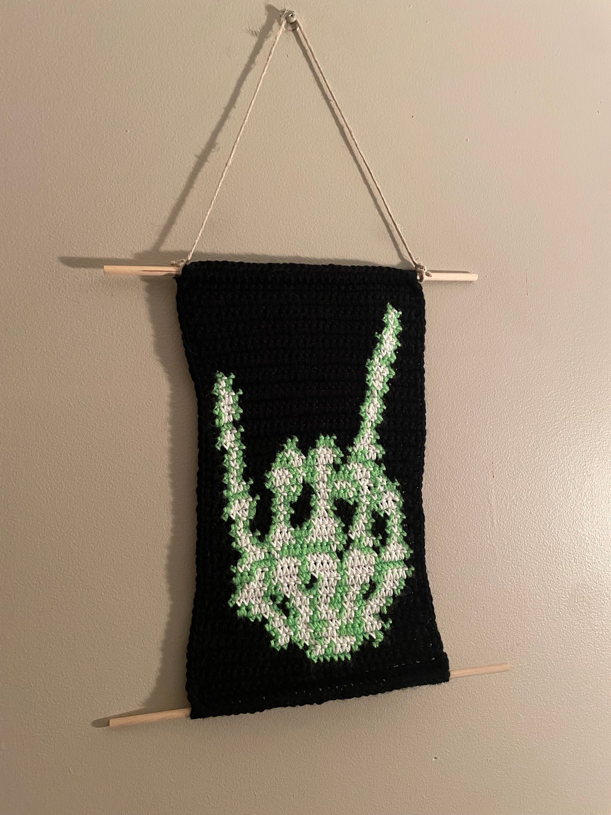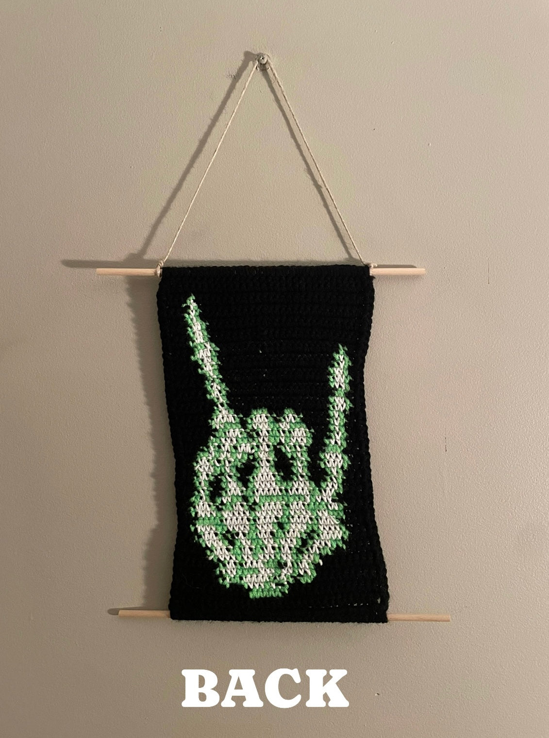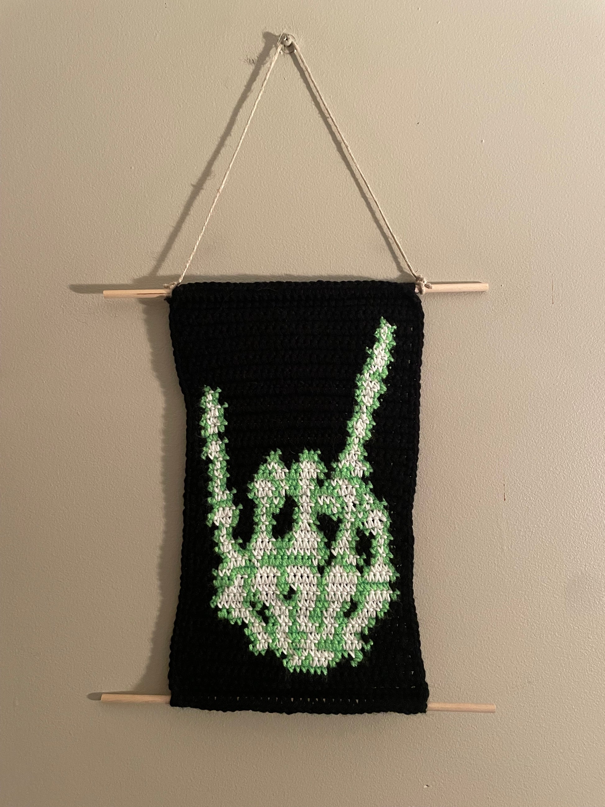 Crochet skeleton rock hand tapestry is made with glow in the dark yarn; mounted on dowel rods and hung with hemp rope. 100% acrylic. Tapestry measures 7.5” wide and 13” long. Dowel rods measure 12”.