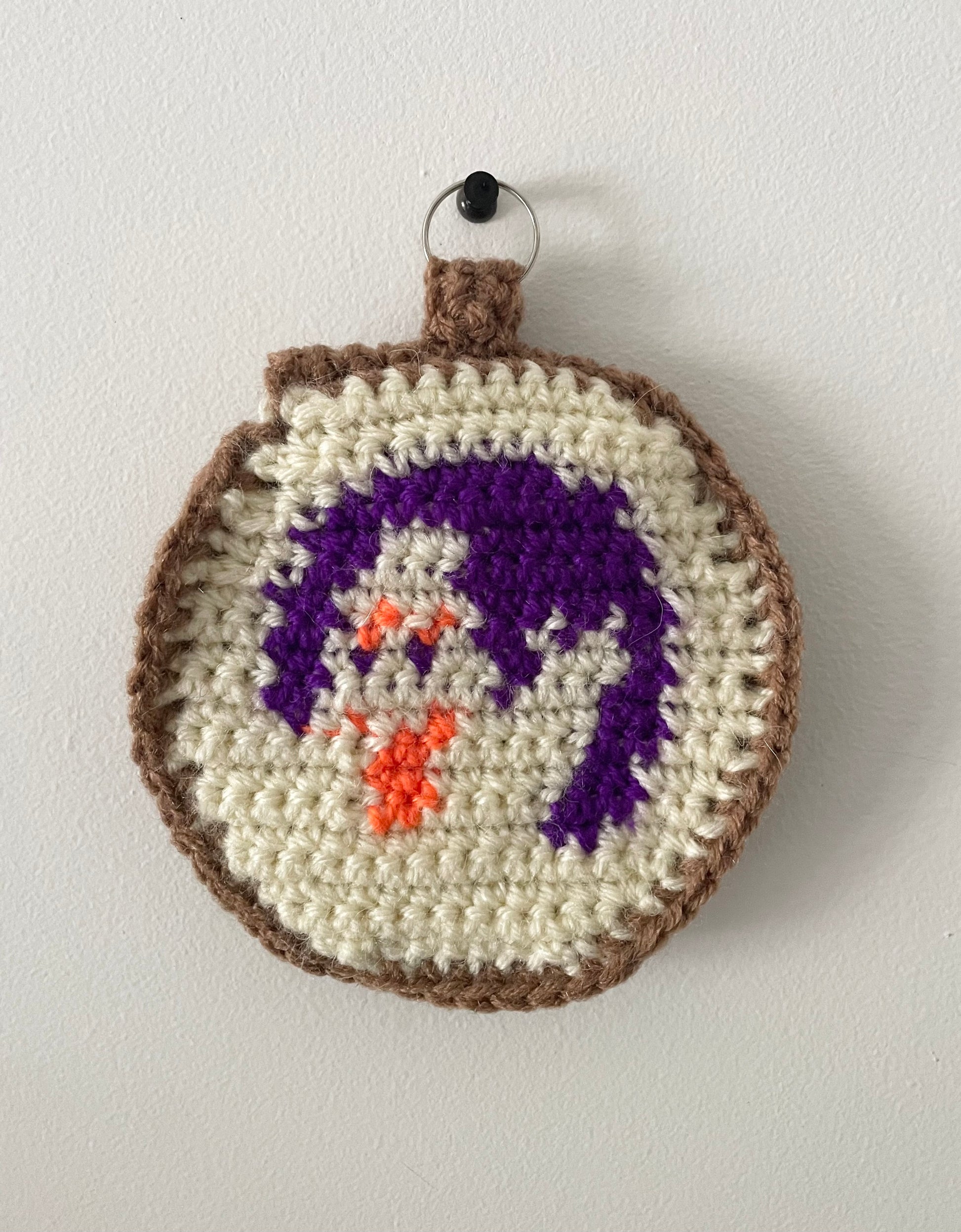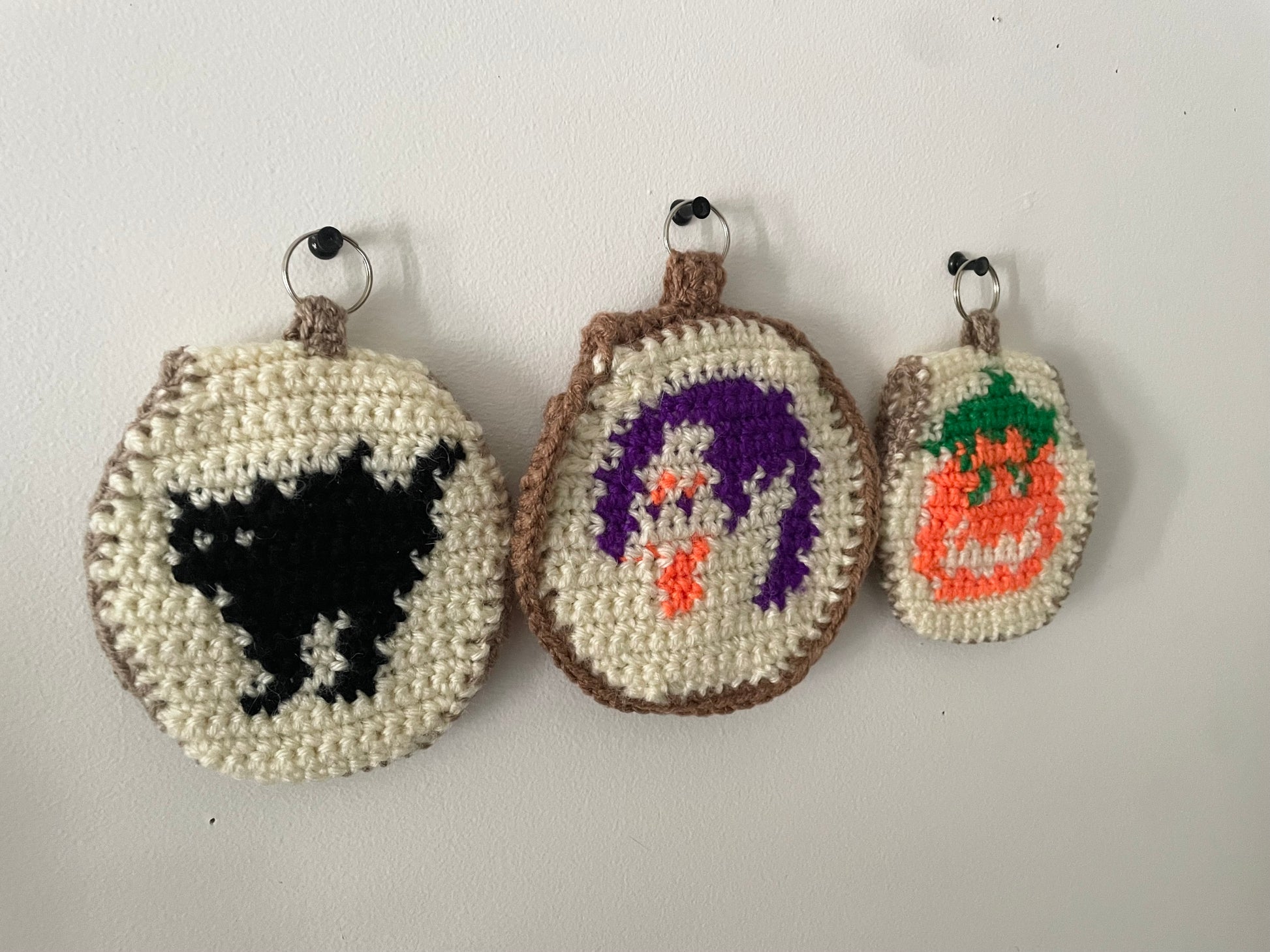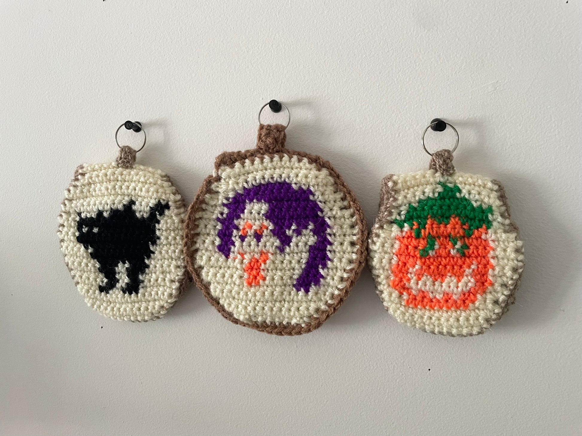 Nostalgic Pillsbury Halloween cookie crochet keychain pouches; choose from ghost, black cat, or jack-o-lantern. Gold button closure on the back, openings measure 3.5” on all.