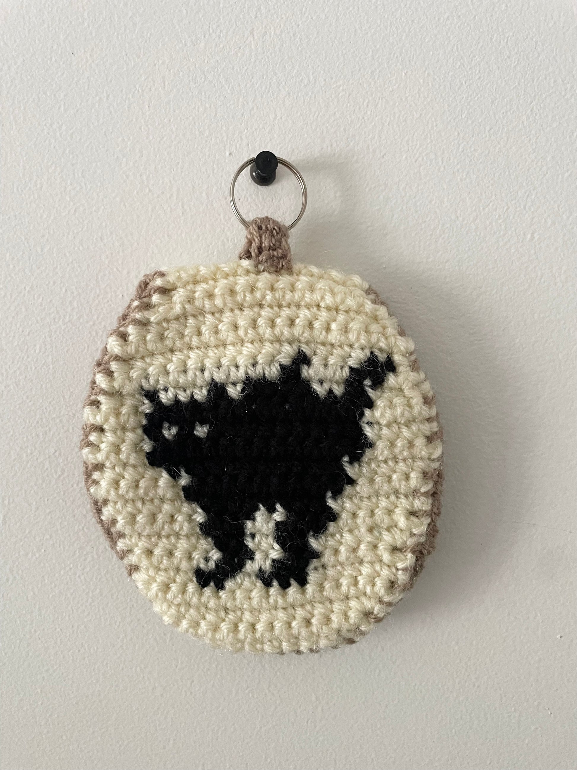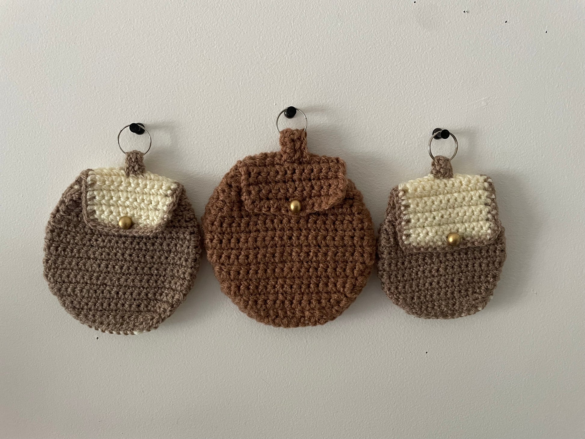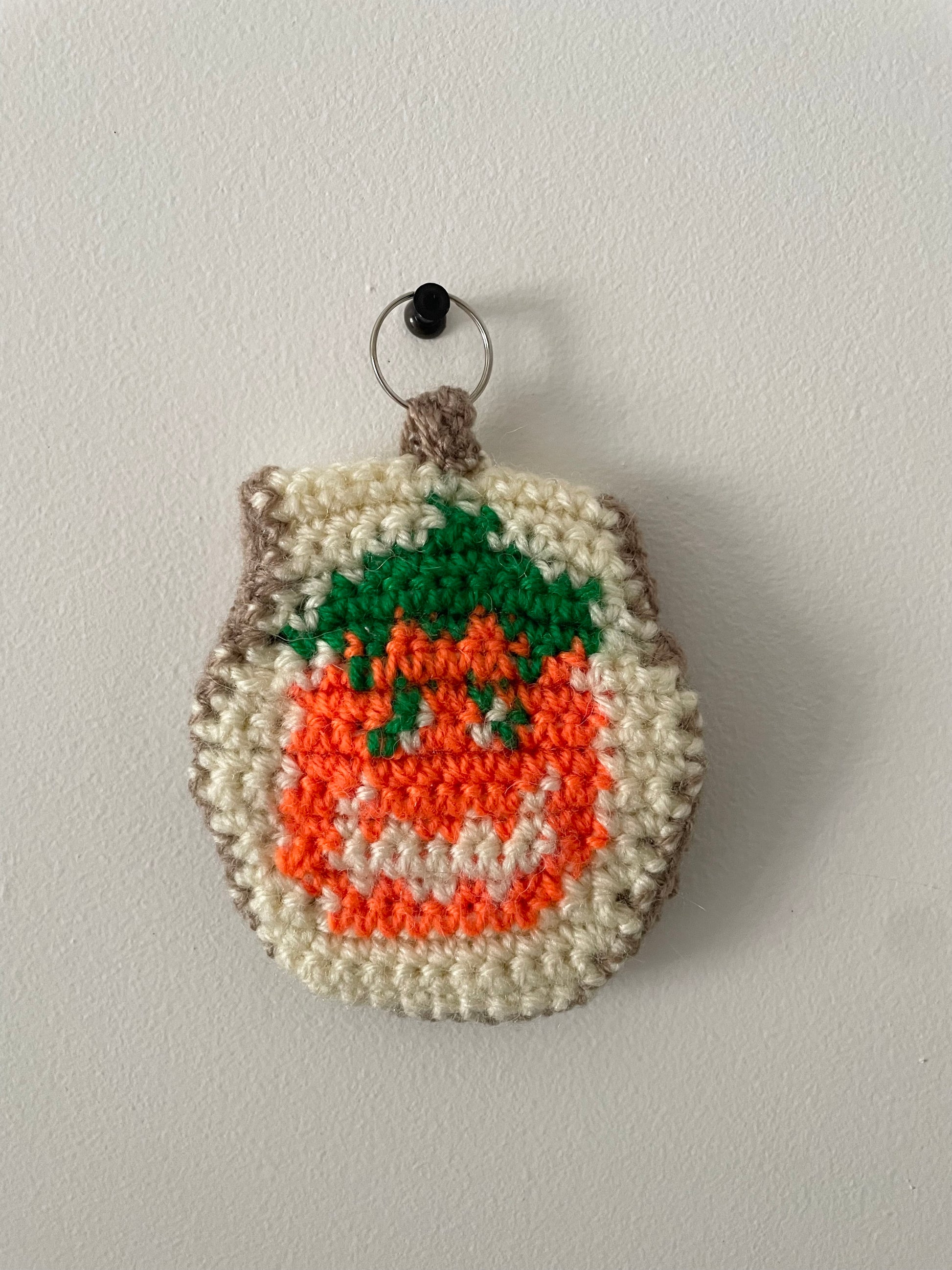 Nostalgic Pillsbury Halloween cookie crochet keychain pouches; choose from ghost, black cat, or jack-o-lantern. Gold button closure on the back, openings measure 3.5” on all.