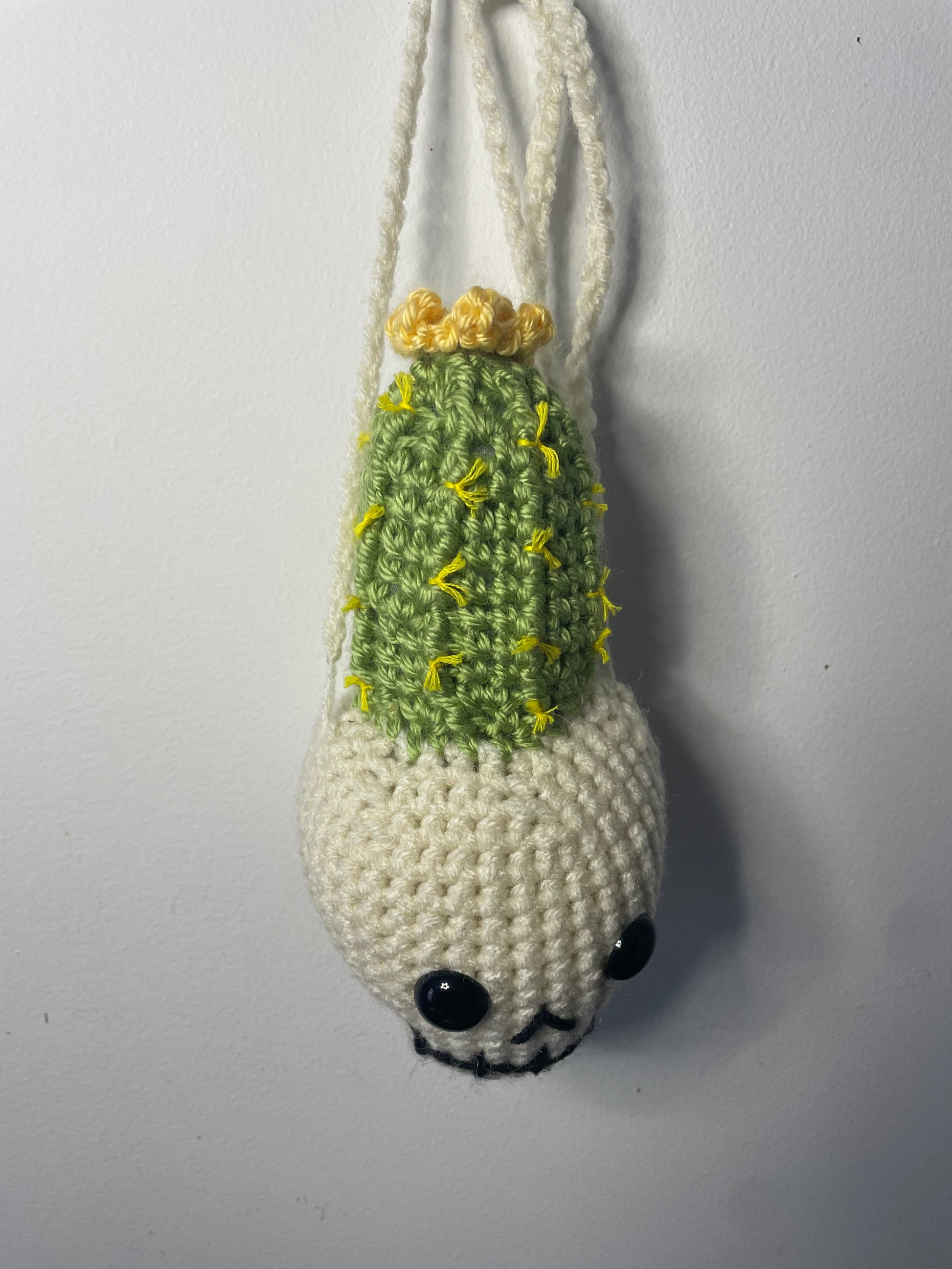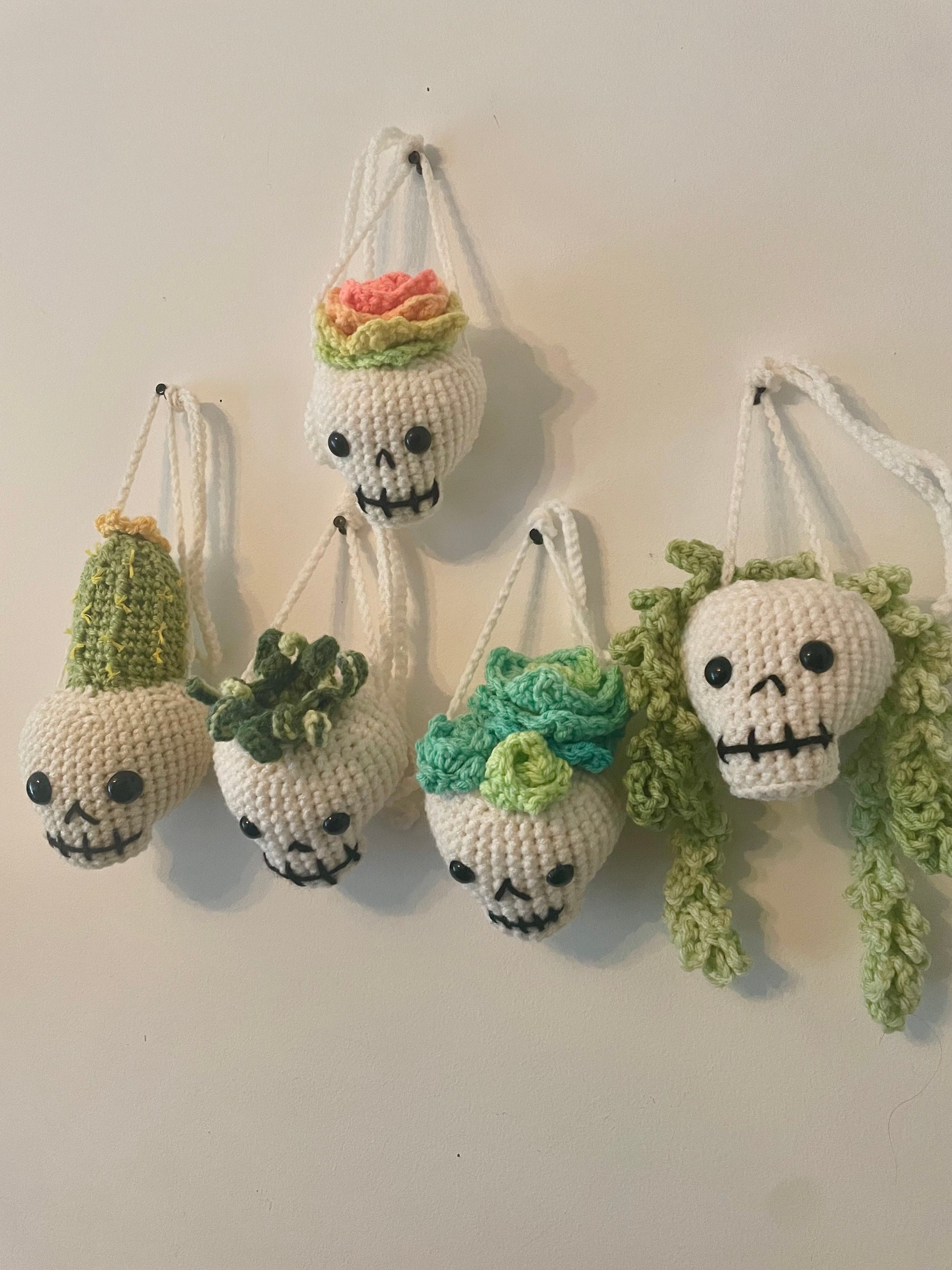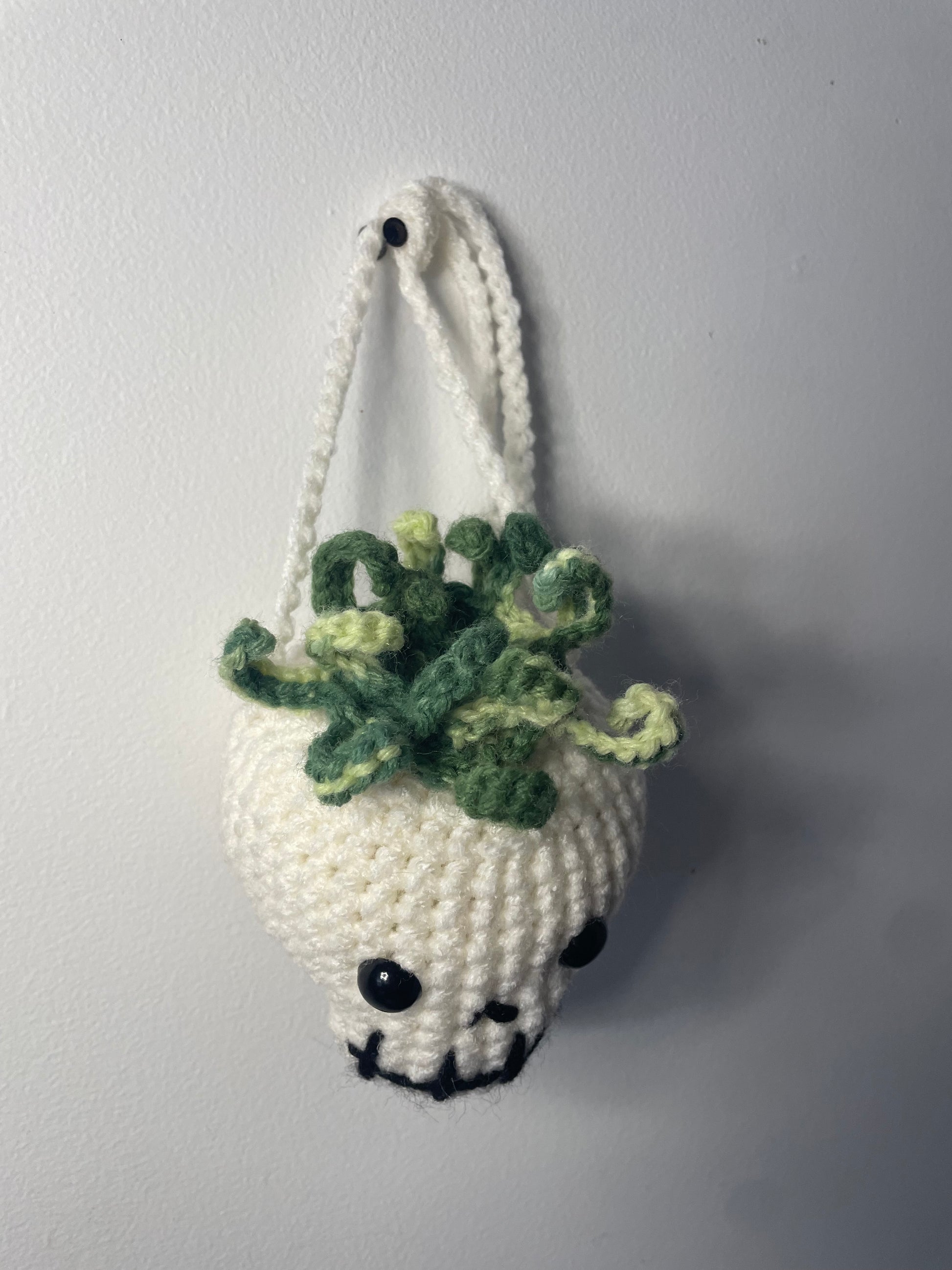 Handmade crochet hanging skull planter is made of 100% acrylic yarn. Hanging strings measure approx. 14-16" but can be shortened with a knot. Some plants may need to be fluffed back out to shape after shipping.