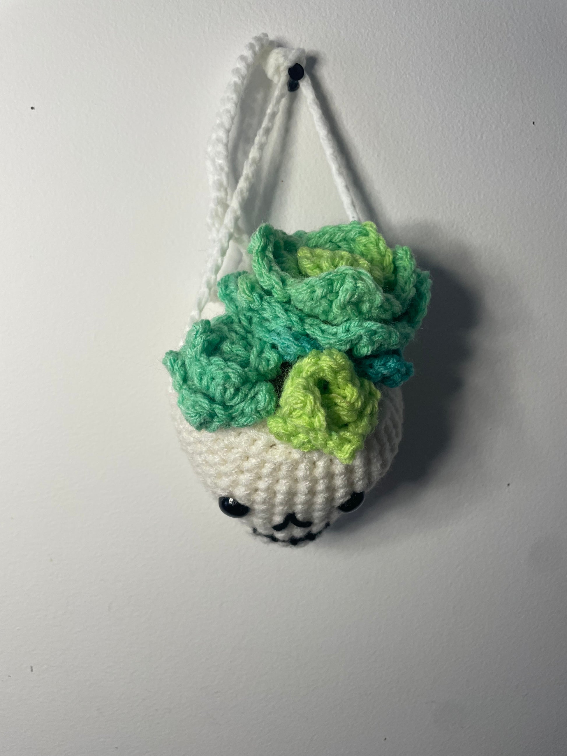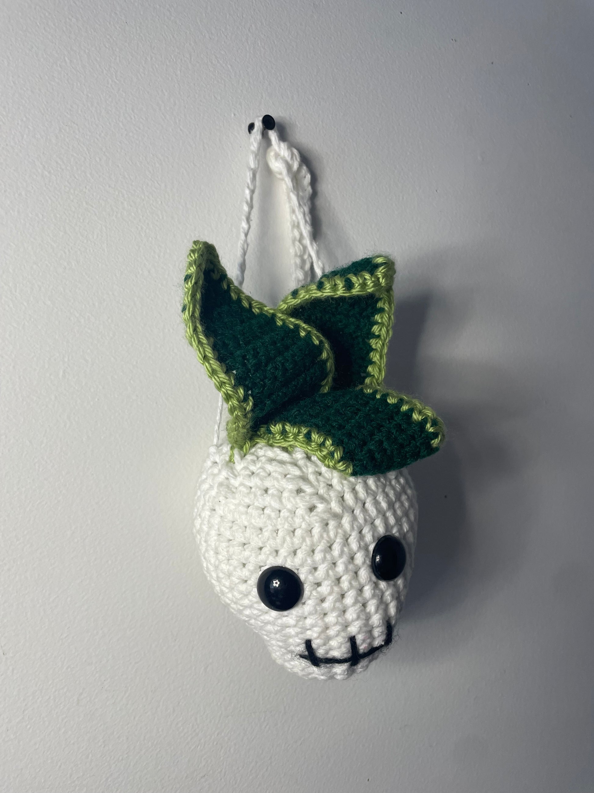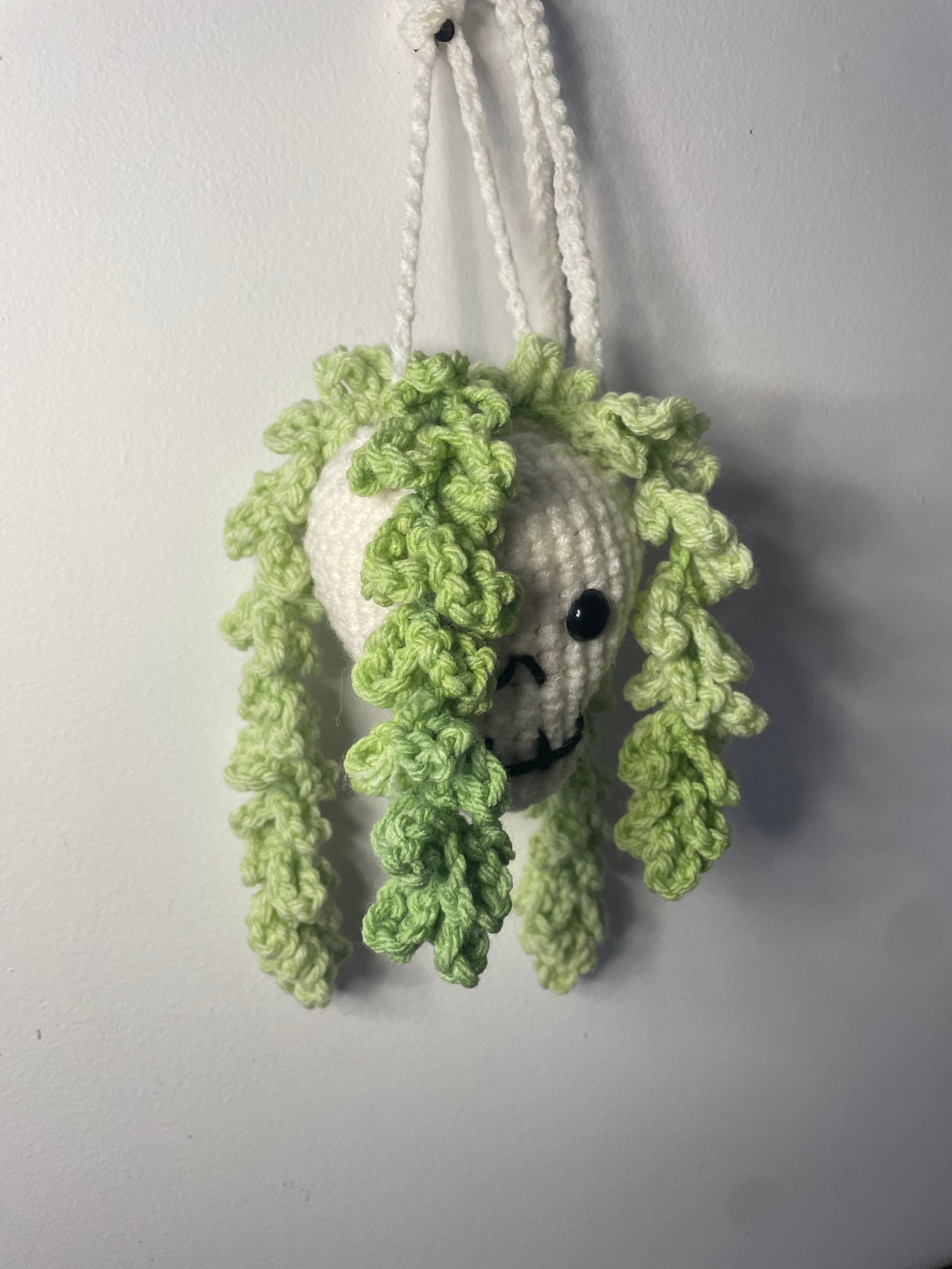 Handmade crochet hanging skull planter is made of 100% acrylic yarn. Hanging strings measure approx. 14-16" but can be shortened with a knot. Some plants may need to be fluffed back out to shape after shipping.