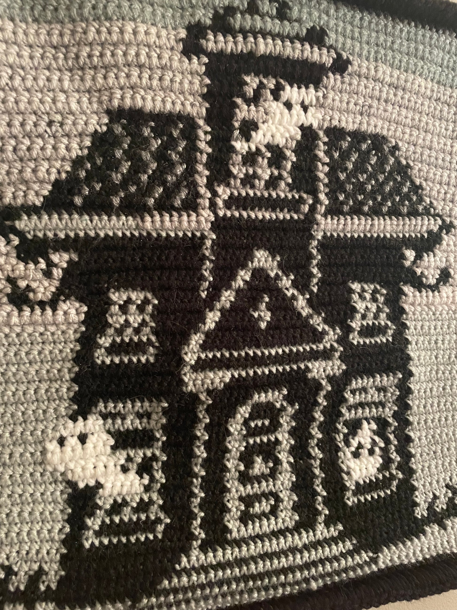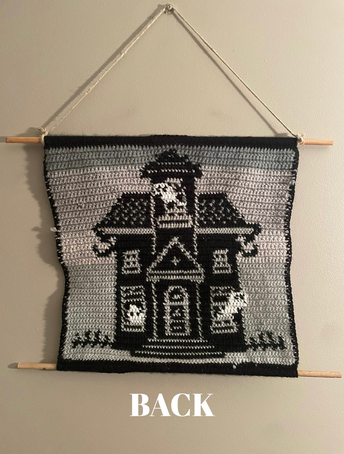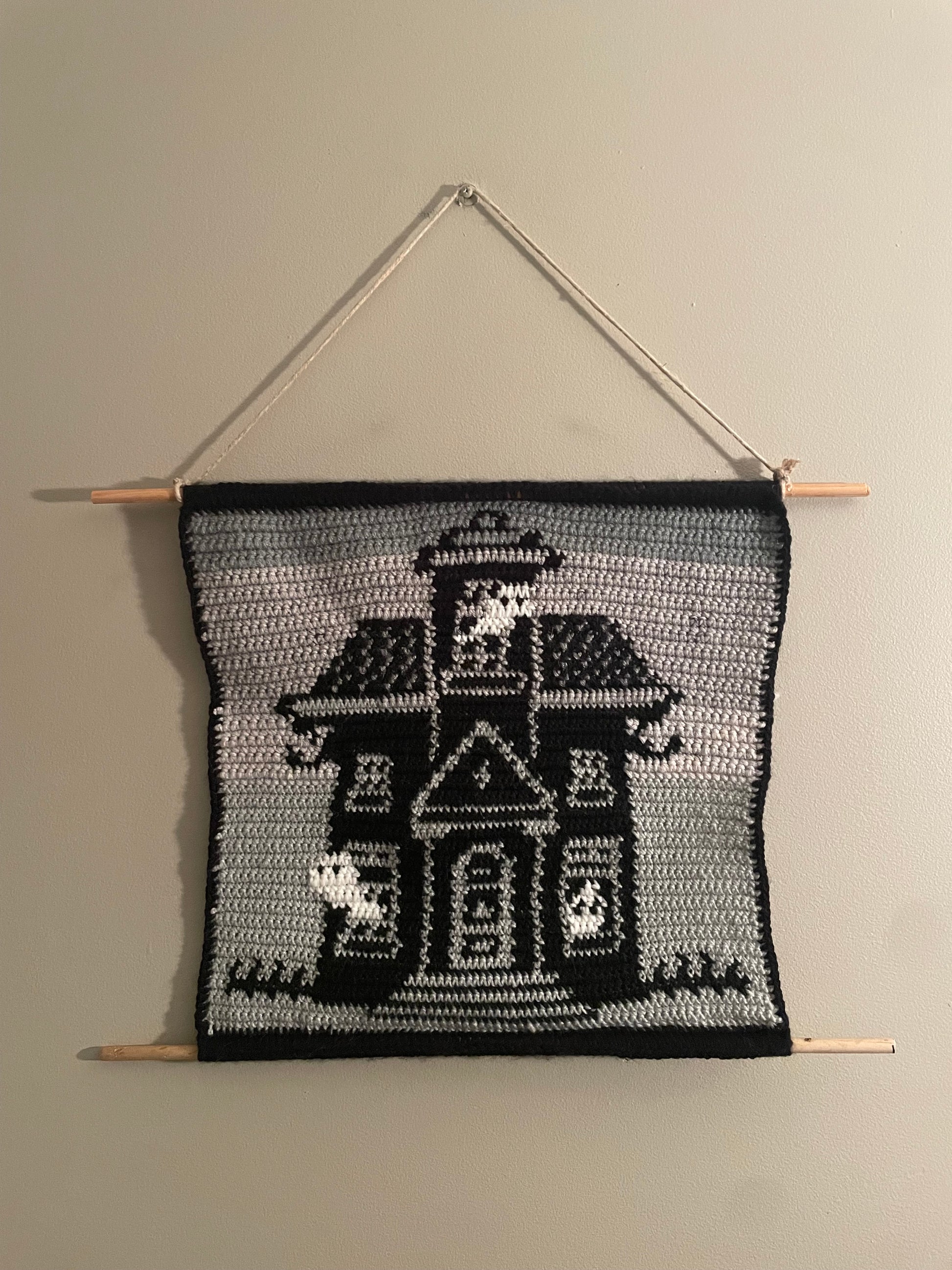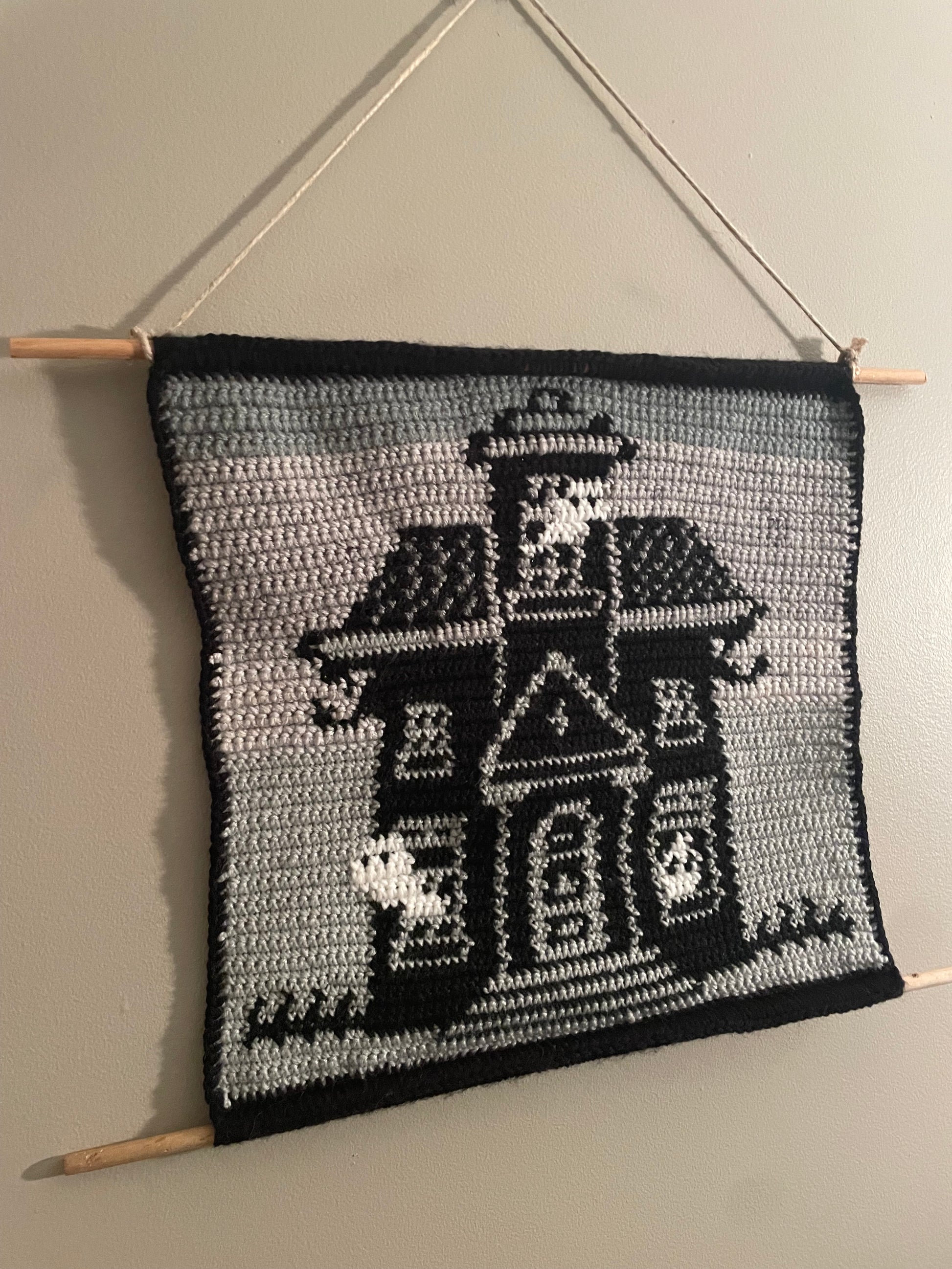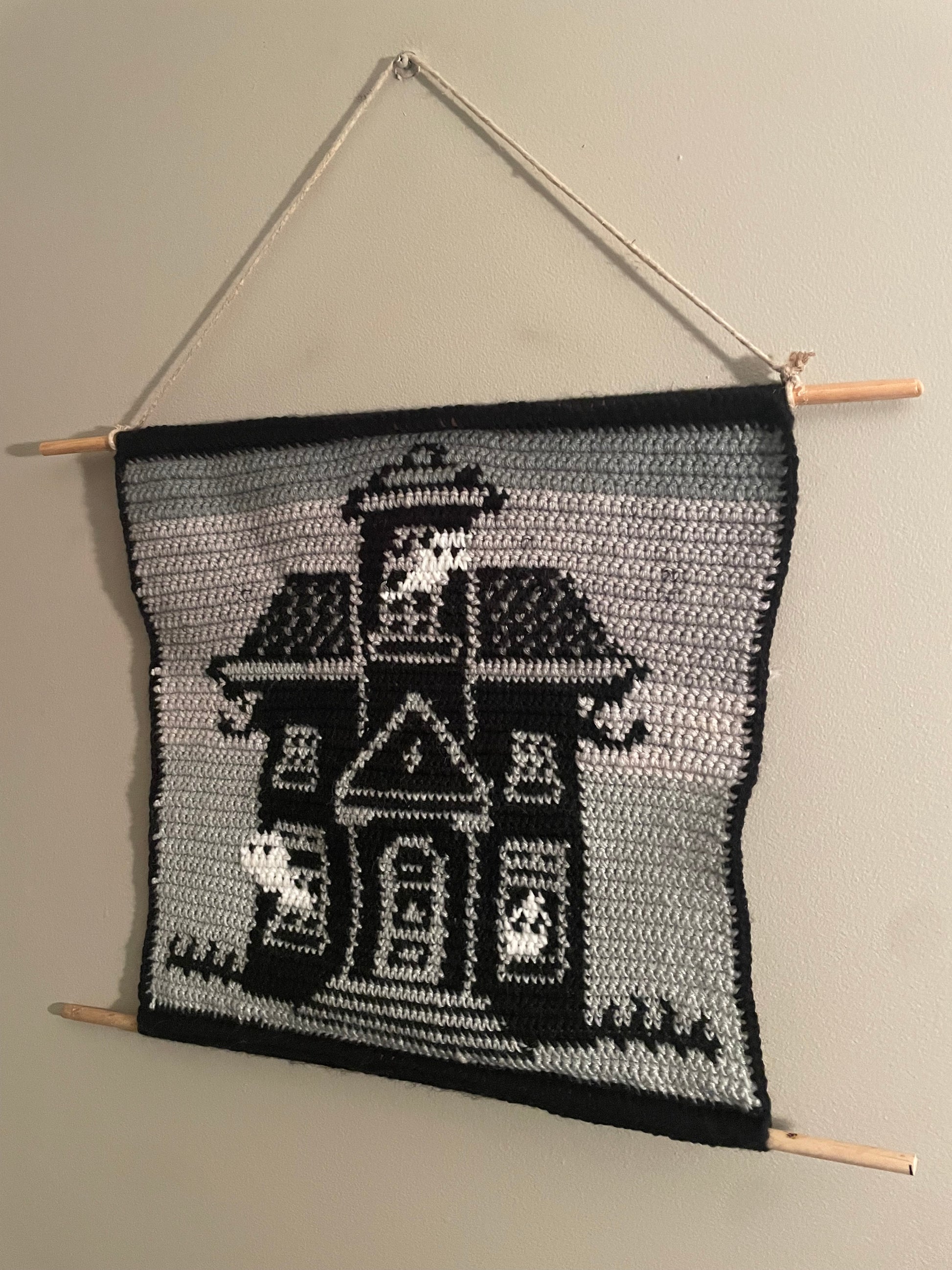 Crochet haunted house tapestry is mounted on dowel rods and hung with hemp rope. 100% acrylic. Tapestry measures 15” wide and 15” long. Dowel rods measure 21”.