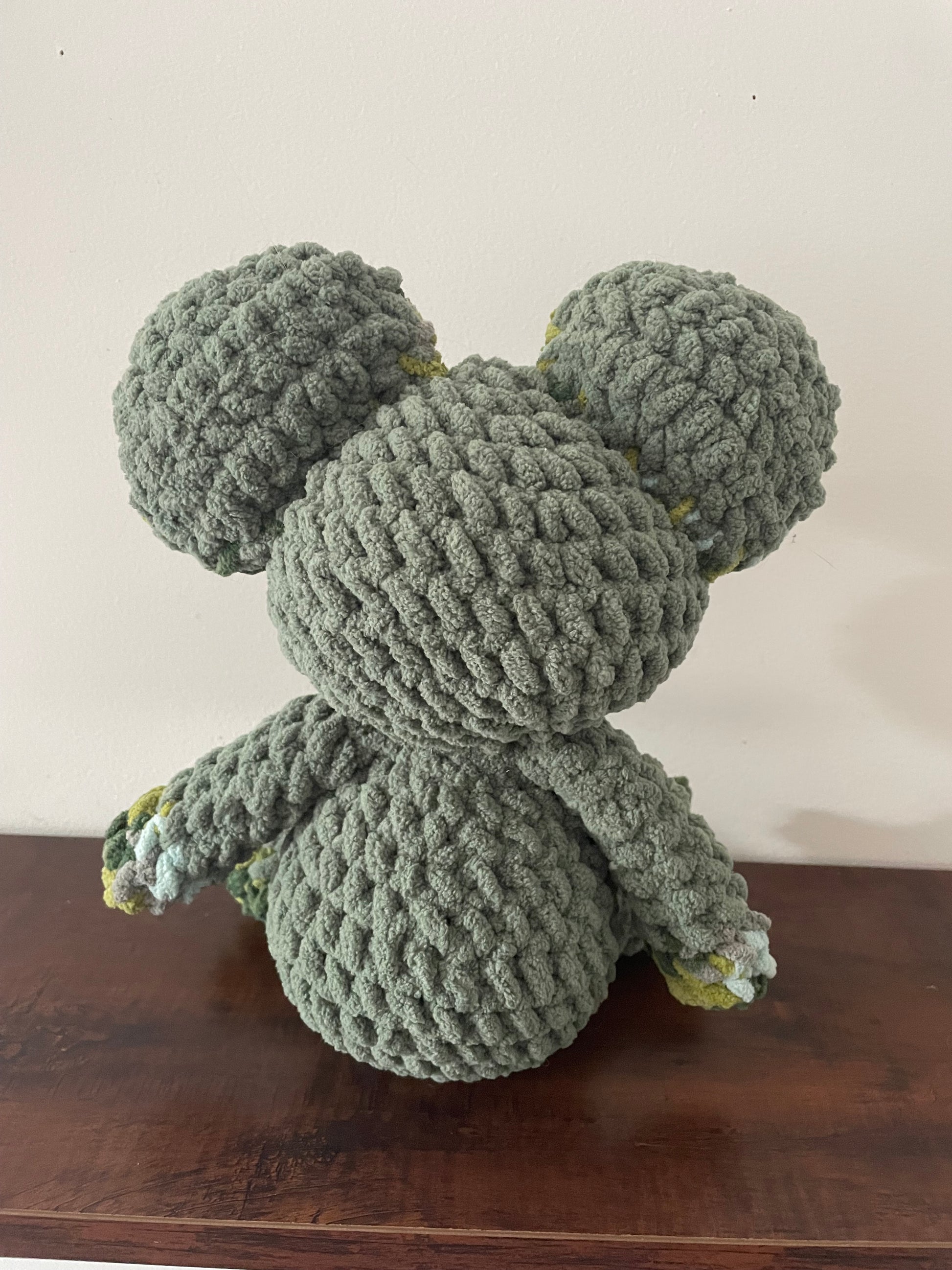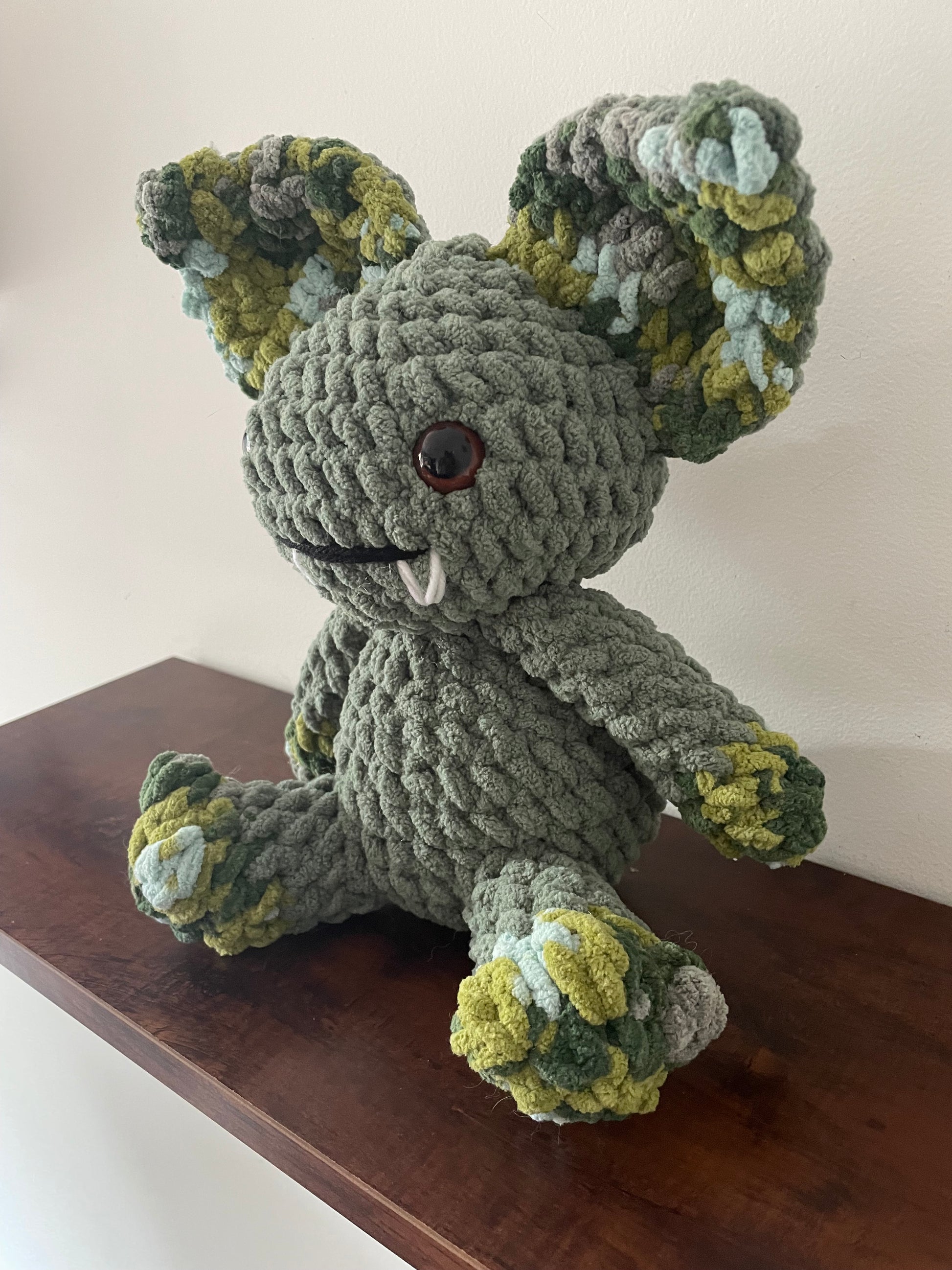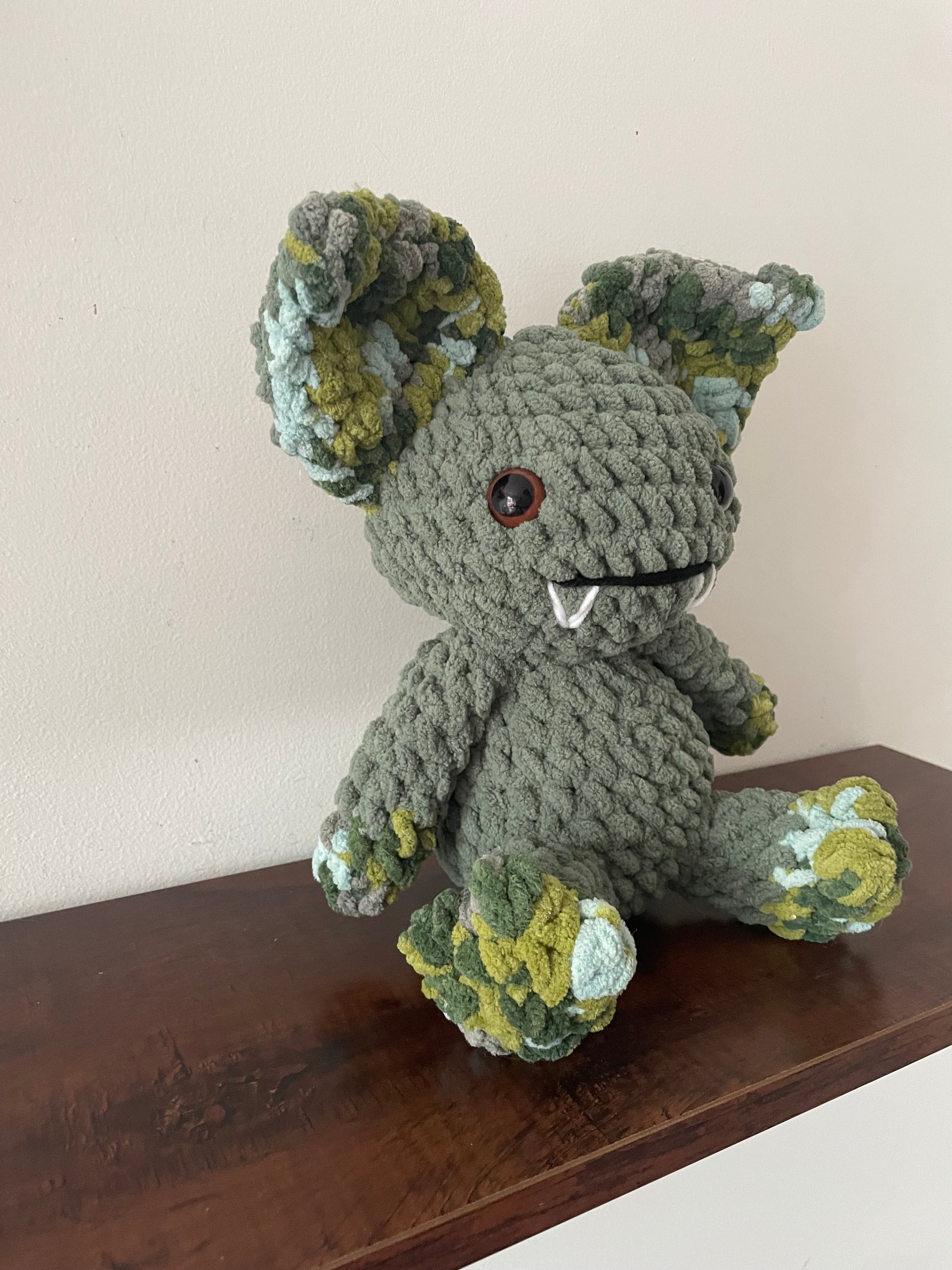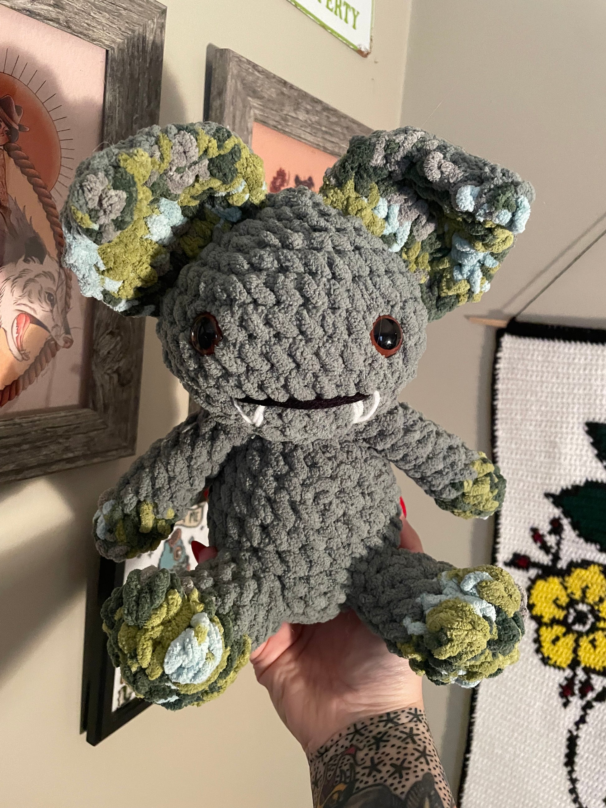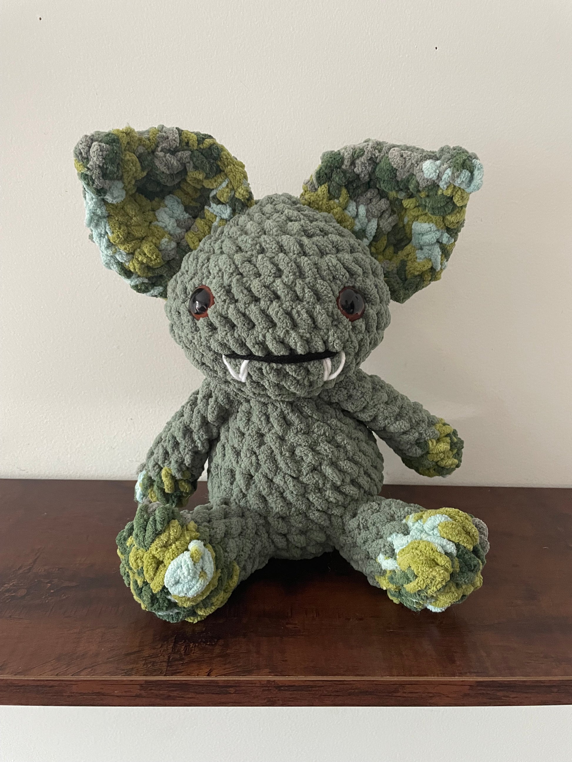 Goblin is made from soft blanket yarn and embroidered with acrylic. It measures 10” tall, 8.5” from ear to ear, and 4.5” depth of head.