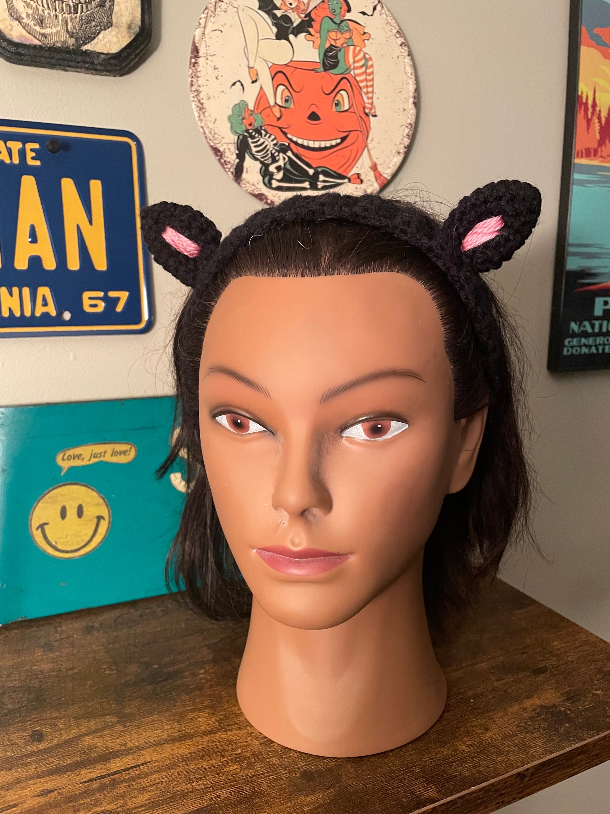 Handmade black headband with cat ears, embroidered in pink. Fits standard adult sizes. Made from 100% acrylic yarn.