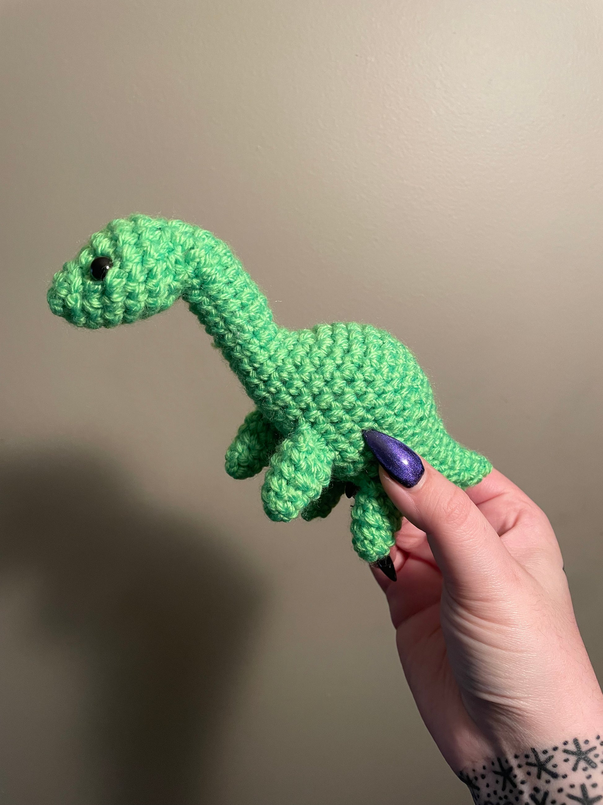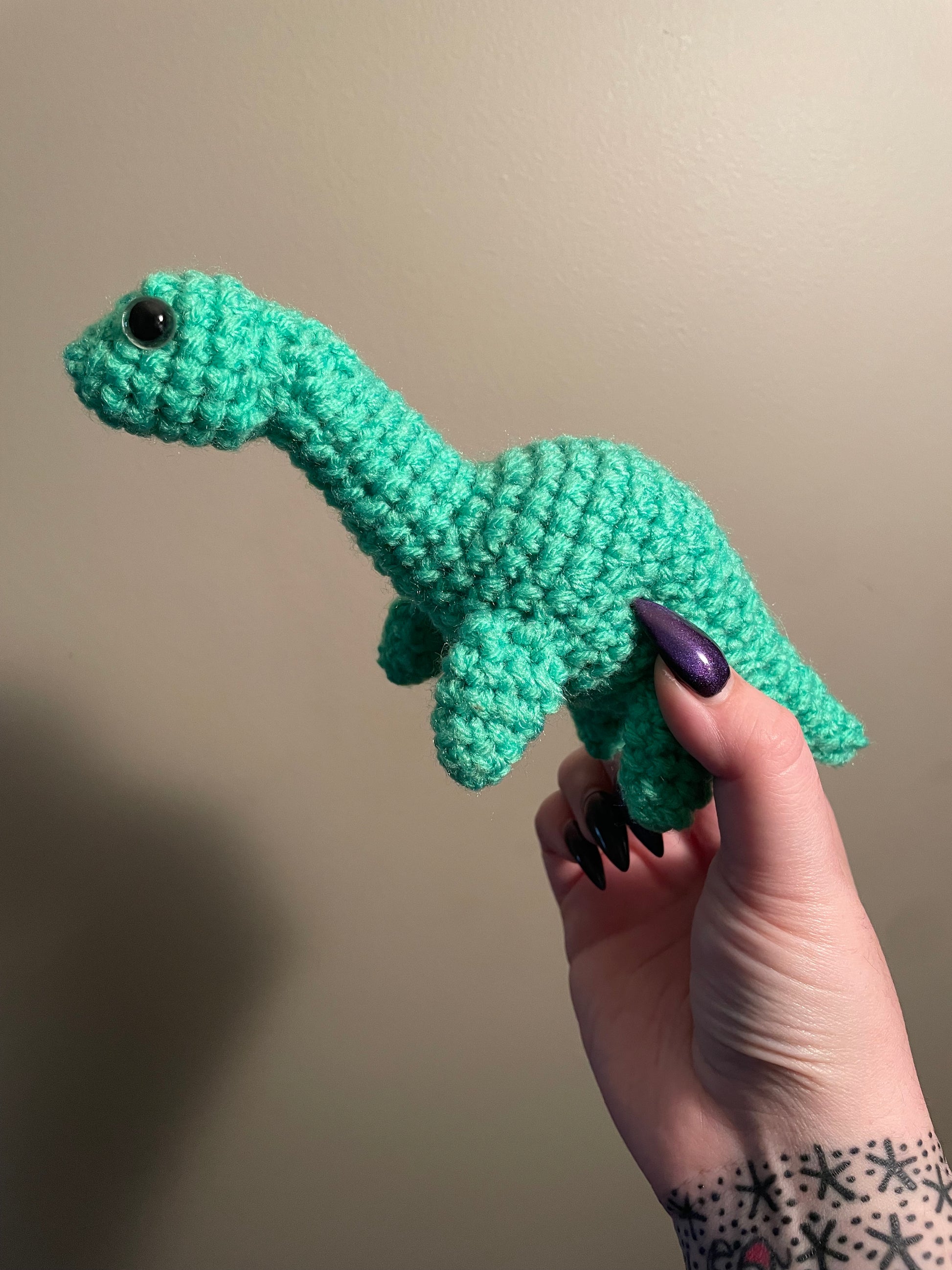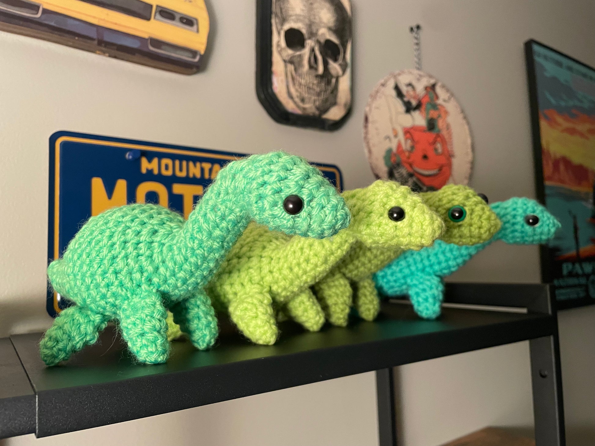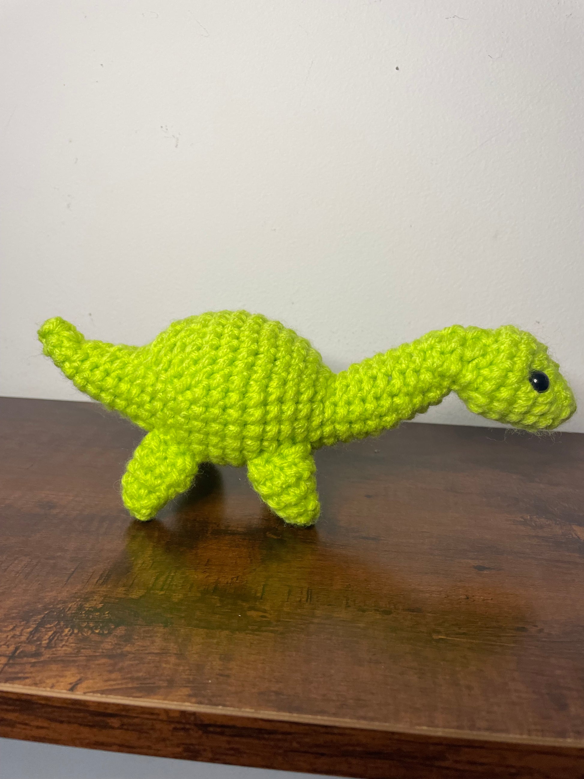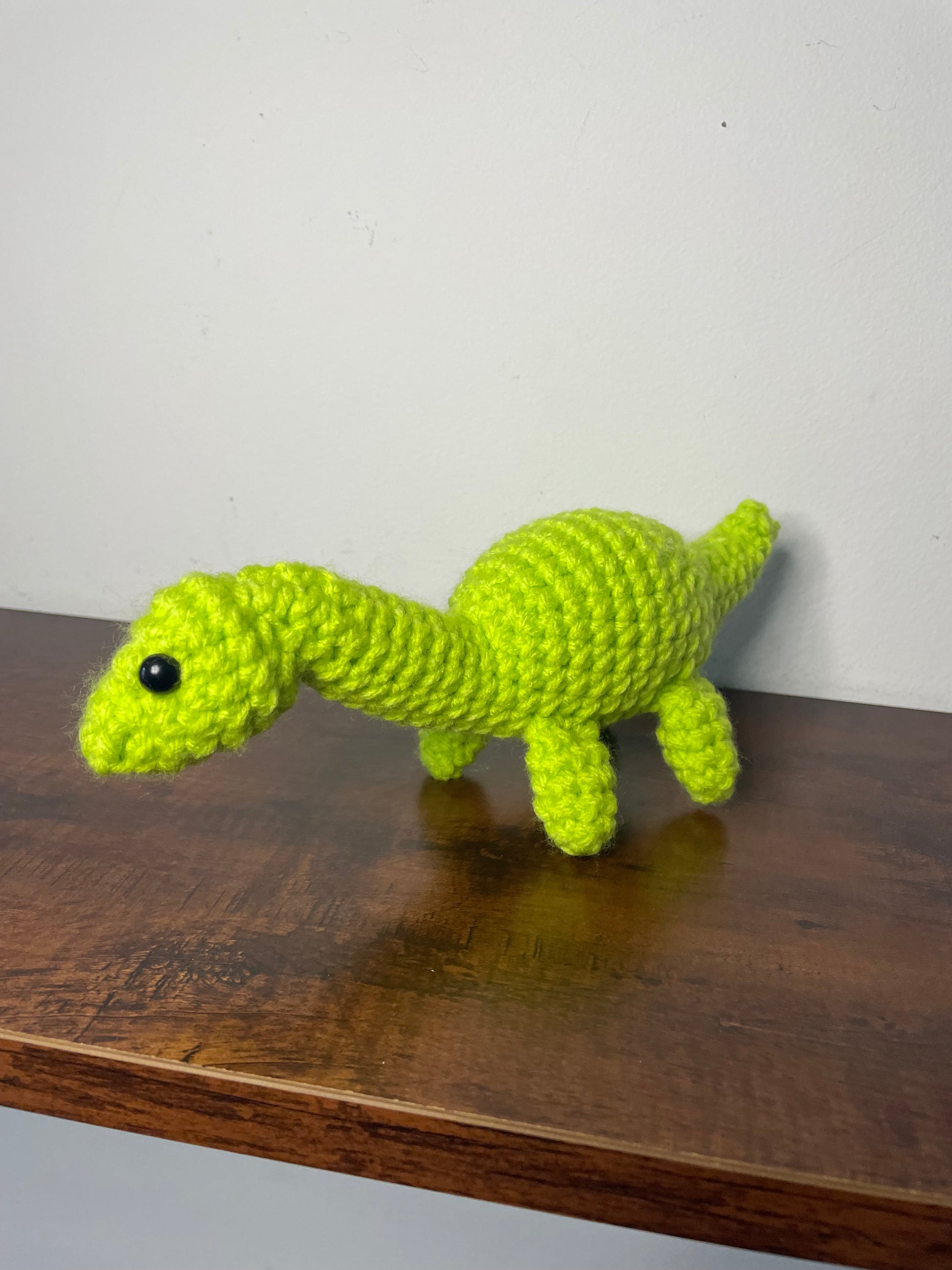 Handmade crochet Nessie is made of 100% acrylic yarn. It measures approx. 3.5" tall and 8" long.