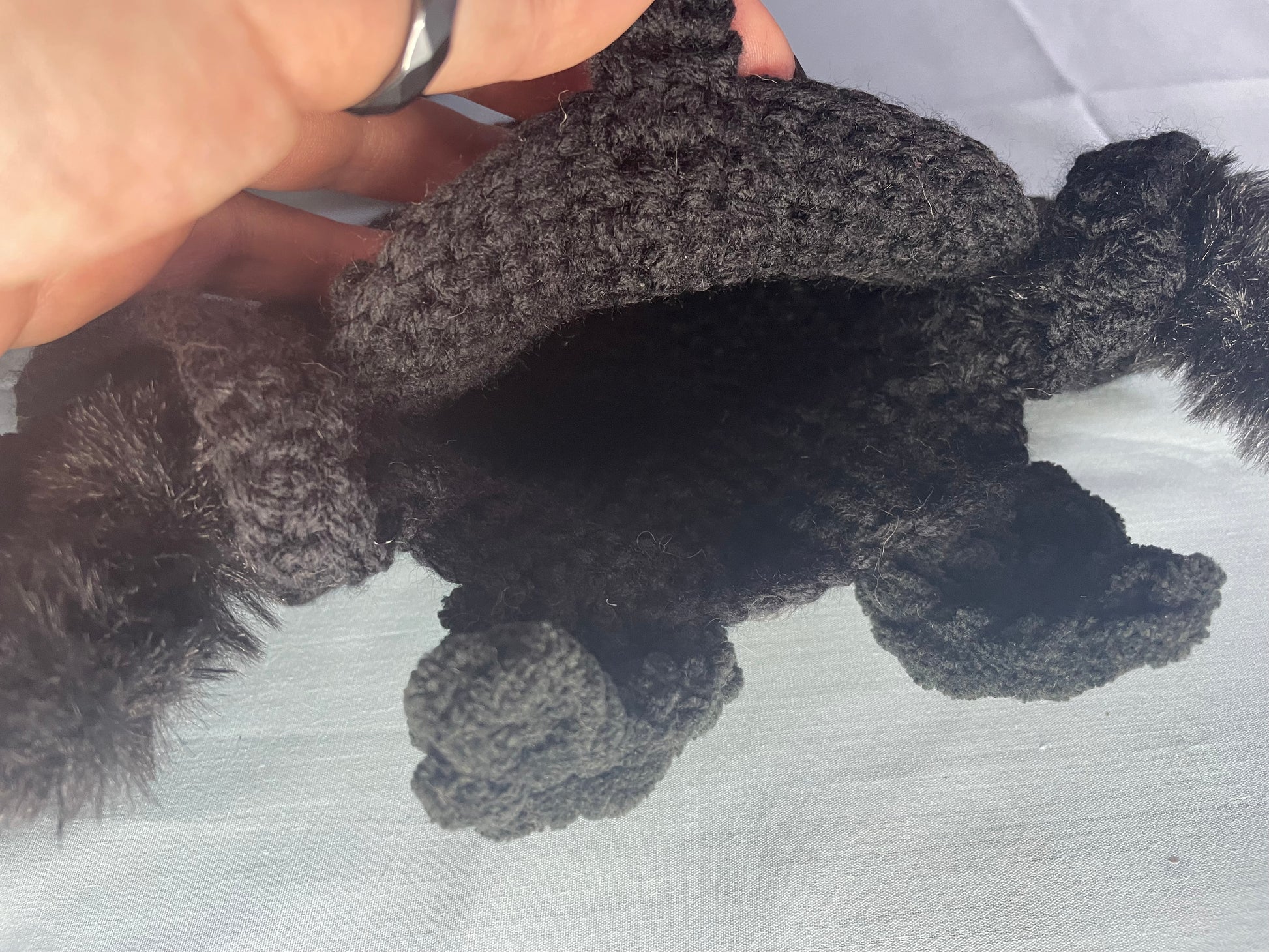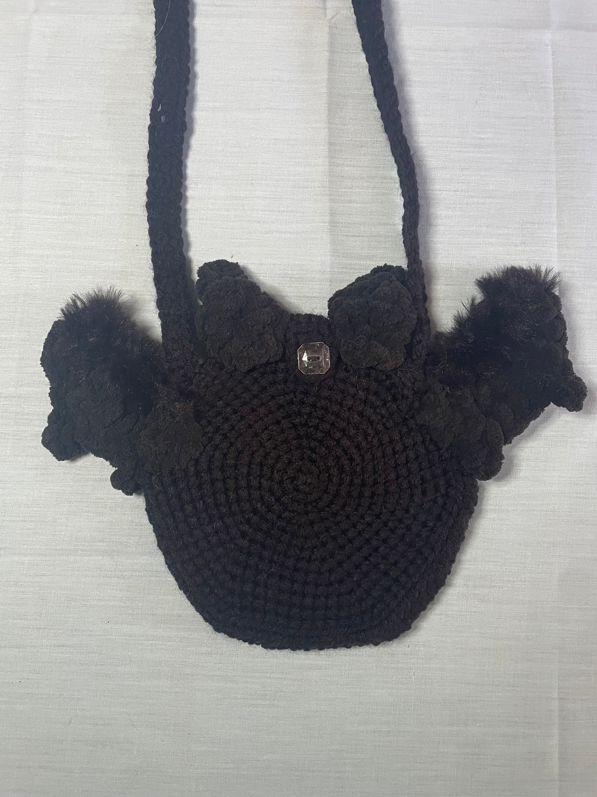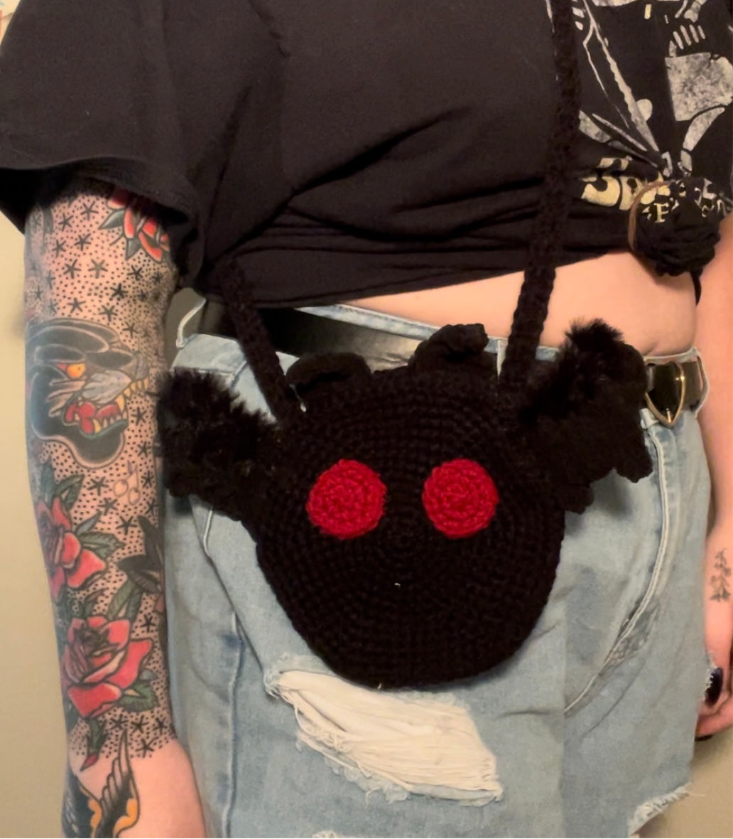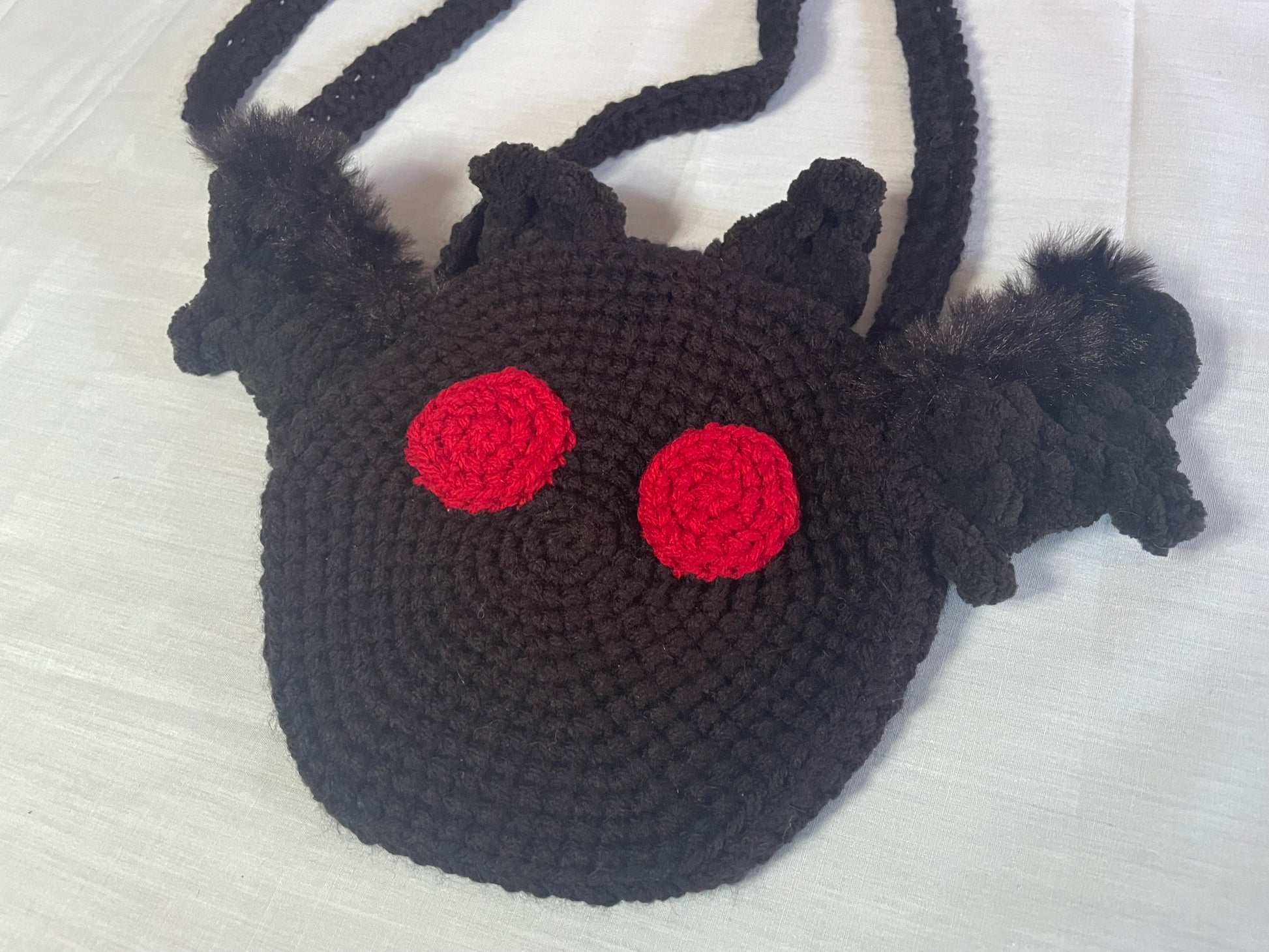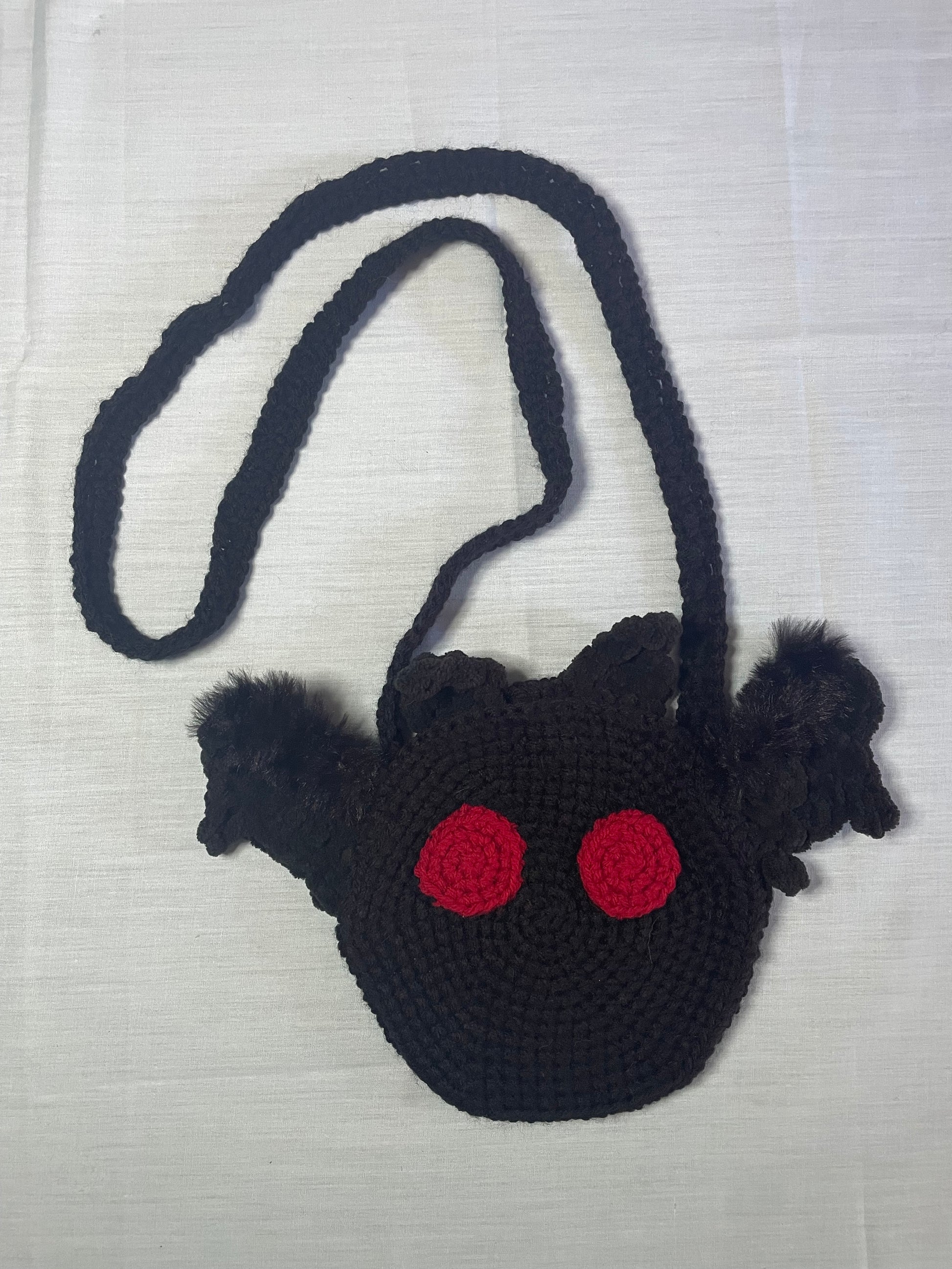 Mothman bag is made of 100% acrylic for main body, eyes, and strap. Ears and wings are made with soft blanket and faux fur yarn. It has a button closure at the top. Measures 6.5” across, 10.5” across including wings; 6” height, 8” with ears, and has a 5” opening. Strap measures 20.5” from top of bag.