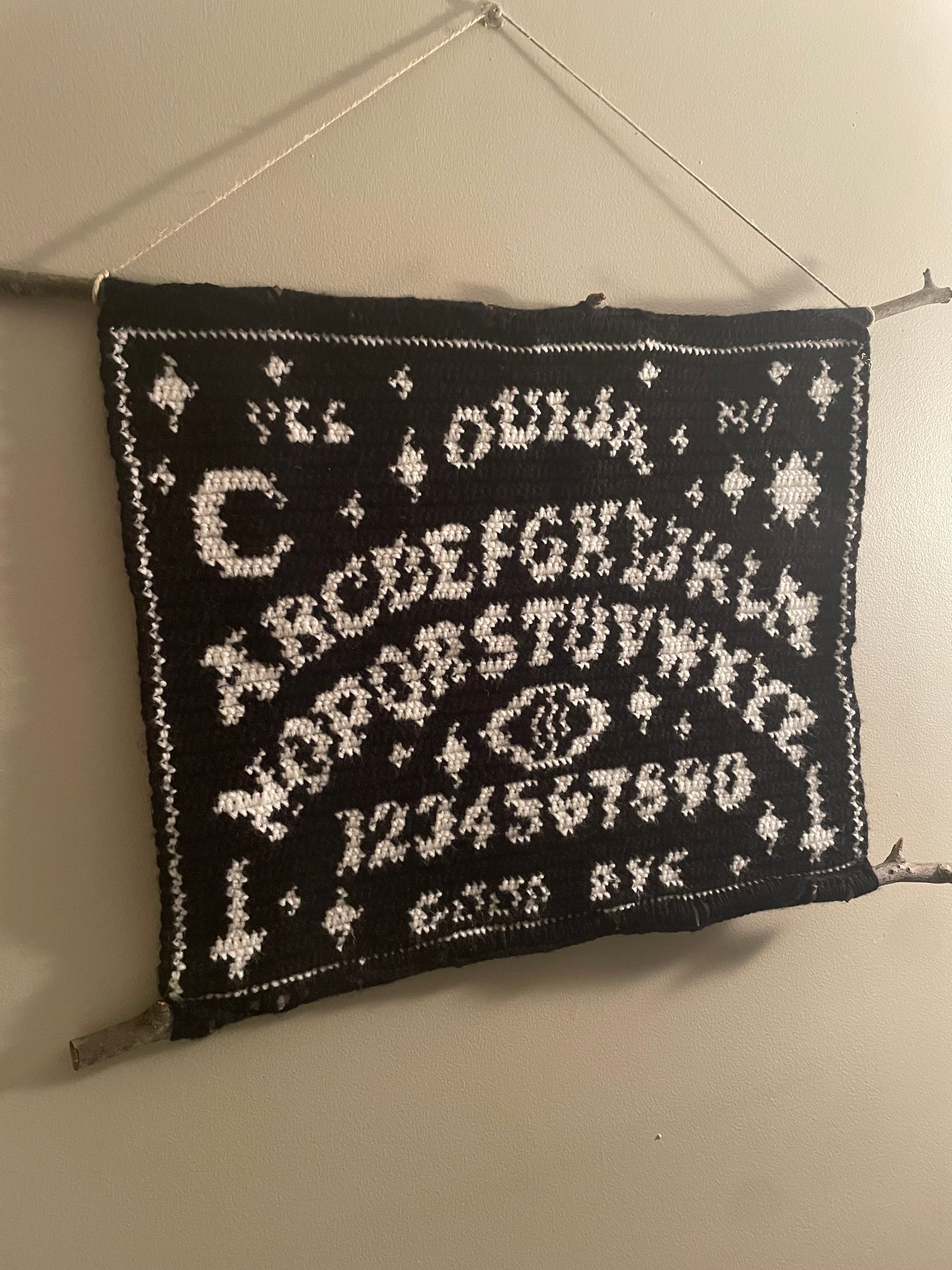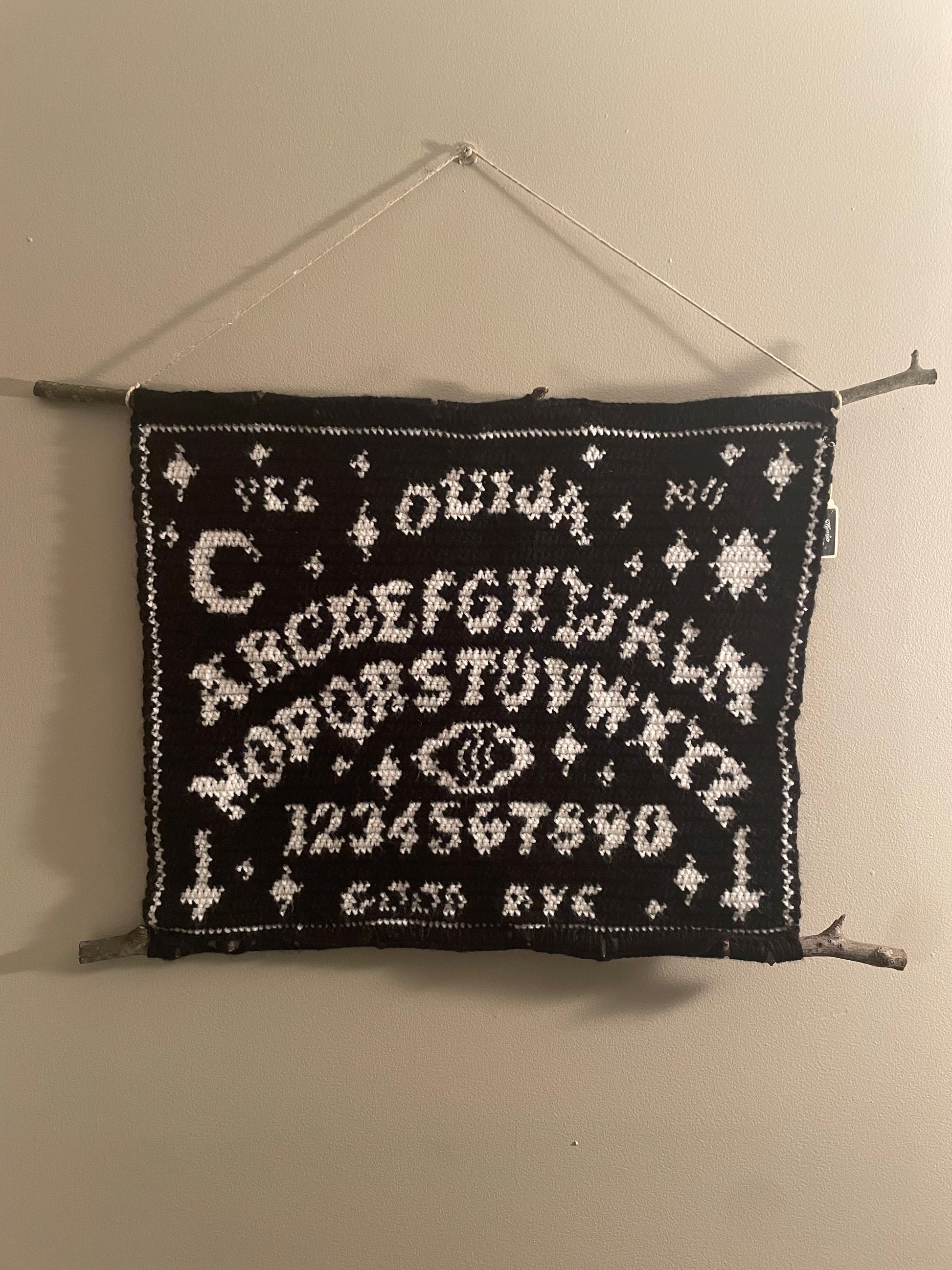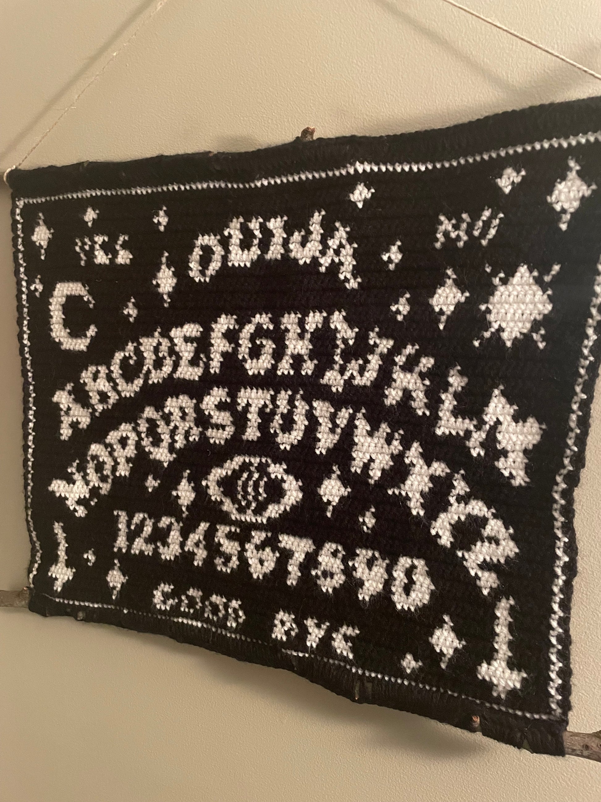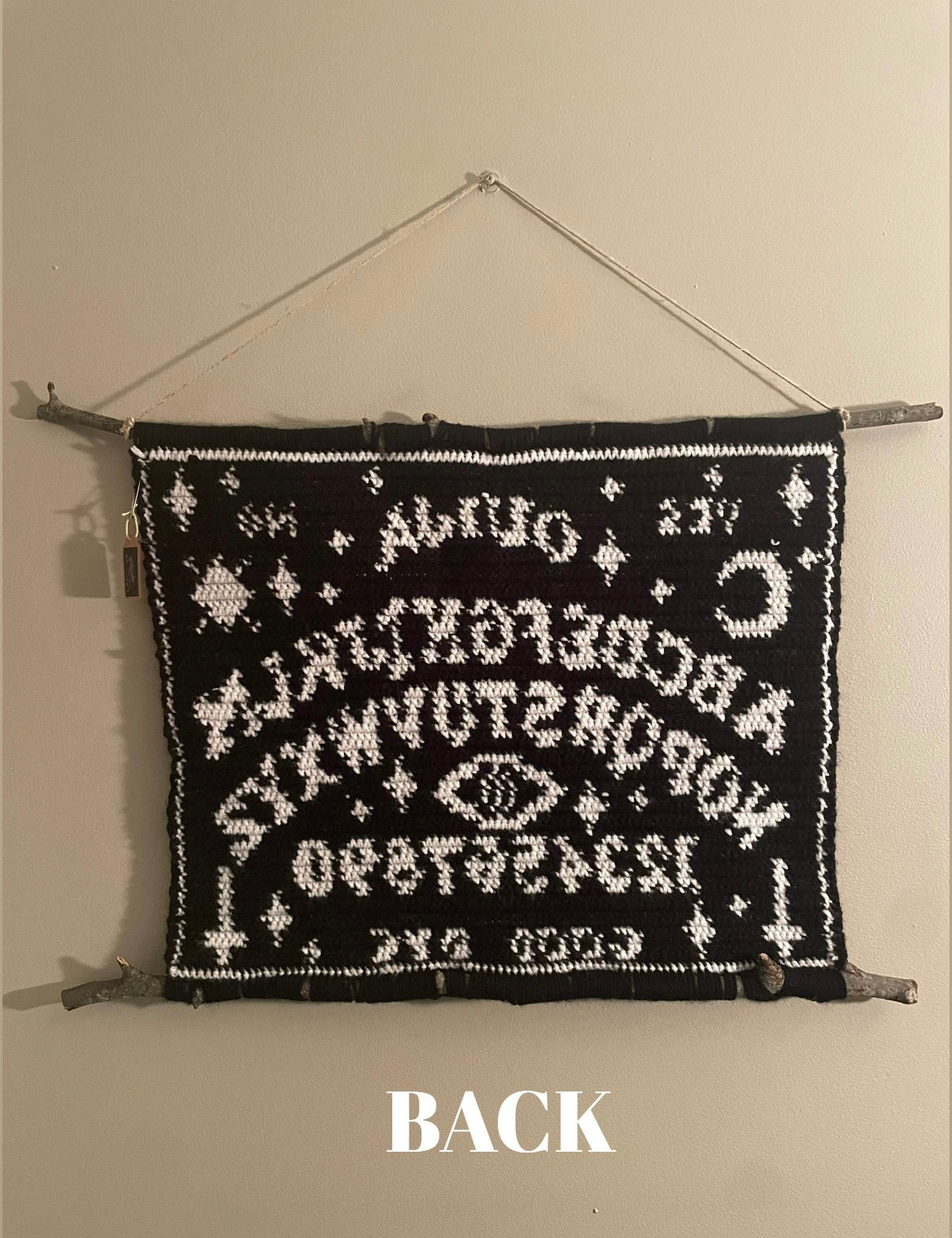 Crochet Ouija board tapestry is mounted on rustic dried branches and hung with hemp rope. 100% acrylic. Tapestry measures 20” wide and 16” long.Top branch measures 26.5”, bottom 25”.