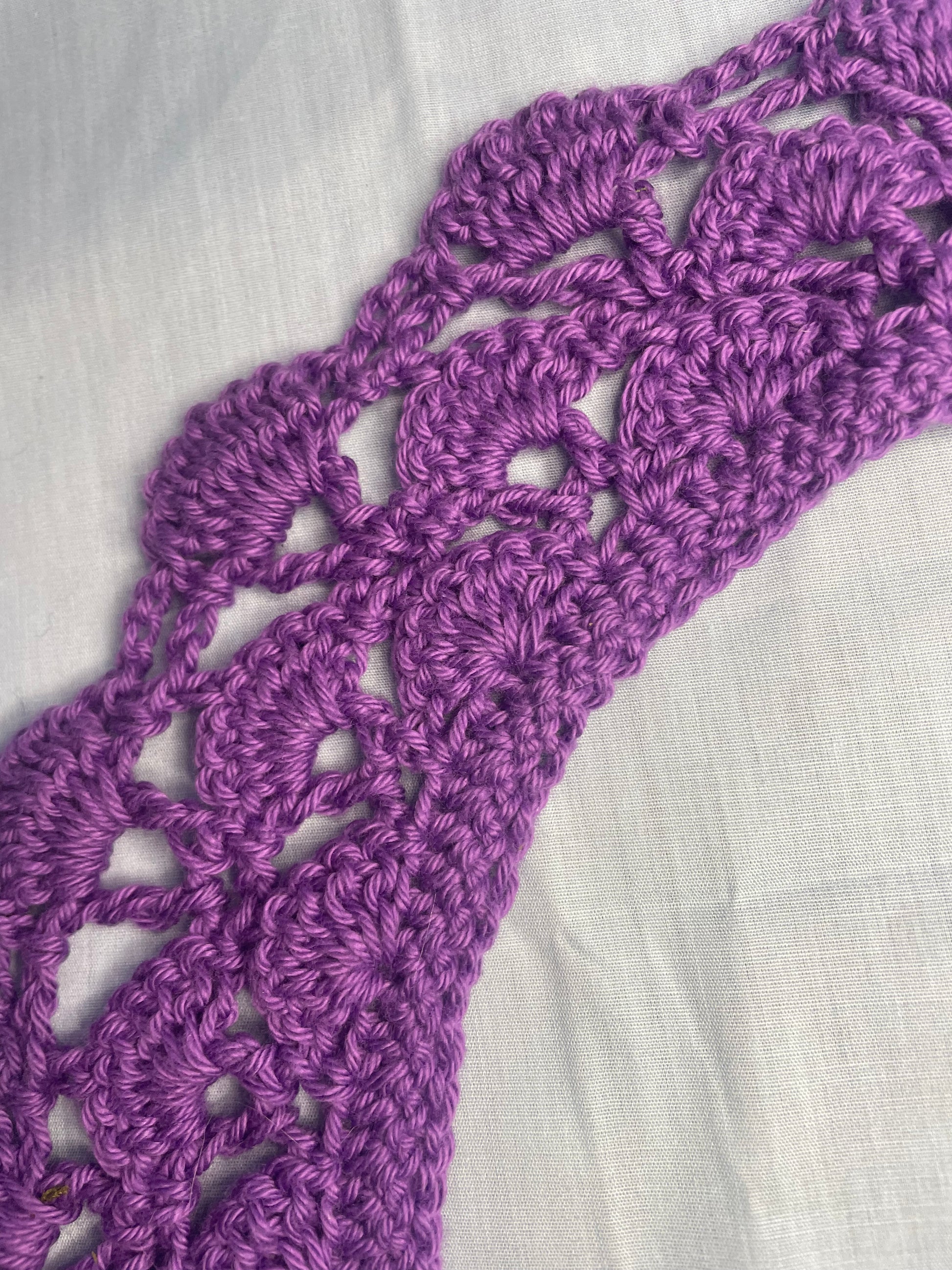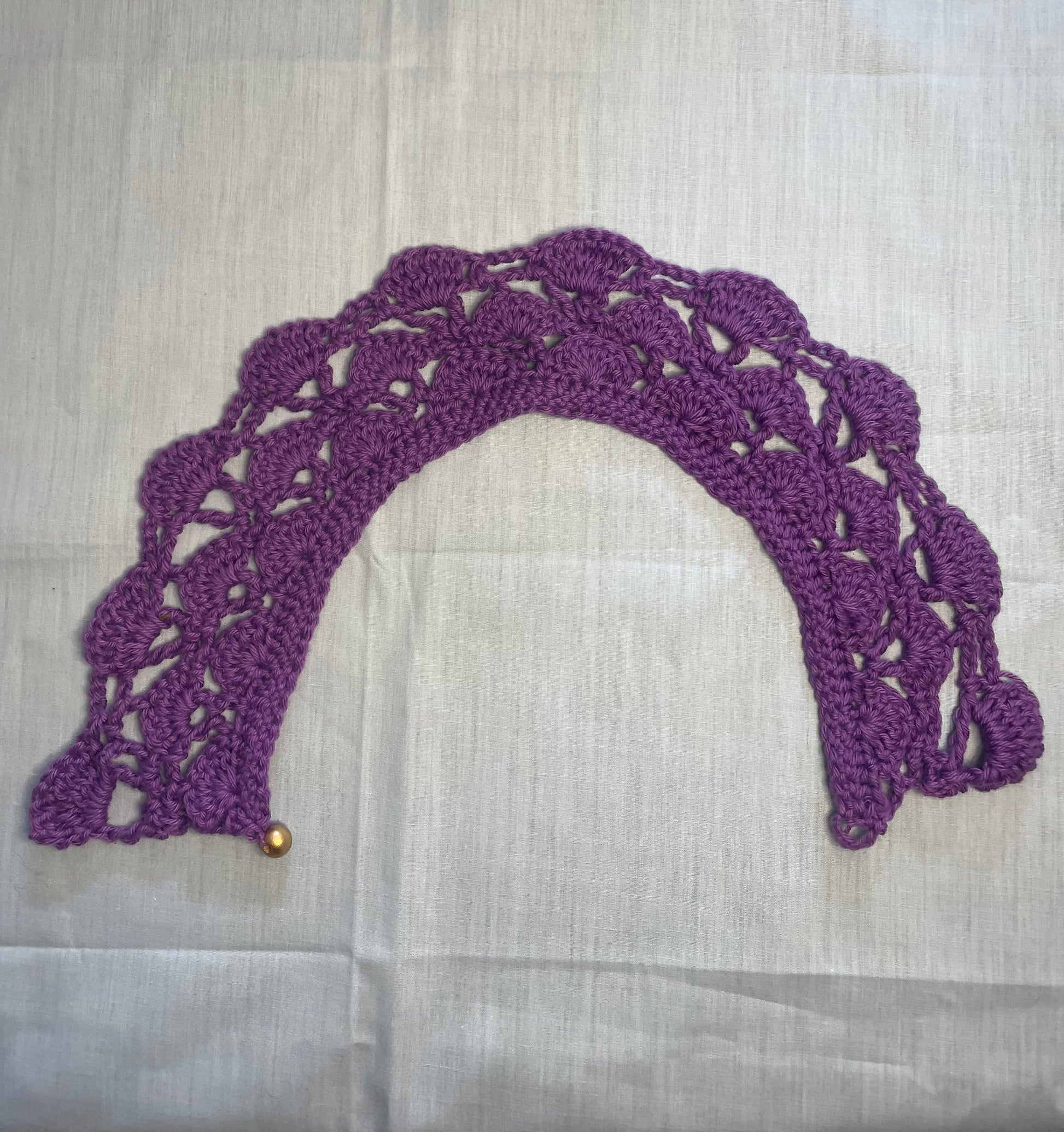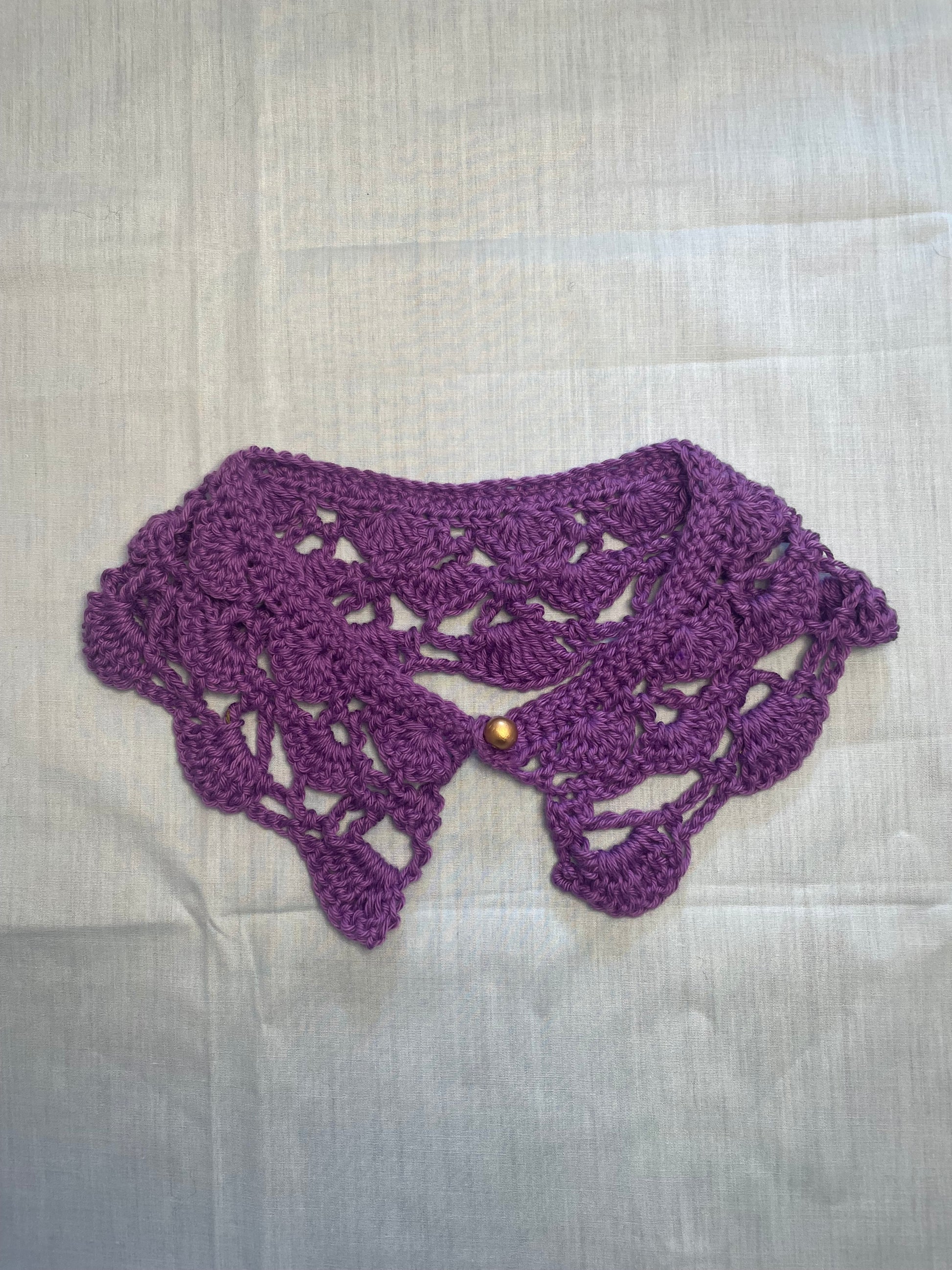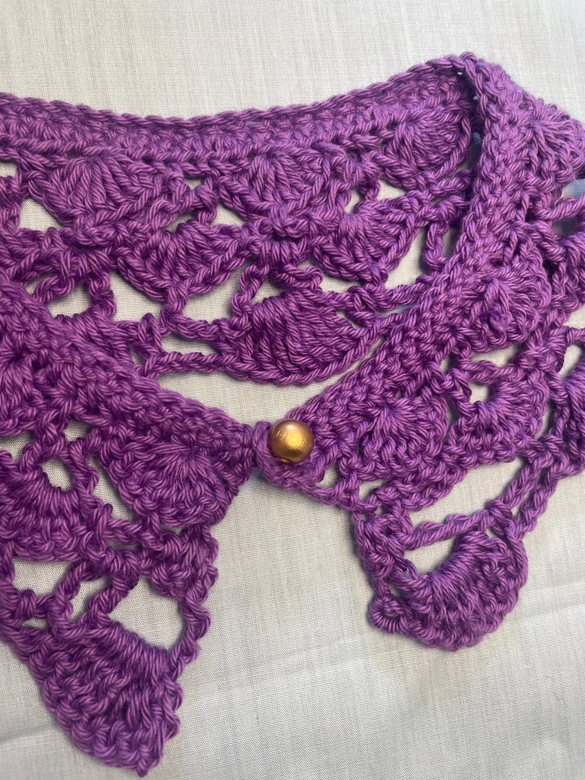 Crochet purple lace collar buttons in the front with a gold bead. Neckline measures 15” across when unbuttoned and stitches give a bit of stretch. Collar measures 9” across total when buttoned.