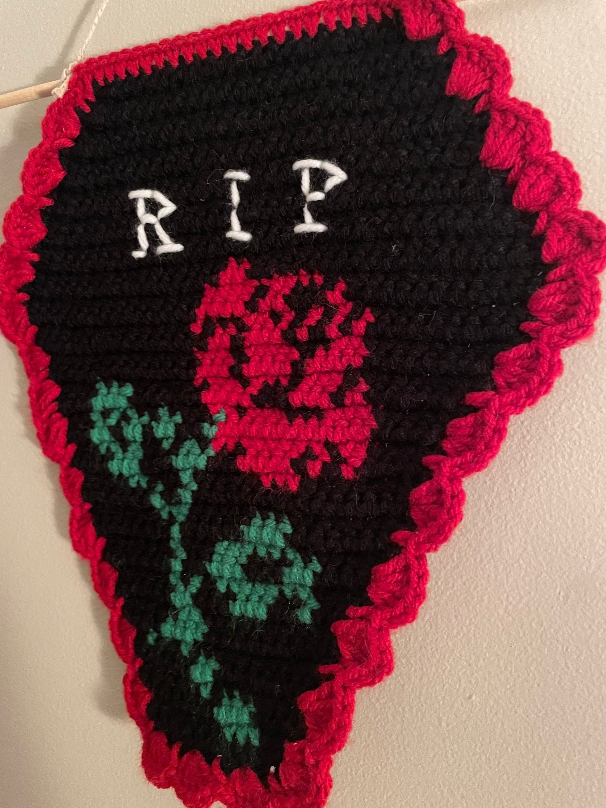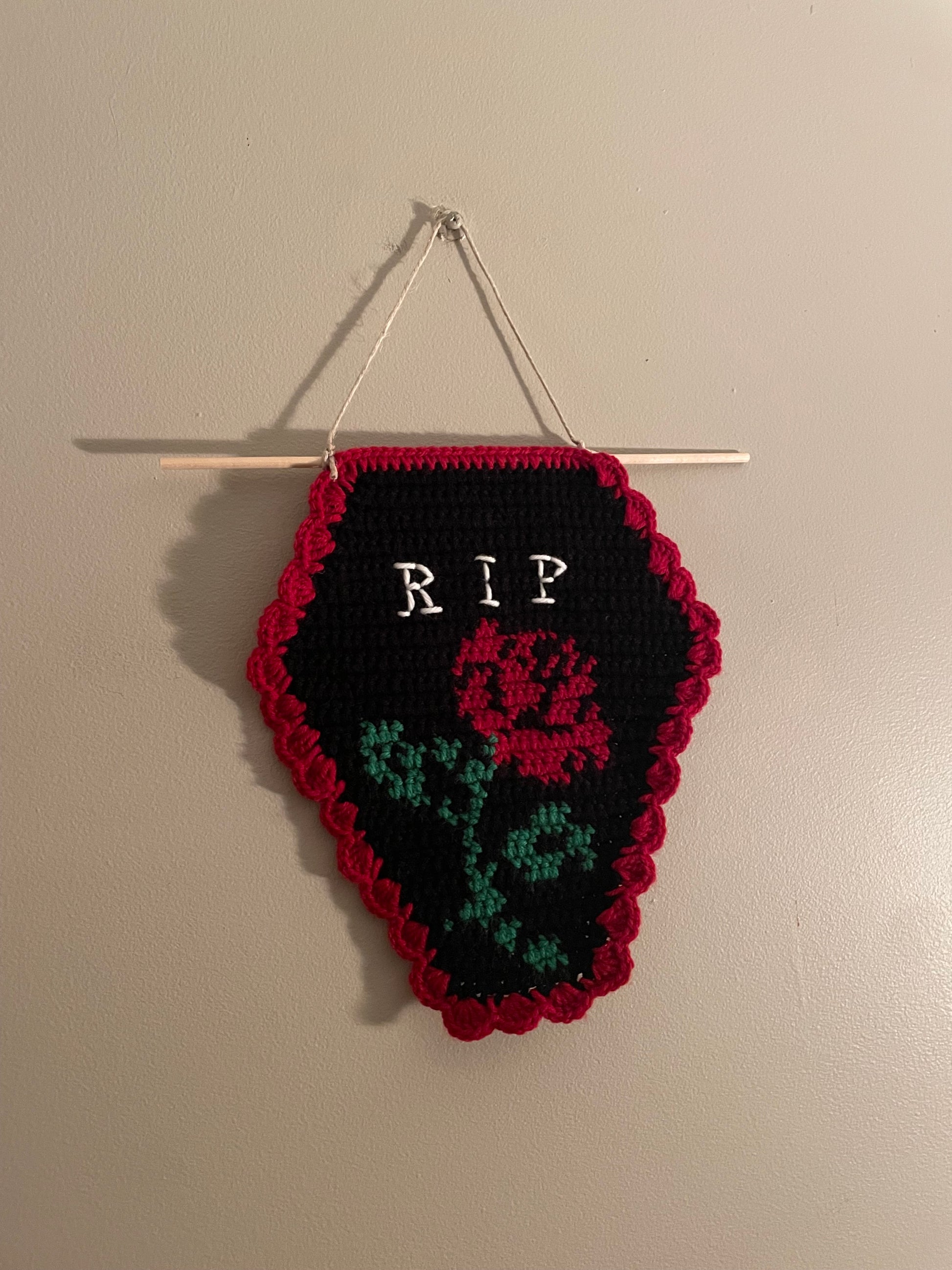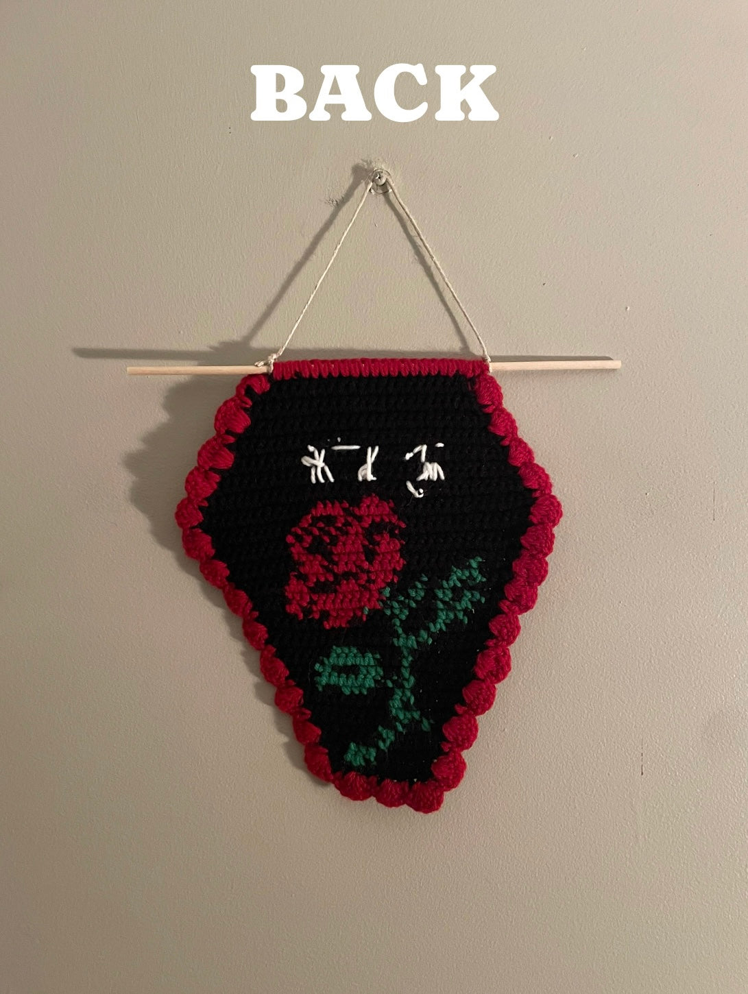Crochet coffin-shaped tapestry with rose and red scalloped edges is mounted on a dowel rod and hung with hemp rope. 100% acrylic. Tapestry measures 10.5” long and 9” at the widest point. Dowel rod measures 12”.