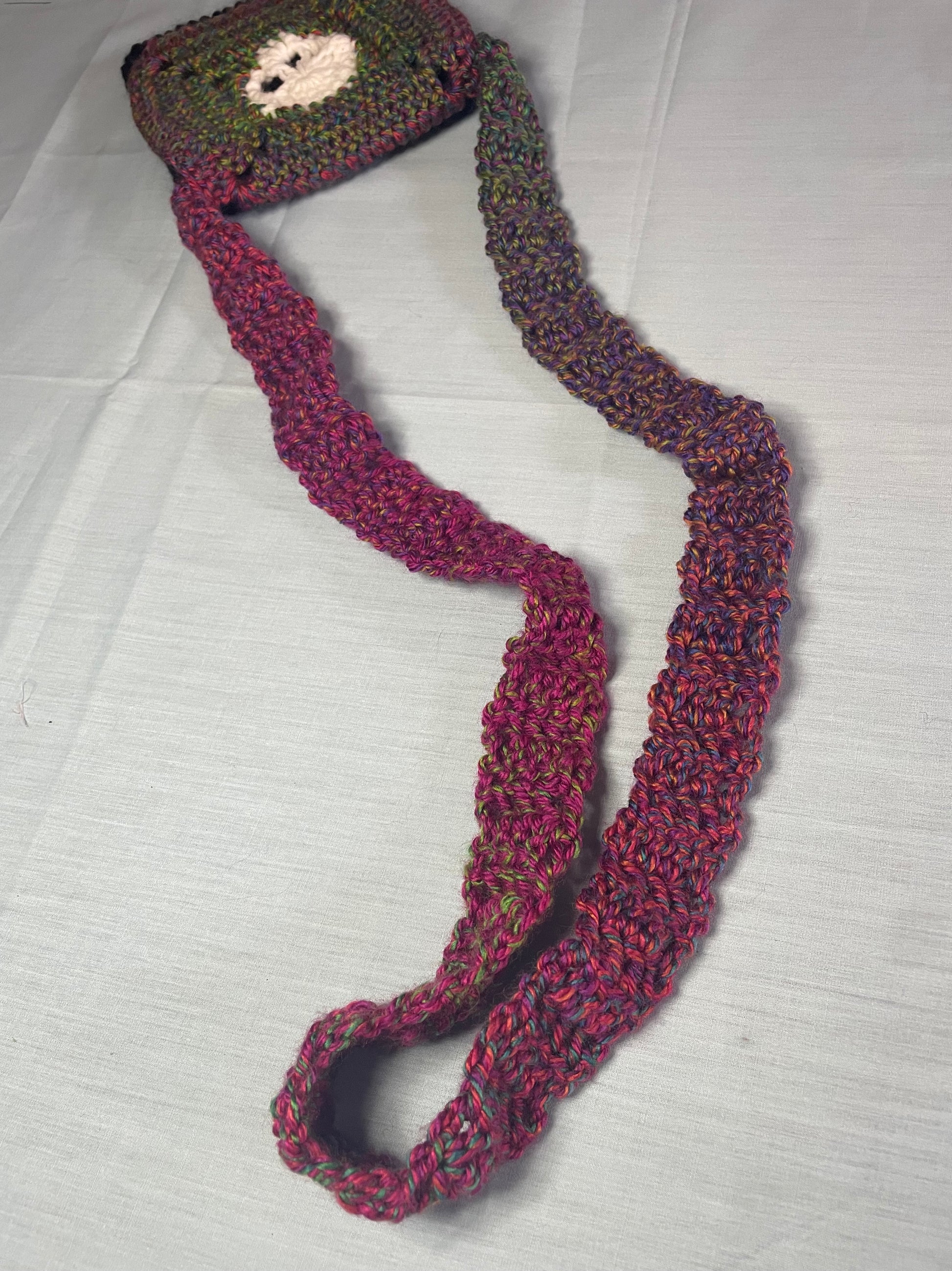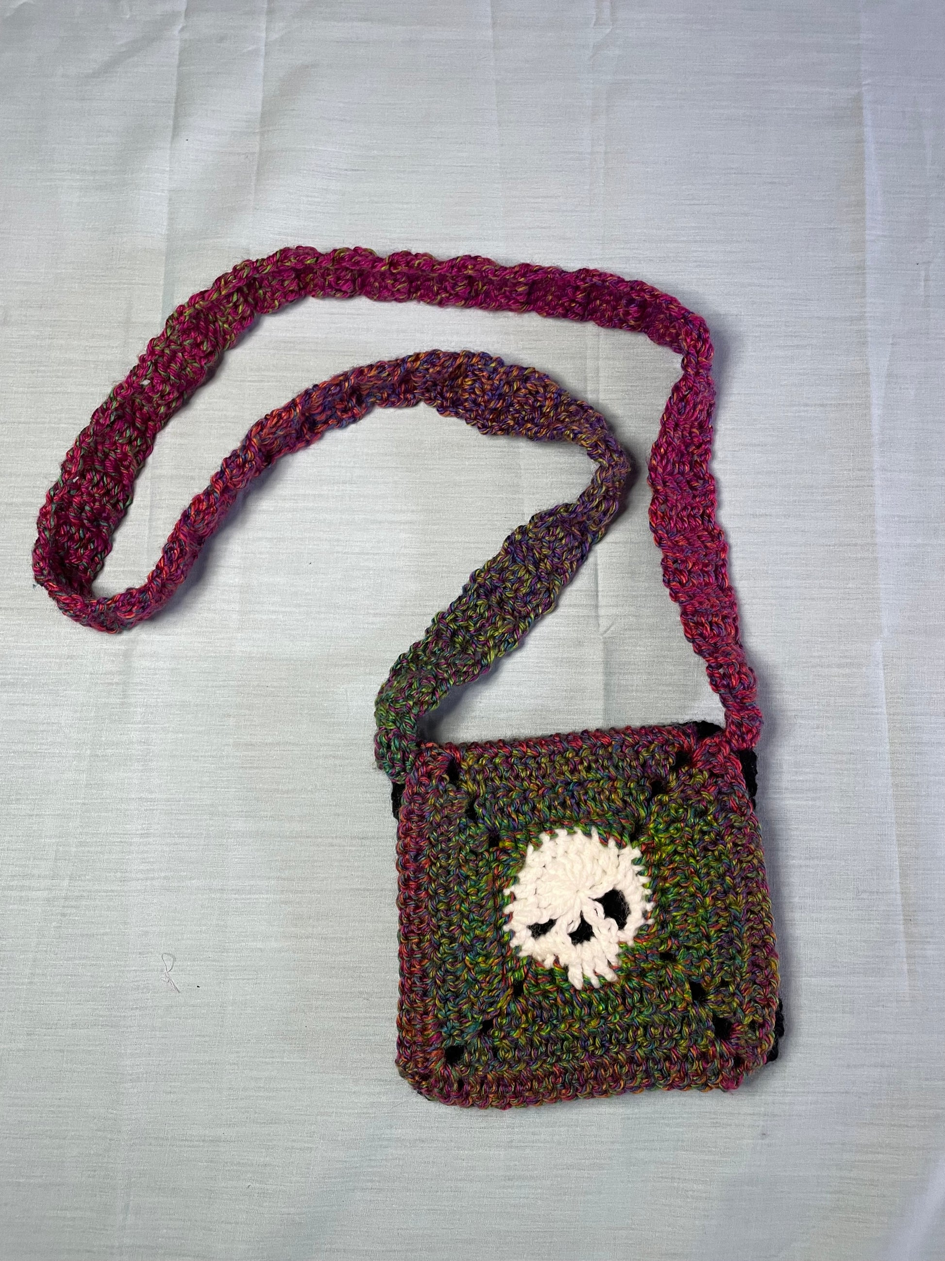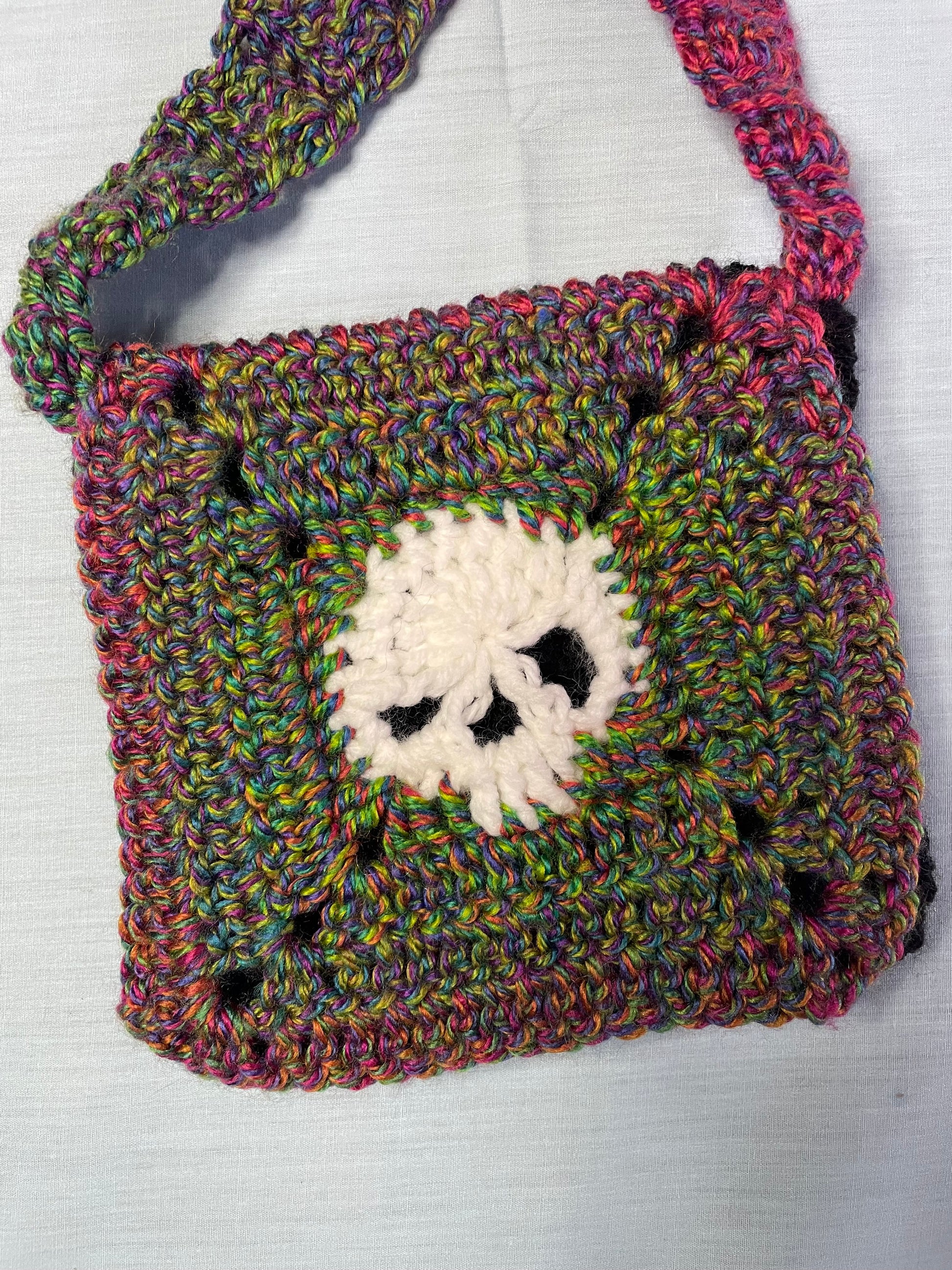 Crochet mini messenger bag uses a skull granny square for the flap. Bag base is black, skull square and strap are a blended multicolor fade. Bag is 100% acrylic. It measures 6” x 6” and has a 5.5” opening. Strap measures 21” from top of bag.