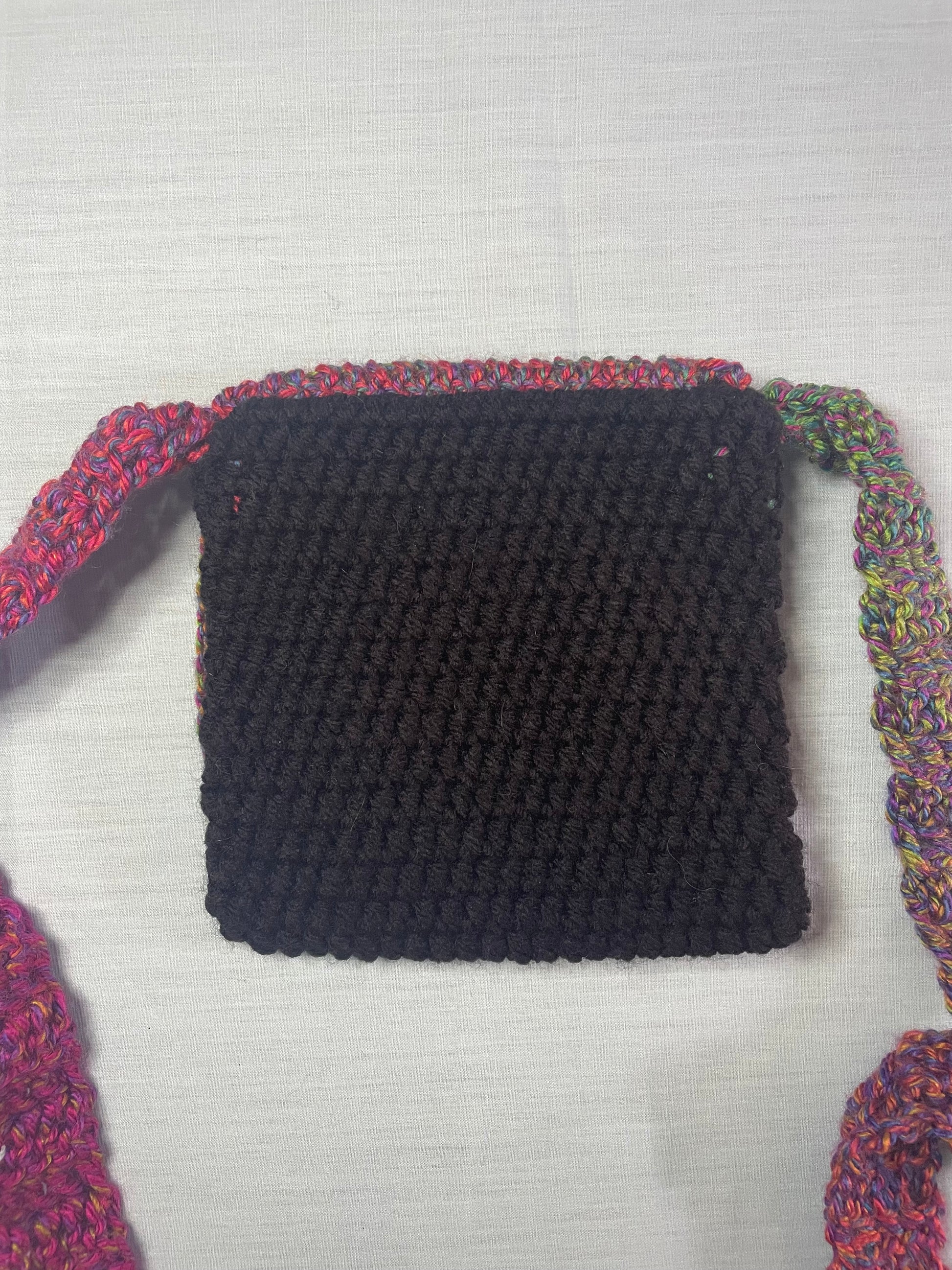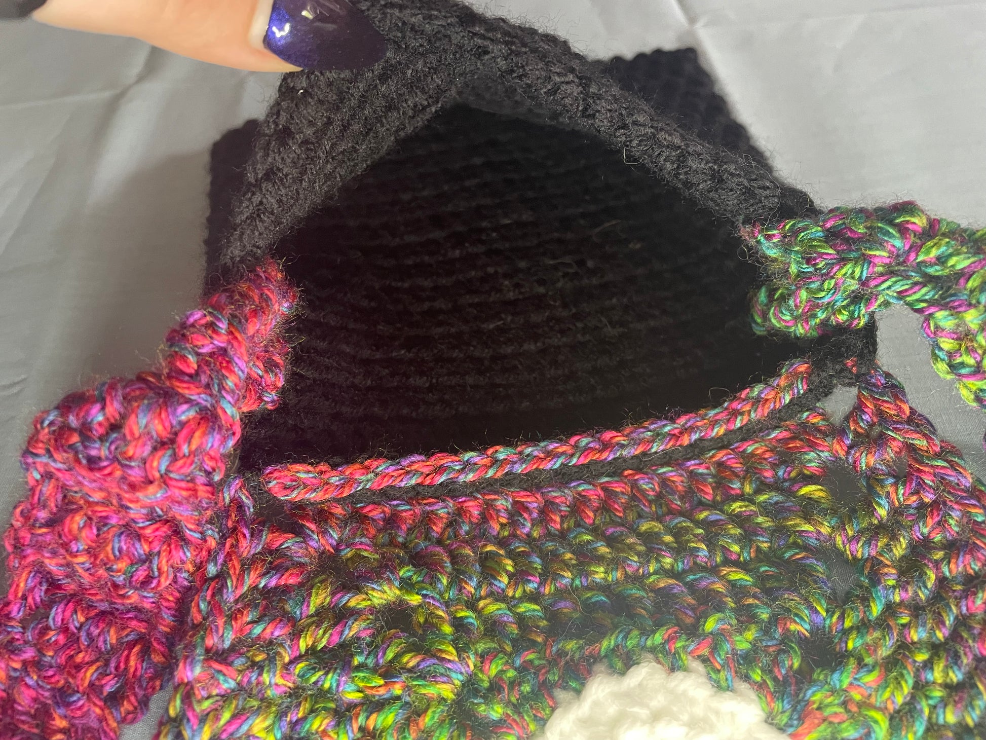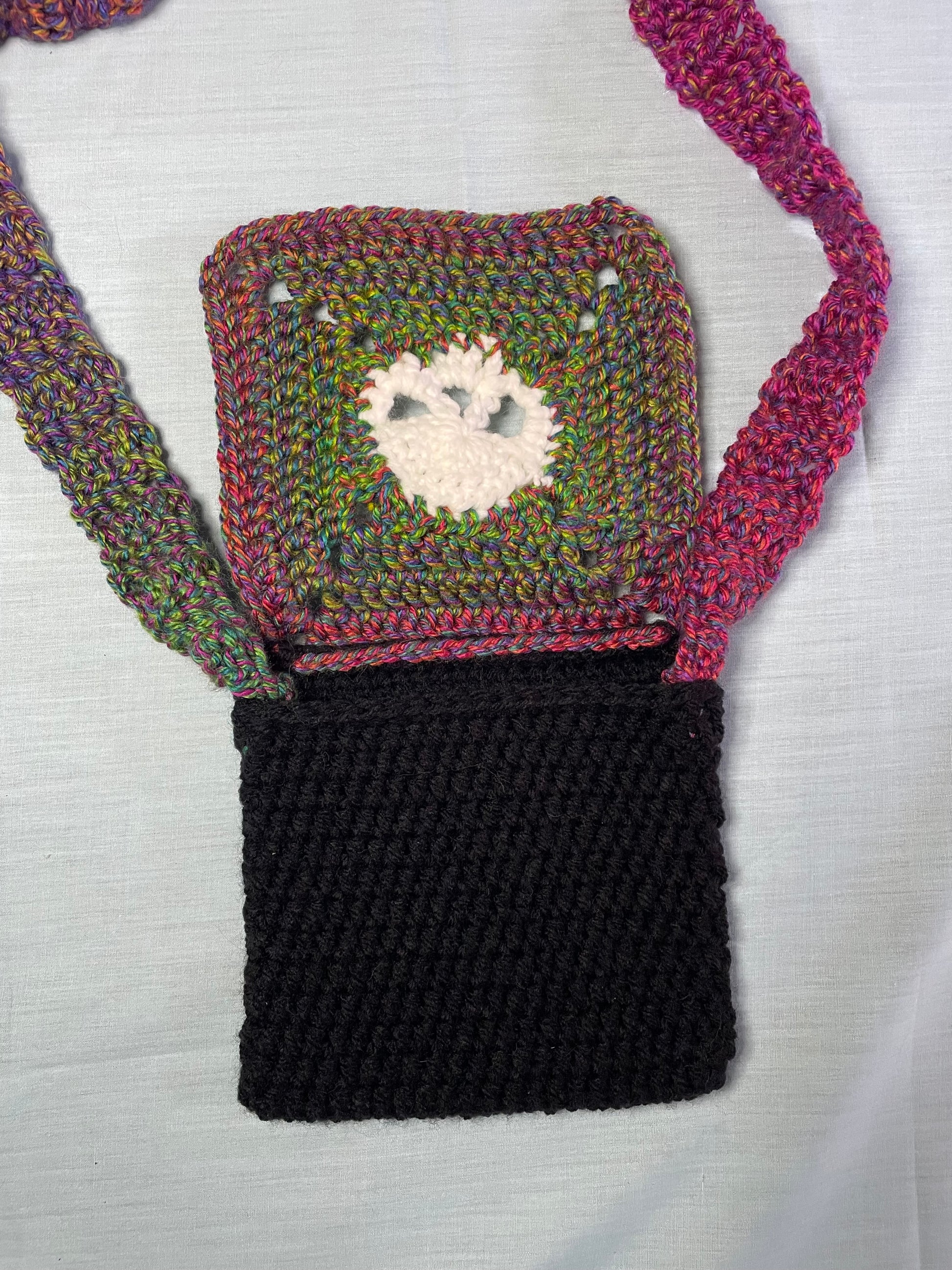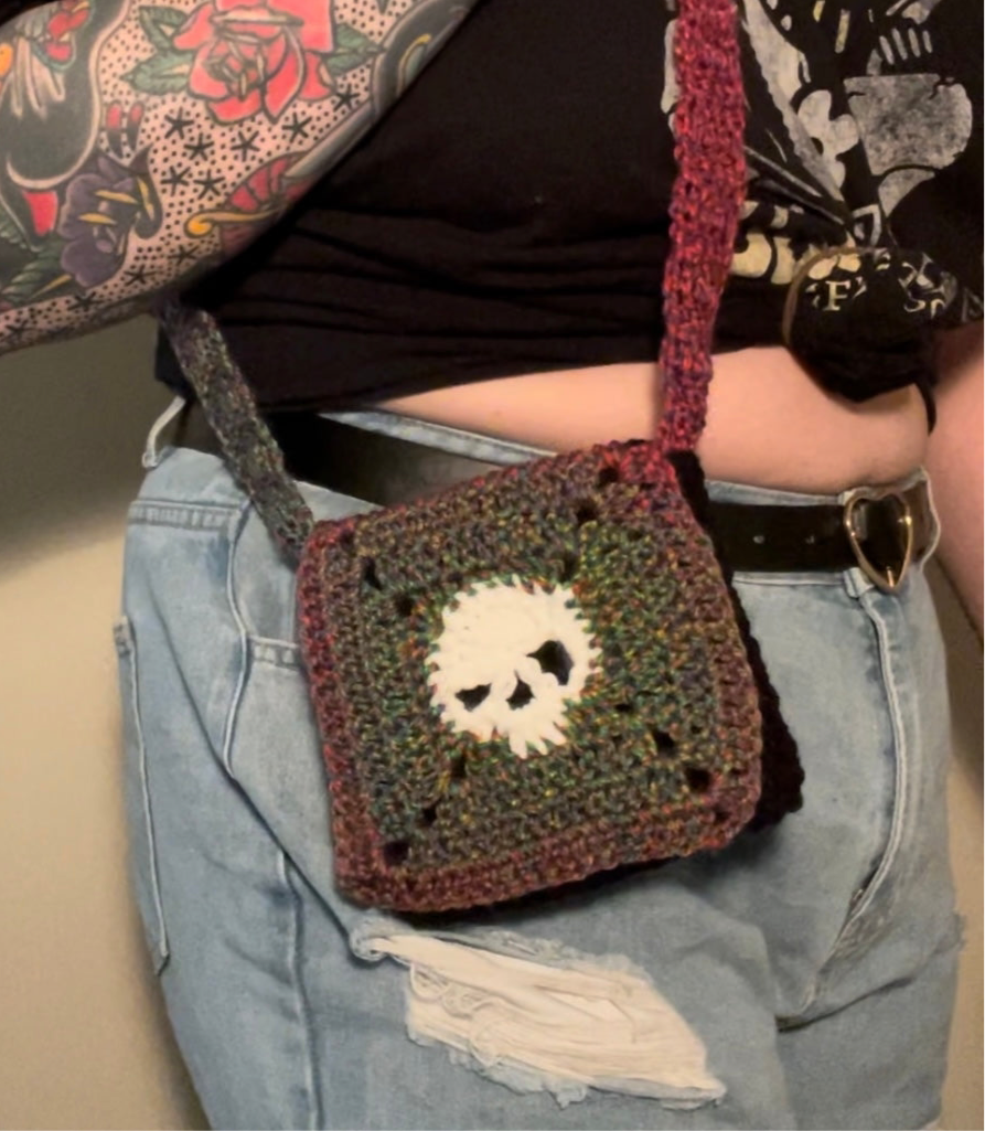 Crochet mini messenger bag uses a skull granny square for the flap. Bag base is black, skull square and strap are a blended multicolor fade. Bag is 100% acrylic. It measures 6” x 6” and has a 5.5” opening. Strap measures 21” from top of bag.