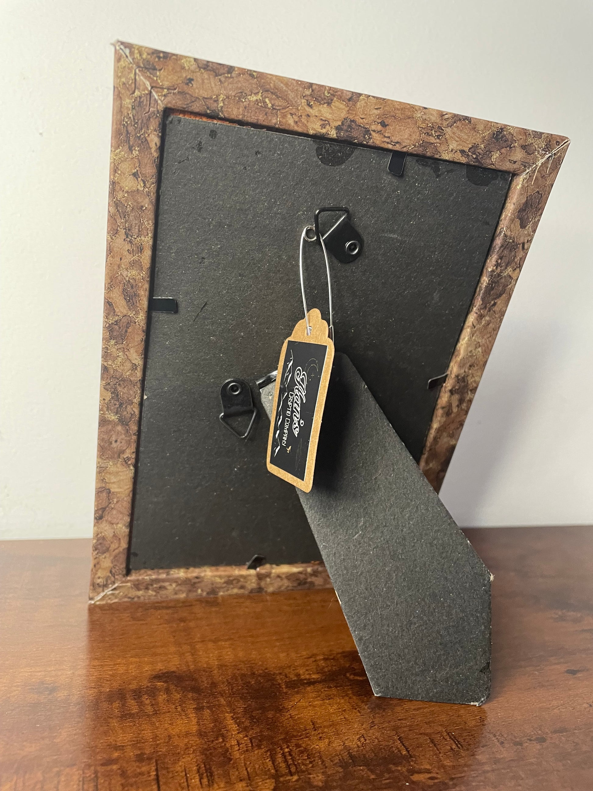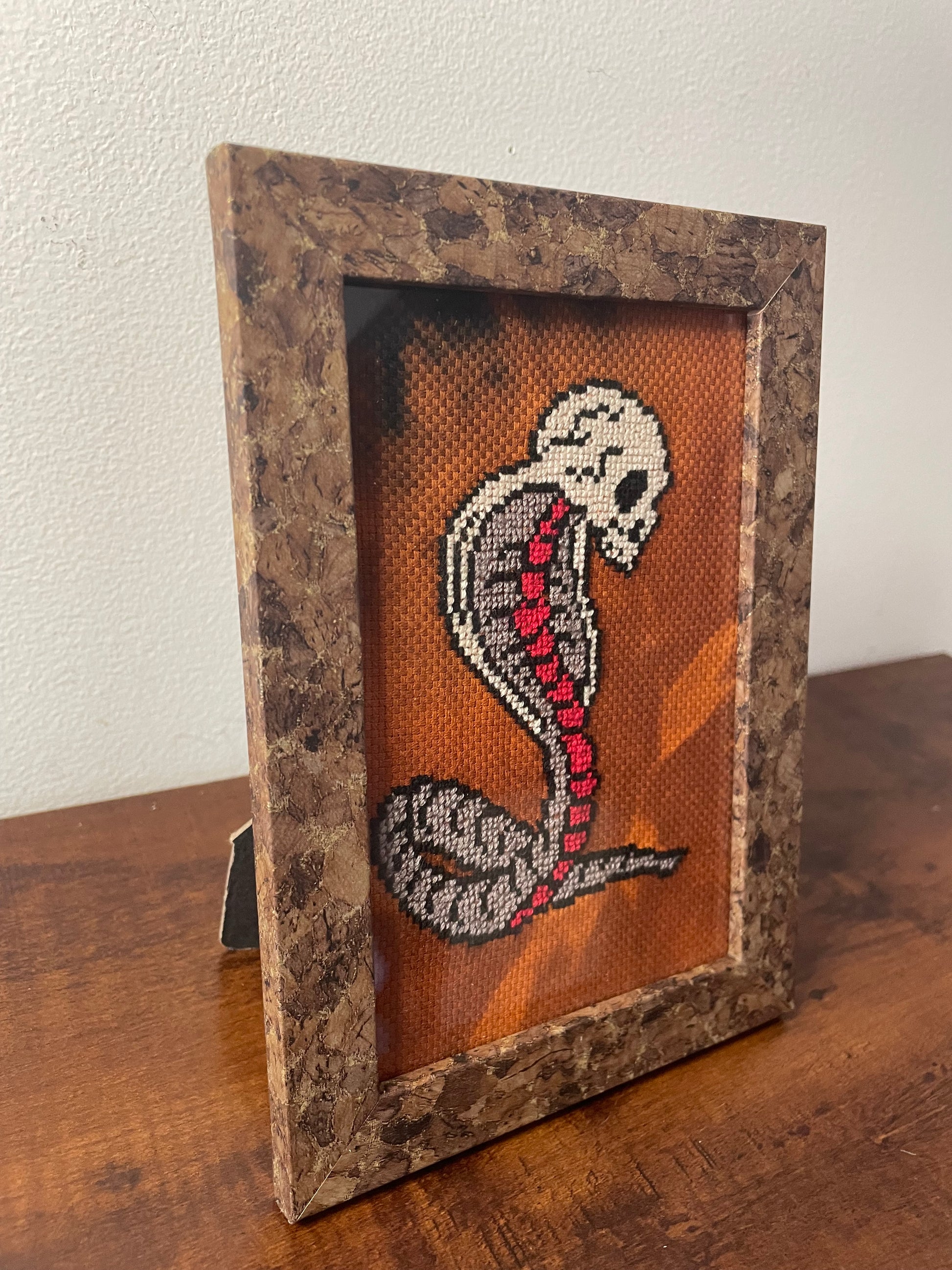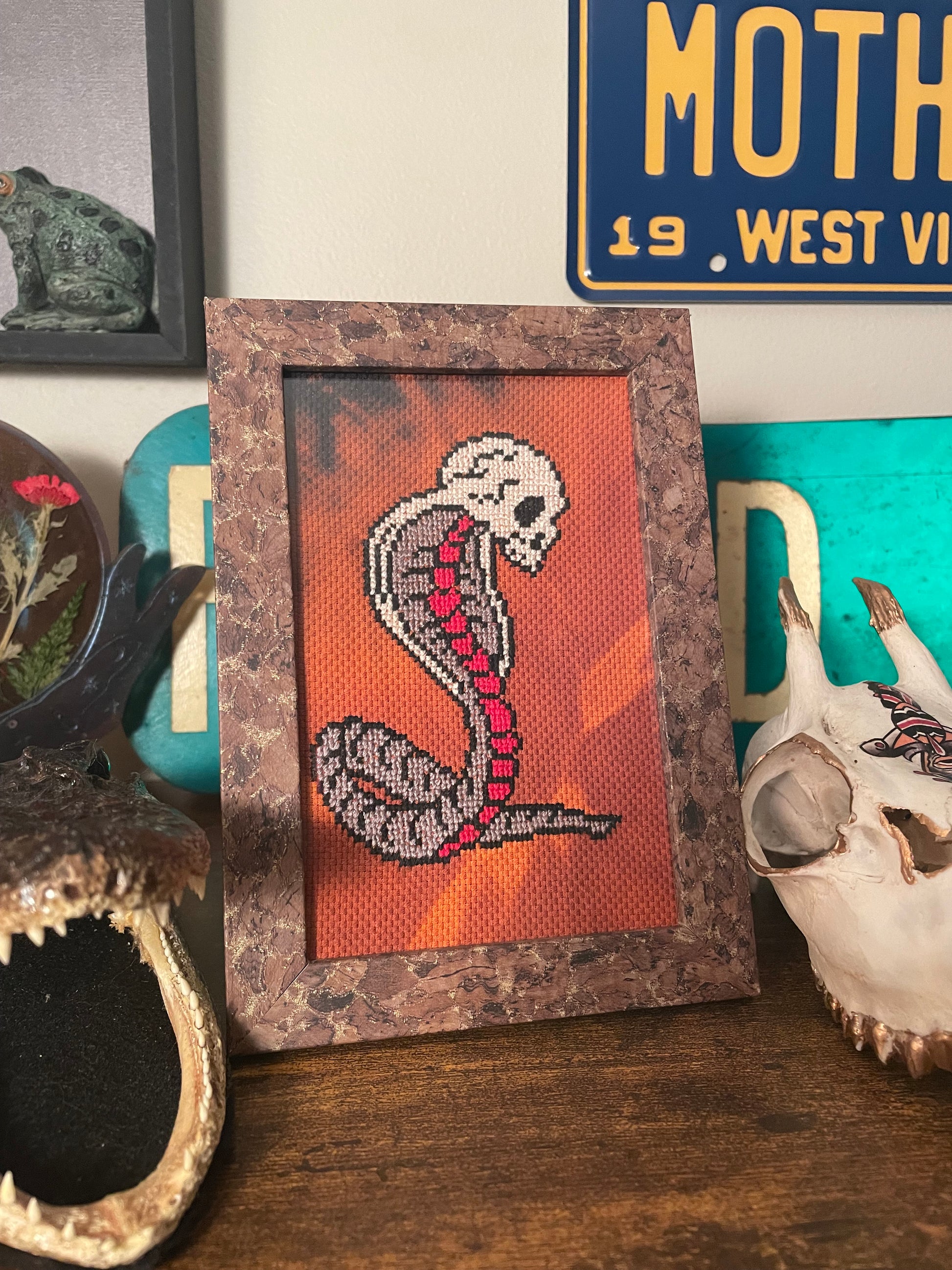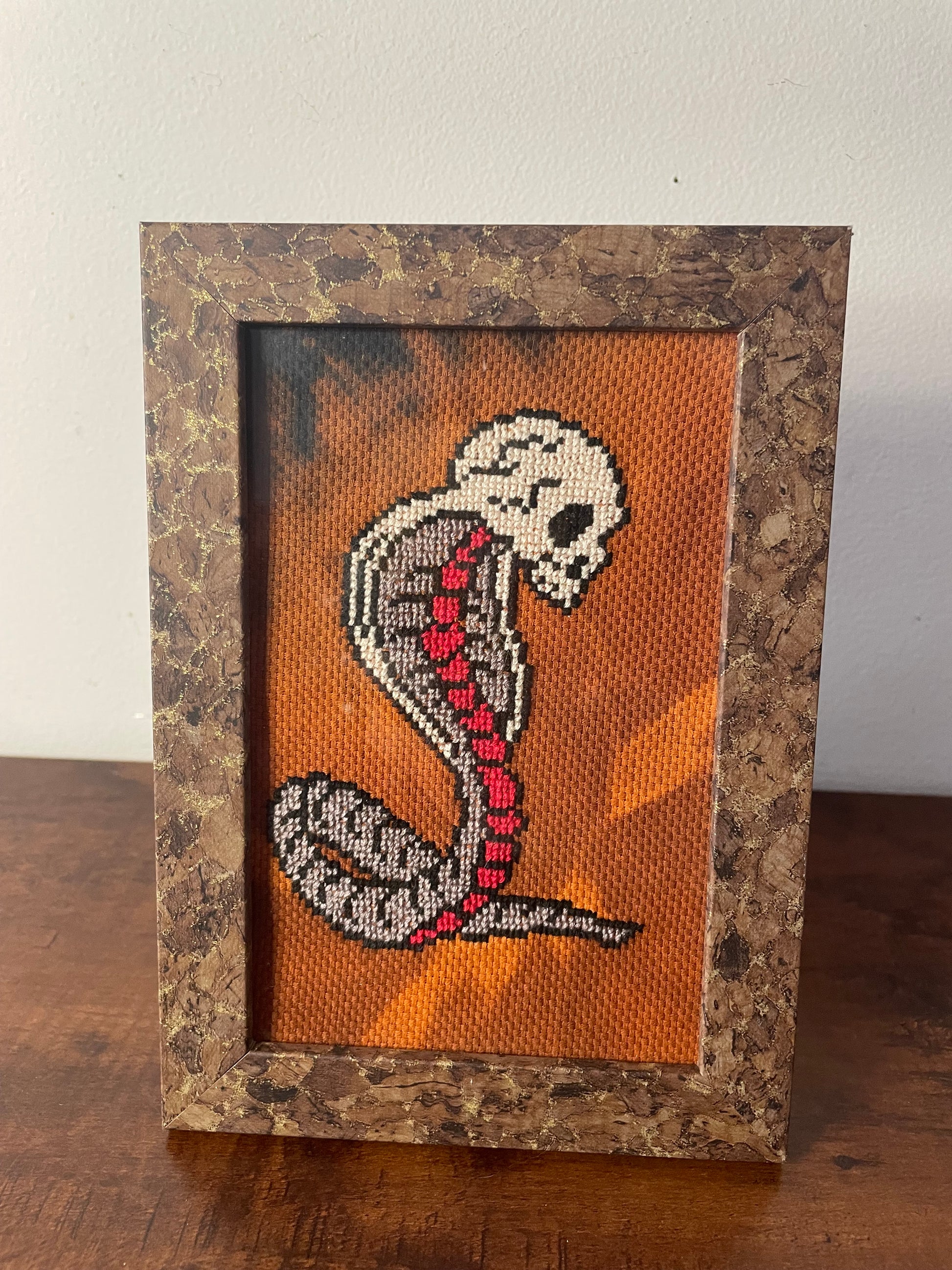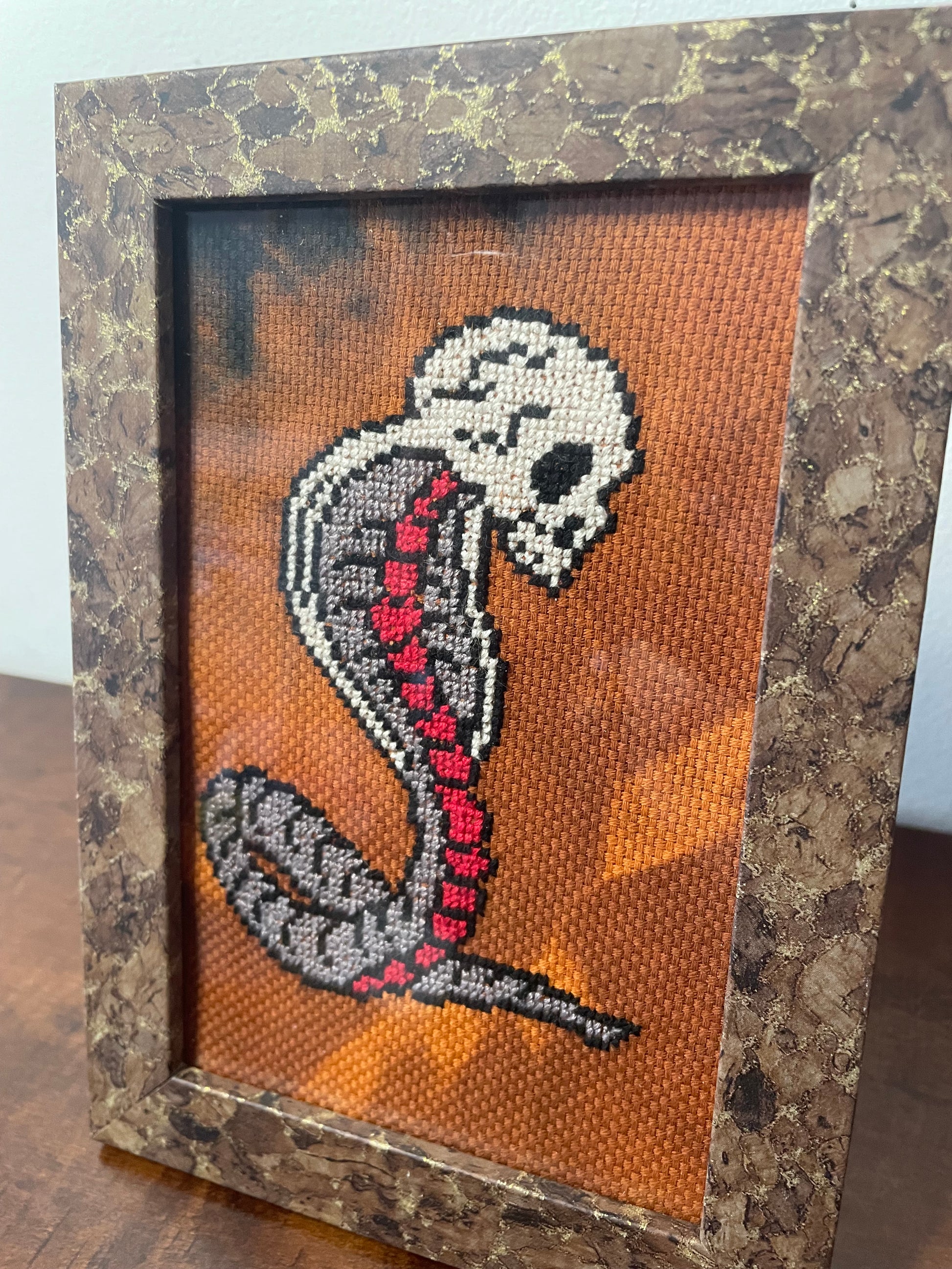 Cross stitch cobra skull on bleached fabric. Framed in 5x7 metallic woodsy/snakeskin patterned frame, can be stood or hung up on a wall. Original pattern by TheCruelGoblin on Etsy.