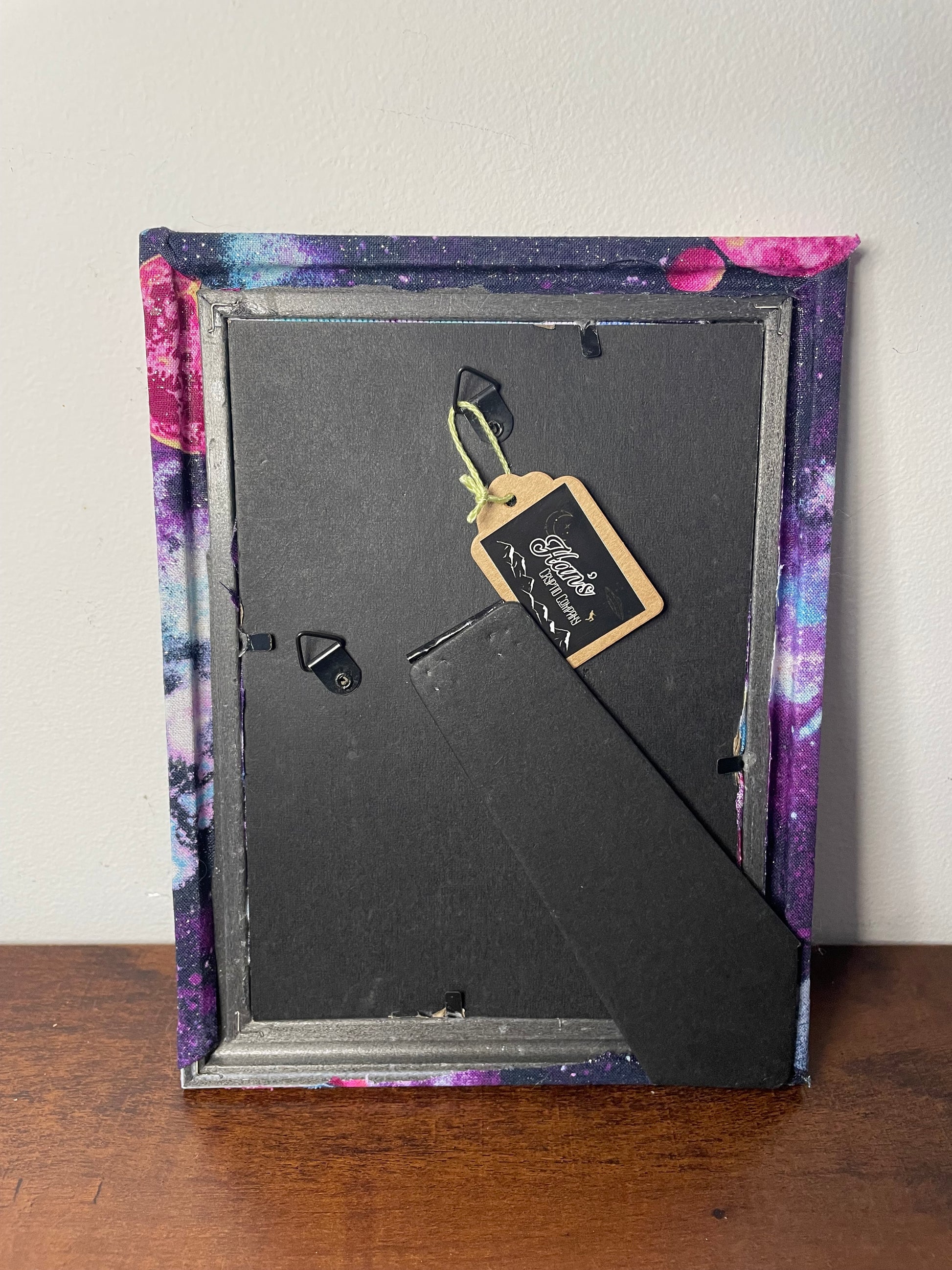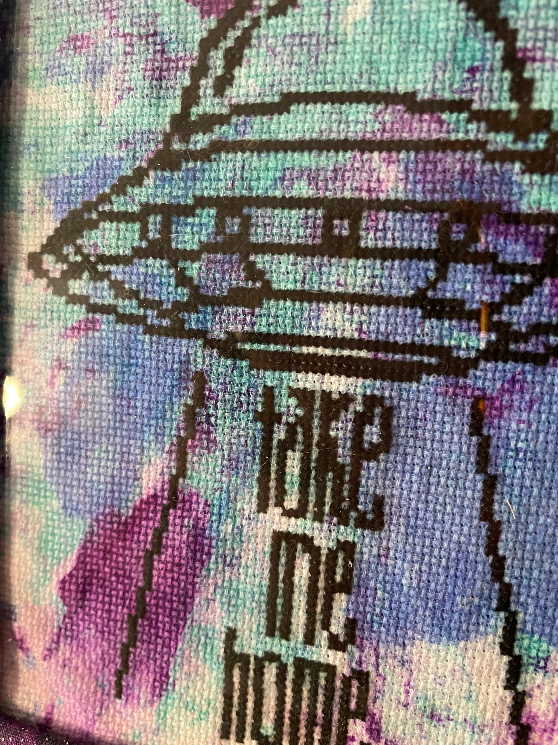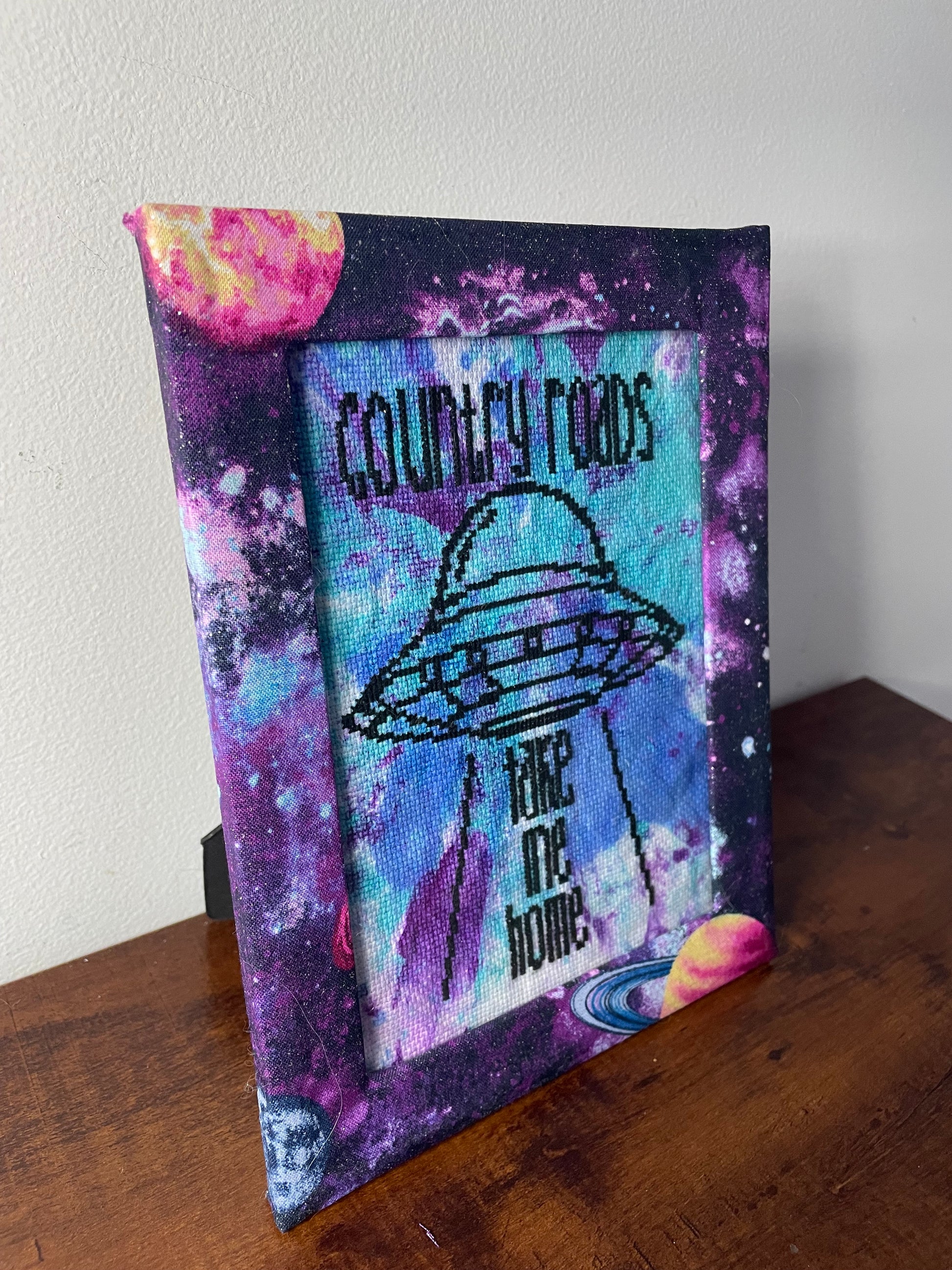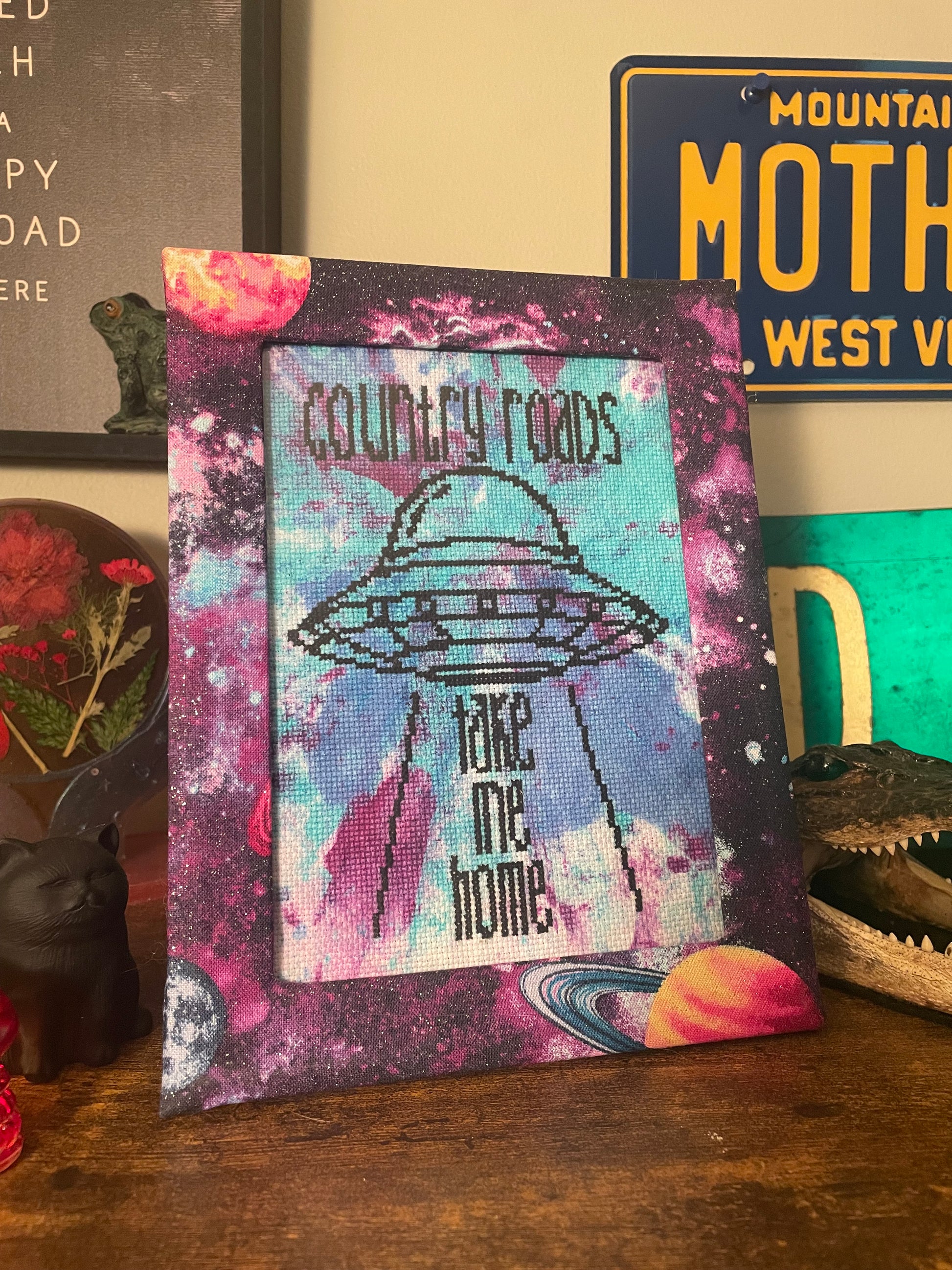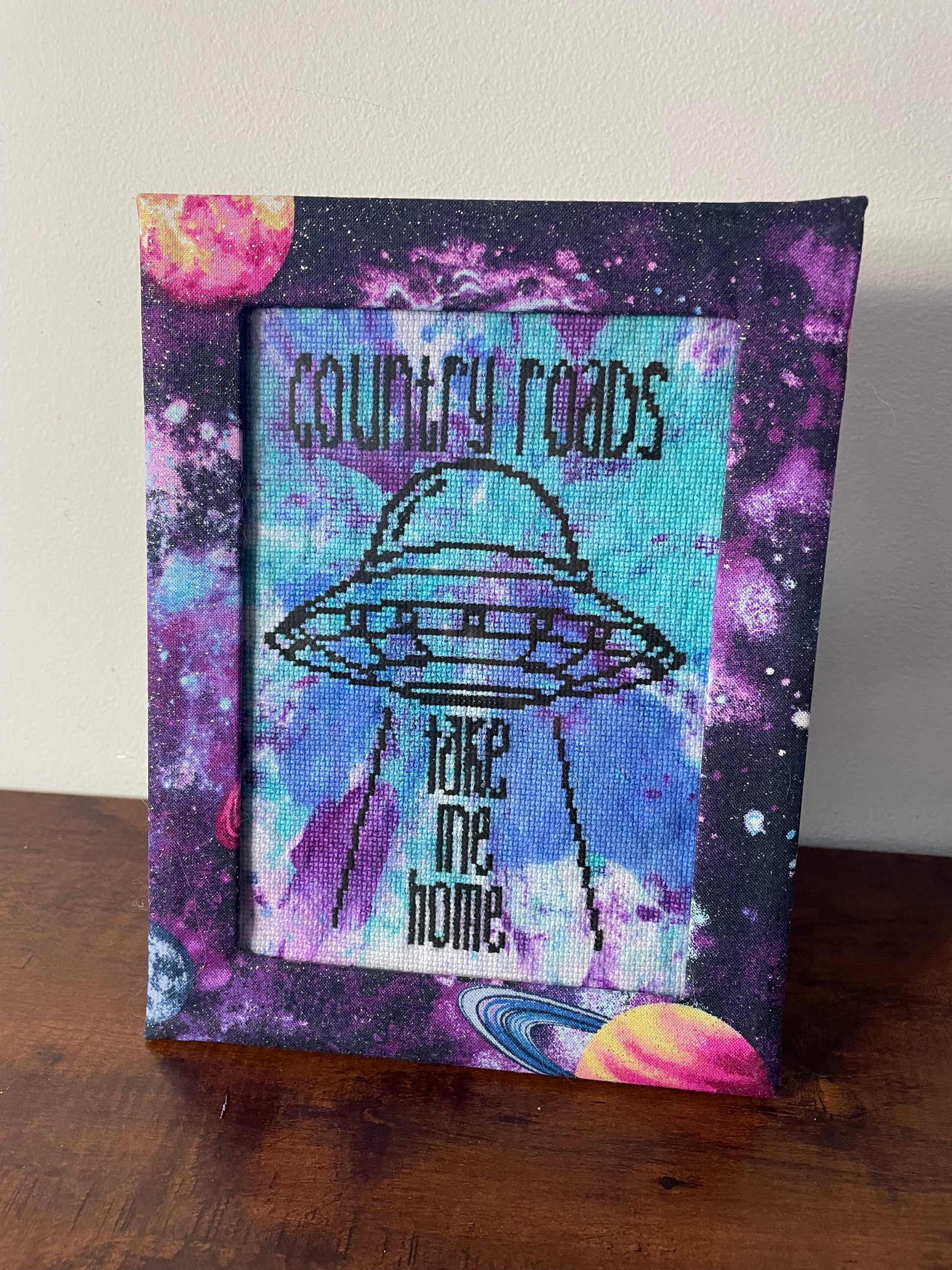 “Country roads, take me home” UFO cross stitch on hand tie-dyed aida cloth. Frame is reworked with glittery galaxy fabric. Measures 8.5” tall and 6.5” wide.