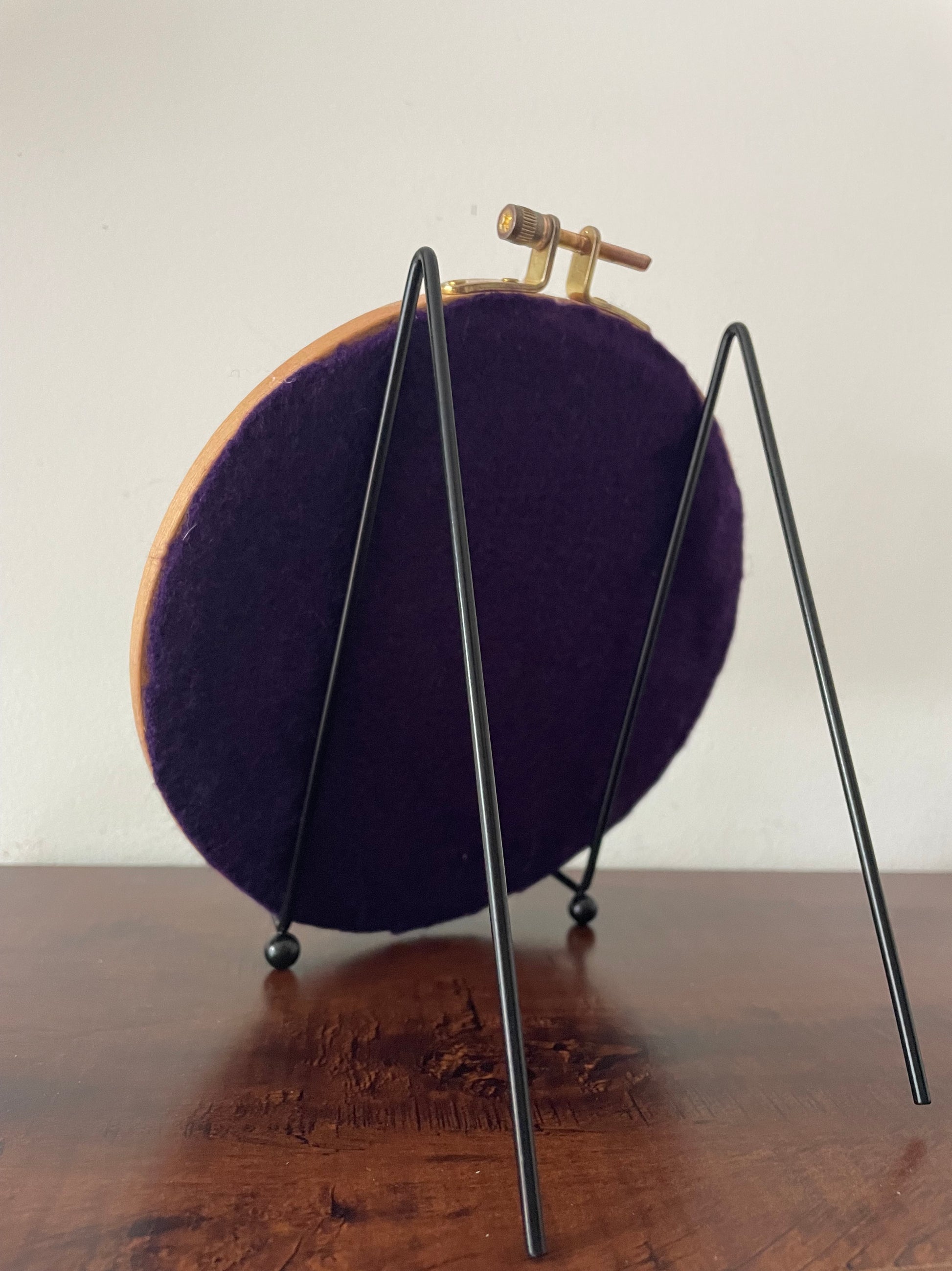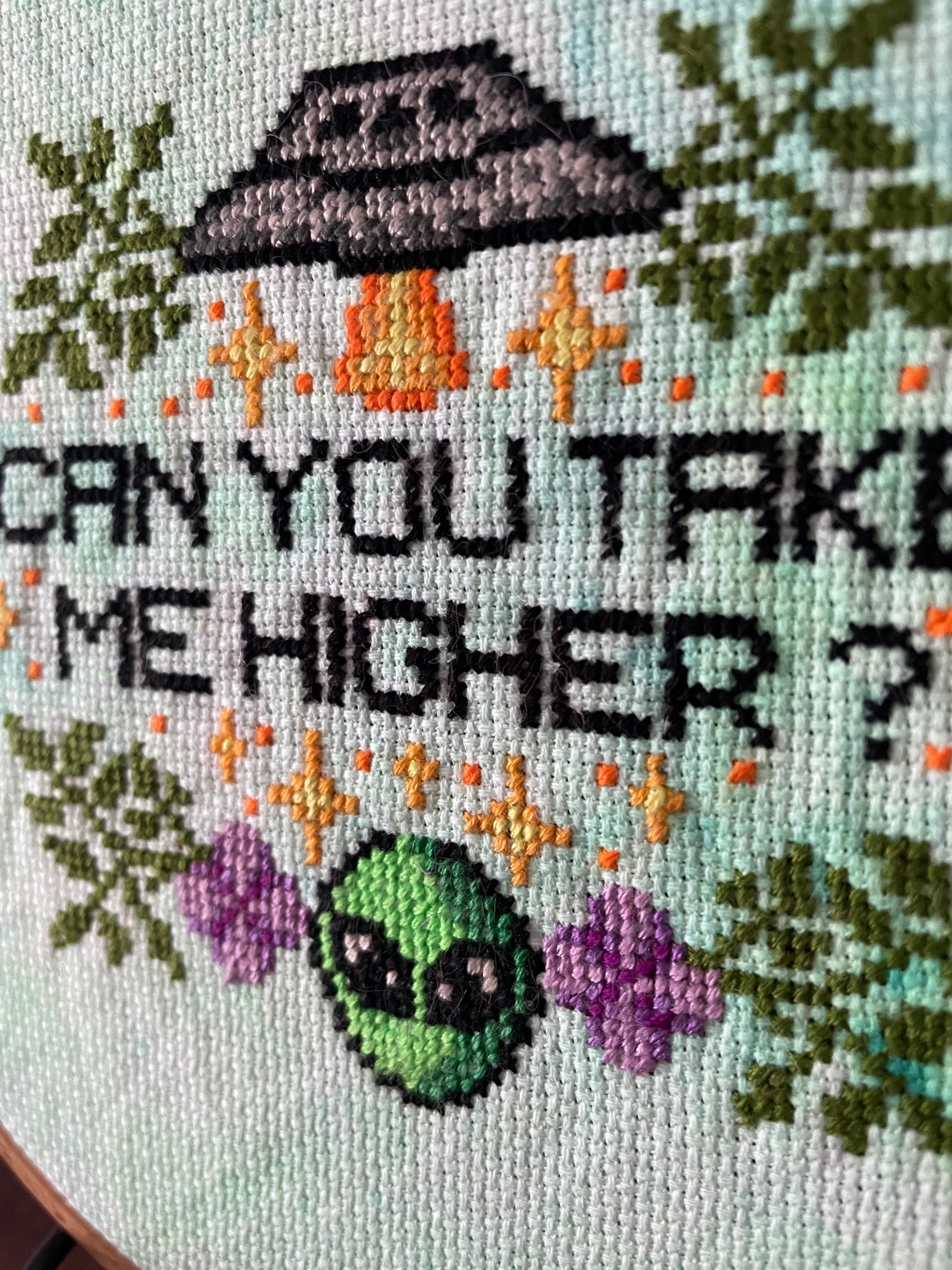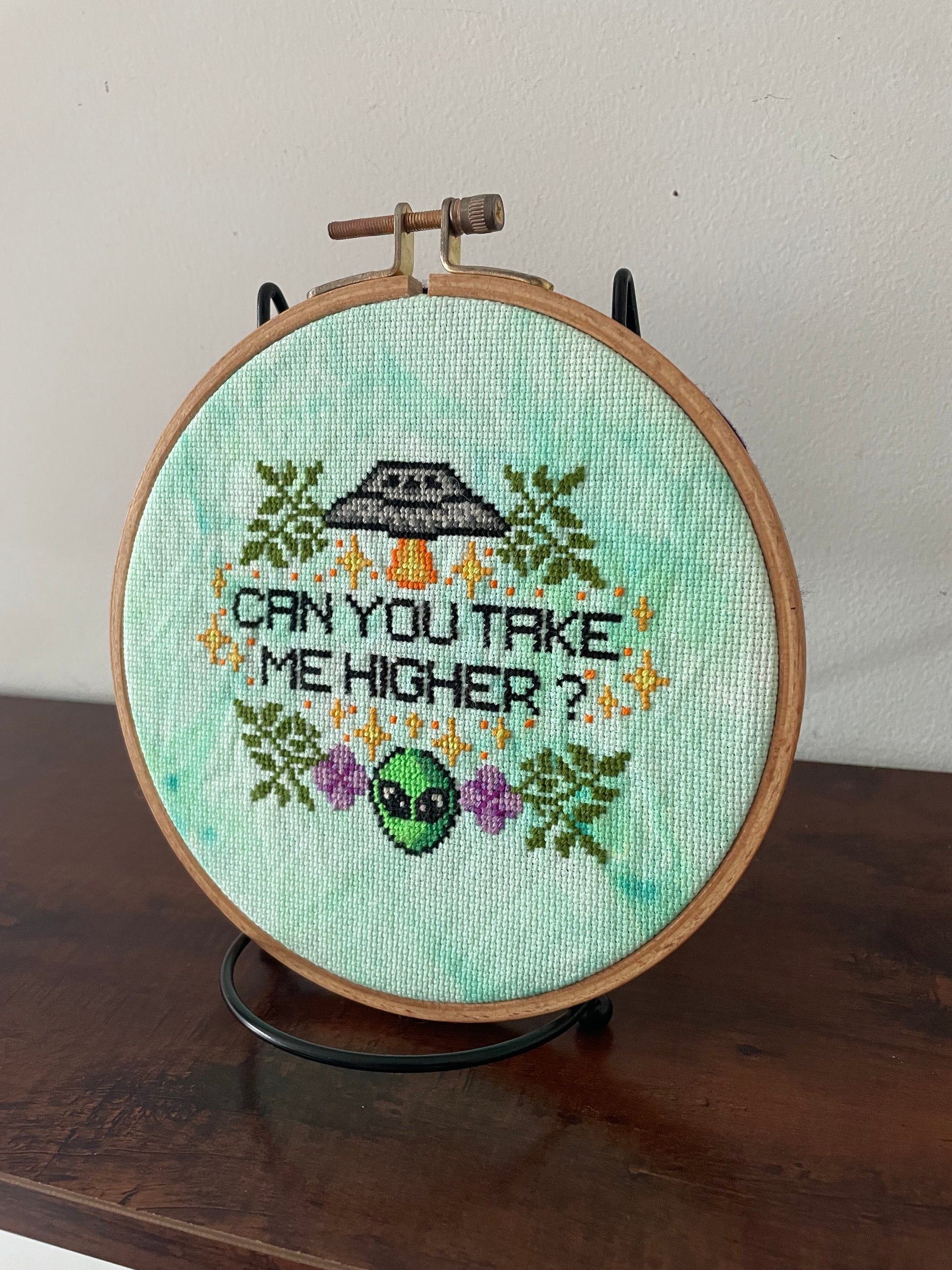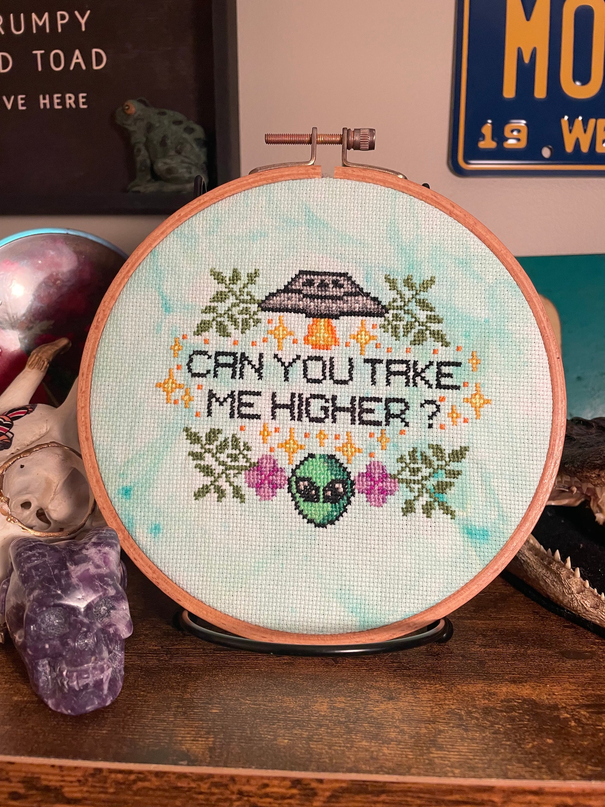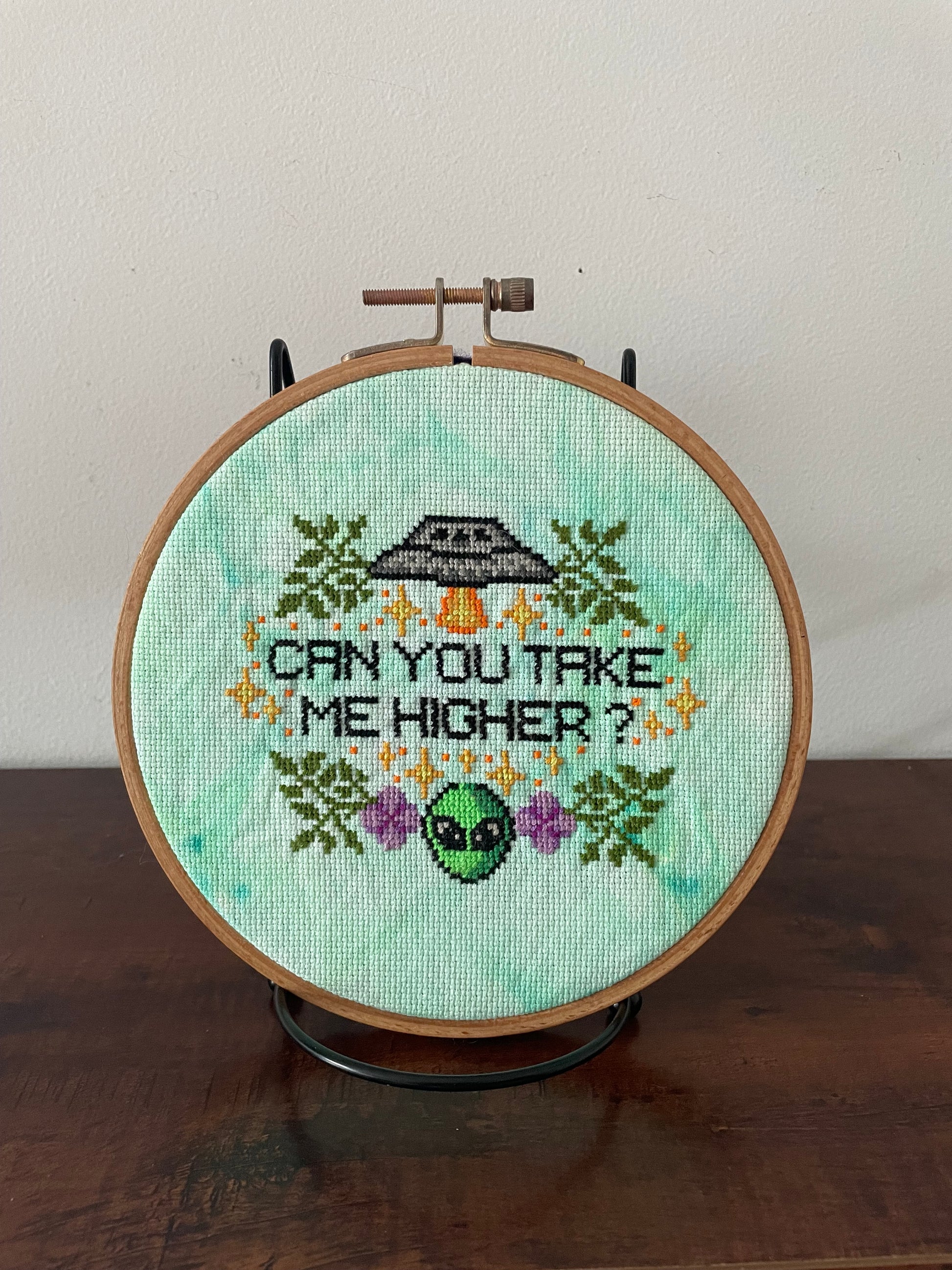 Cross stitch “can you take me higher?” alien & ufo on hand tie-dyed light green fabric. Hoop measures 6”. Backed with purple felt. Original pattern by DoubleCrossedStudio on Etsy.