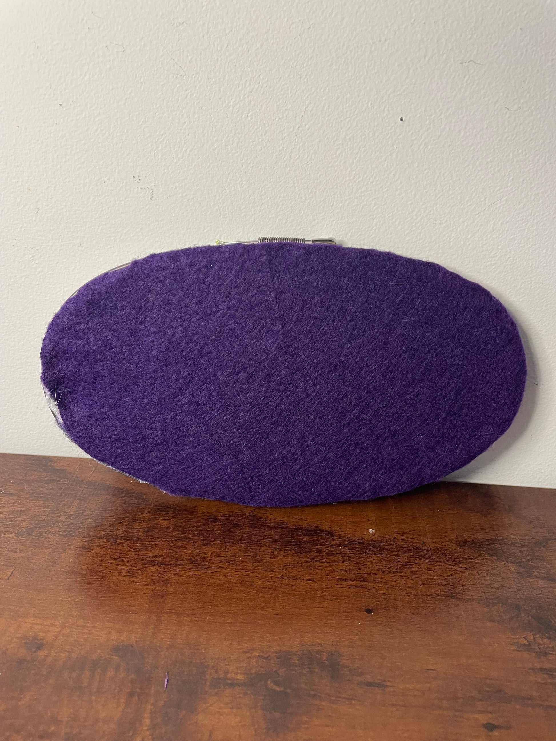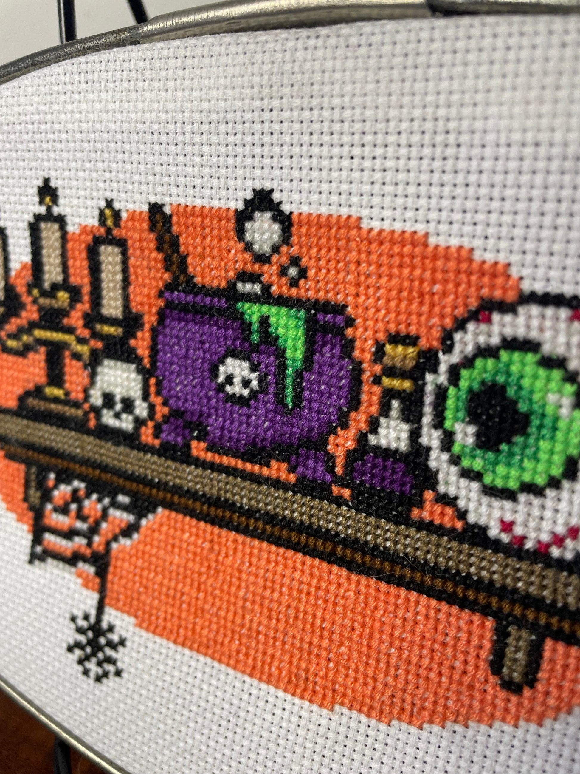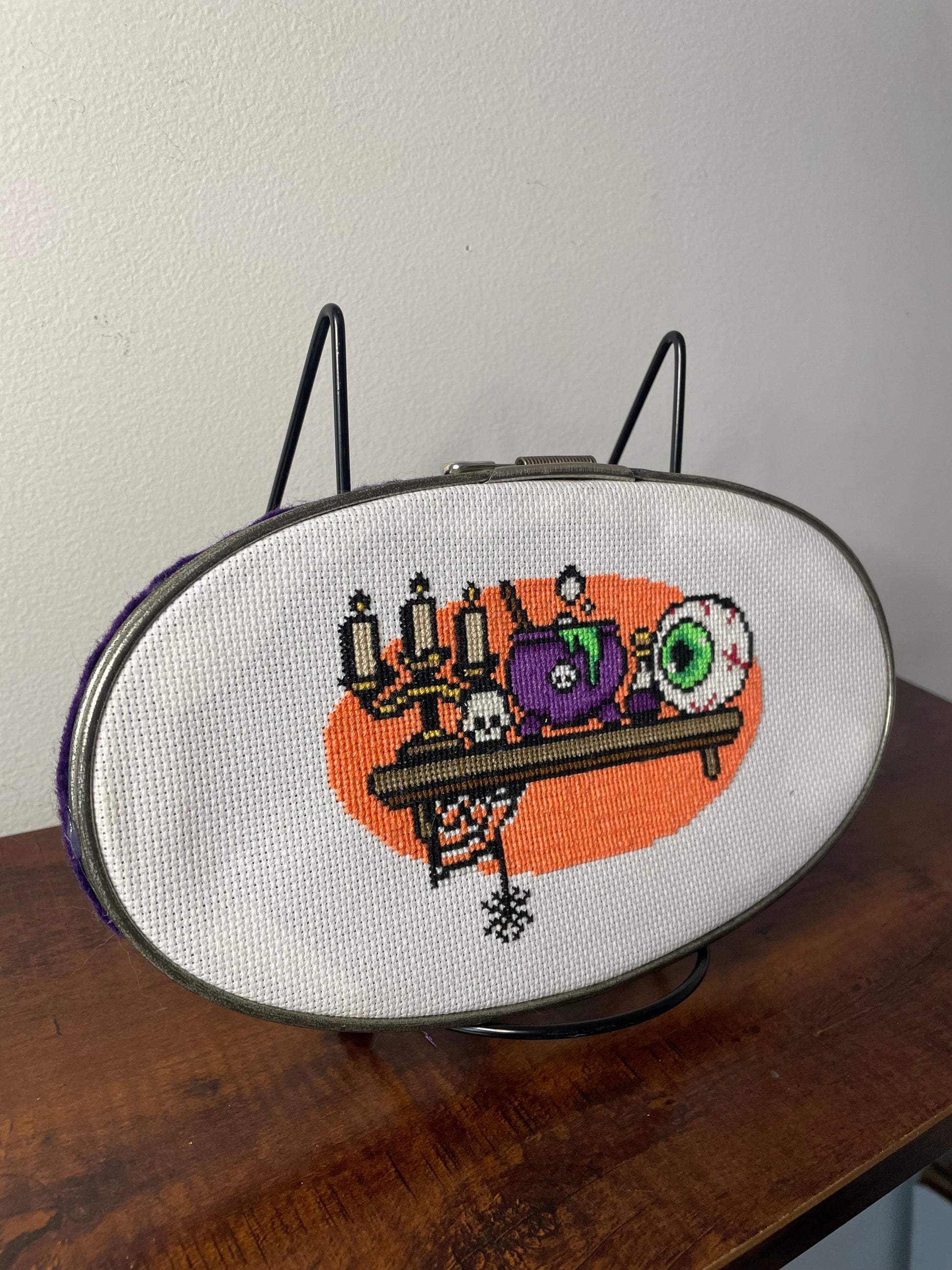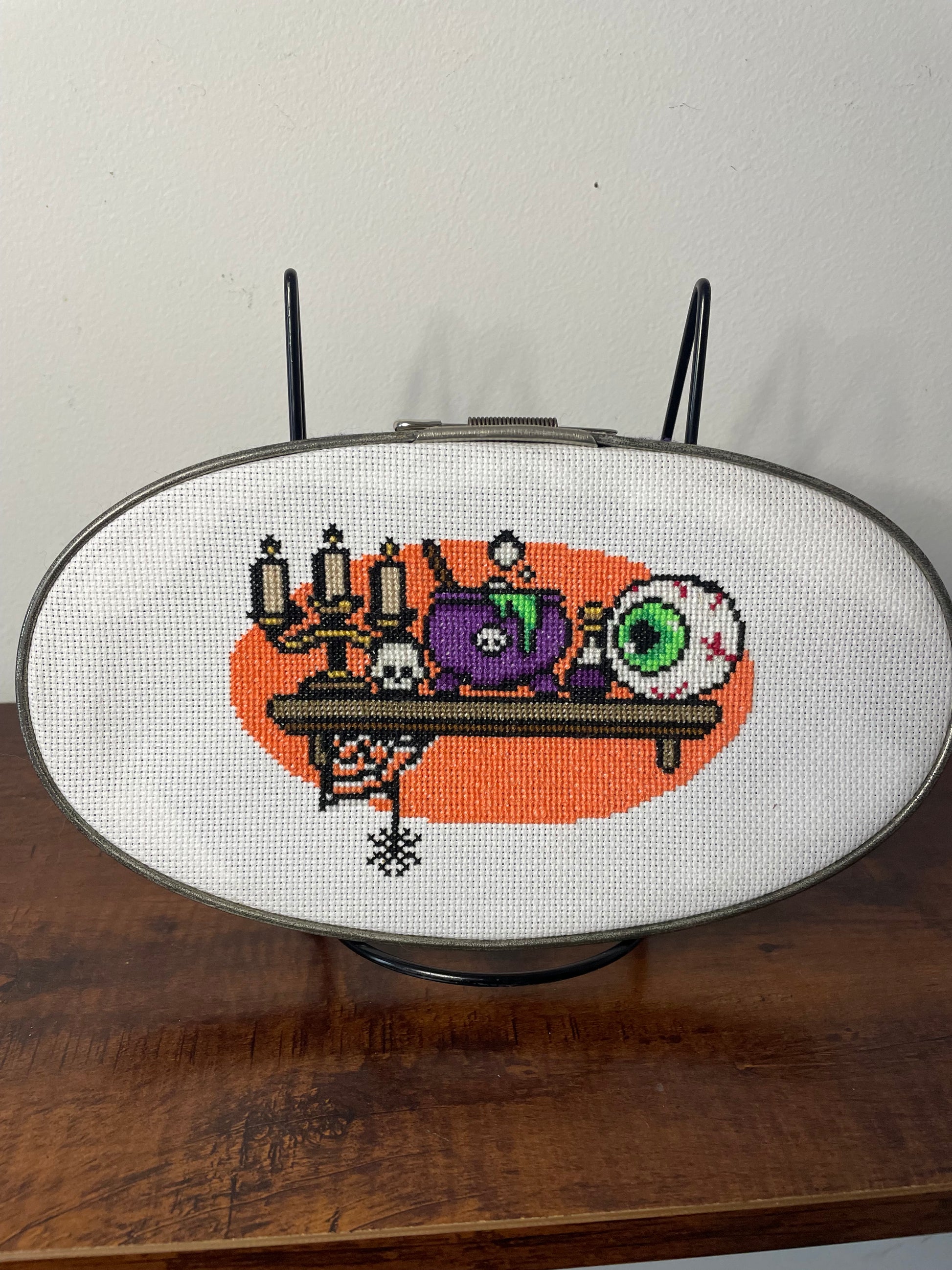 Witches shelf cross stitched on white aida cloth and framed in vintage metal oval hoop. Backed with purple felt. Measures 9” wide and 5” tall.