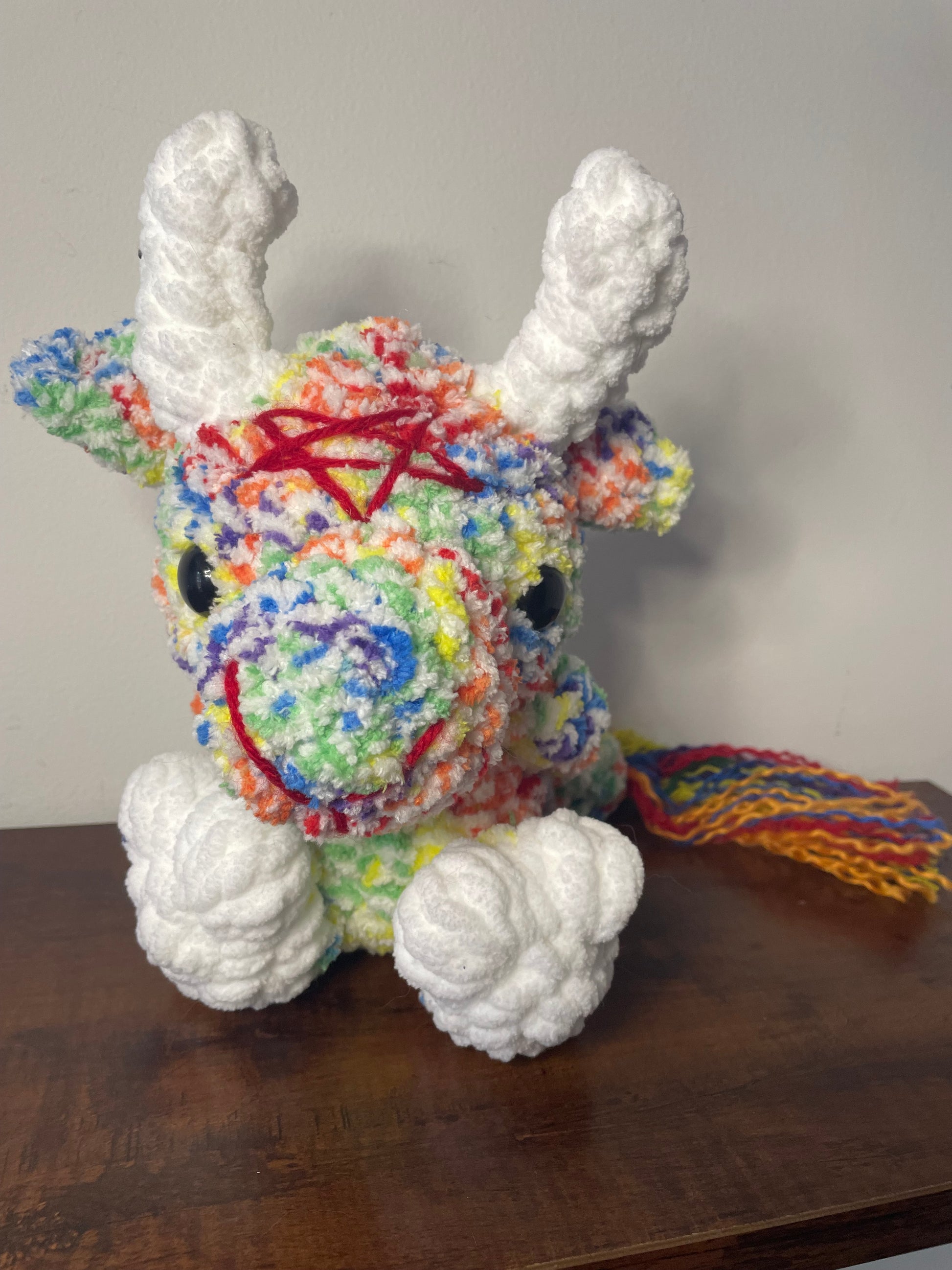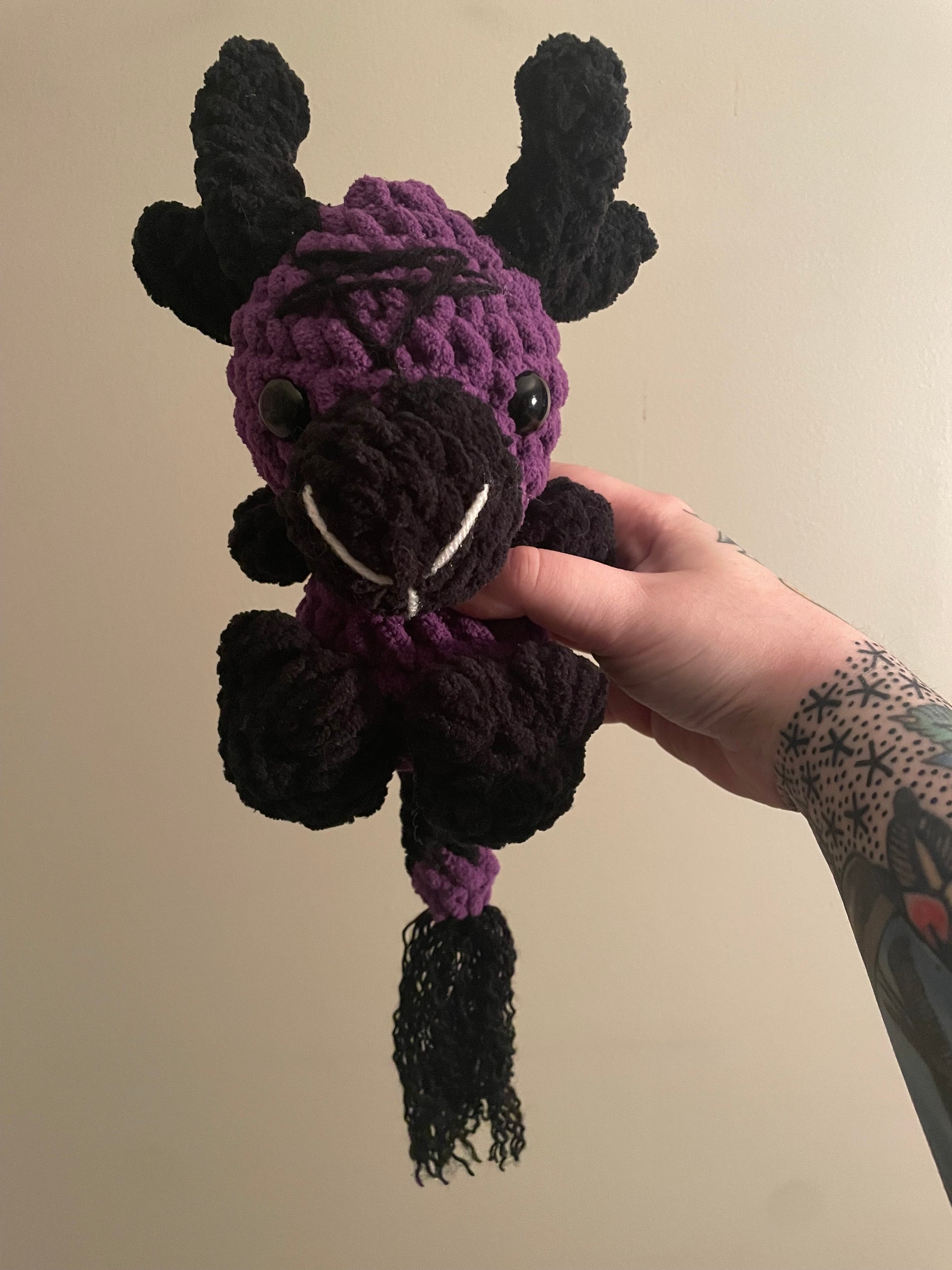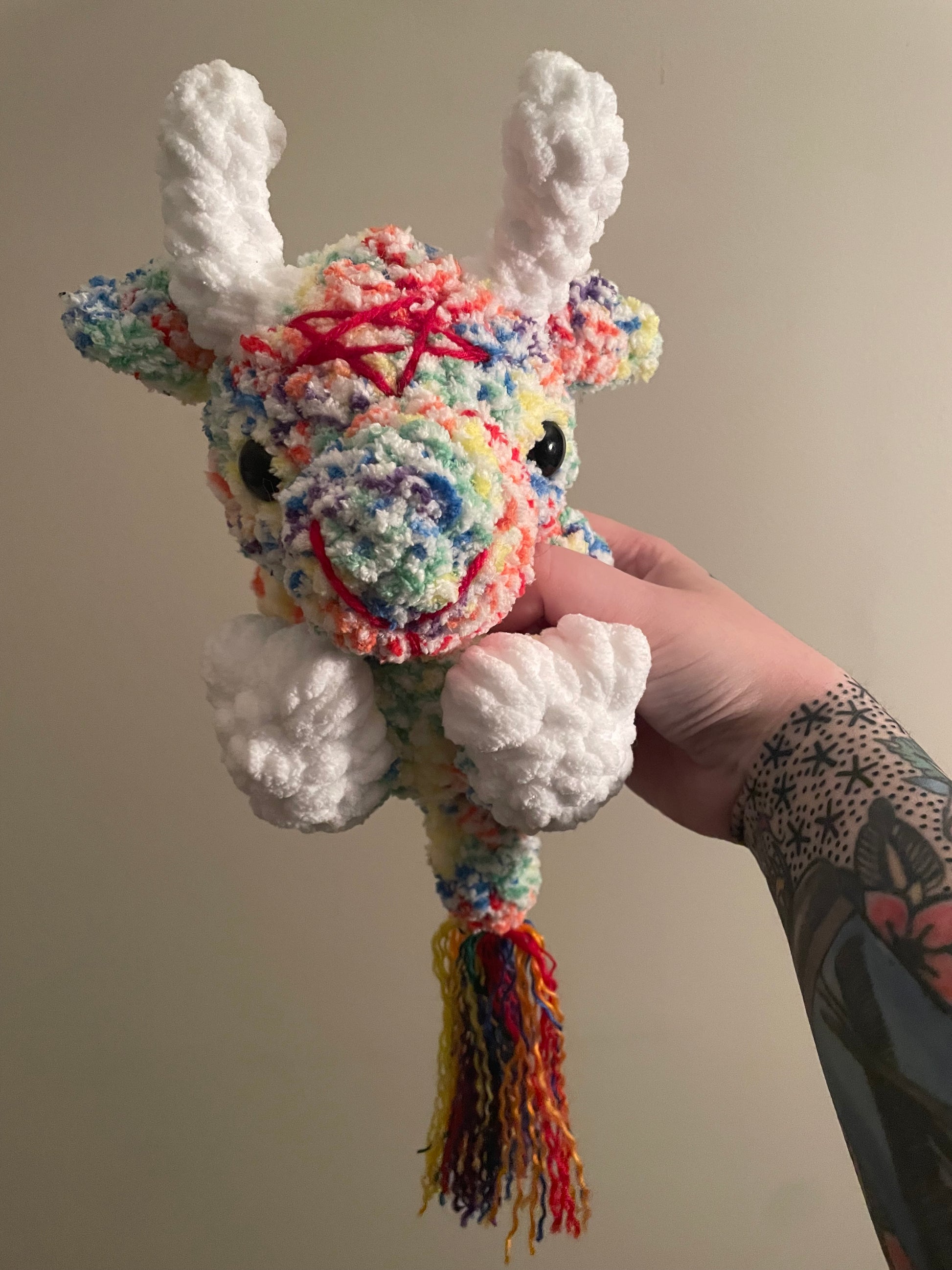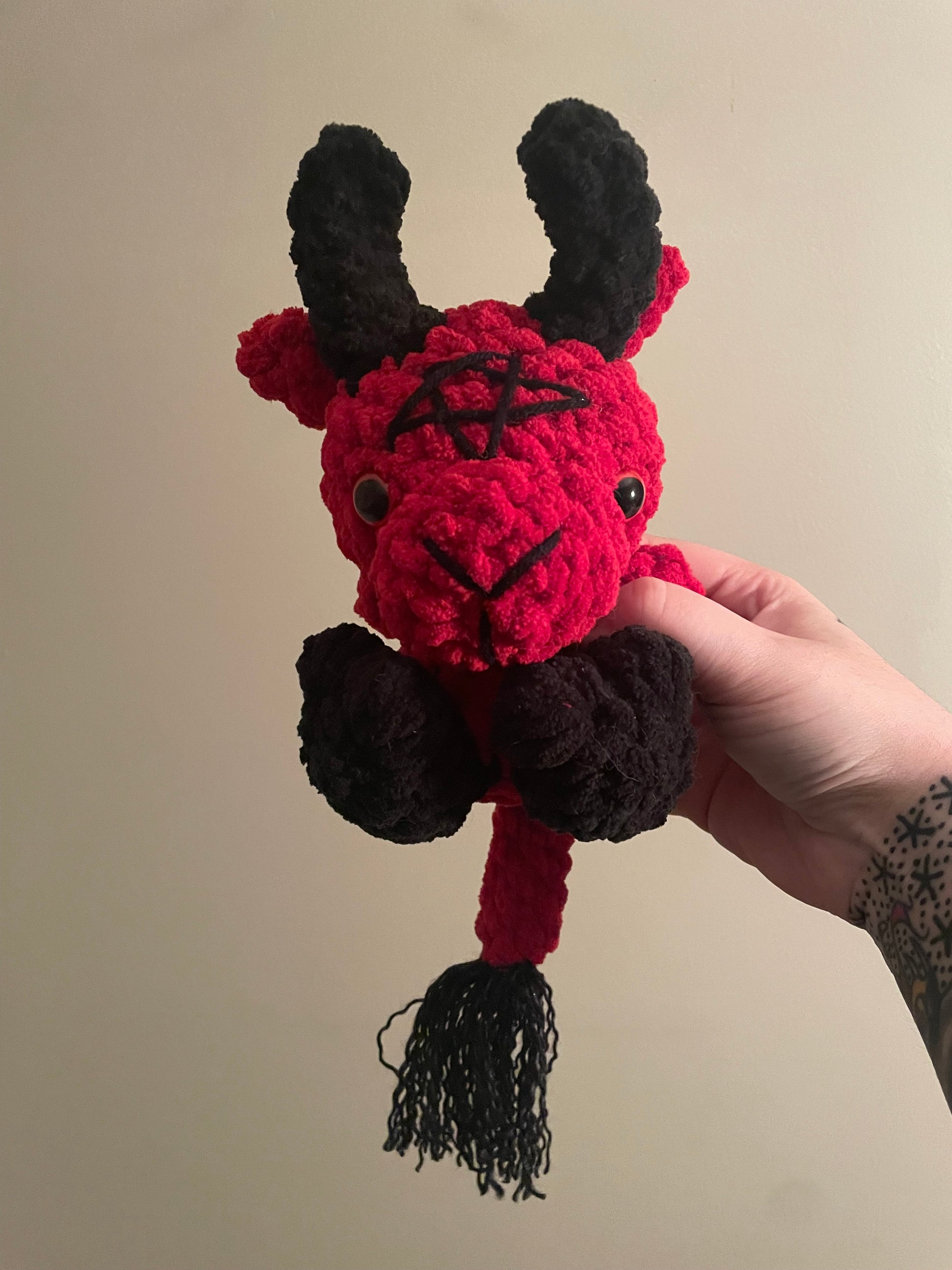 Handmade crochet Baby Baphomet is made of soft blanket yarn for main body and acrylic for the tail fluff and embroidery. They measure 8.5" tall and 6" across (from arm to arm). Tail measures approx. 6.5" long. Measurements may vary slightly due to the handmade nature of the product and variations in yarn weight.