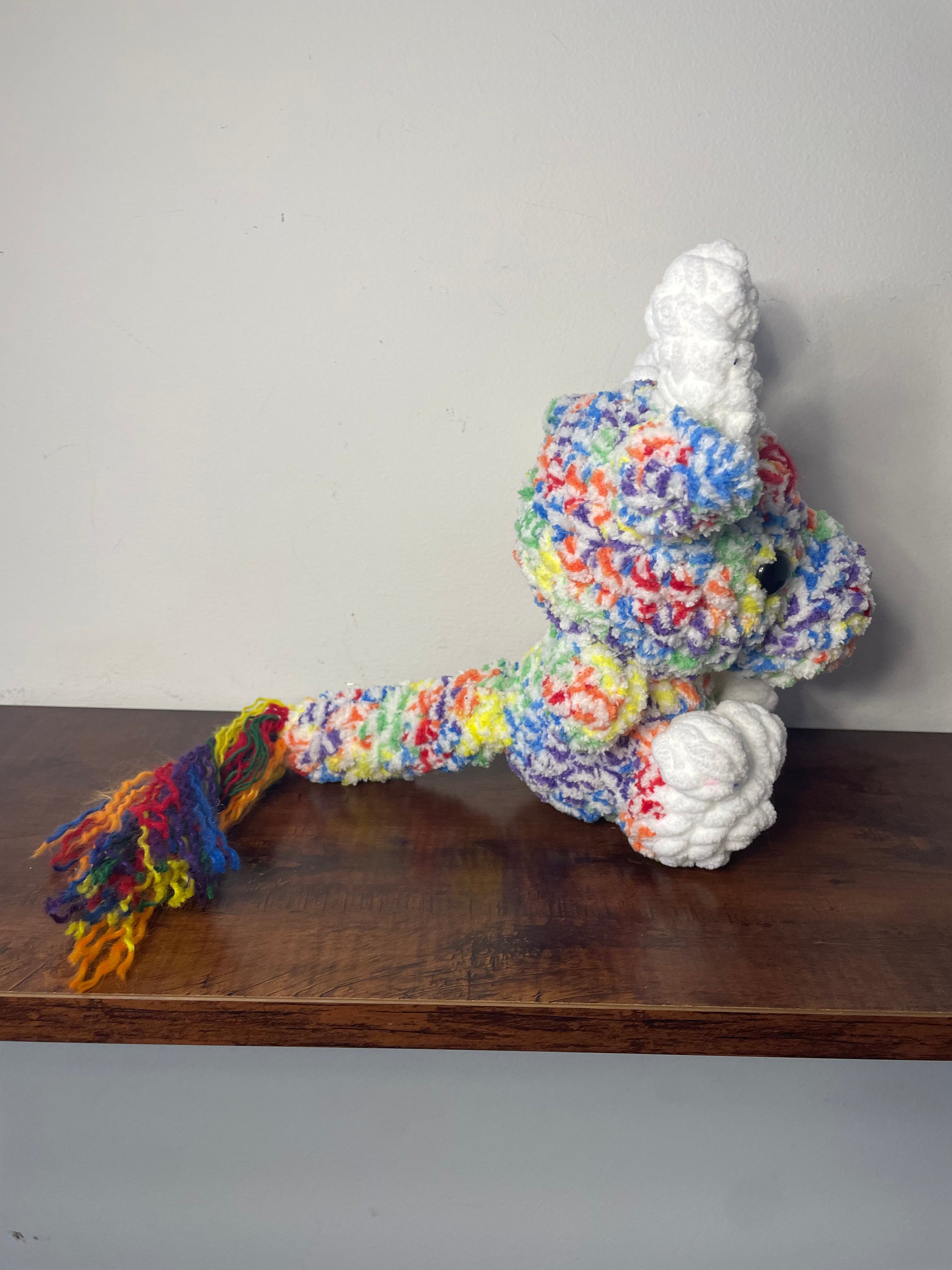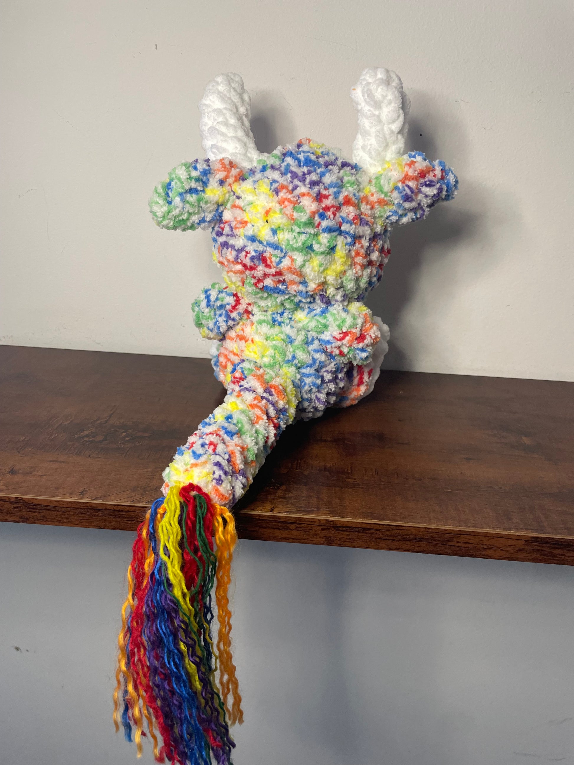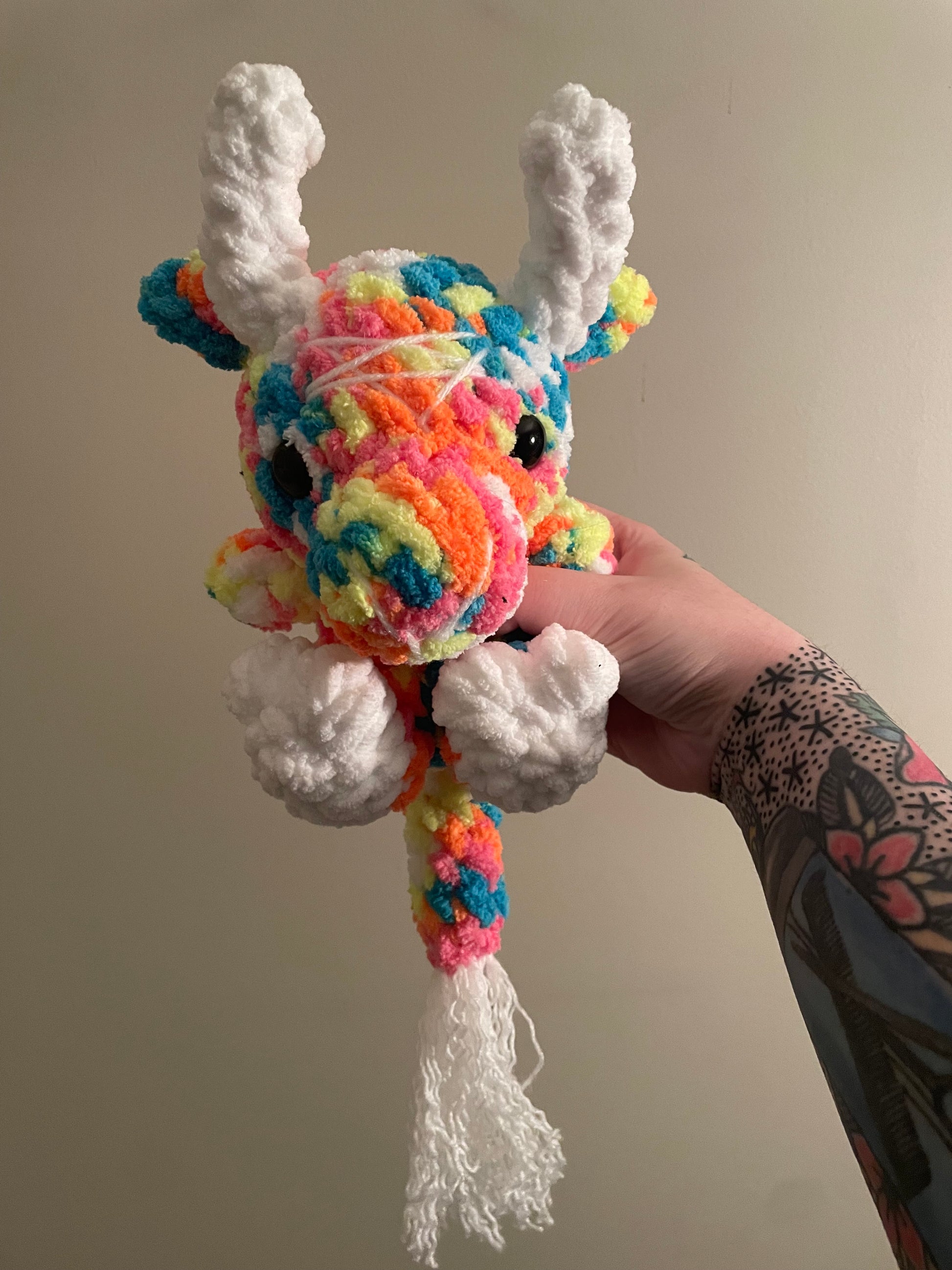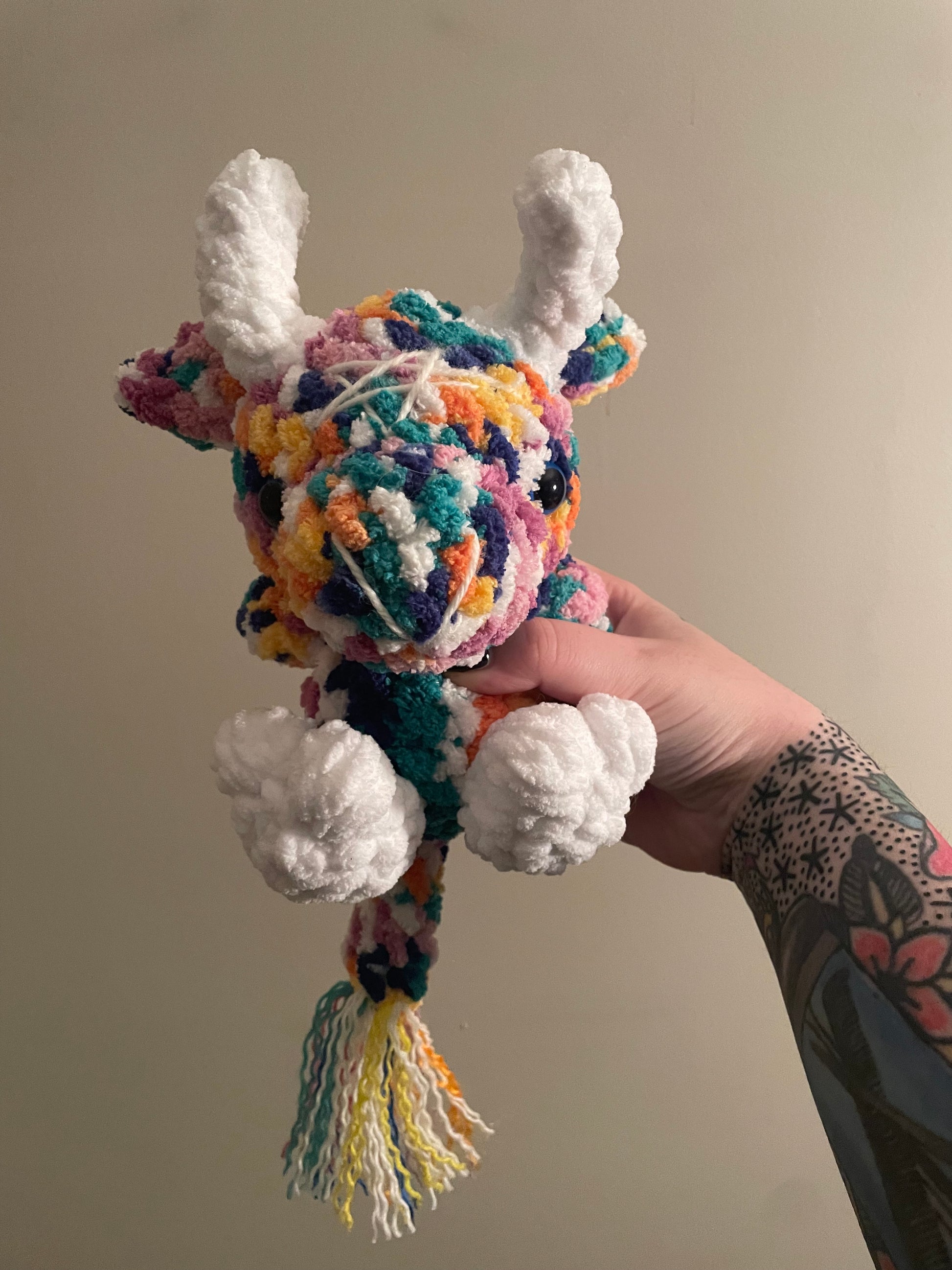 Handmade crochet Baby Baphomet is made of soft blanket yarn for main body and acrylic for the tail fluff and embroidery. They measure 8.5" tall and 6" across (from arm to arm). Tail measures approx. 6.5" long. Measurements may vary slightly due to the handmade nature of the product and variations in yarn weight.