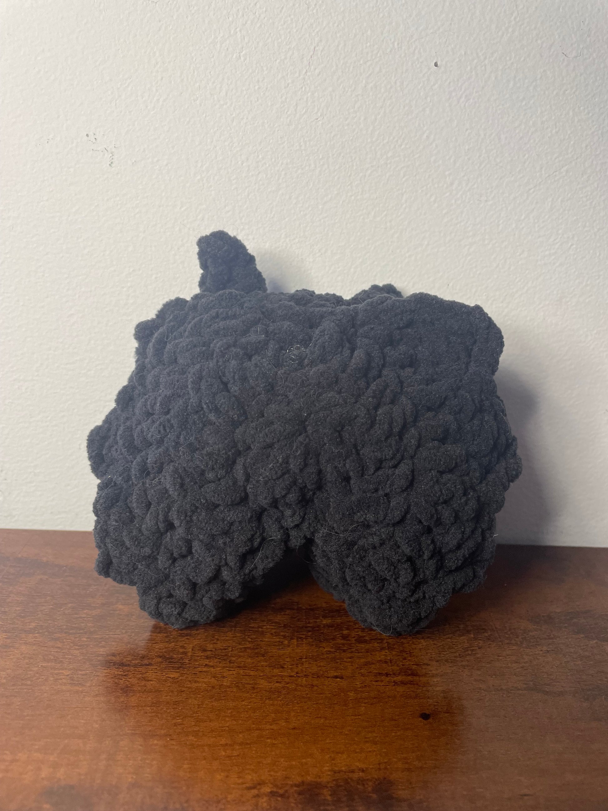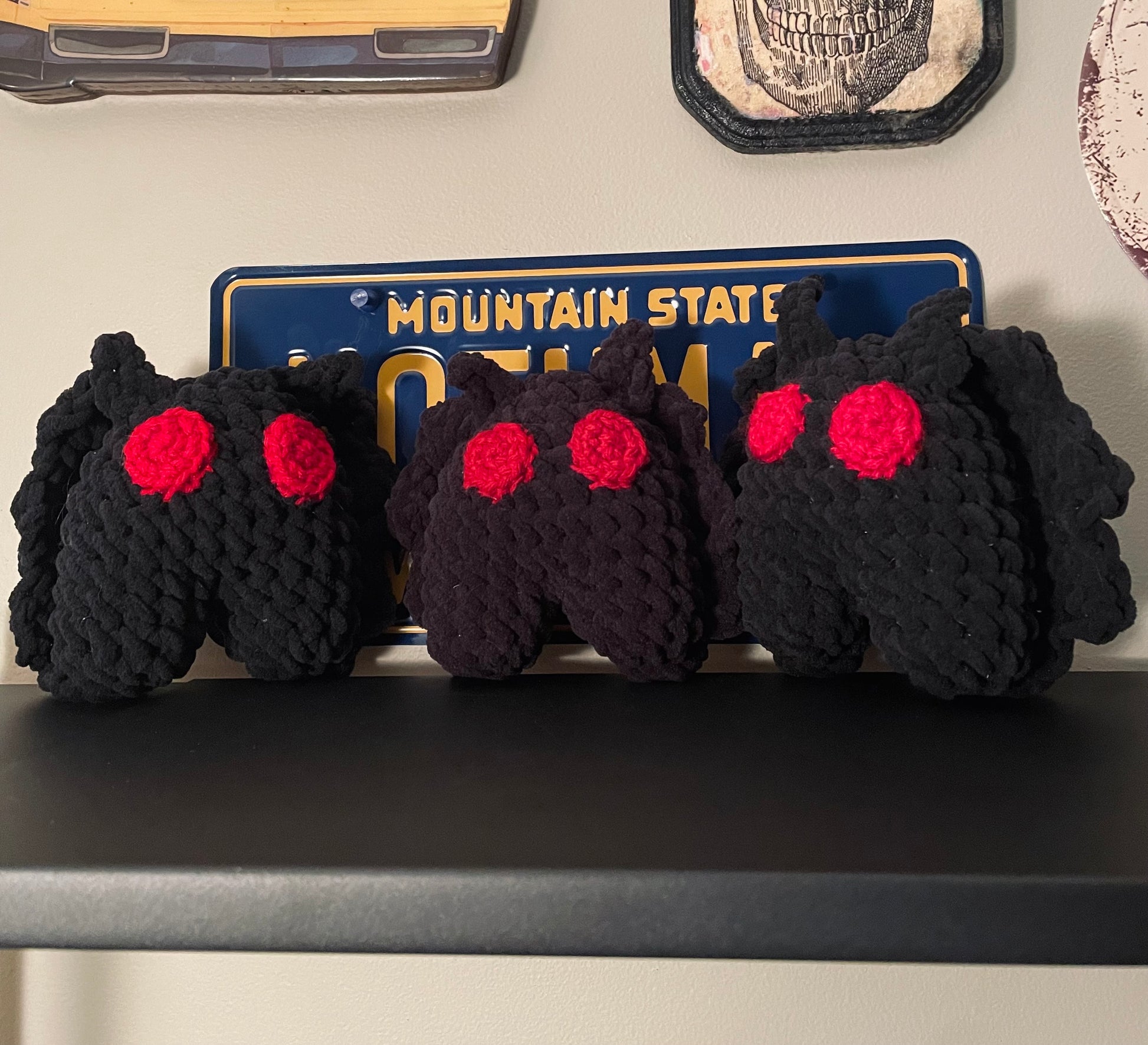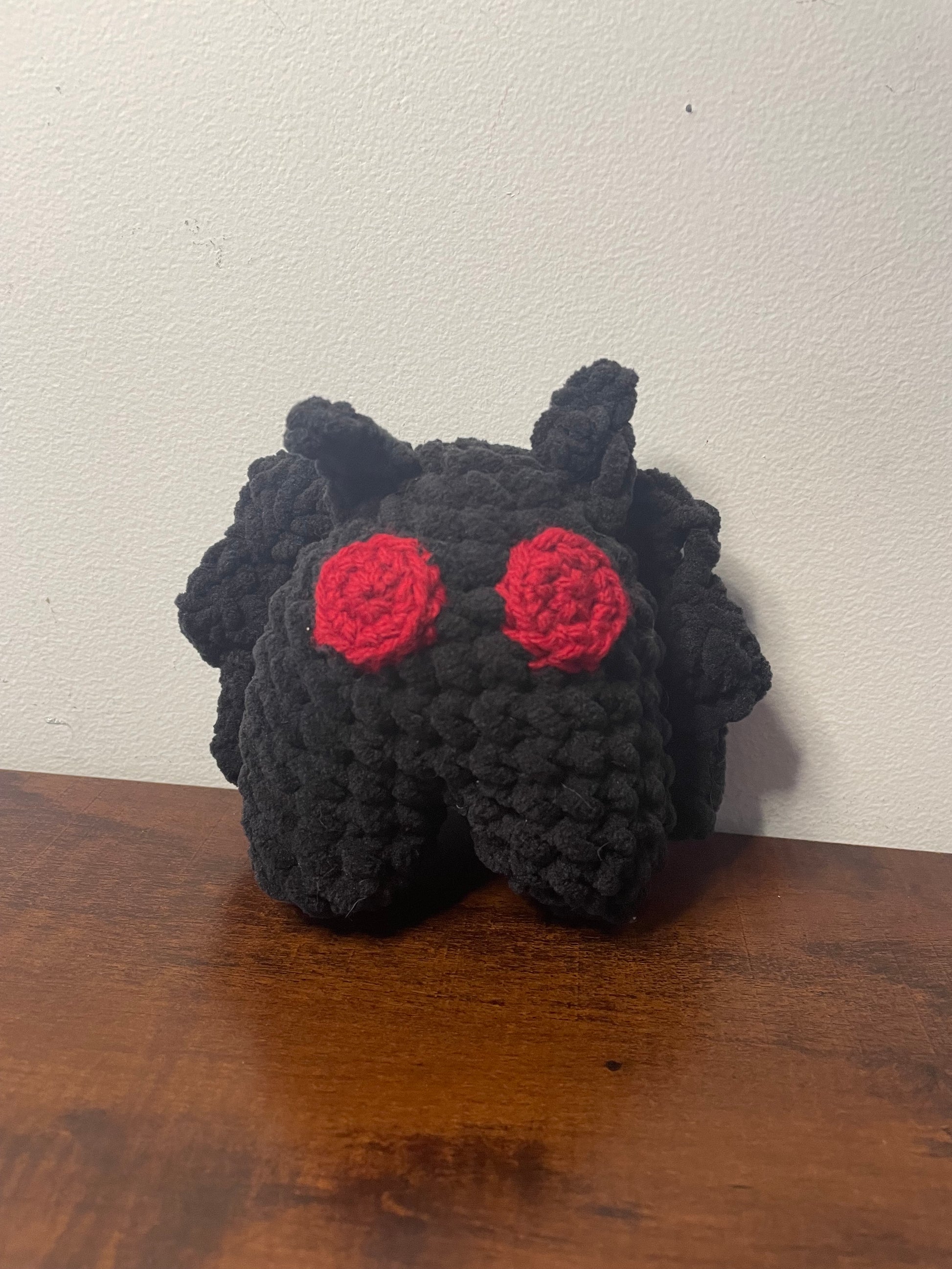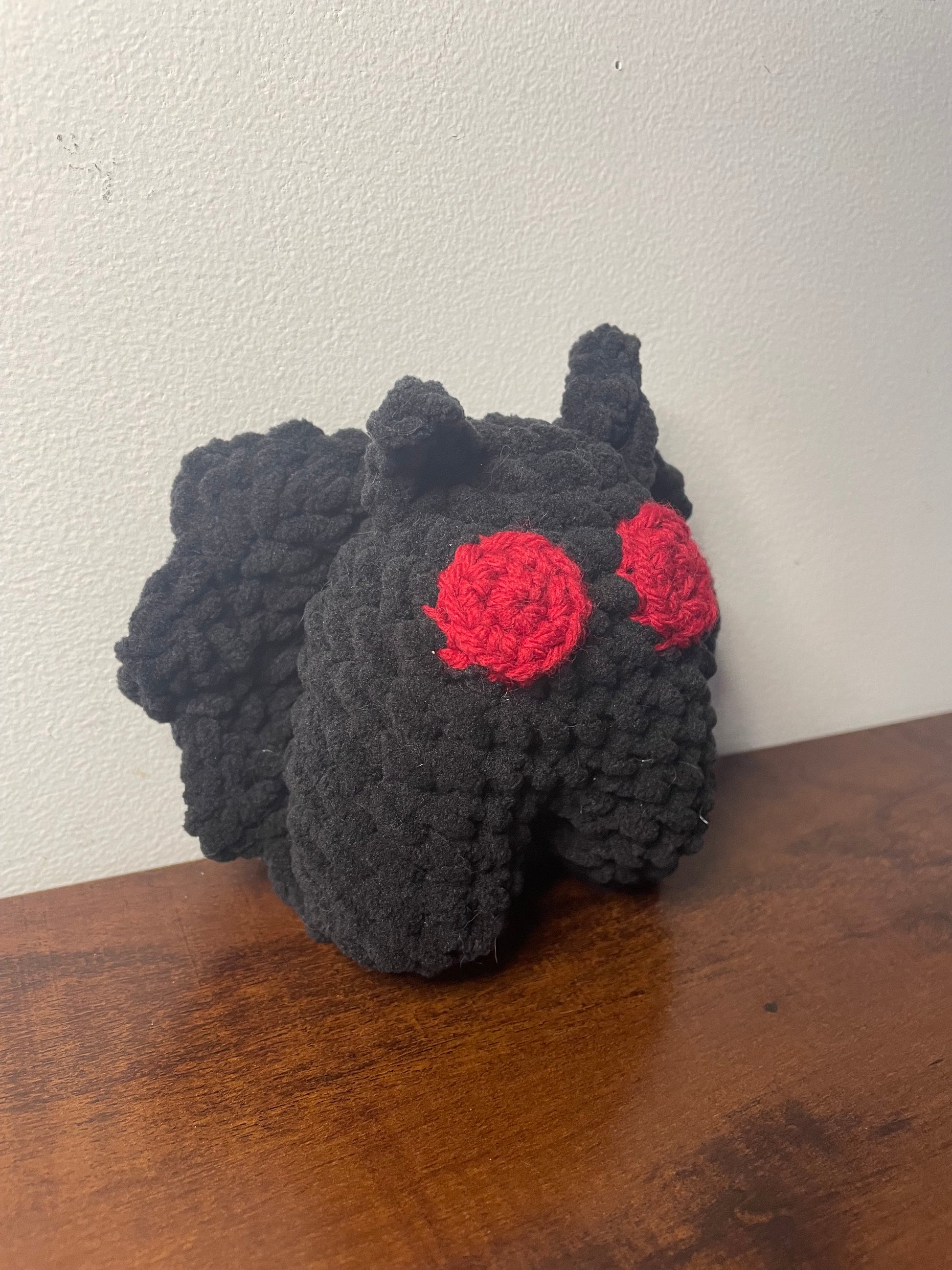 Handmade crochet Cuddly Mothman is made of soft black blanket yarn for main body and red acrylic for the eyes. He measures 6" tall and 7" across (from widest part of wings).