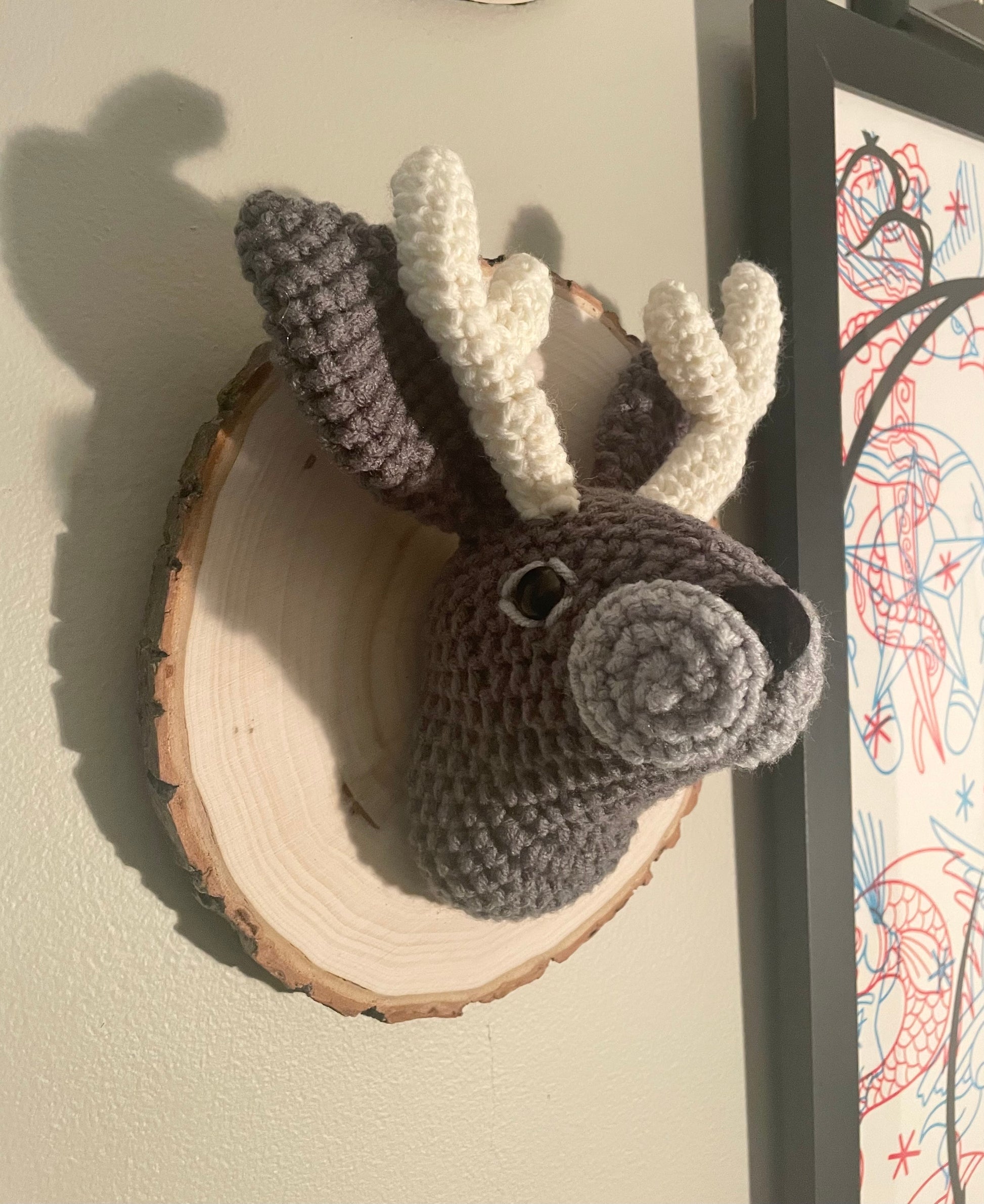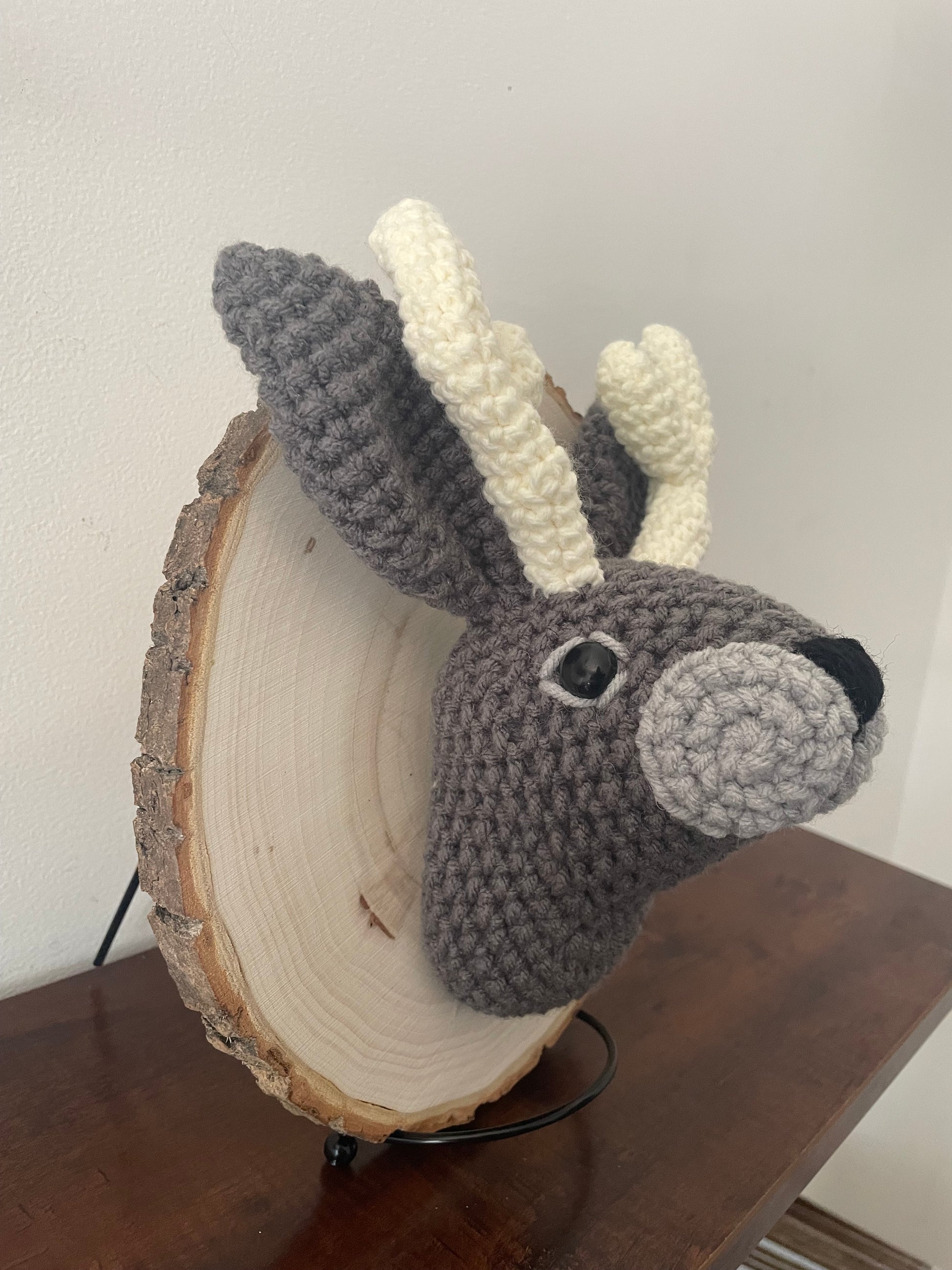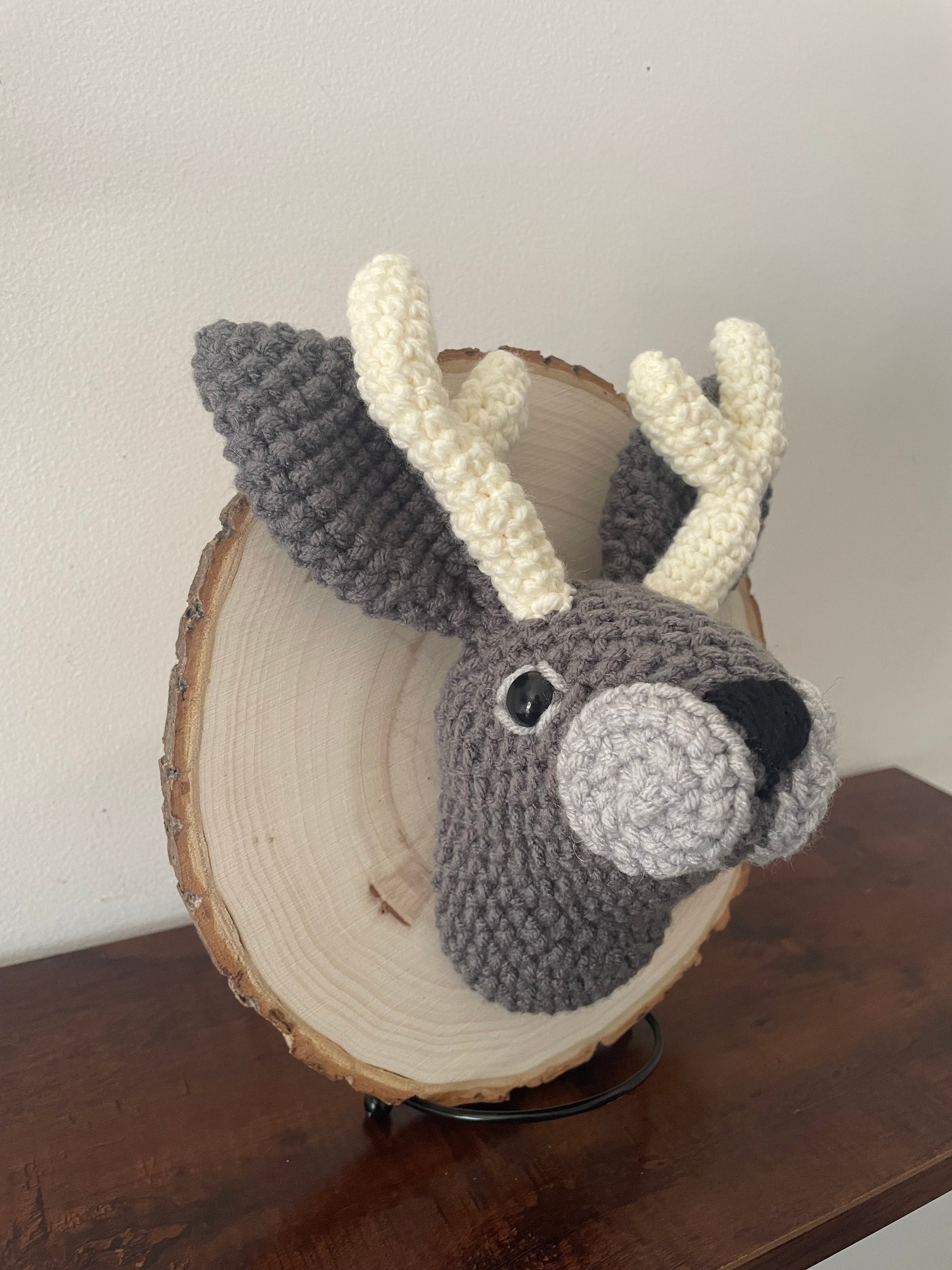 Handmade crochet jackalope is made of 100% acrylic yarn, and mounted on a rustic wood plaque. Metal hanger in the back to hang on a wall. Measures 9.5" tall, 8" across, and has a depth of 6".