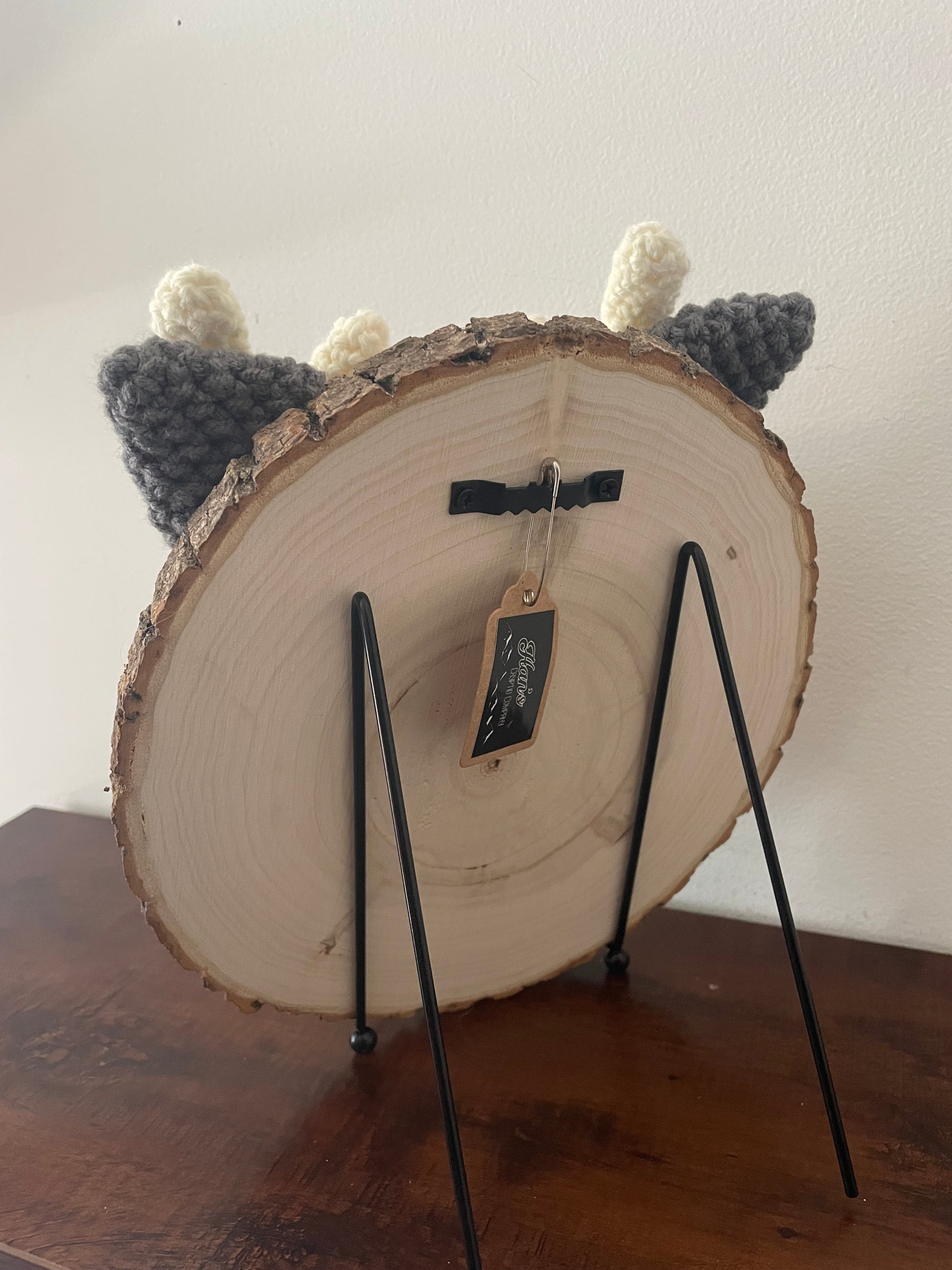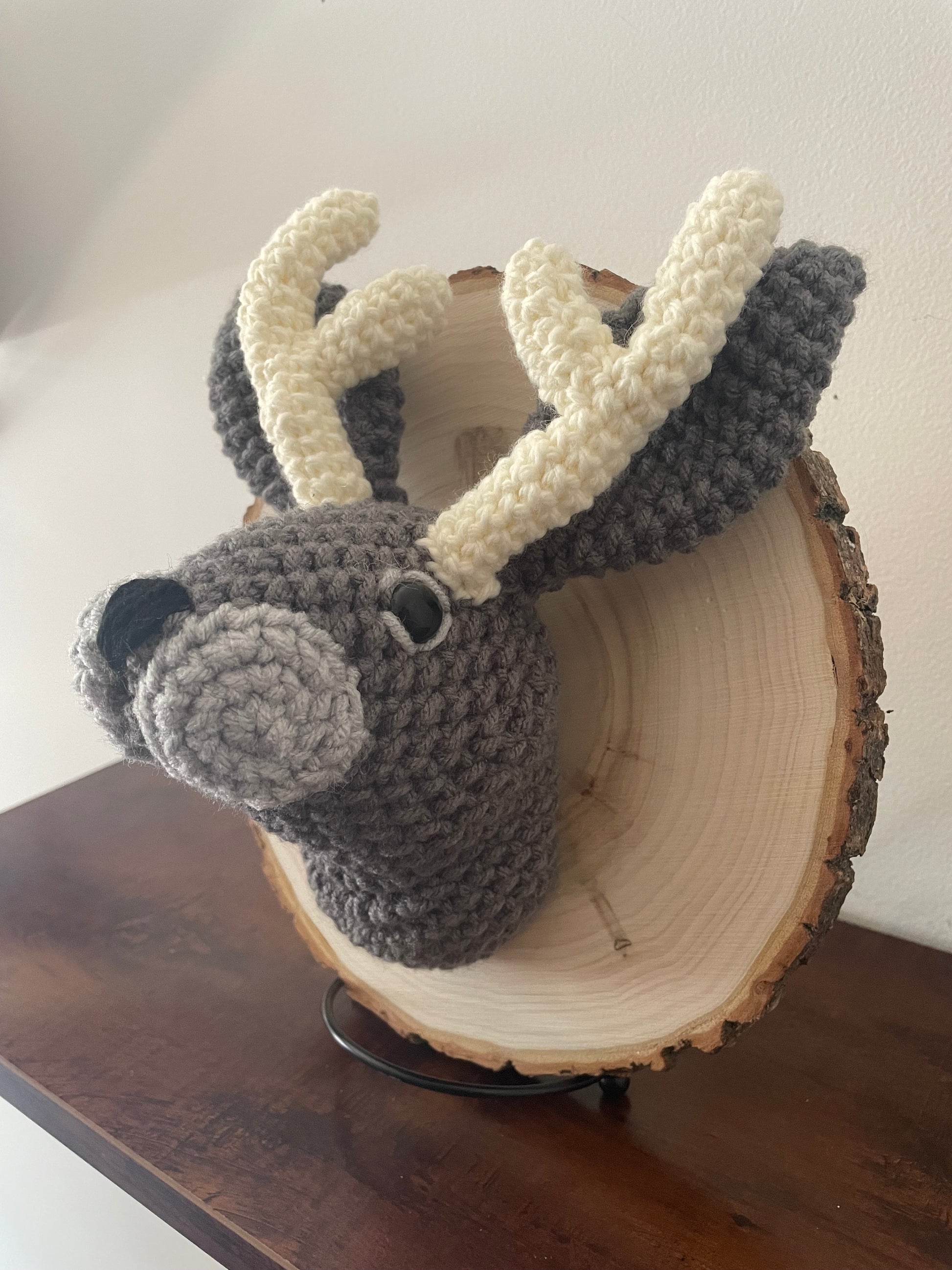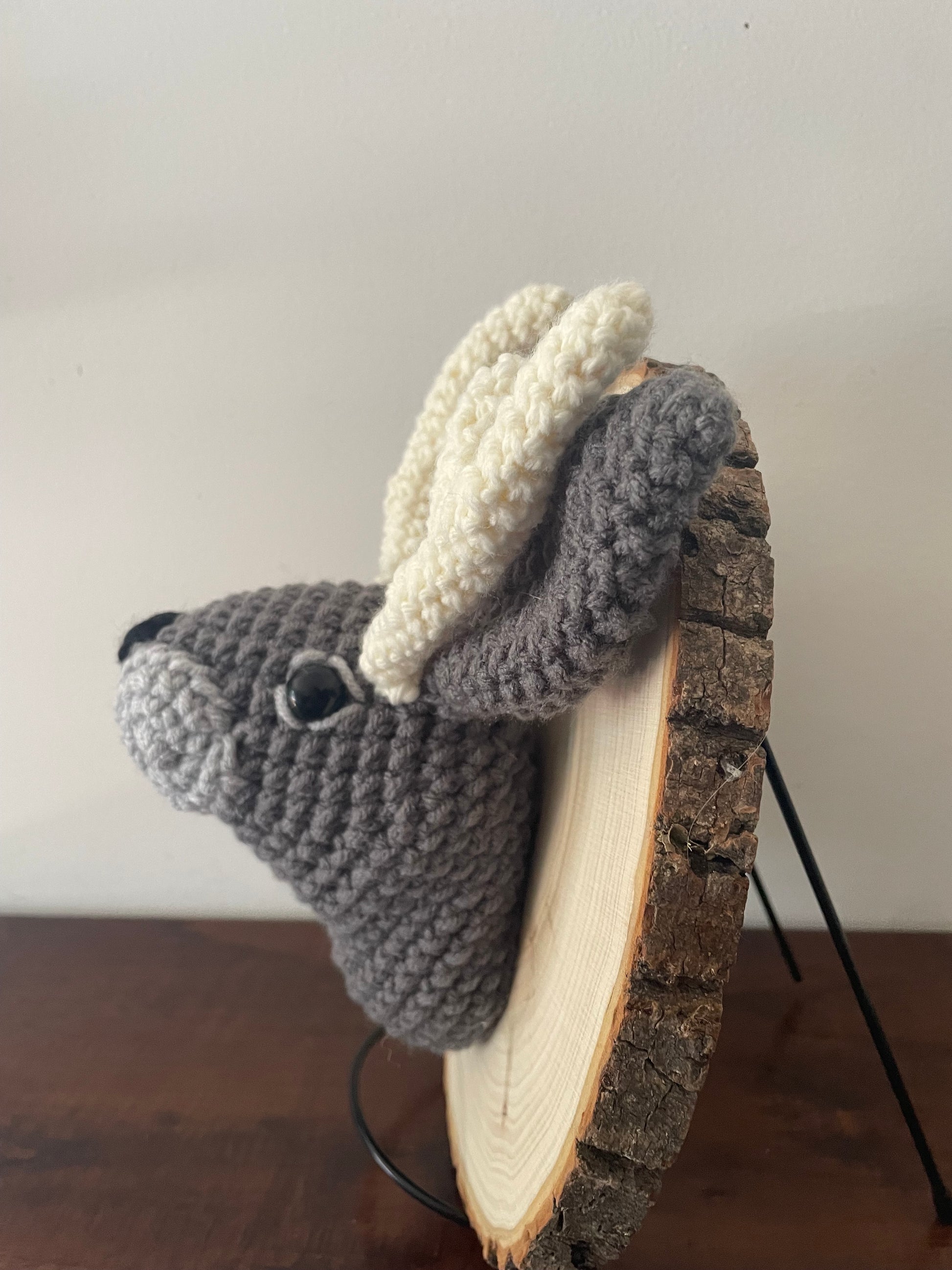 Handmade crochet jackalope is made of 100% acrylic yarn, and mounted on a rustic wood plaque. Metal hanger in the back to hang on a wall. Measures 9.5" tall, 8" across, and has a depth of 6".