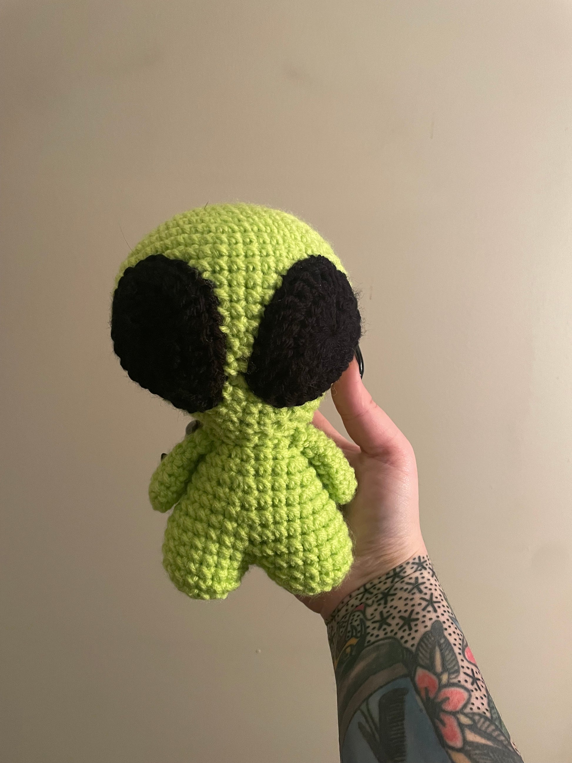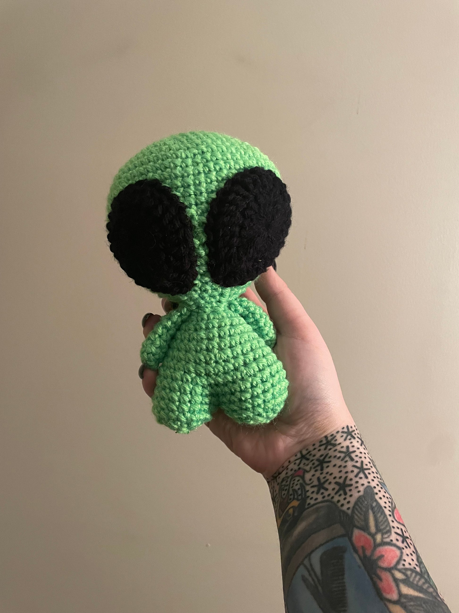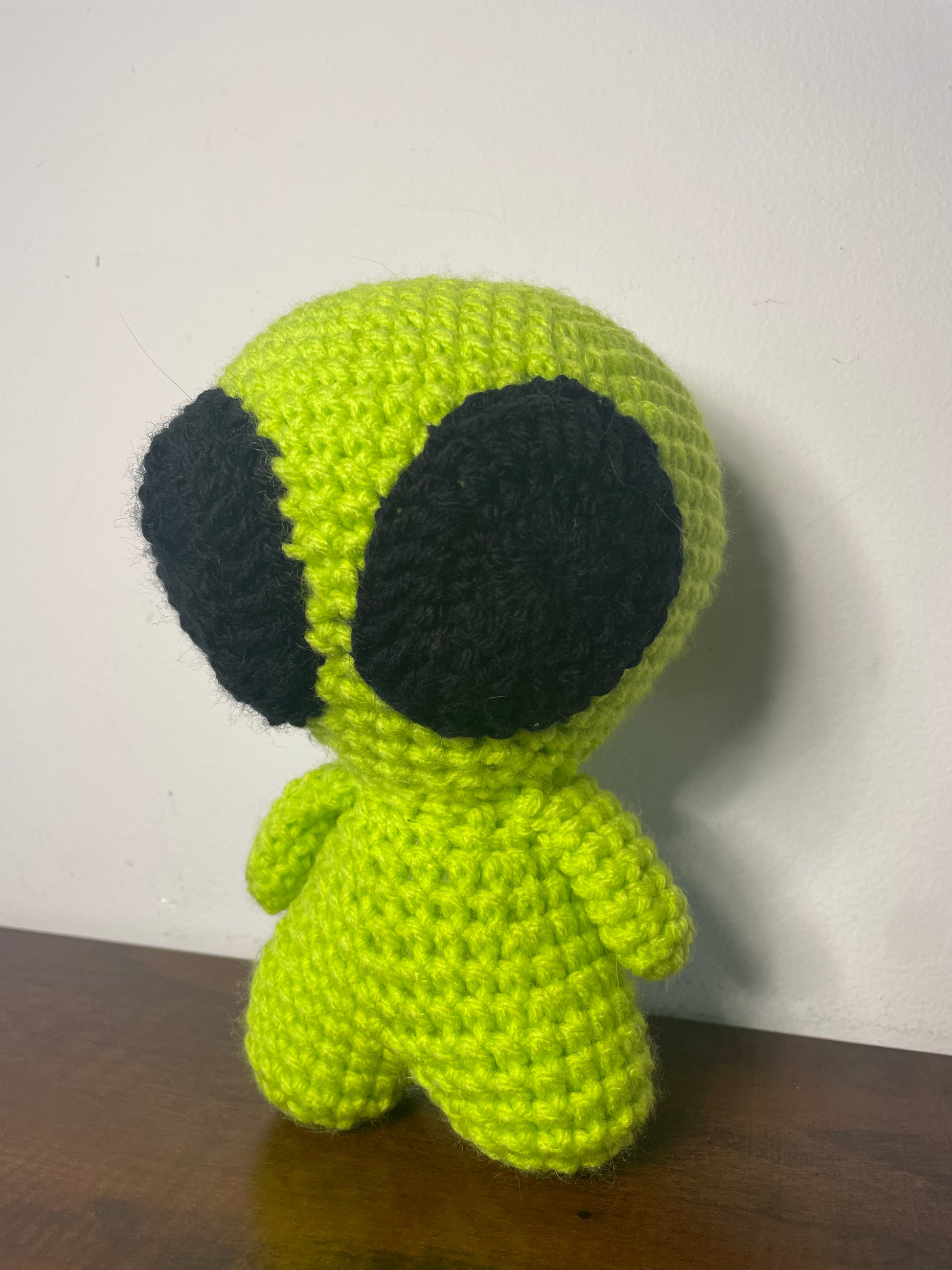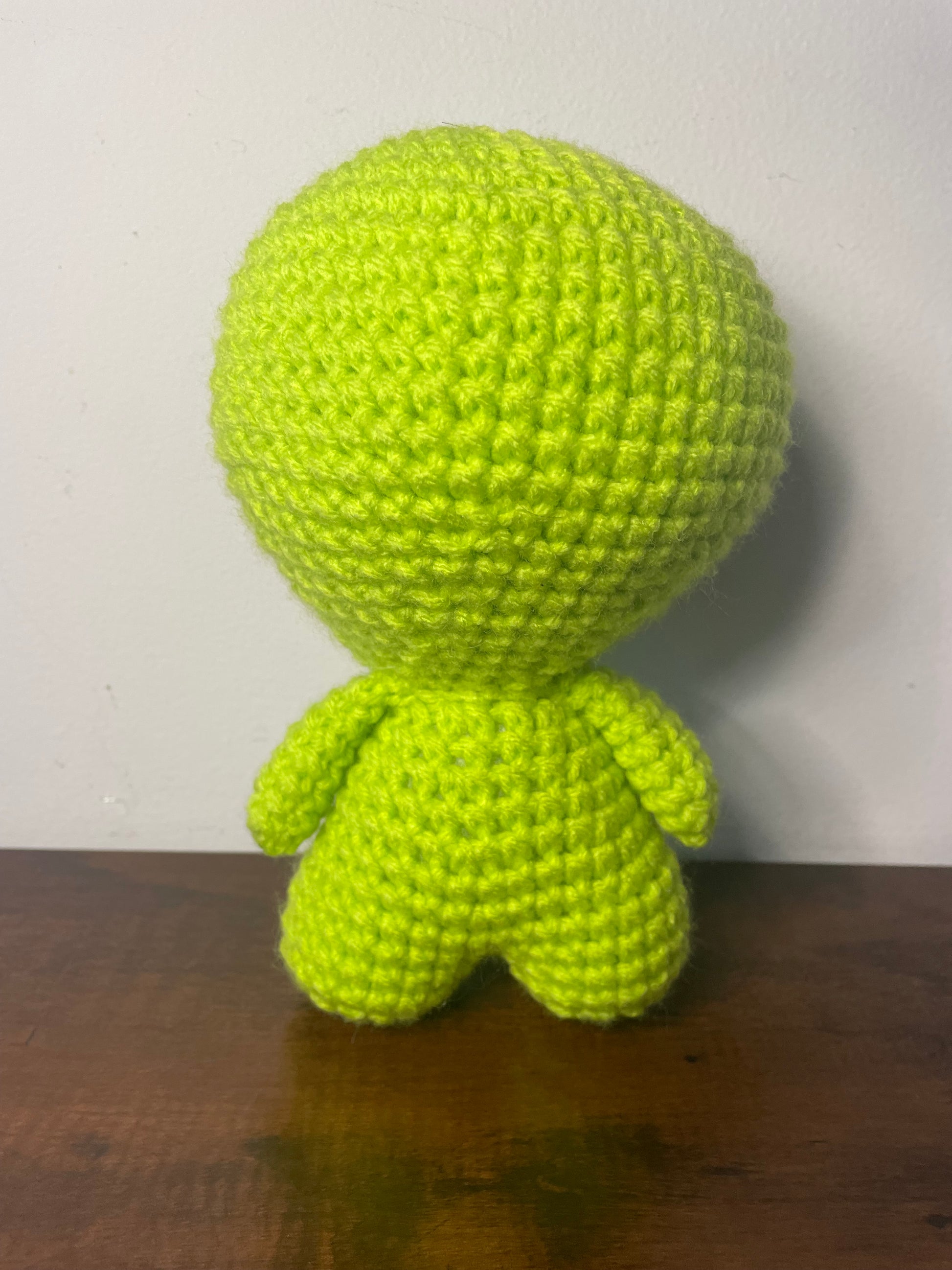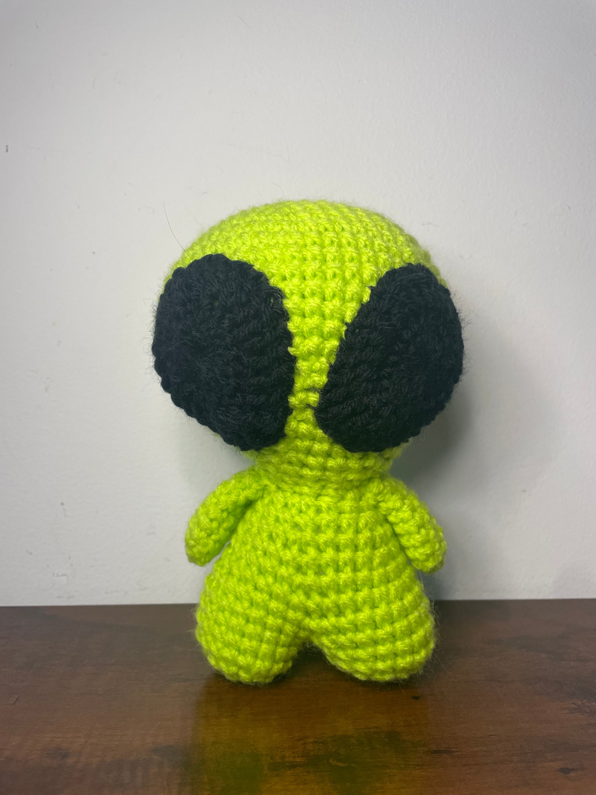 Handmade crochet alien is made of 100% acrylic yarn. It measures approx. 7" tall and 5" wide (from arm to arm). Measurements may vary slightly due to the handmade nature of the product and variations in yarn weight.