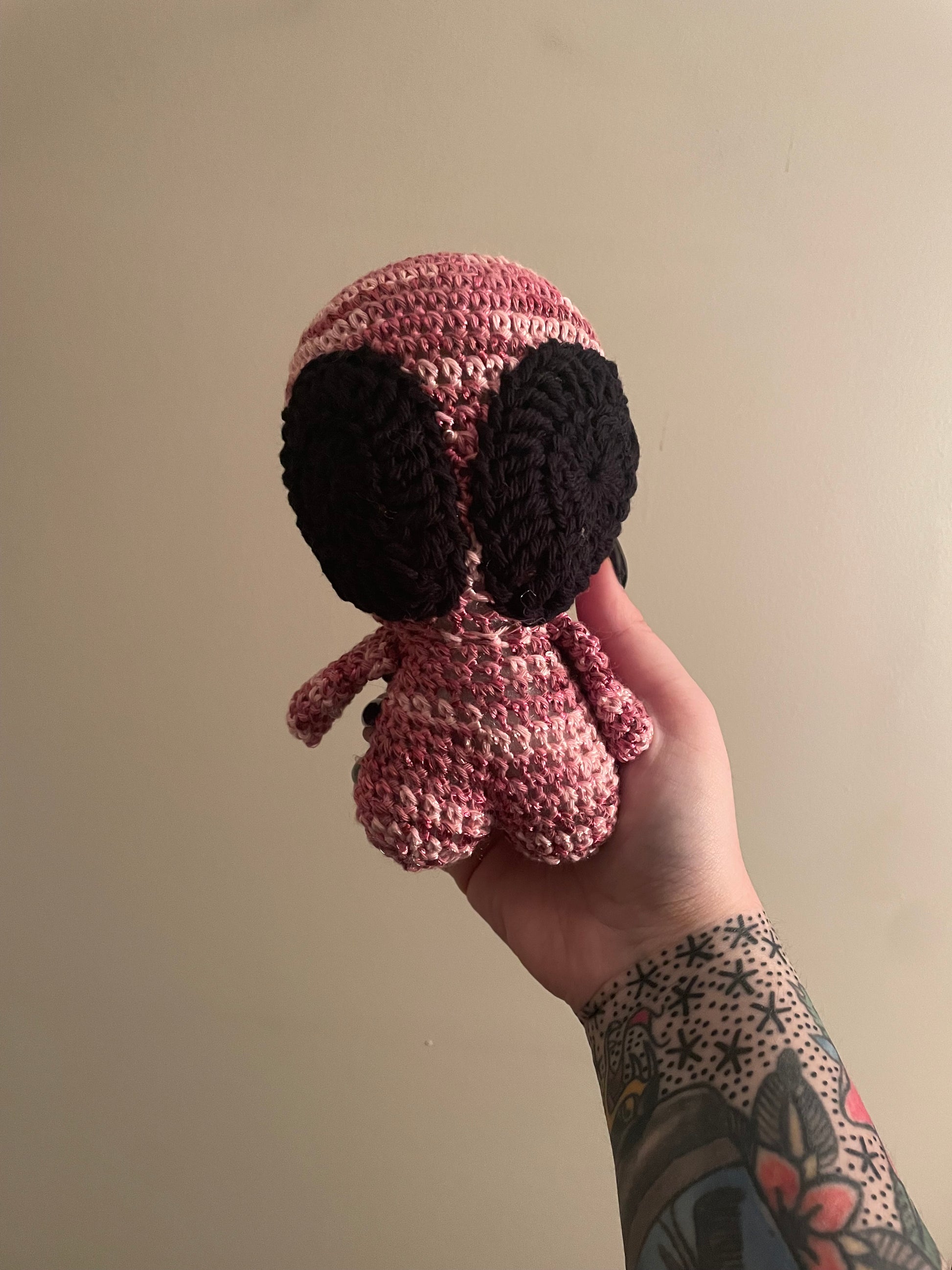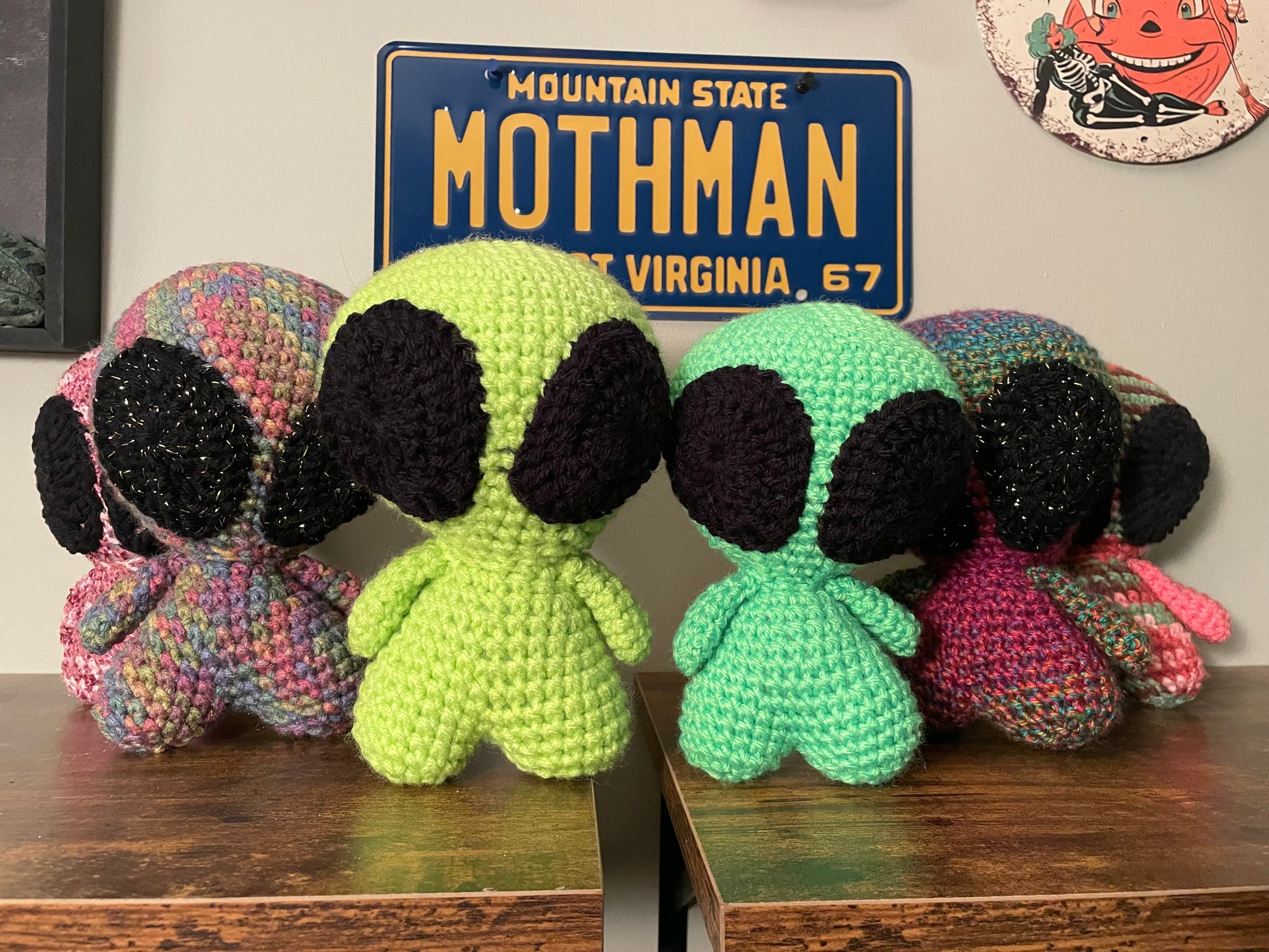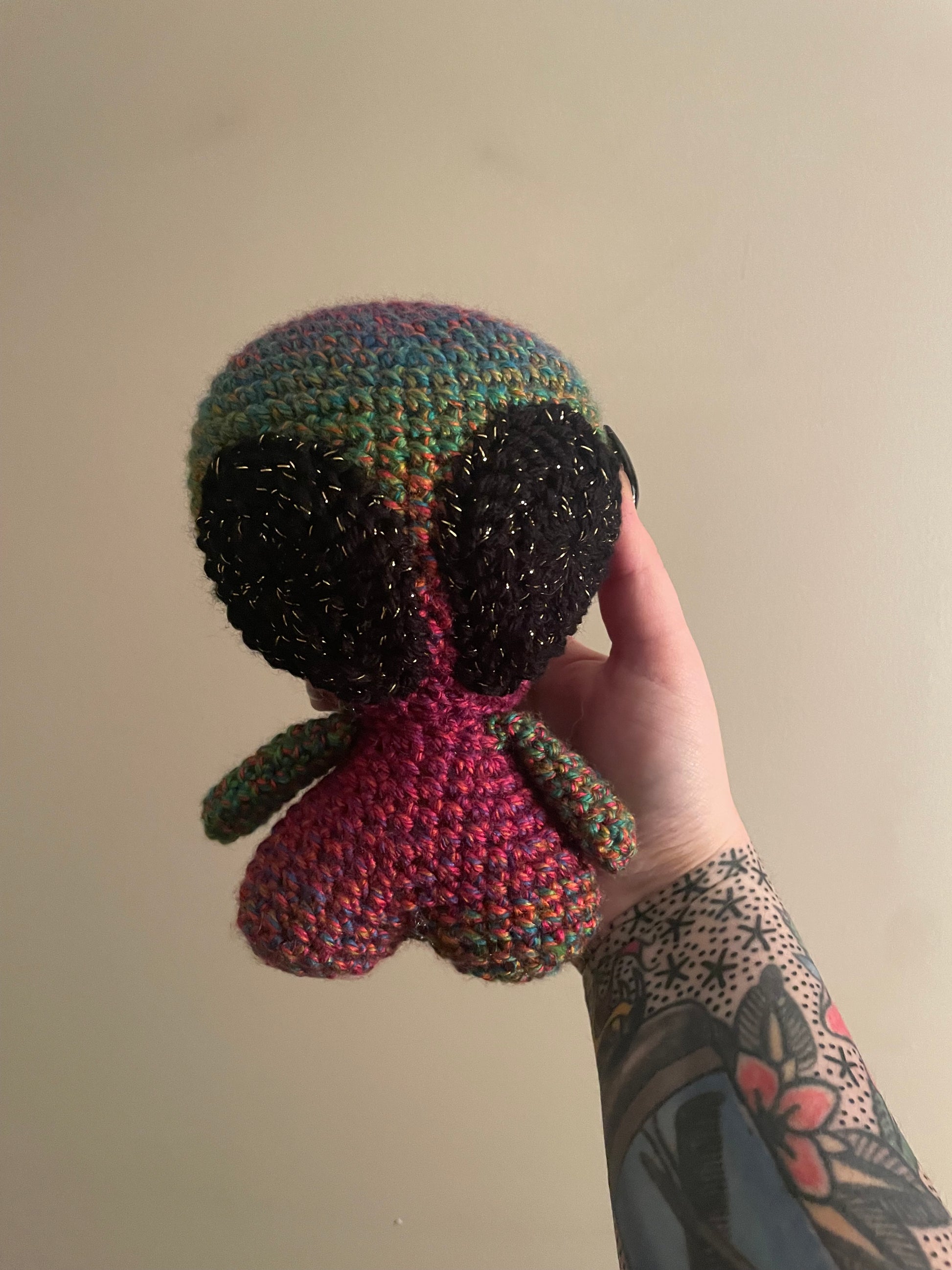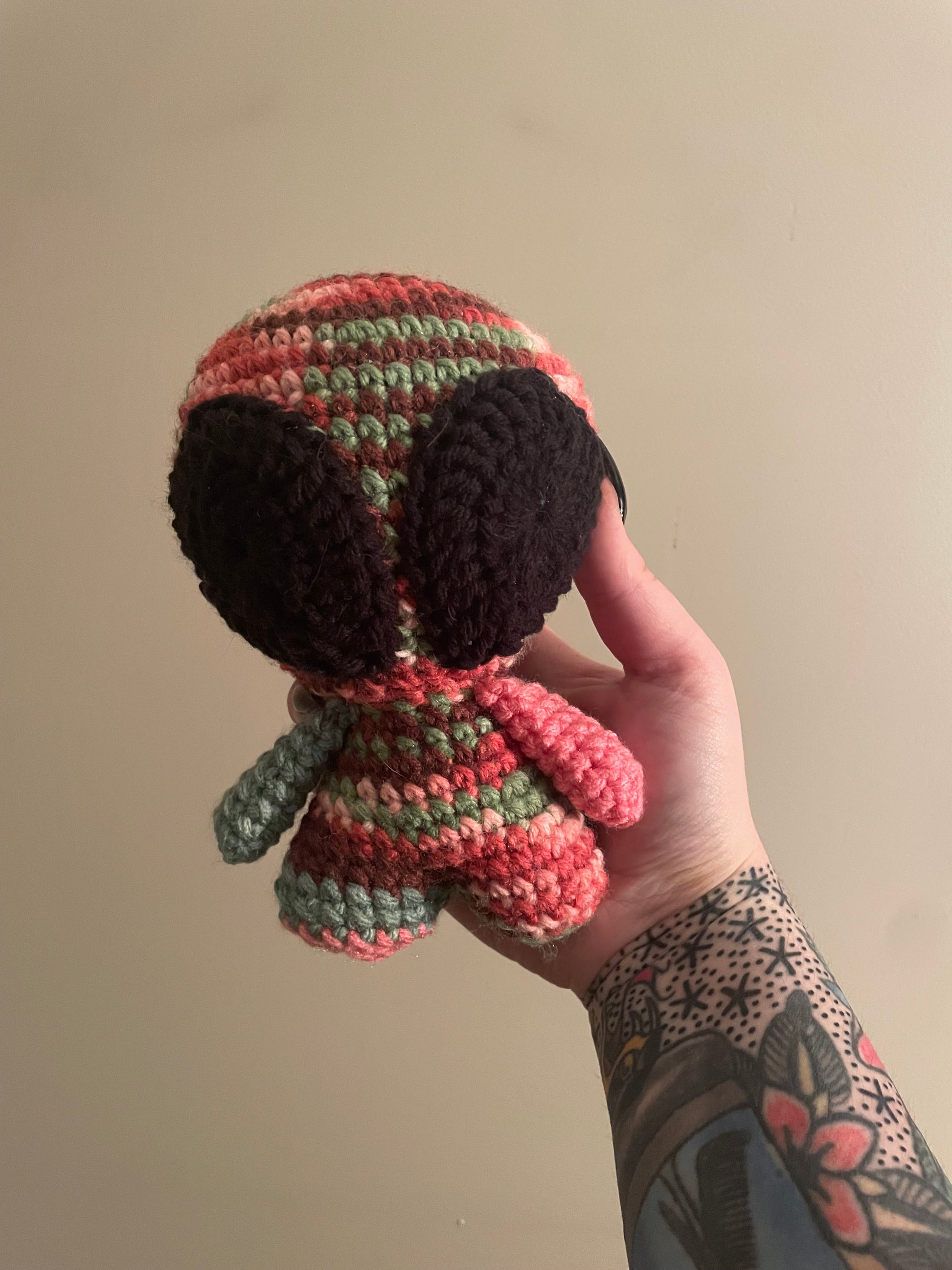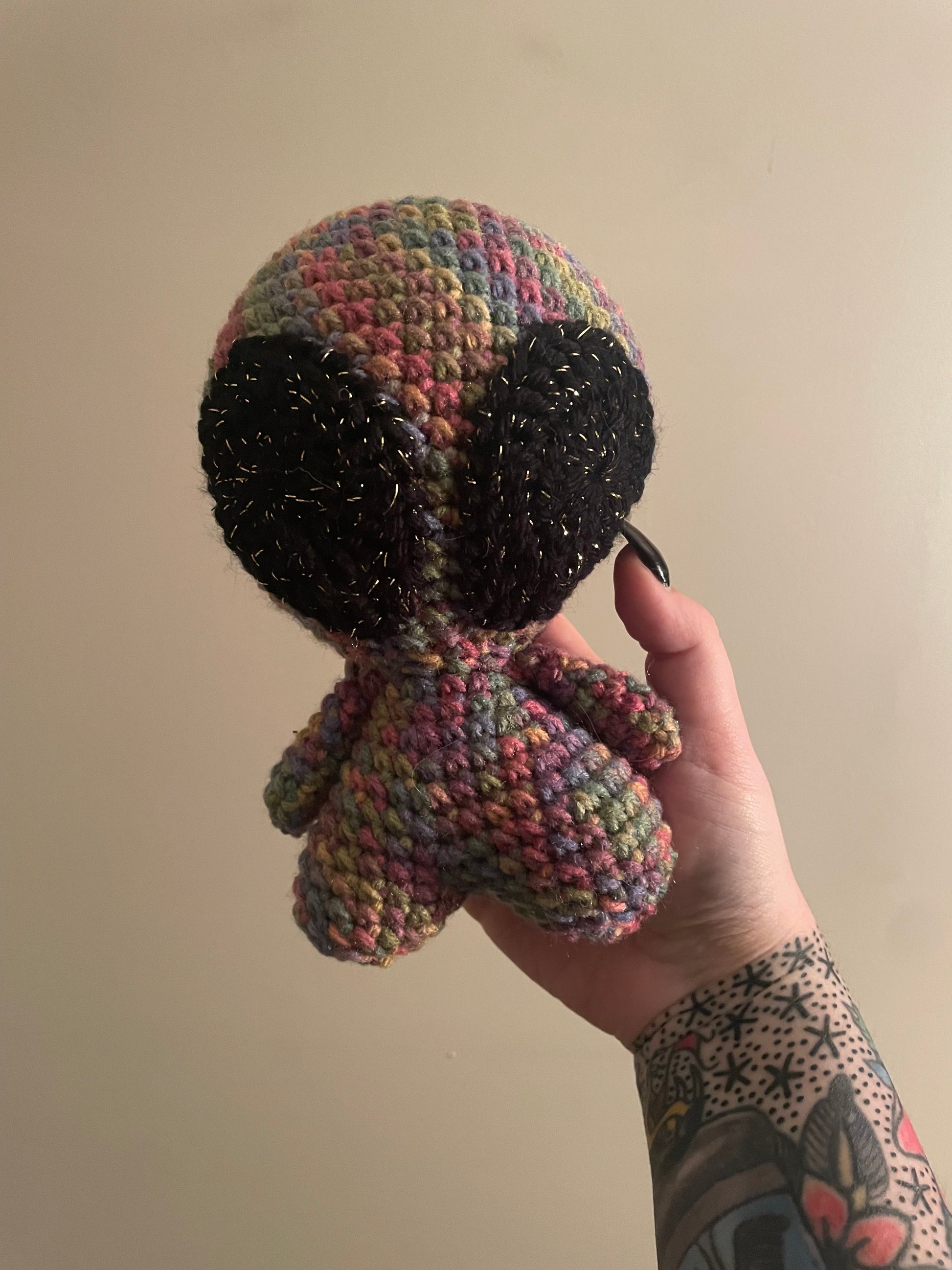 Handmade crochet alien is made of 100% acrylic yarn. It measures approx. 7" tall and 5" wide (from arm to arm). Measurements may vary slightly due to the handmade nature of the product and variations in yarn weight.