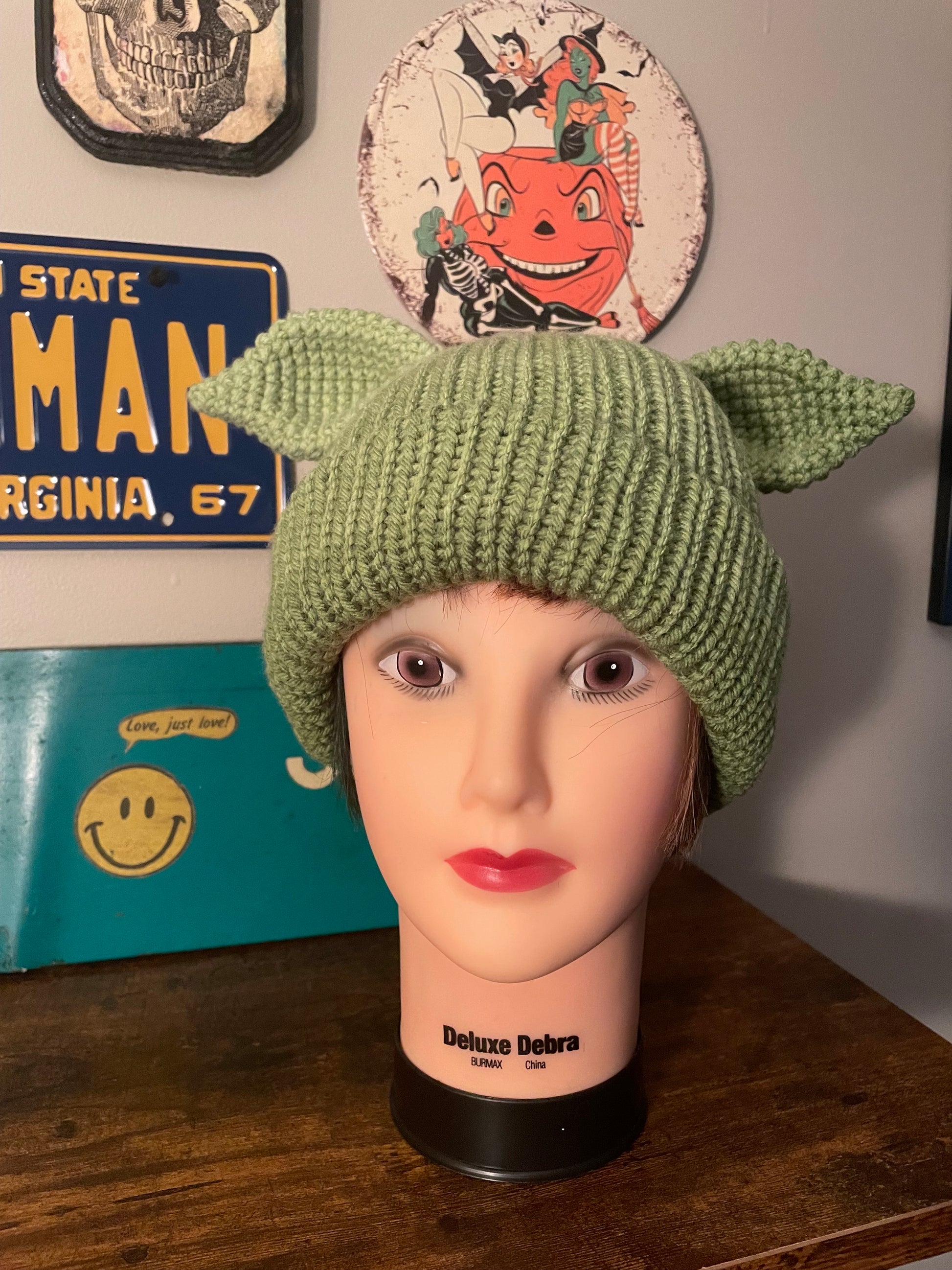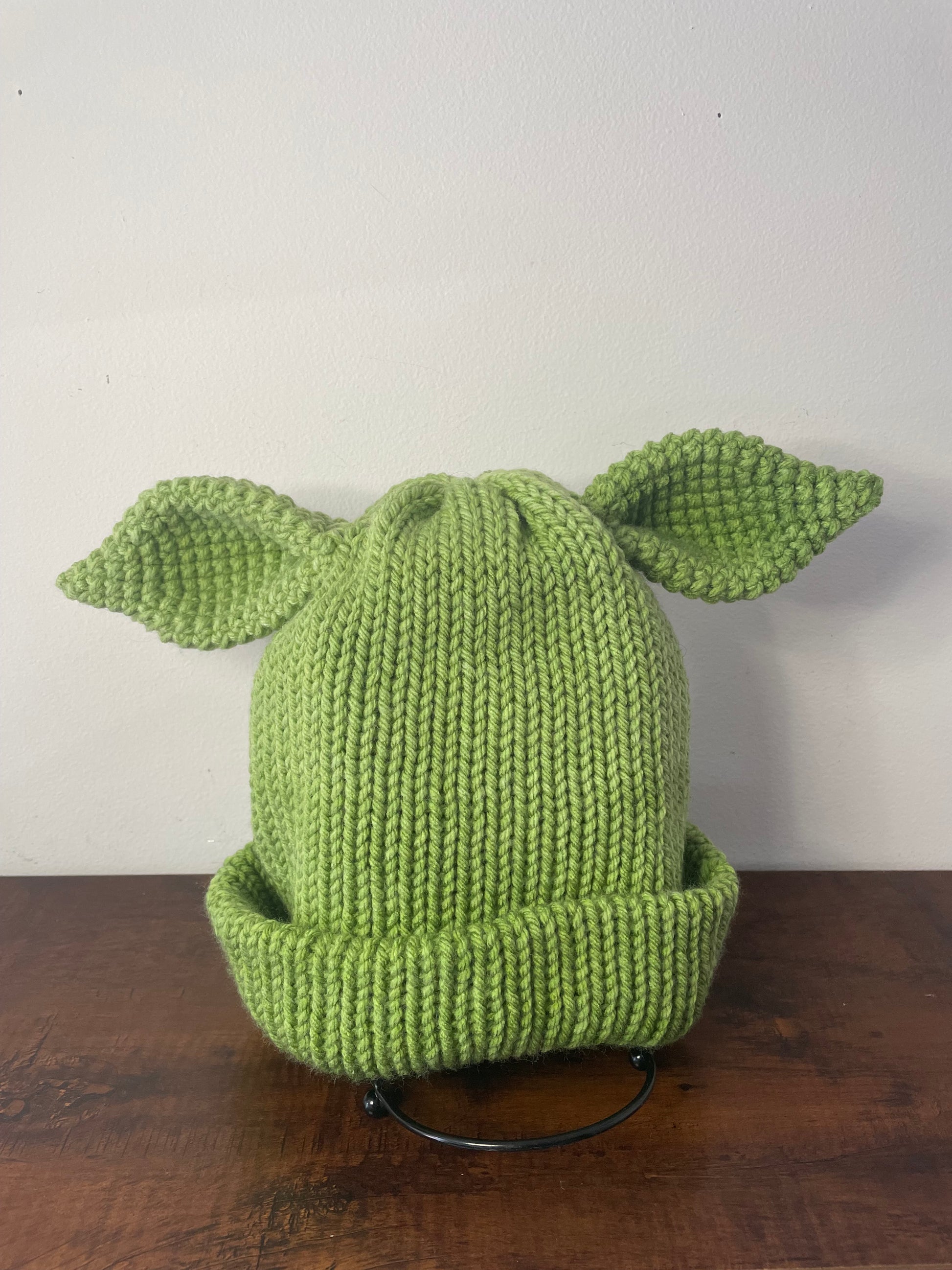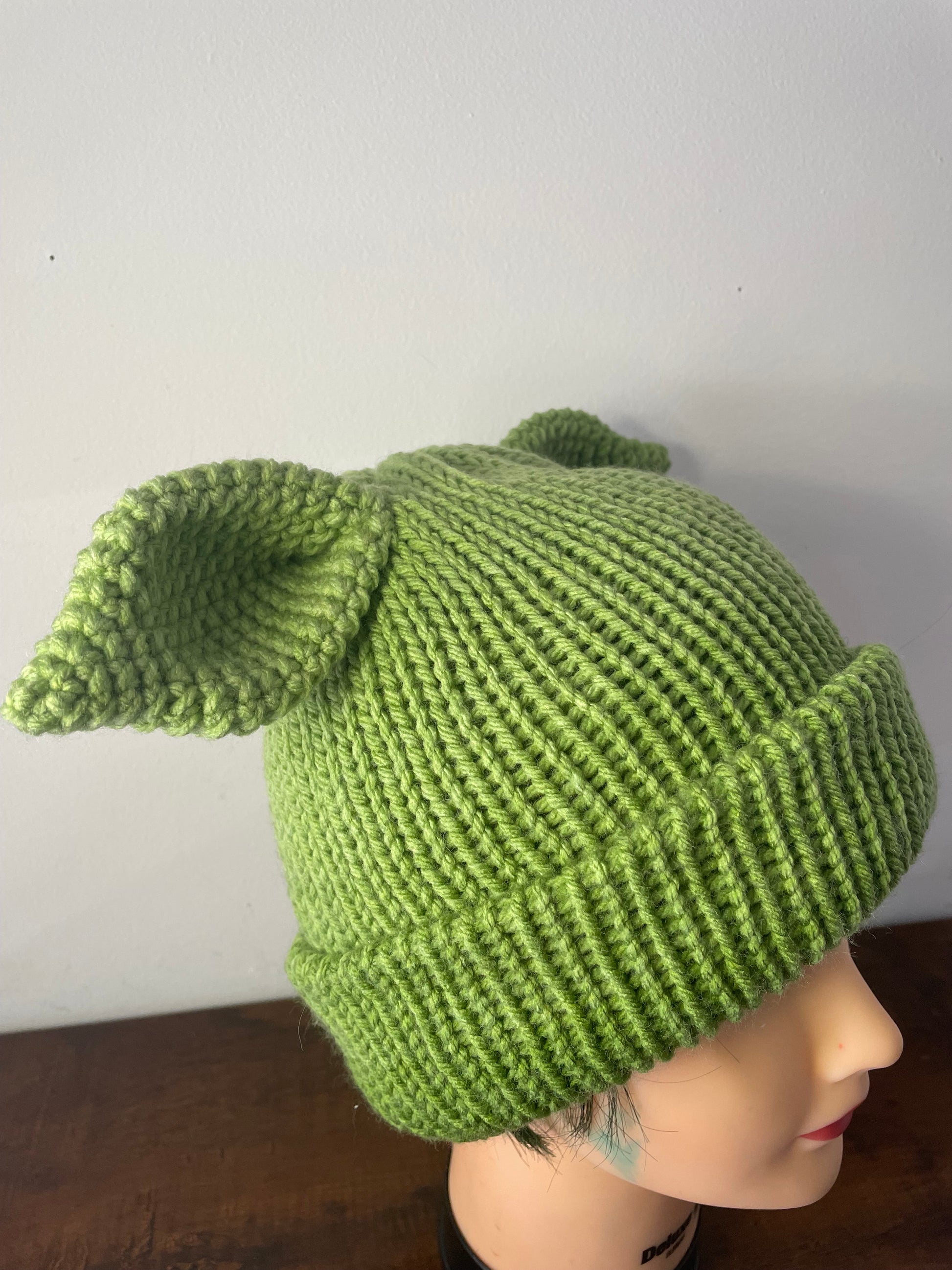Green goblin hat is machine-knit by hand and 100% acrylic. Ears crocheted with acrylic. Fits standard adult sizes.