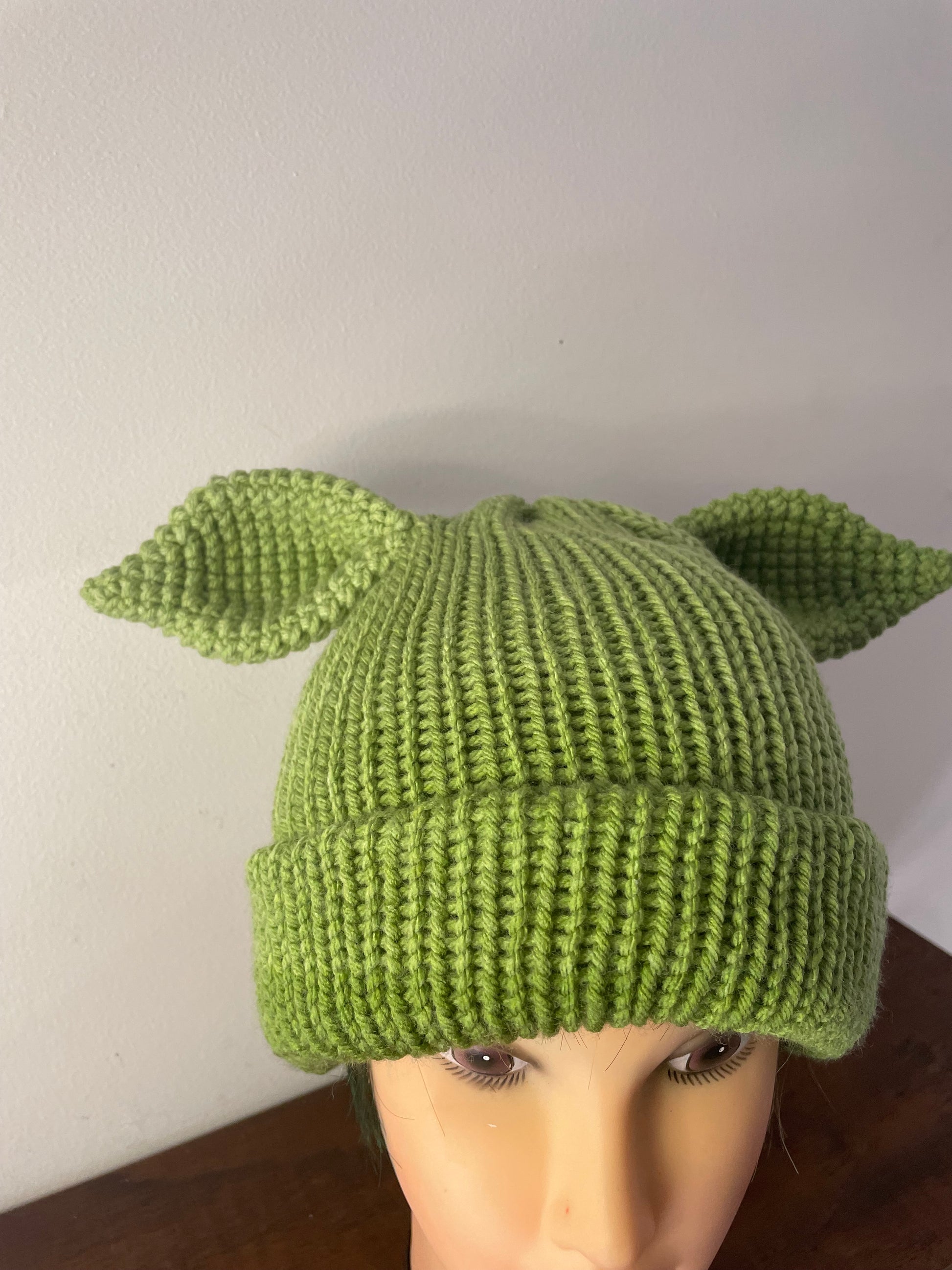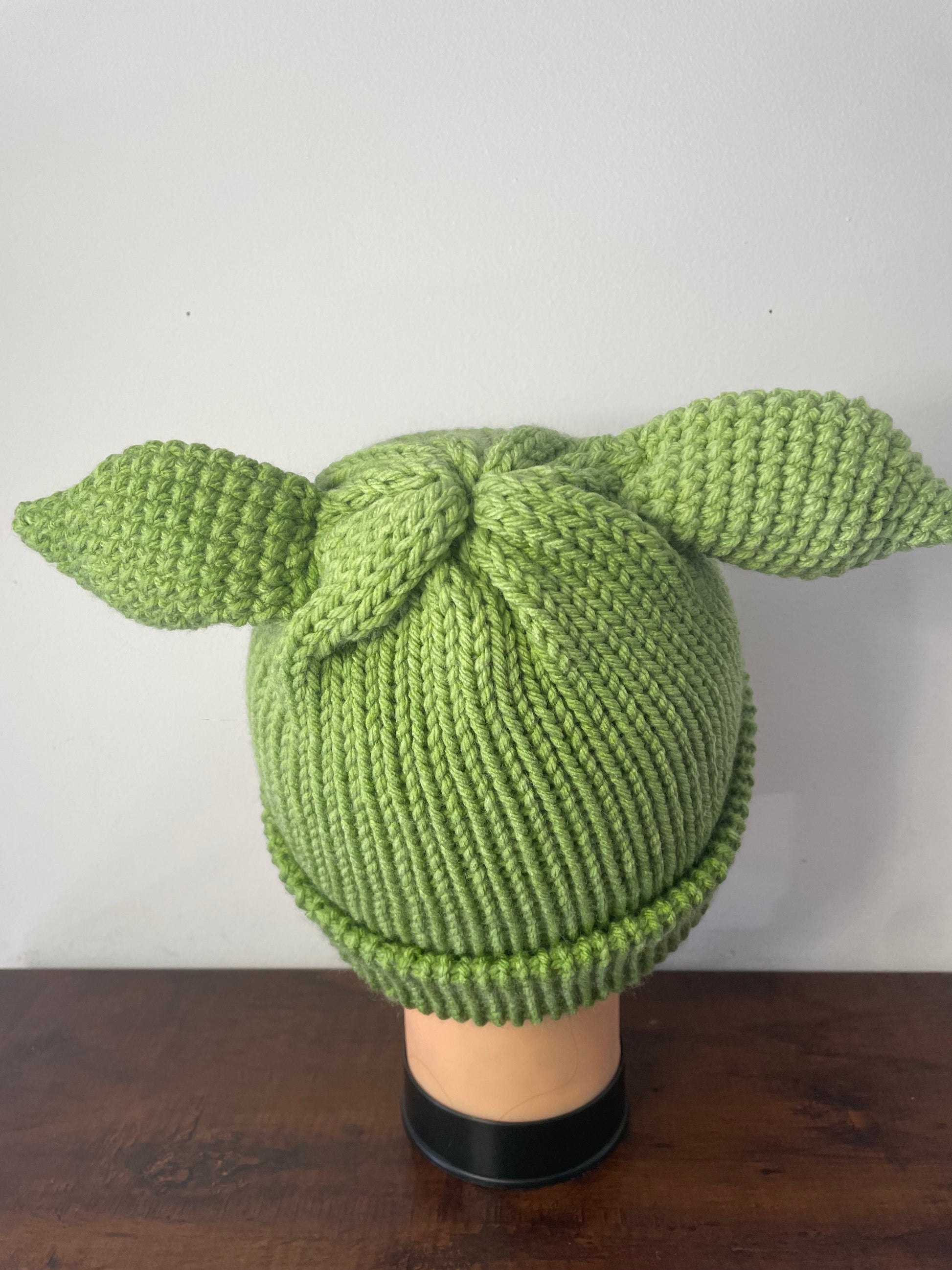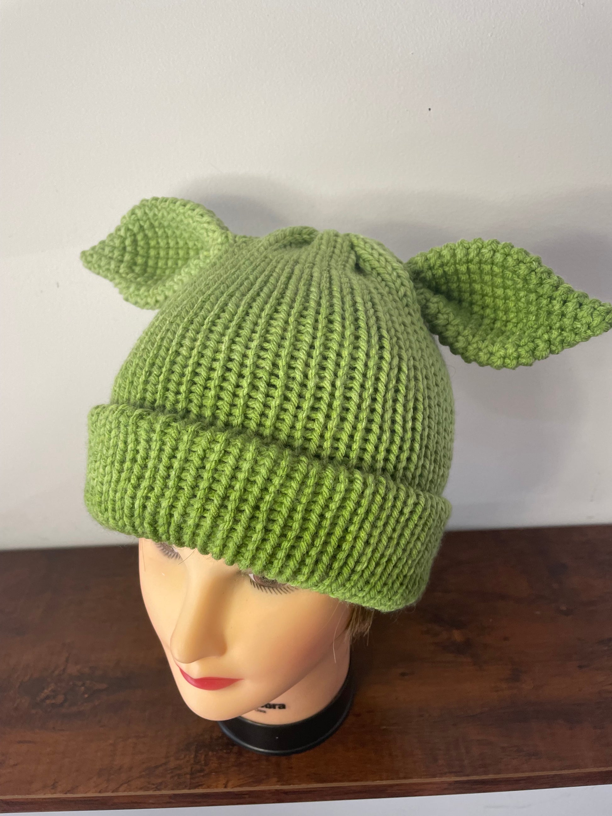 Green goblin hat is machine-knit by hand and 100% acrylic. Ears crocheted with acrylic. Fits standard adult sizes.