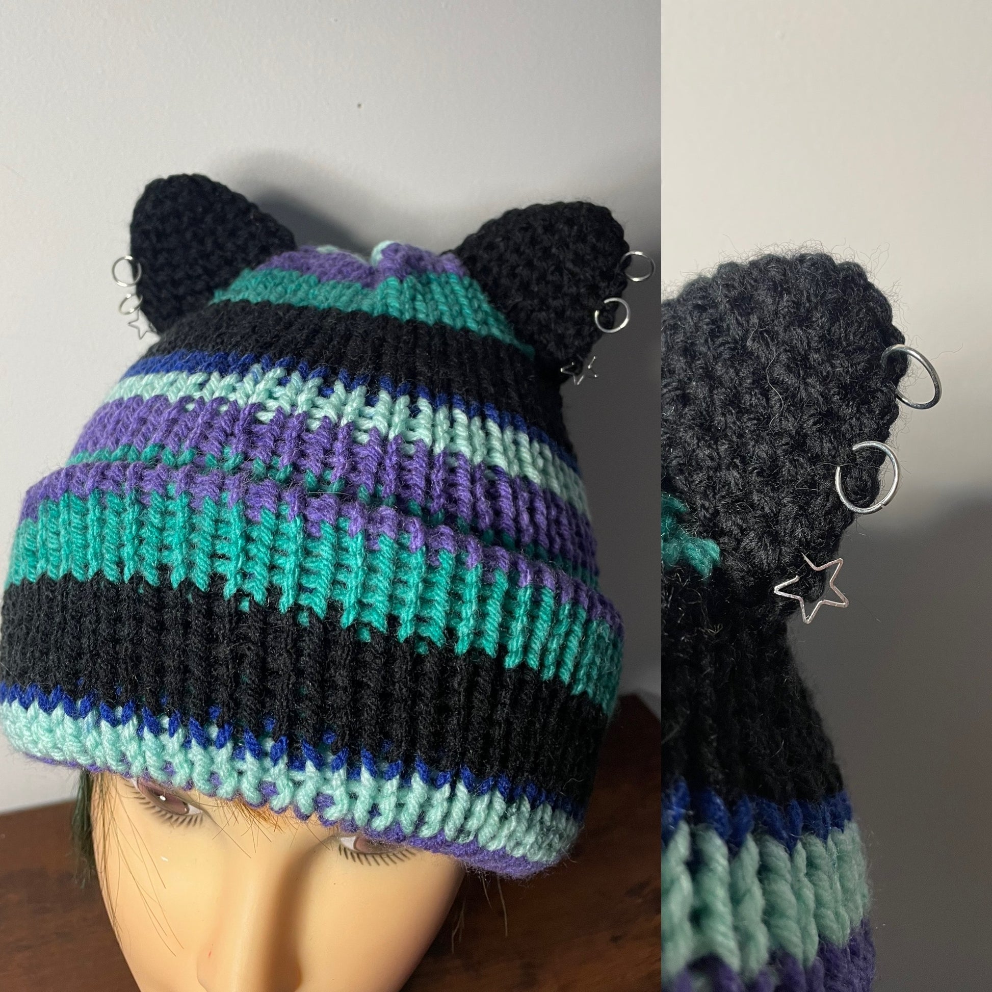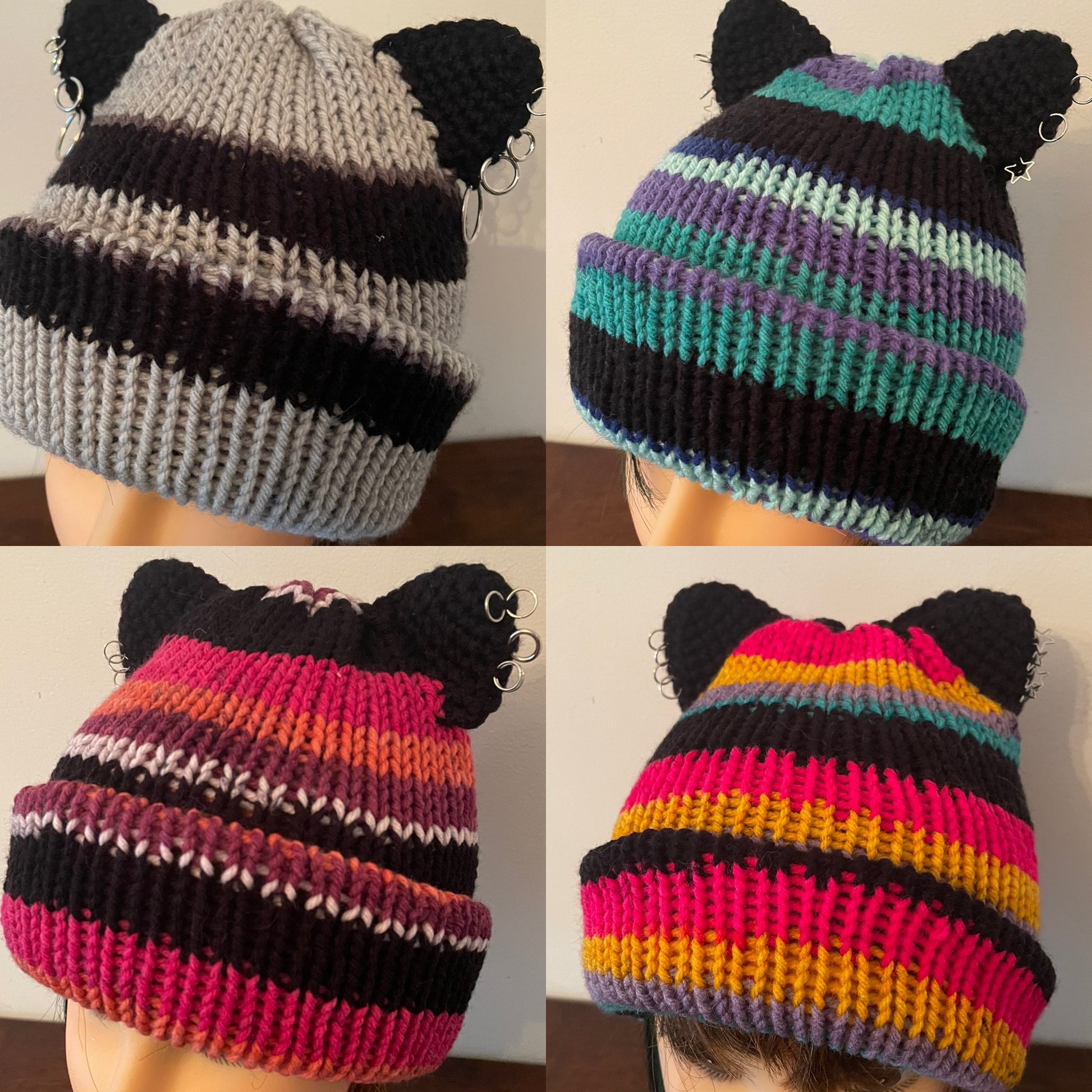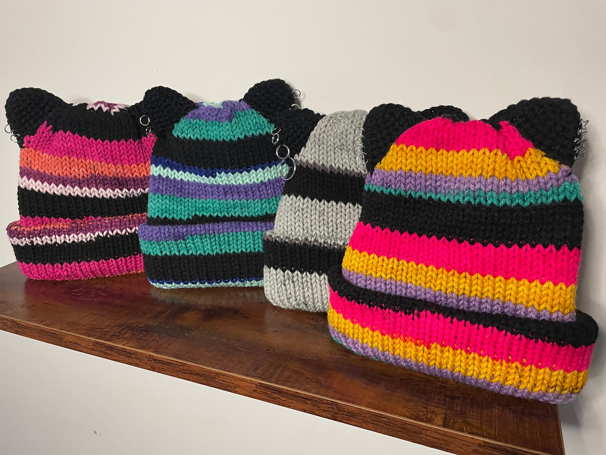 Punk kitty beanies are machine-knit by hand and 100% acrylic. Ears are crocheted with acrylic and have metal piercings. Fits standard adult sizes.