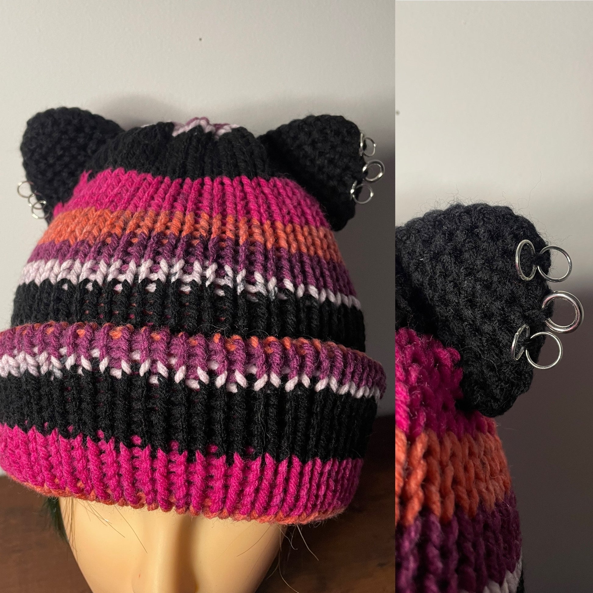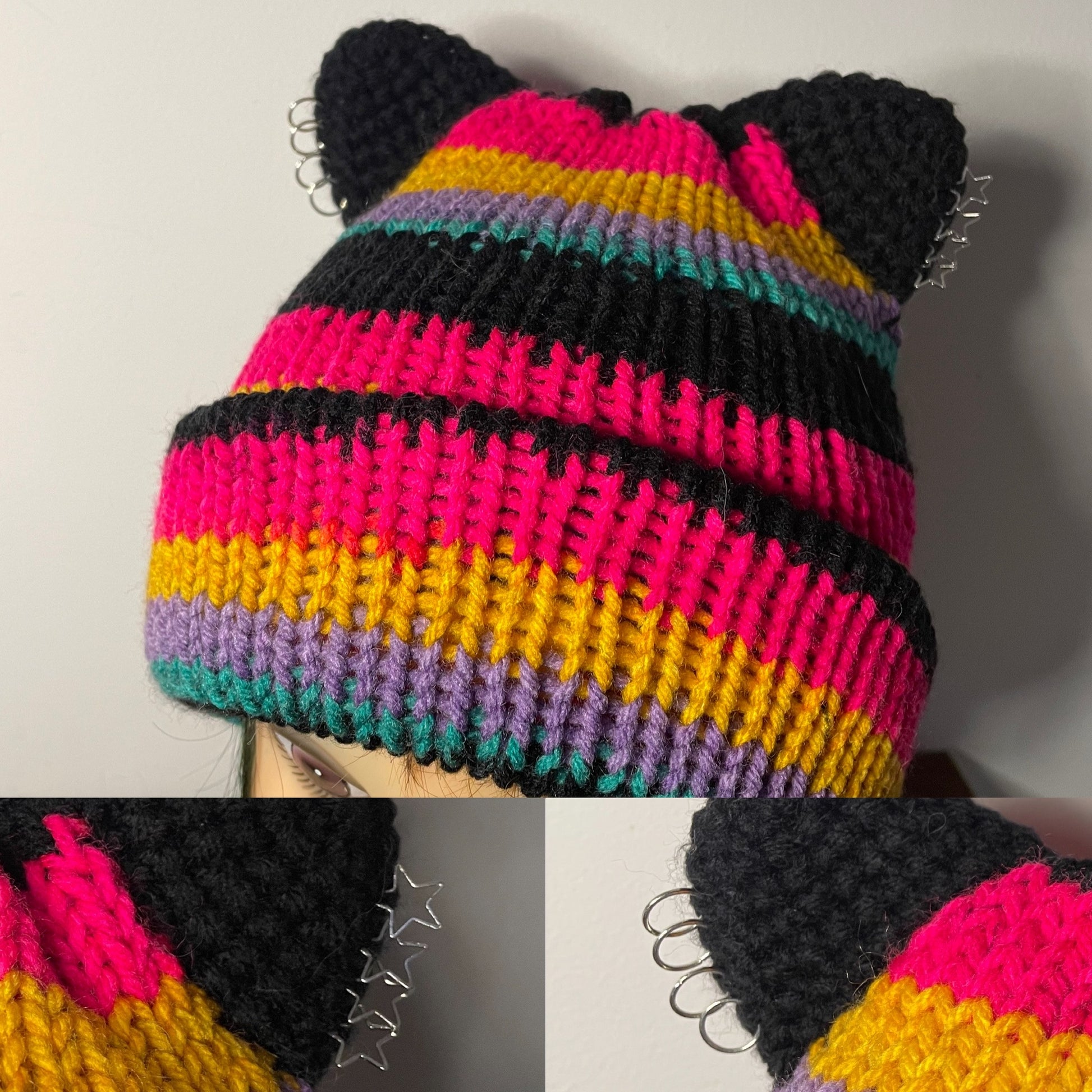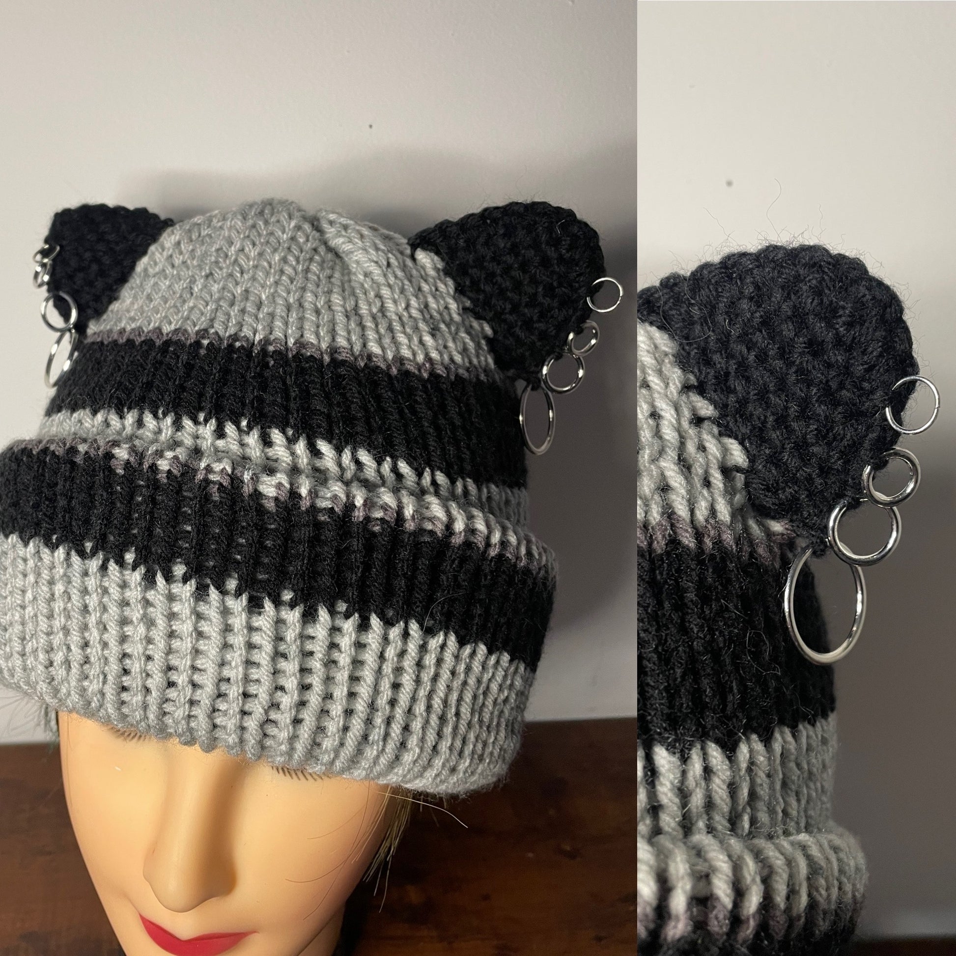 Punk kitty beanies are machine-knit by hand and 100% acrylic. Ears are crocheted with acrylic and have metal piercings. Fits standard adult sizes.