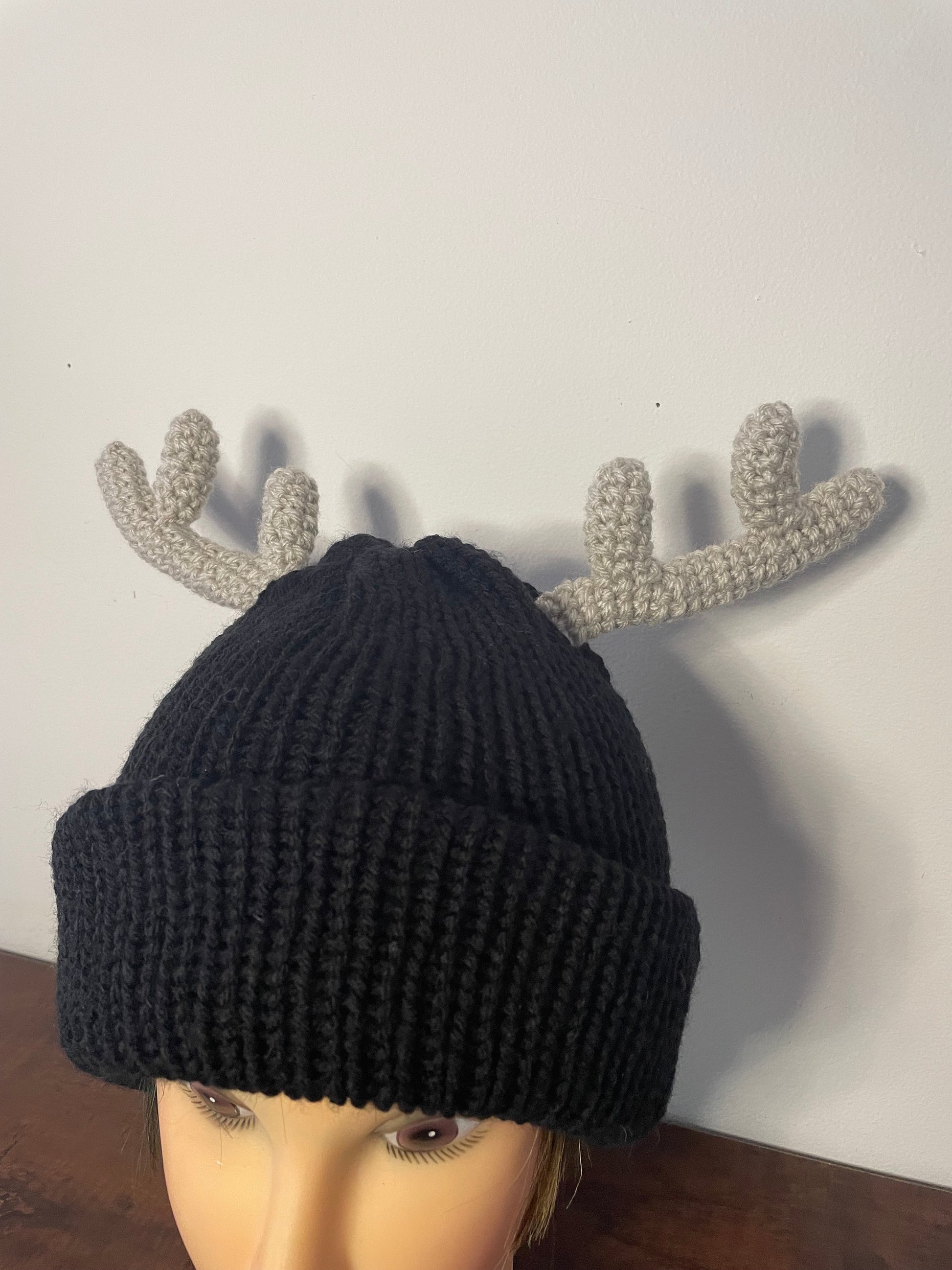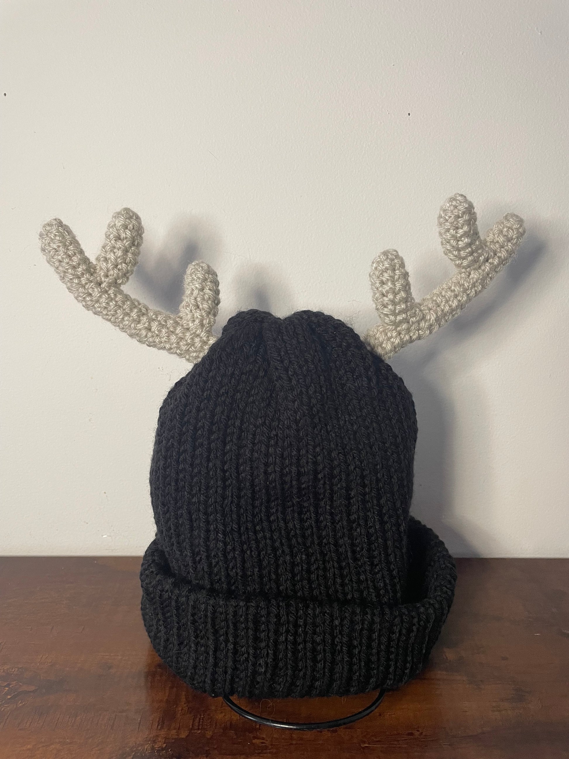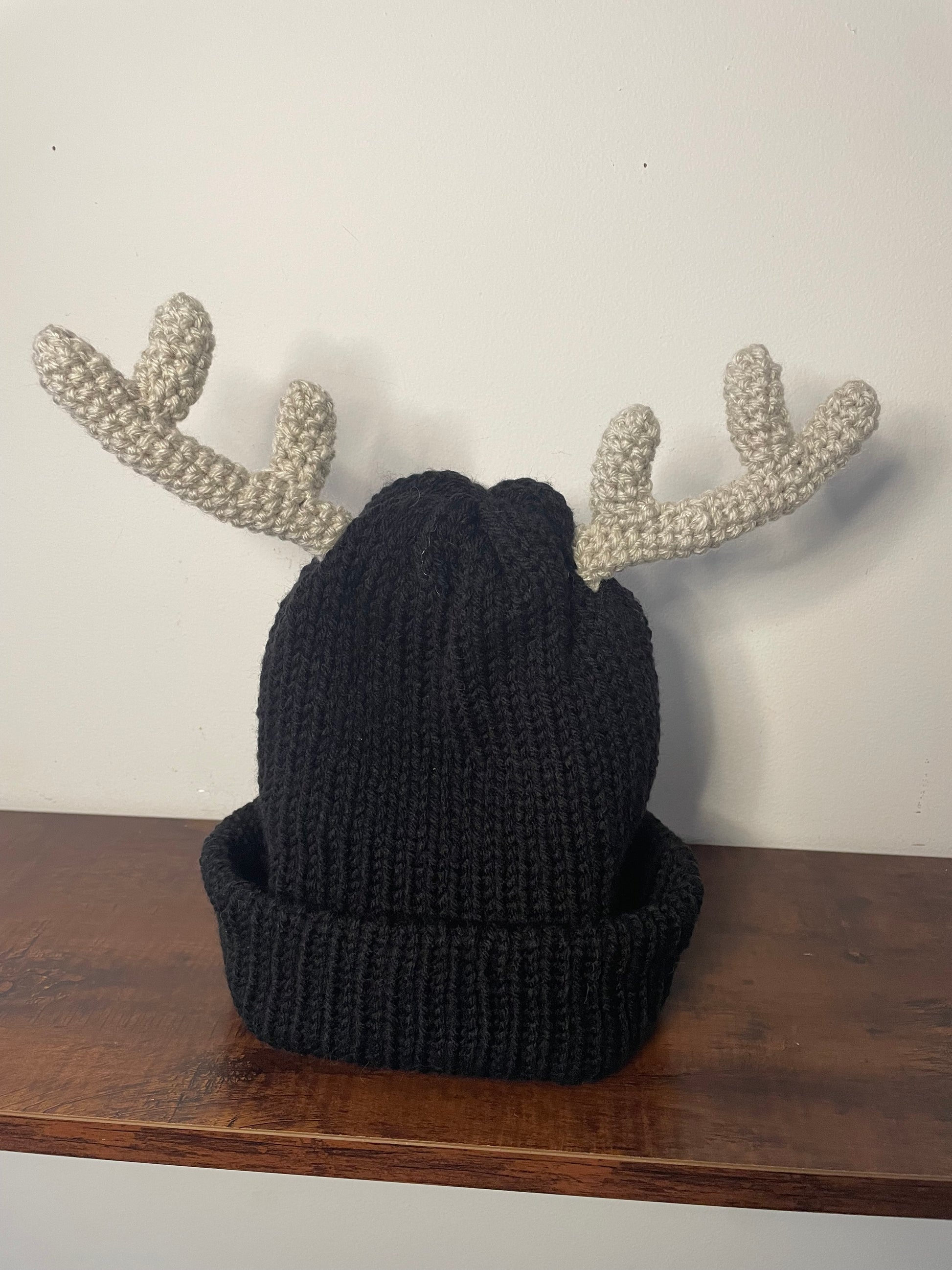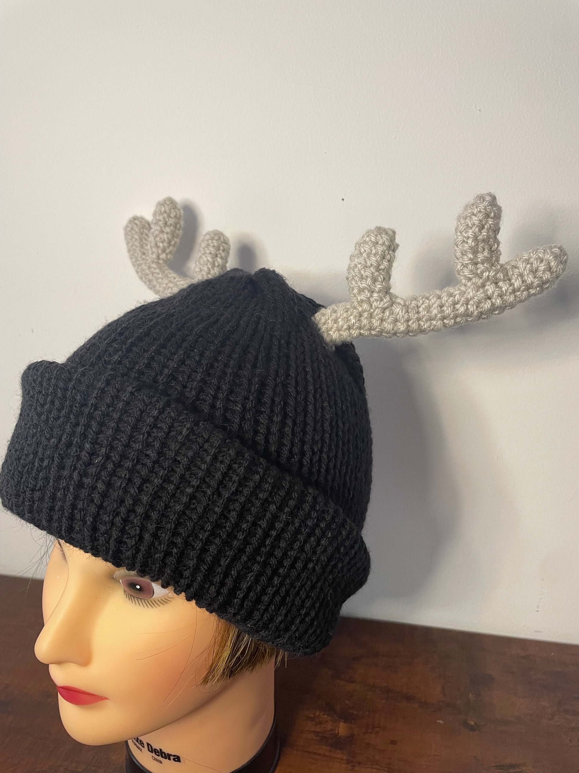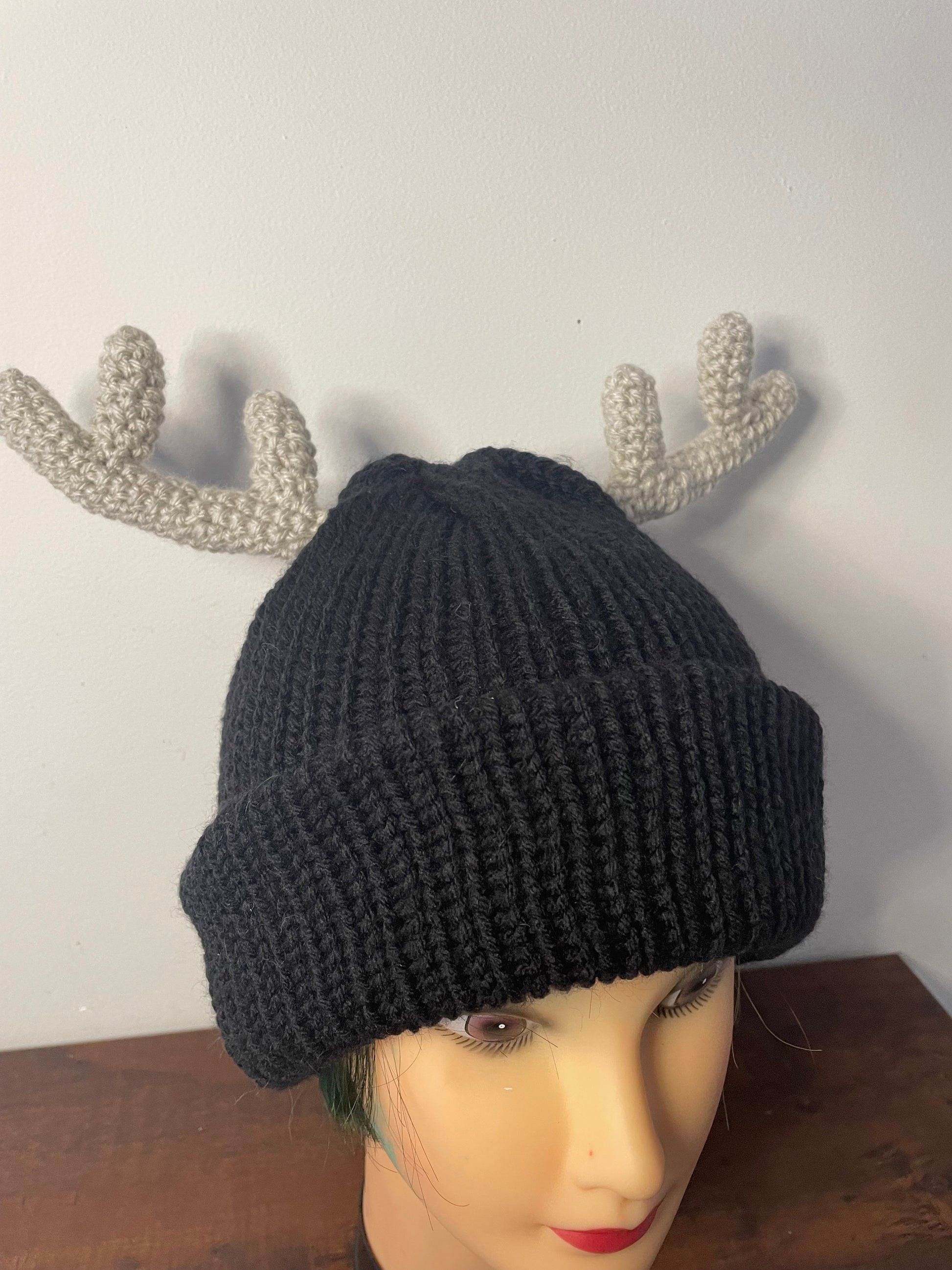 Black Wendigo hat is machine-knit by hand and 100% acrylic. Horns crocheted with acrylic. Fits standard adult sizes.