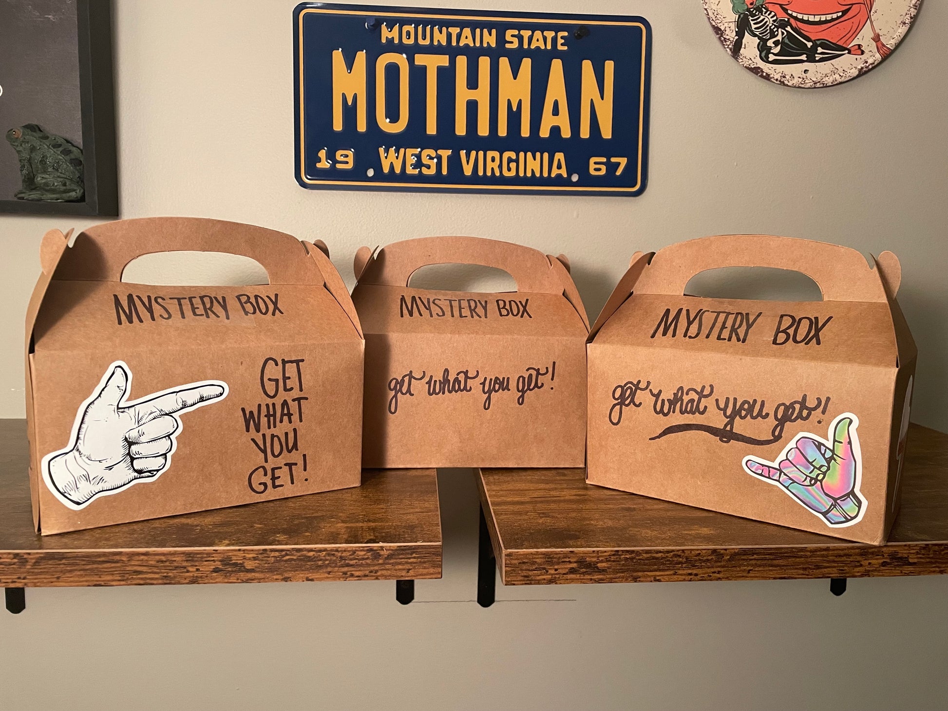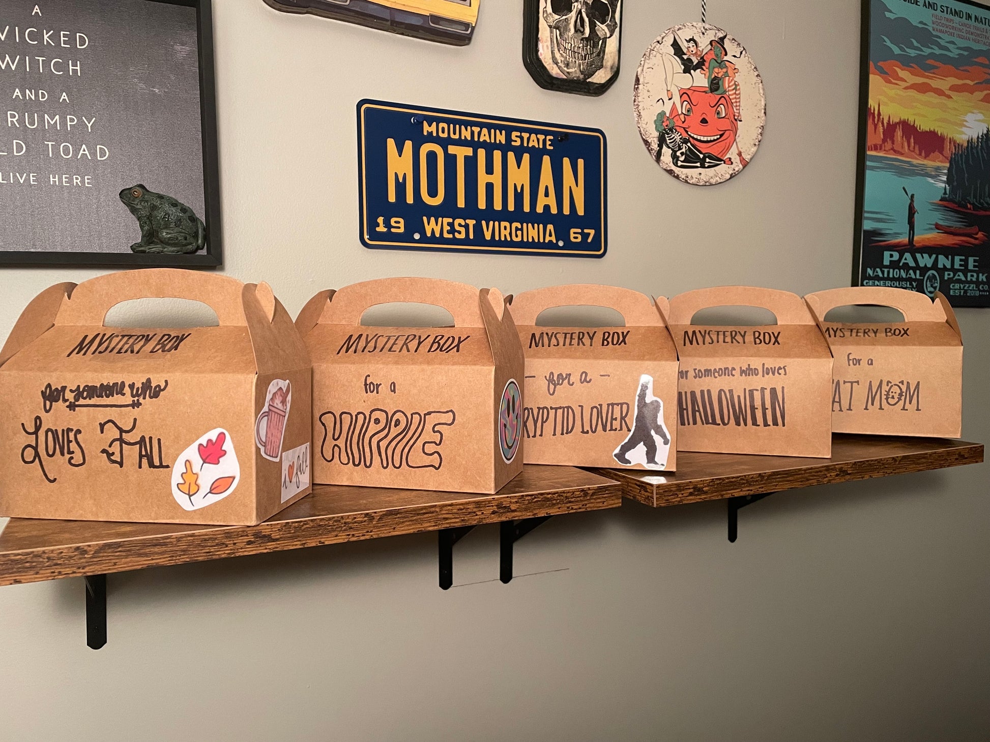 Mystery boxes include 4-6 handmade items; a $50-60 value for only $15! Boxes may include plush, wearable accessories, keychains, small home decor, and more! Each box also includes a Han’s Cryptid Company logo sticker. Take a chance with a “get what you get” completely random box, or choose from currently available themed boxes (while they last):