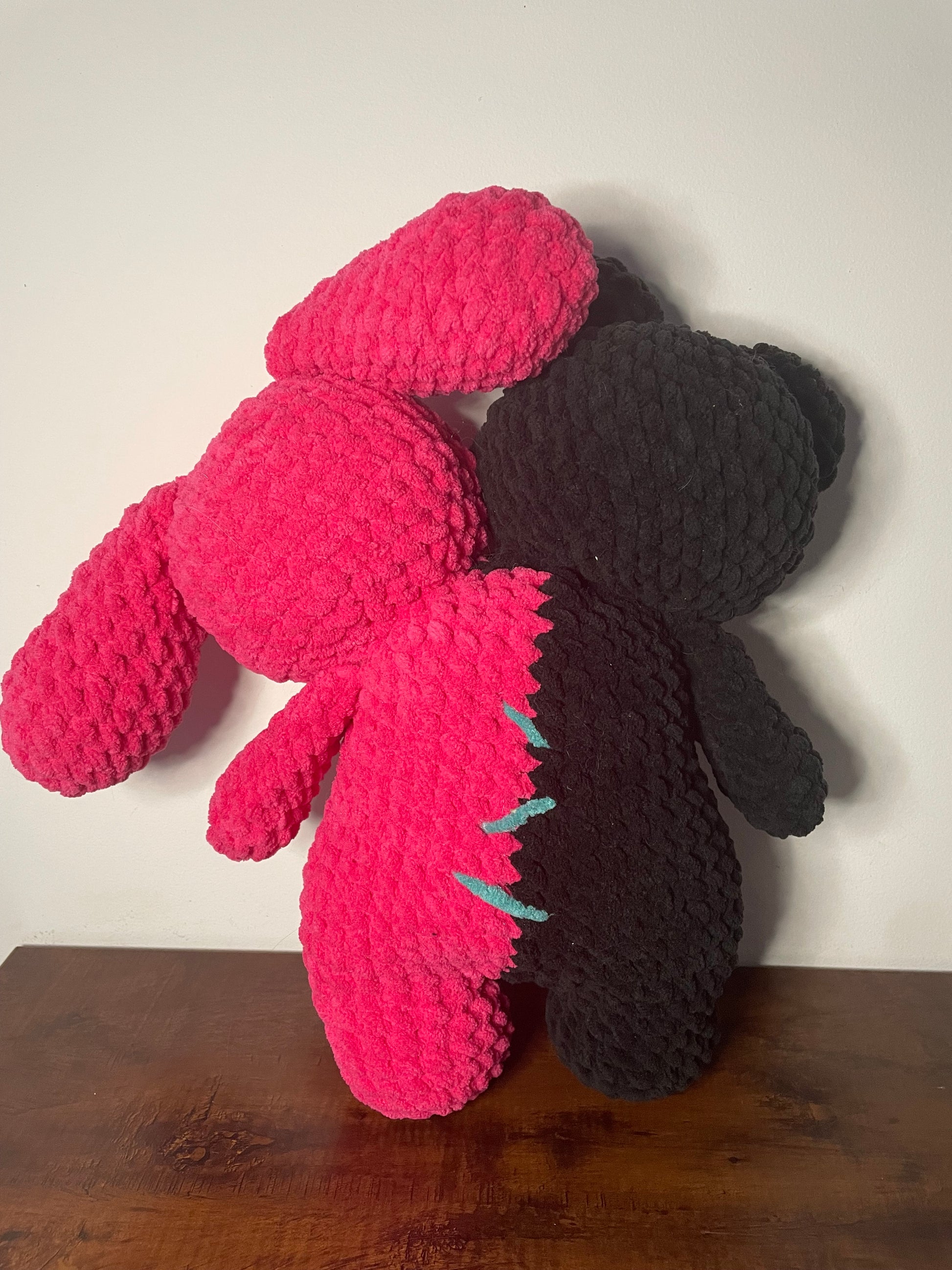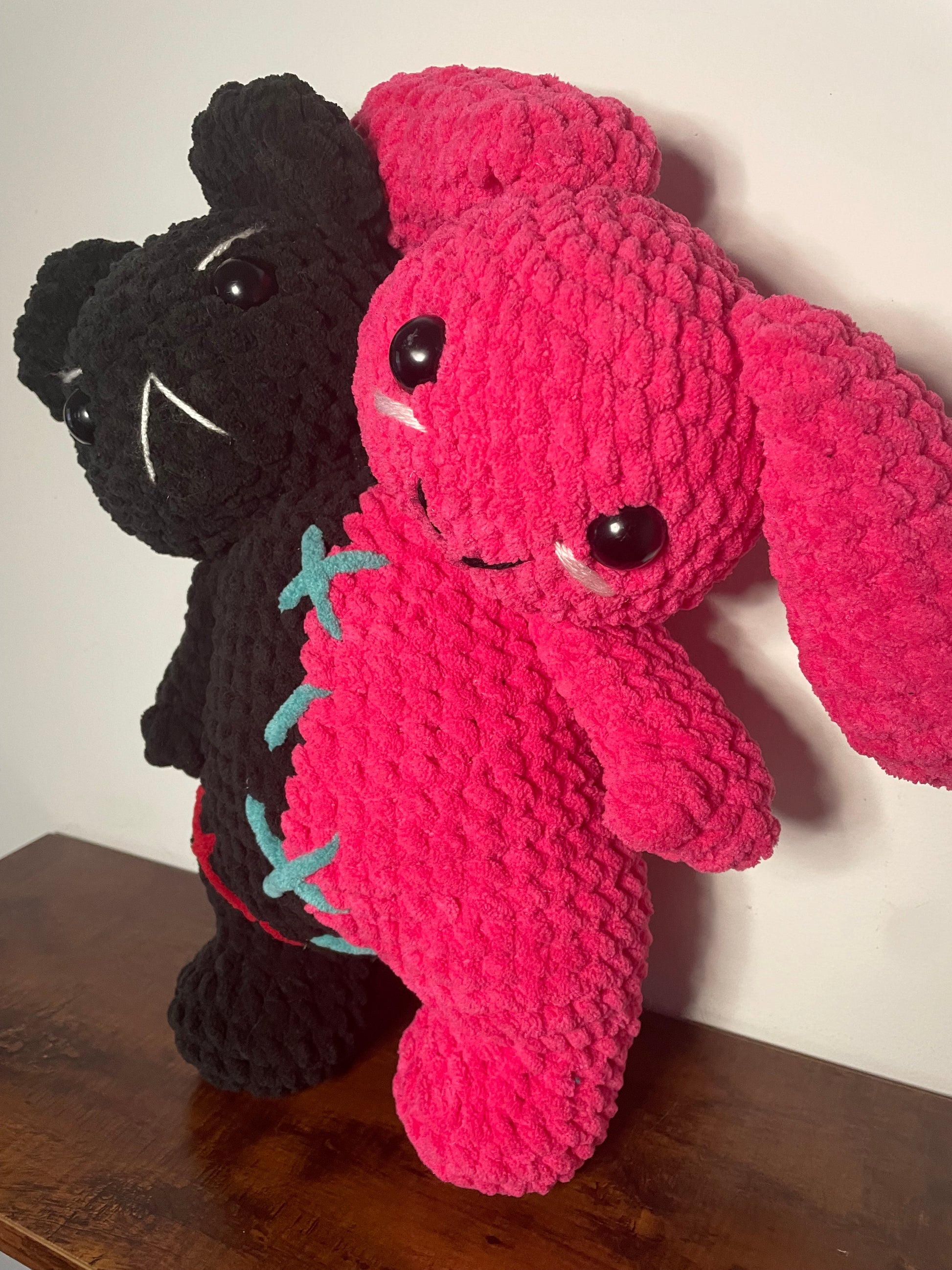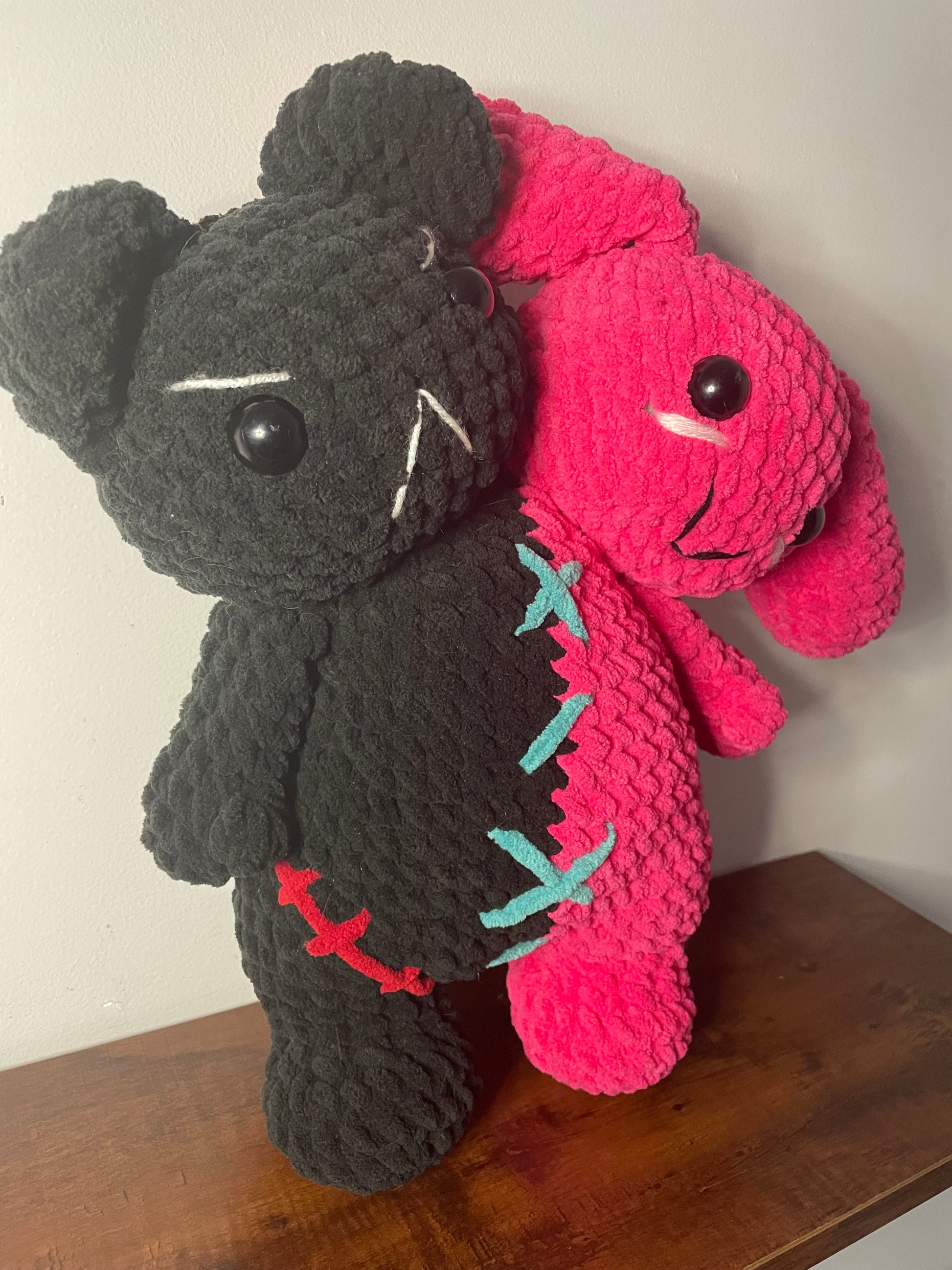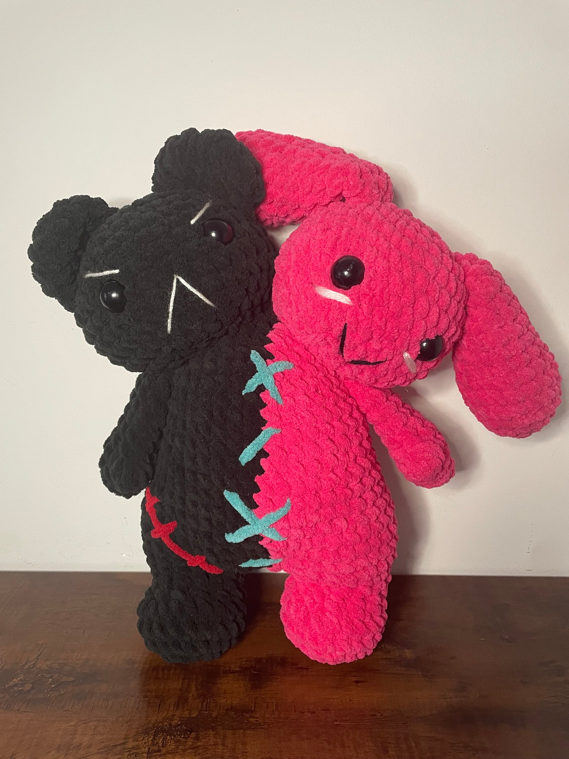 In the mad scientist's lab, a horrific creation was born - The Conjoined Twins. Hot pink pink bunny is a stark contrast to her evil twin, the black bear. Can they learn to get along?