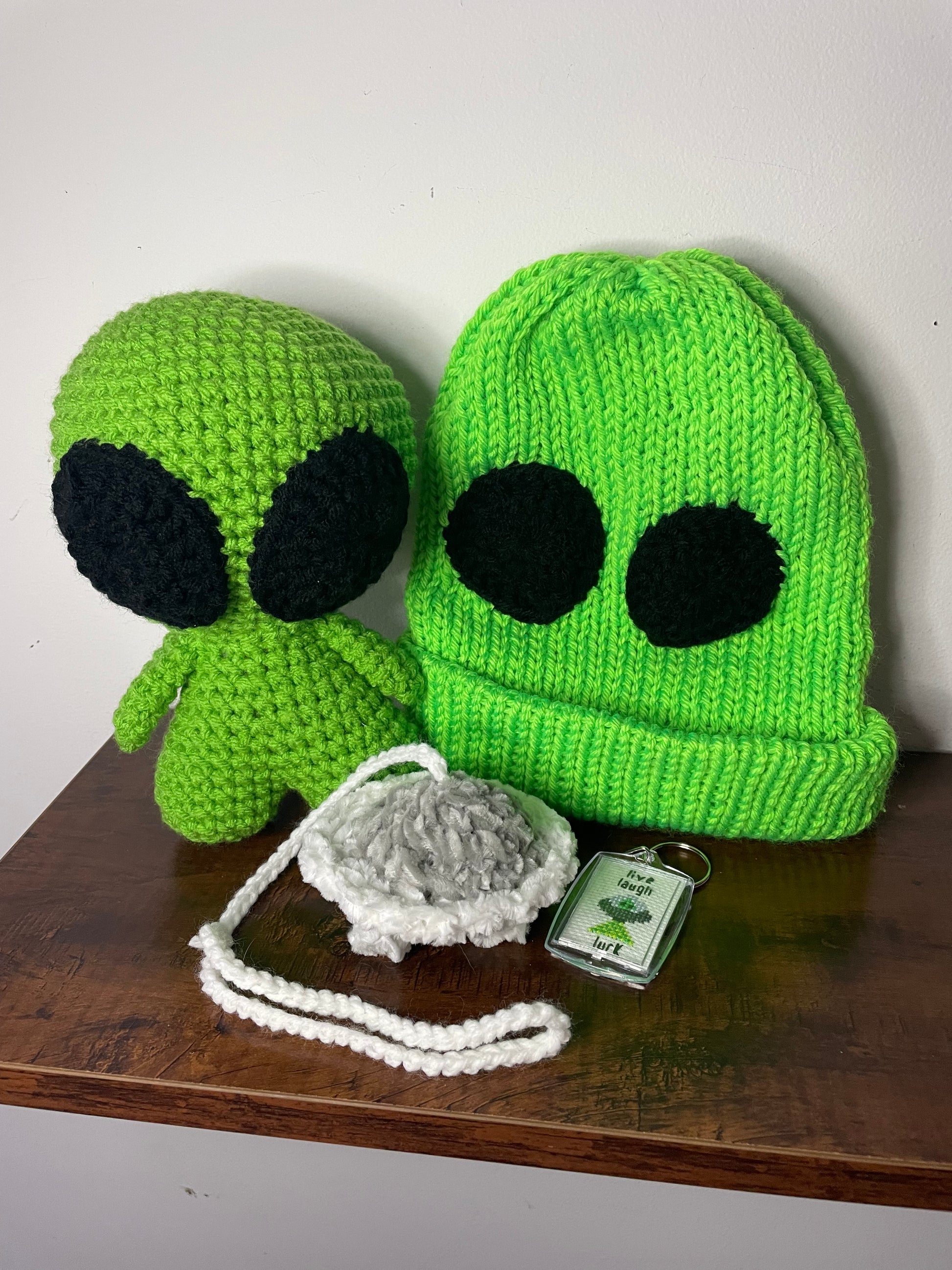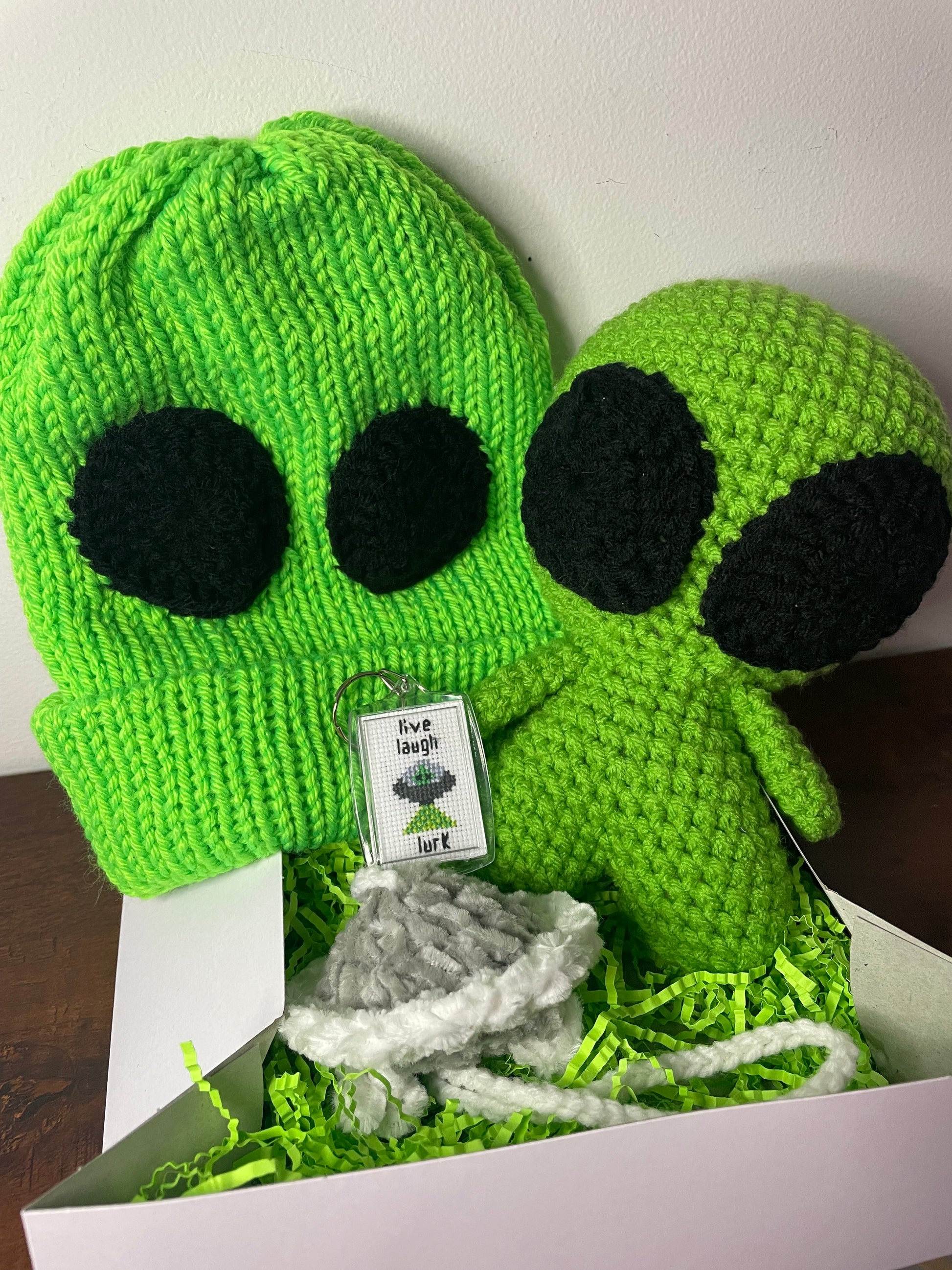 Gift set includes 1 machine knit/crochet alien beanie, 1 crochet alien plush, 1 crochet hanging glow in the dark ufo, and 1 cross stitch “live laugh lurk” keychain - a $70 value.